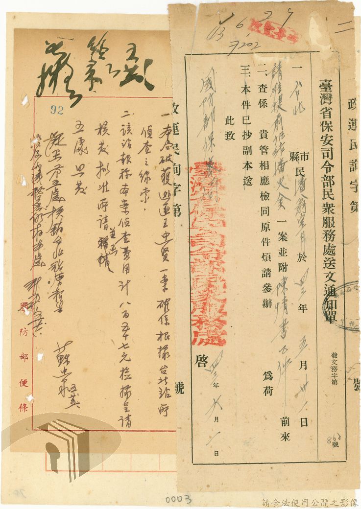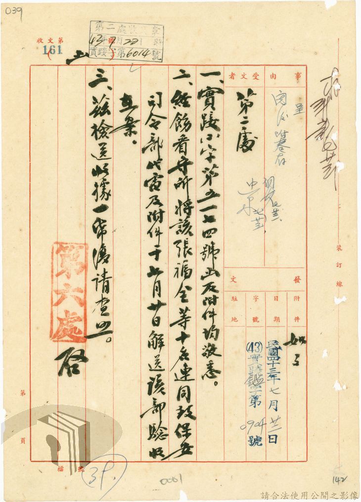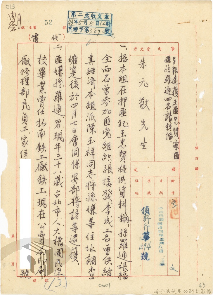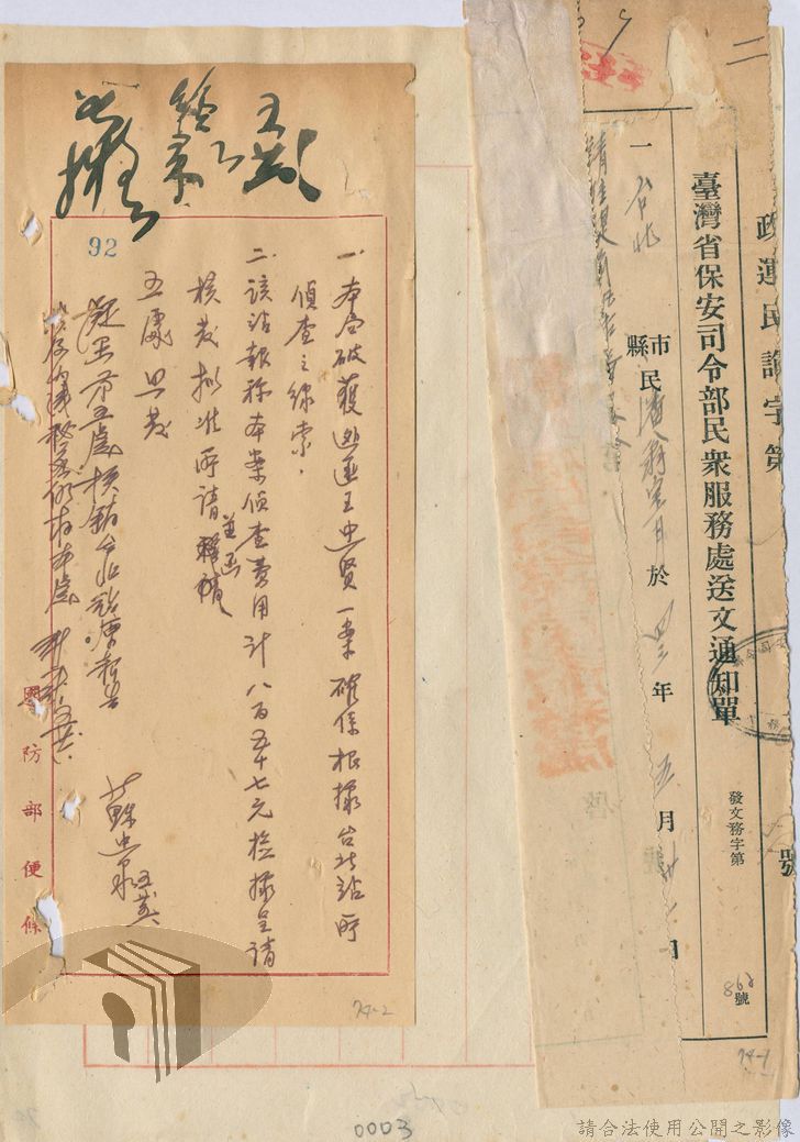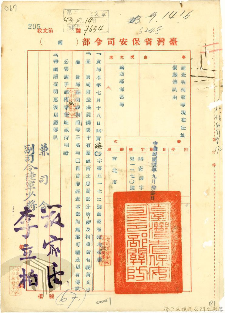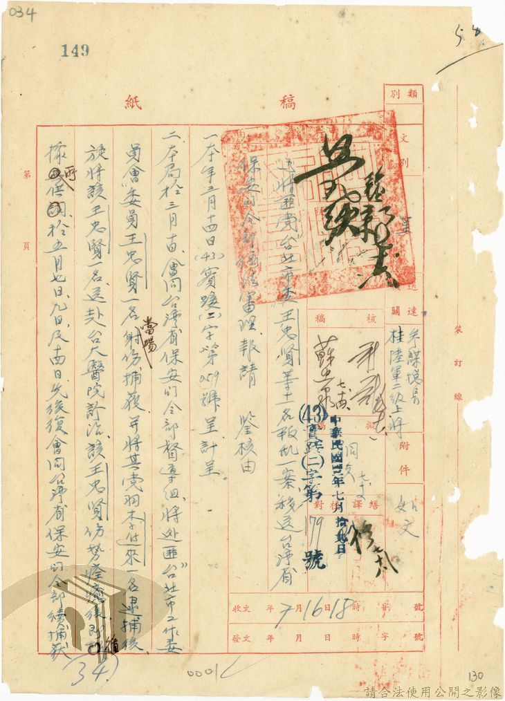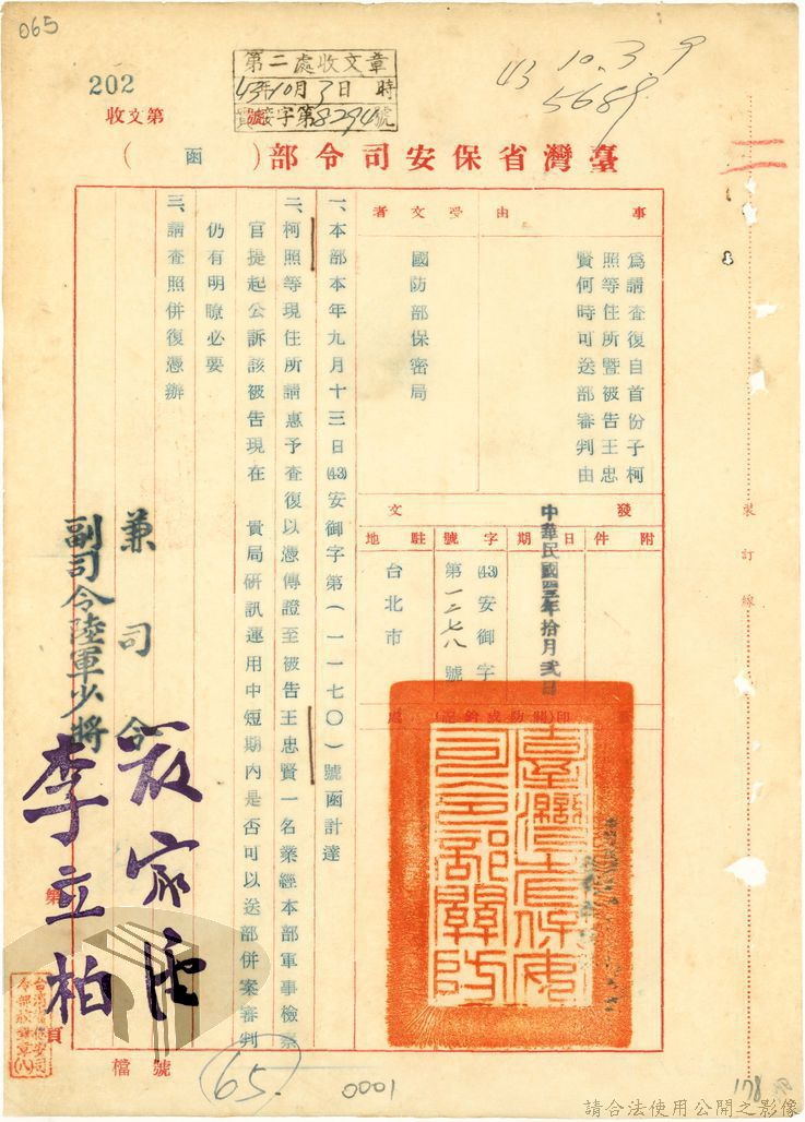 本案為43至47年間,國防部保密局所屬人員為偵辦民眾所涉案件而向上級長官及相關人員報告偵查情形,臺灣省保安司令部亦會同該局及警局人員緝拿嫌疑人,保密局則向總統府機要室資料組、國防部陳報偵辦進度,當事人經該局訊問完畢後,移送保安司令部審判。附訊問筆錄、醫師證明書等文件資料。