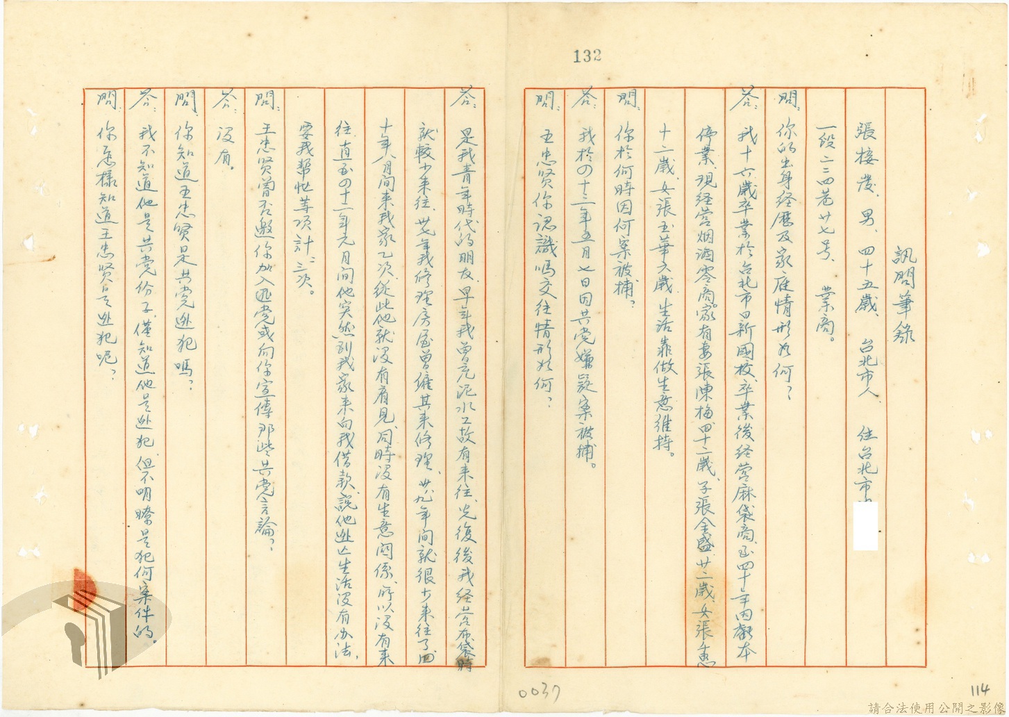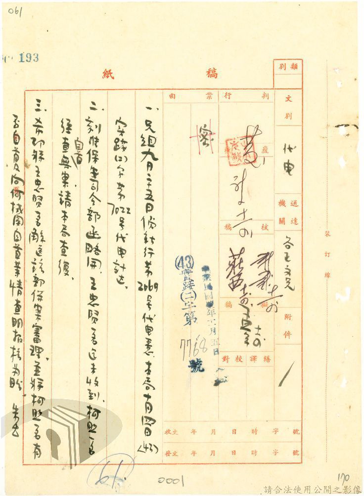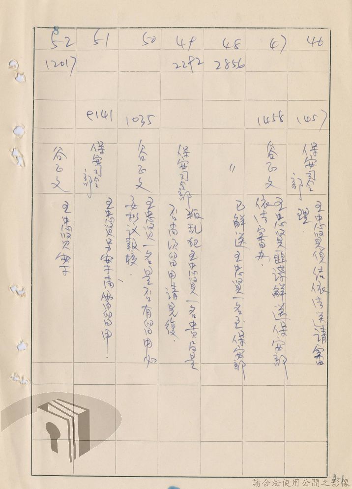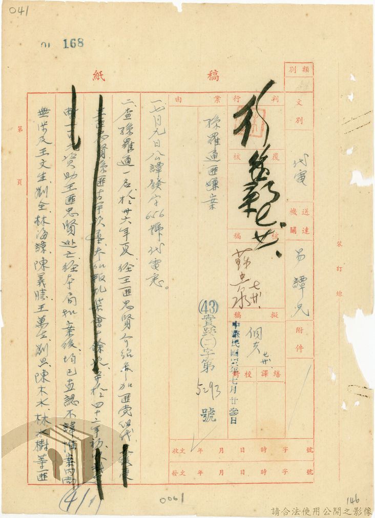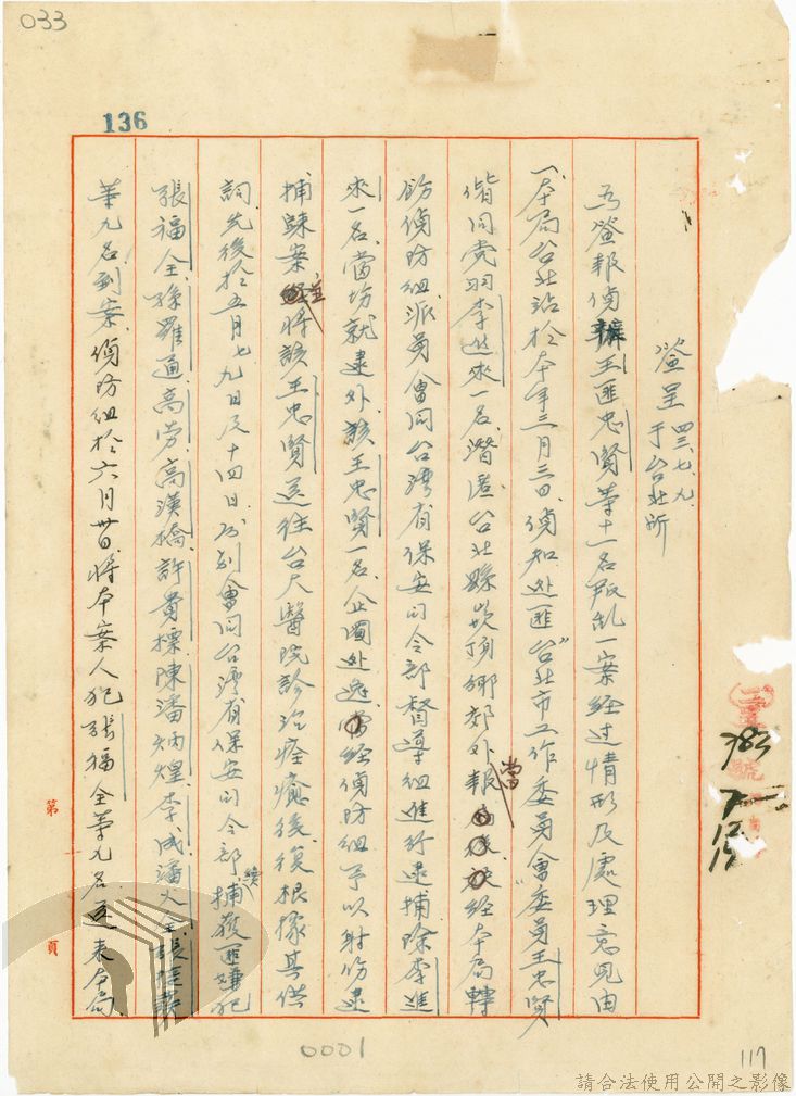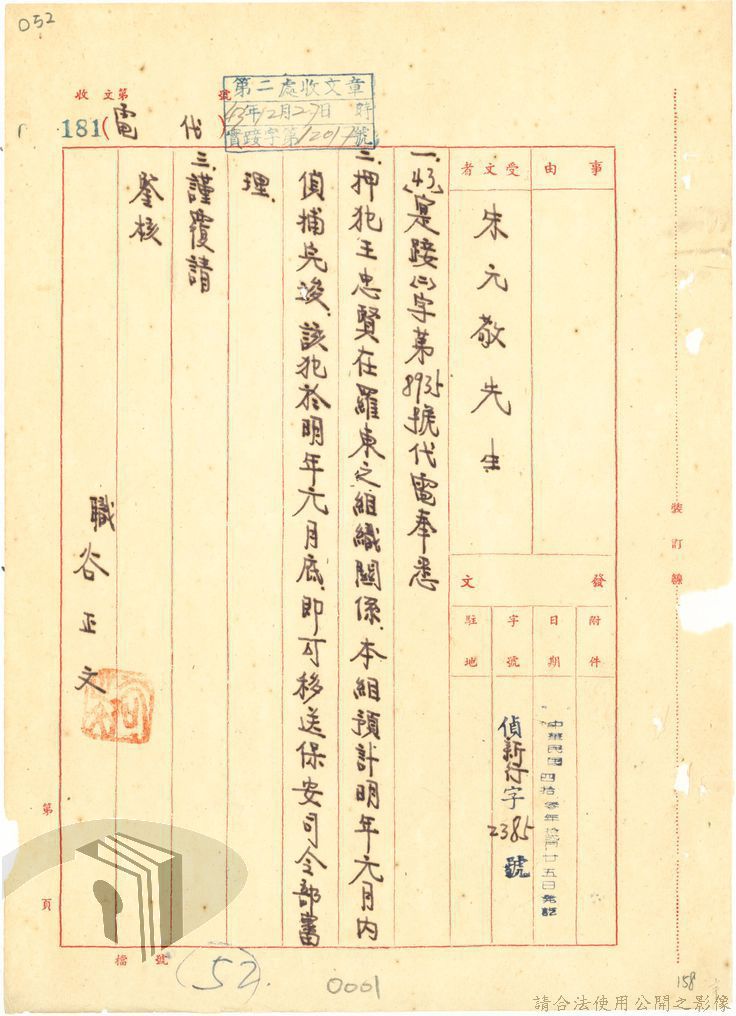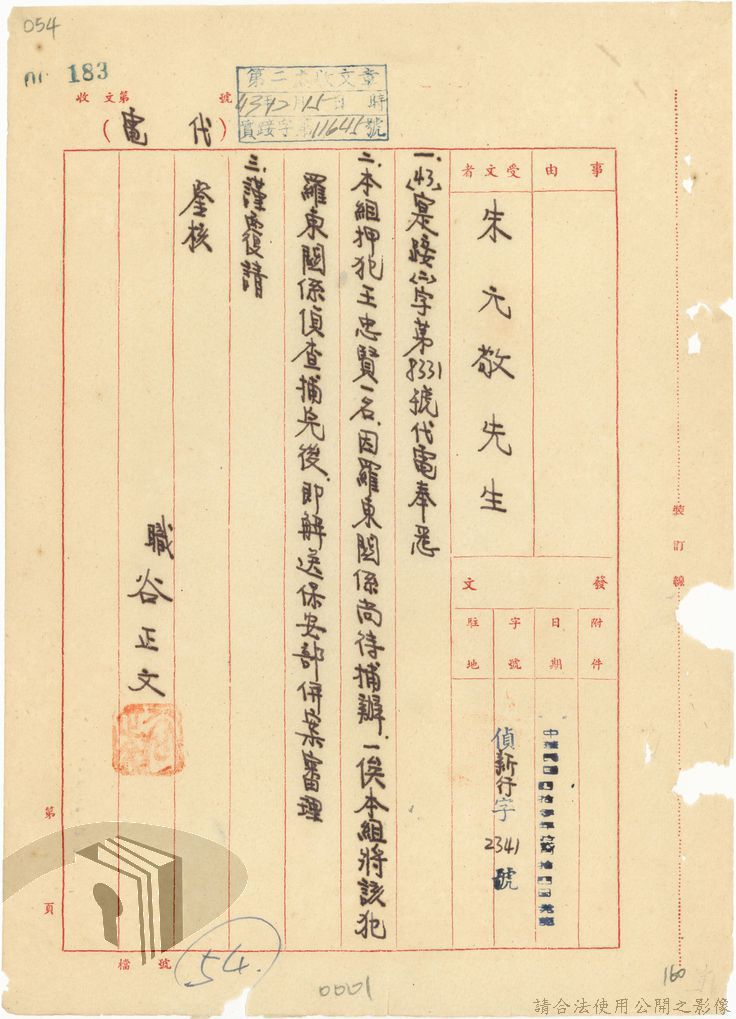 本案為43至47年間,國防部保密局所屬人員為偵辦民眾所涉案件而向上級長官及相關人員報告偵查情形,臺灣省保安司令部亦會同該局及警局人員緝拿嫌疑人,保密局則向總統府機要室資料組、國防部陳報偵辦進度,當事人經該局訊問完畢後,移送保安司令部審判。附訊問筆錄、醫師證明書等文件資料。