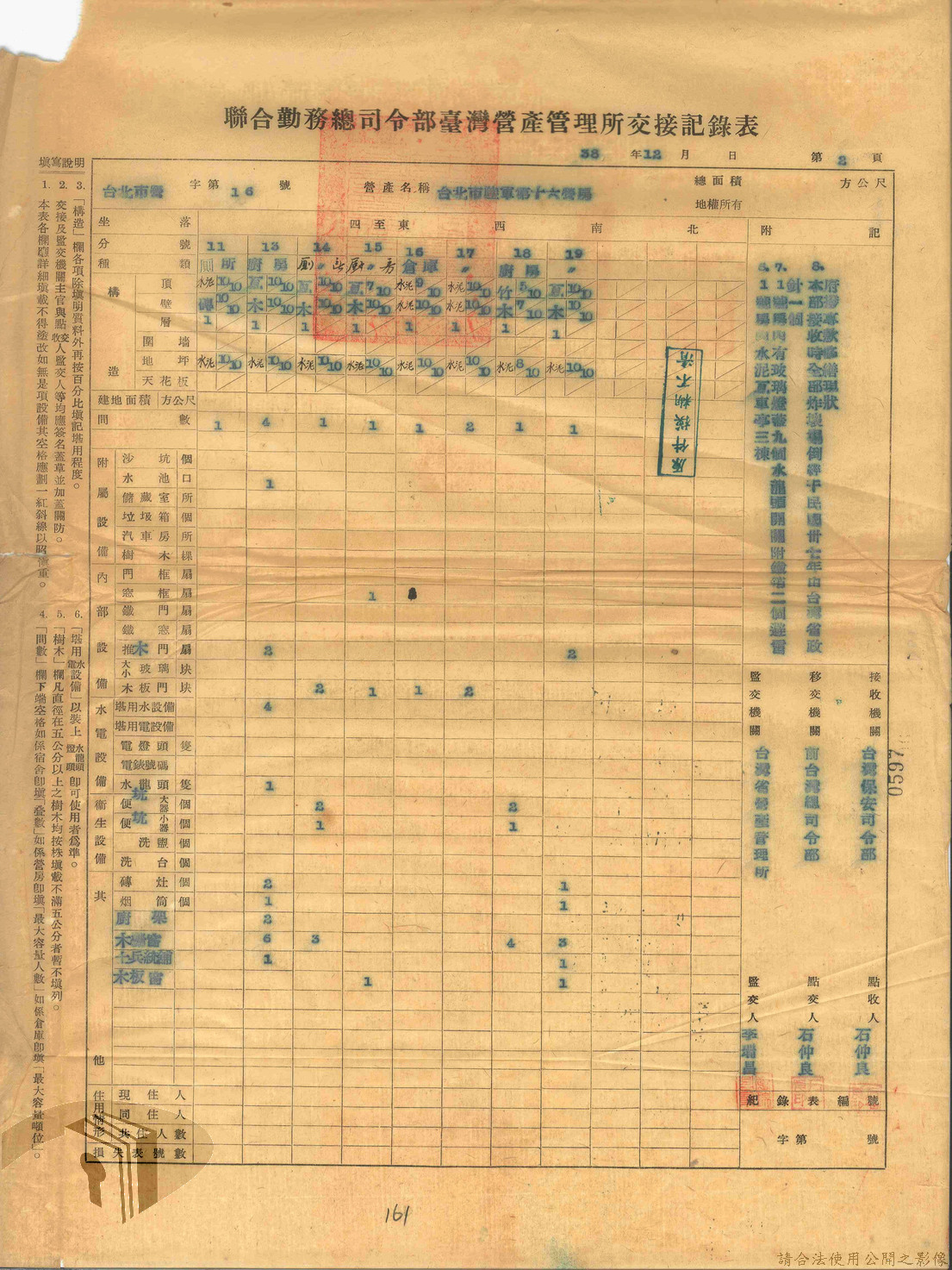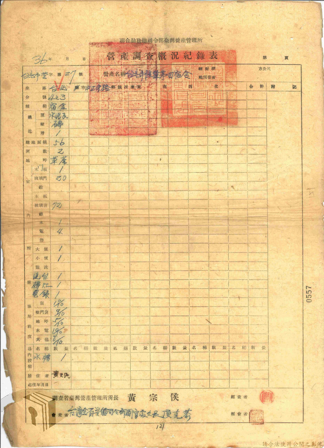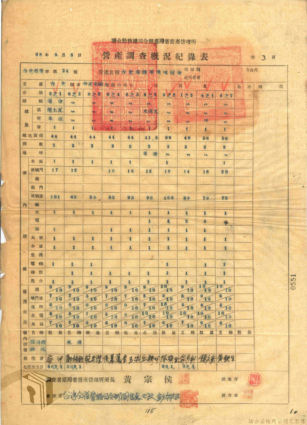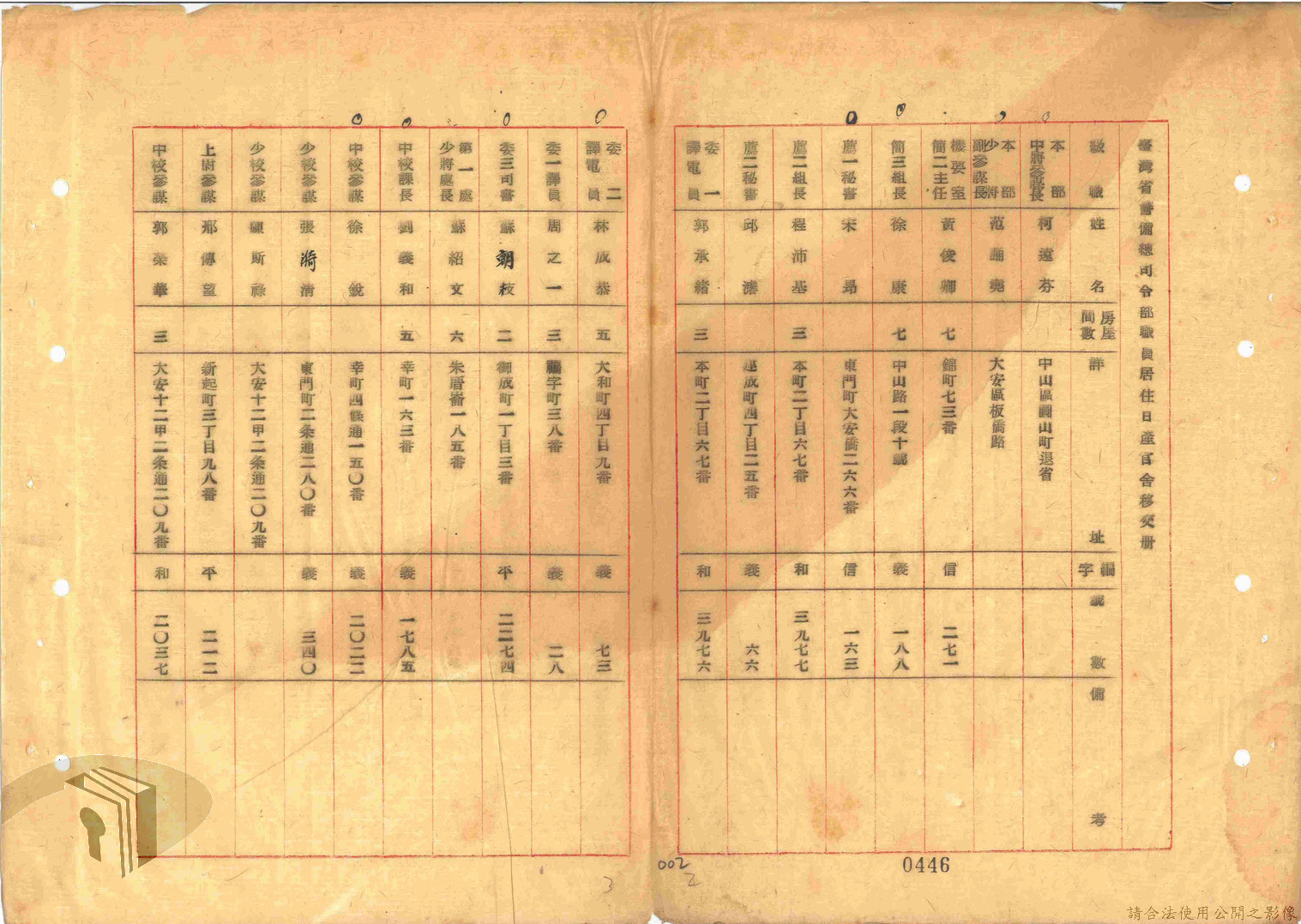 本案為47年間,臺灣省警備總司令部職員居住日產官舍移交冊、臺灣省警備總司令部移交保安司令部官舍清冊、臺灣省警備總司令部移交保安司令部日產官舍清冊、臺灣省保安司令部房地清冊、臺灣警備總司令部固定設施交接清冊等文件資料。
