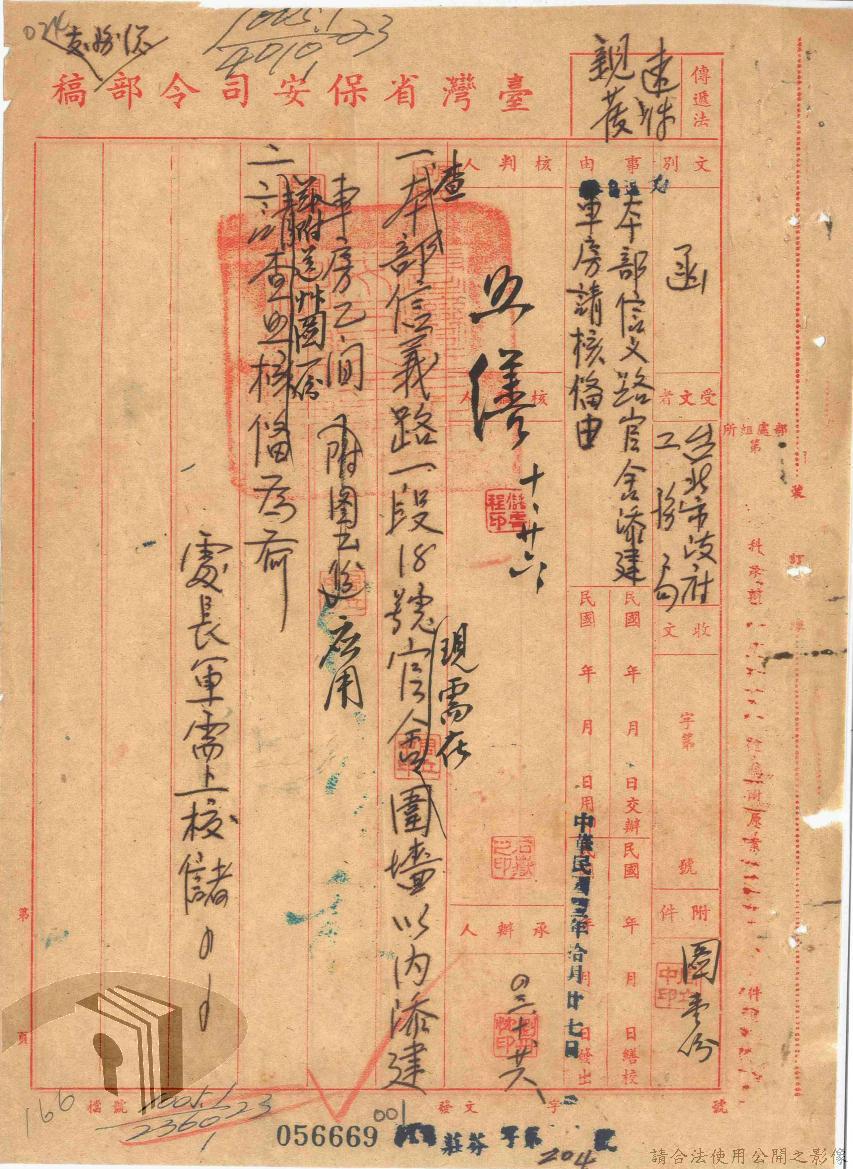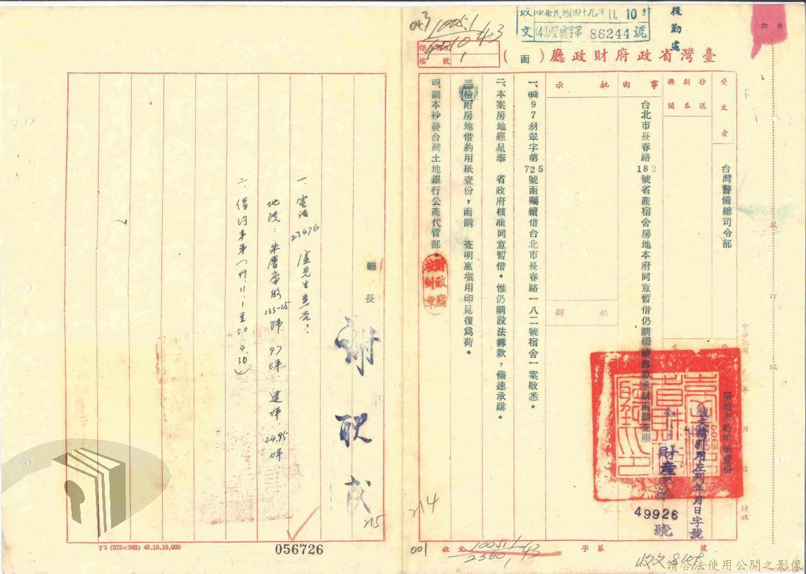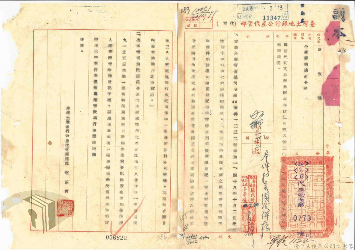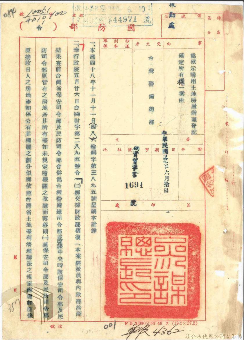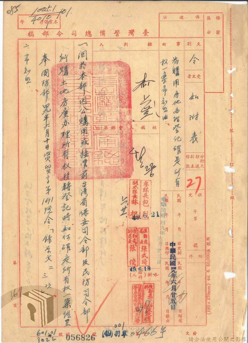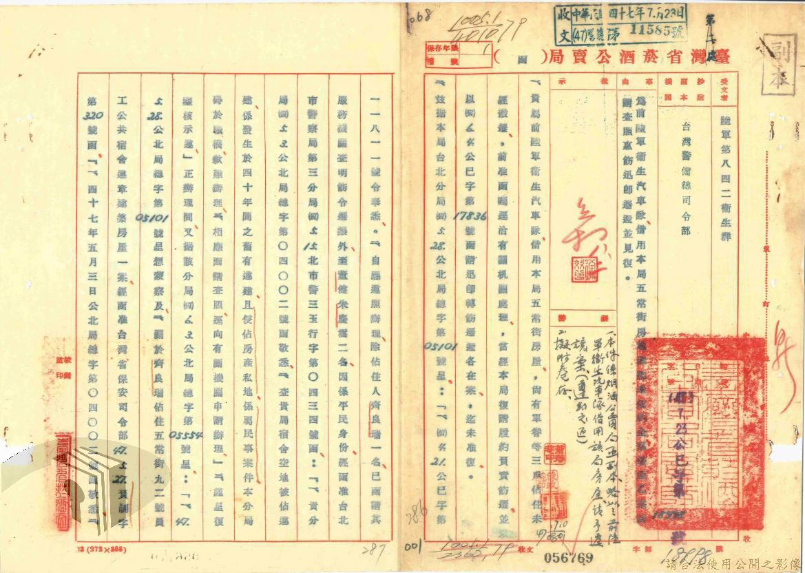 本案為38至49年間,有關國防部後備司令部〈前台灣警備總司令部〉所有台北市內房屋土地使用情況,與軍管區司令部、聯勤總部、永利化學公司、台灣金屬品冶製公會、台北市工務局等單位出售、購買、借用、移交等事宜。