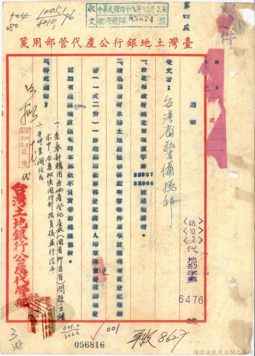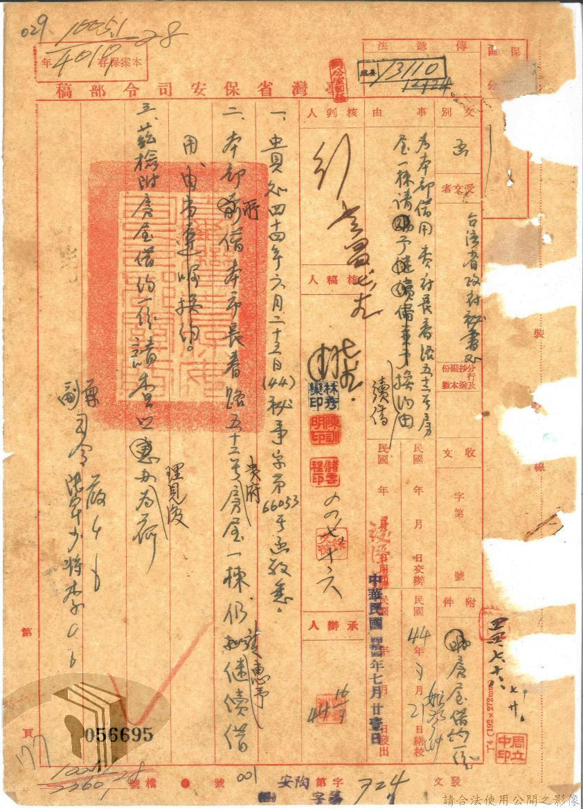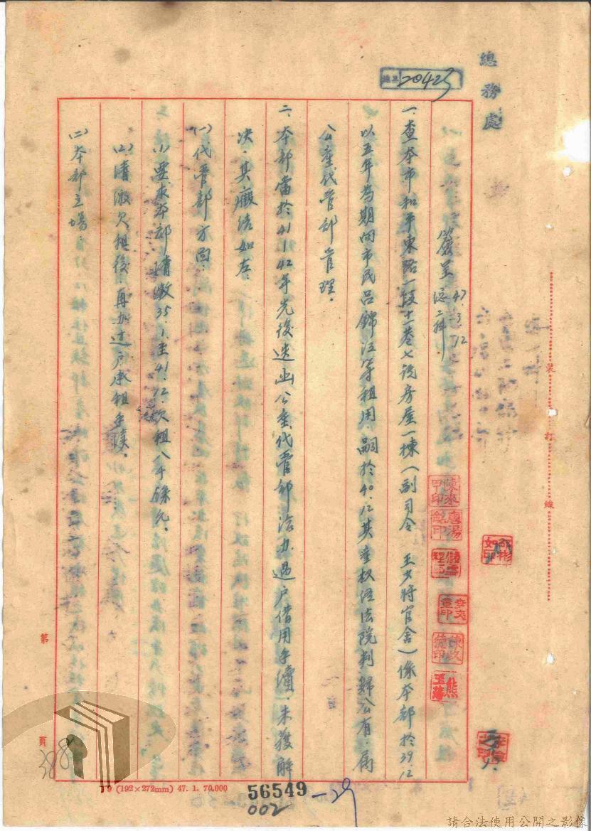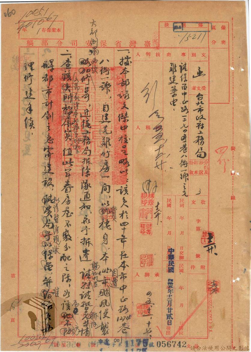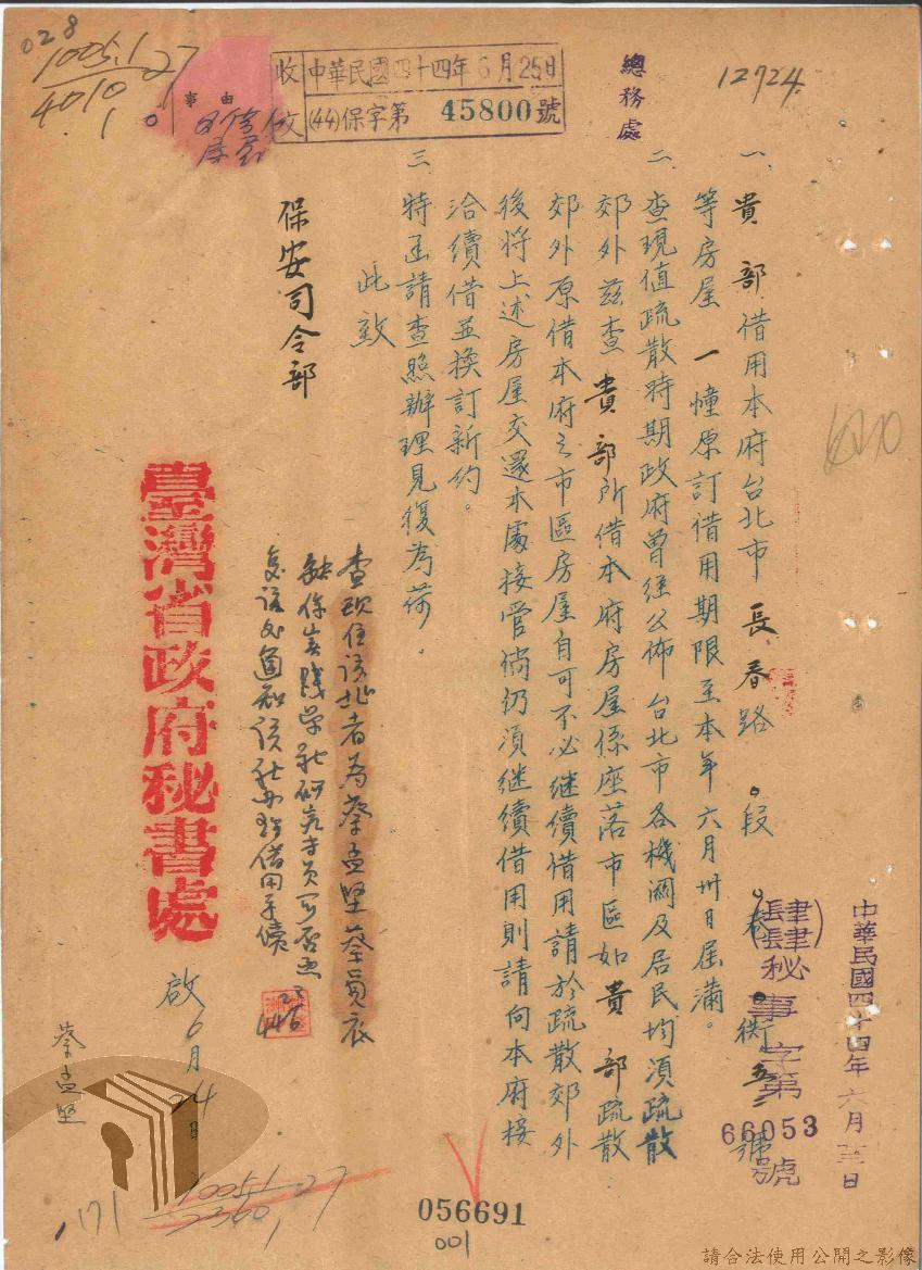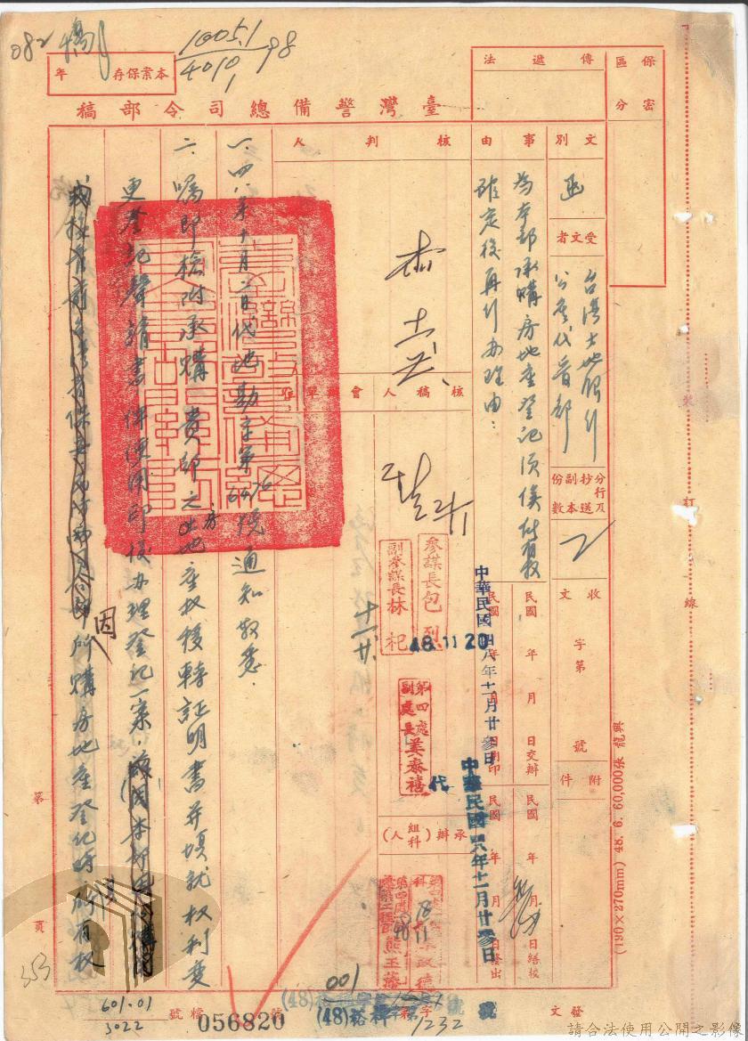 本案為38至49年間,有關國防部後備司令部〈前台灣警備總司令部〉所有台北市內房屋土地使用情況,與軍管區司令部、聯勤總部、永利化學公司、台灣金屬品冶製公會、台北市工務局等單位出售、購買、借用、移交等事宜。