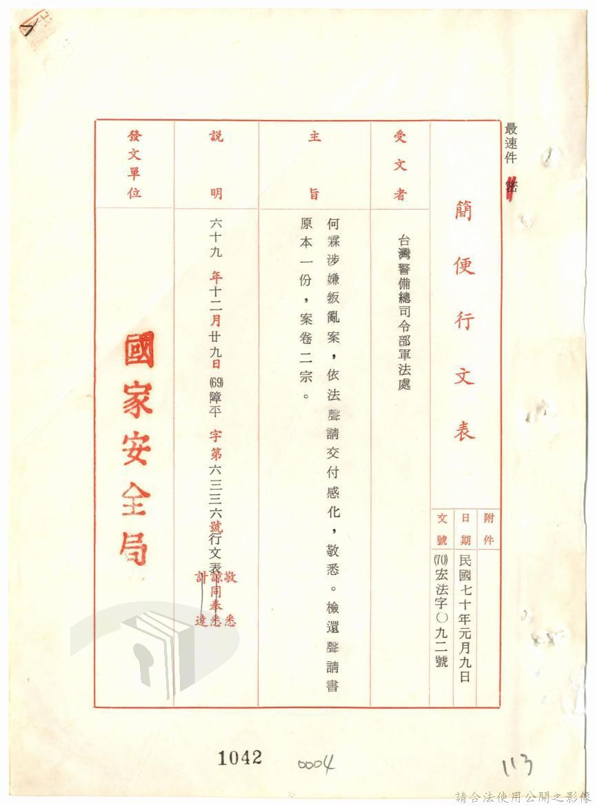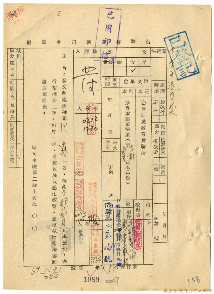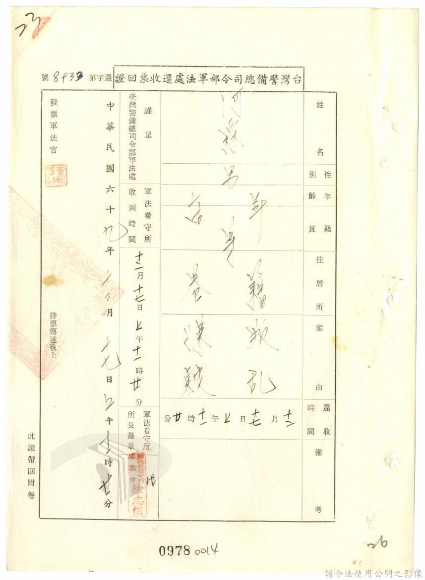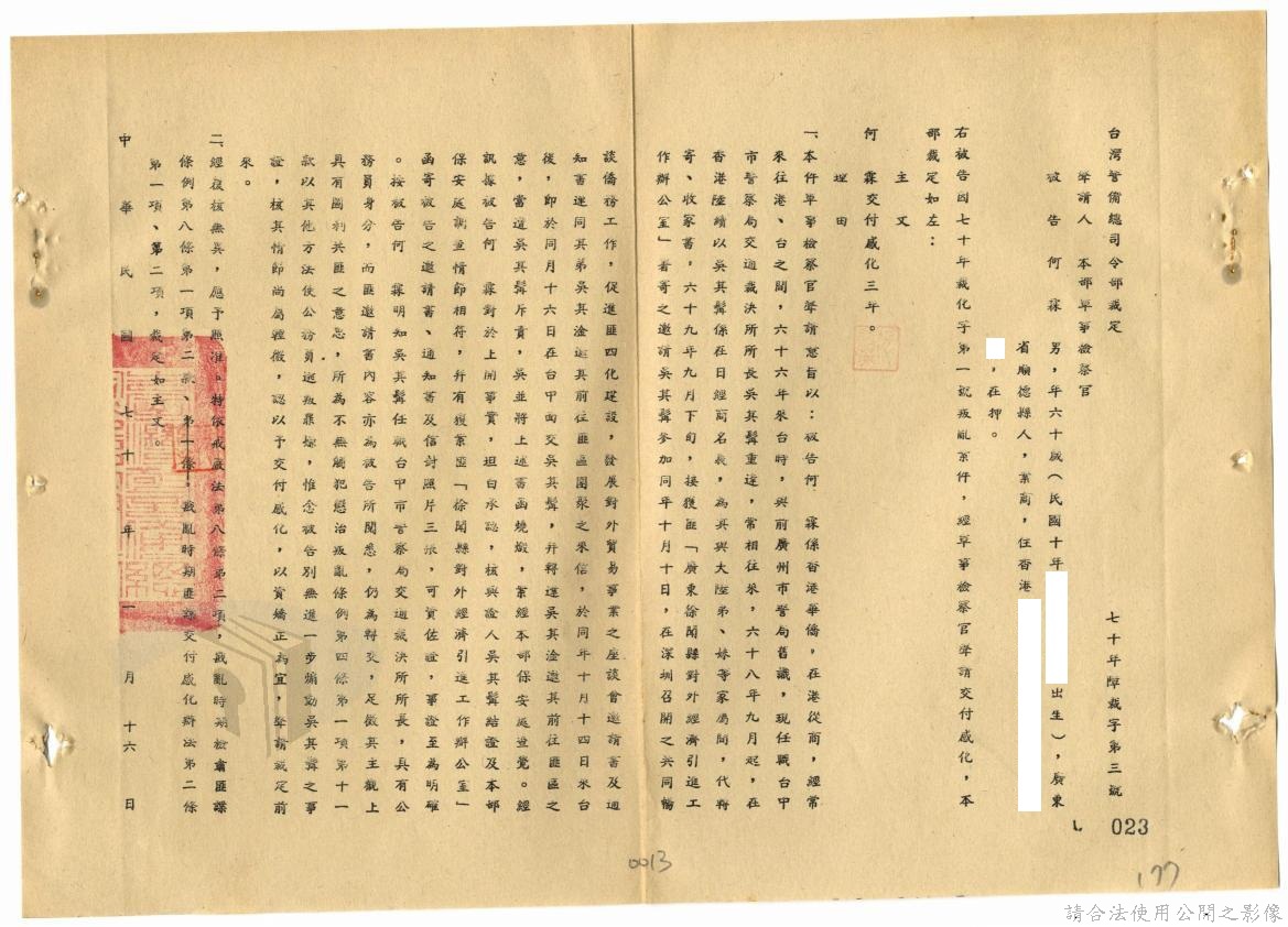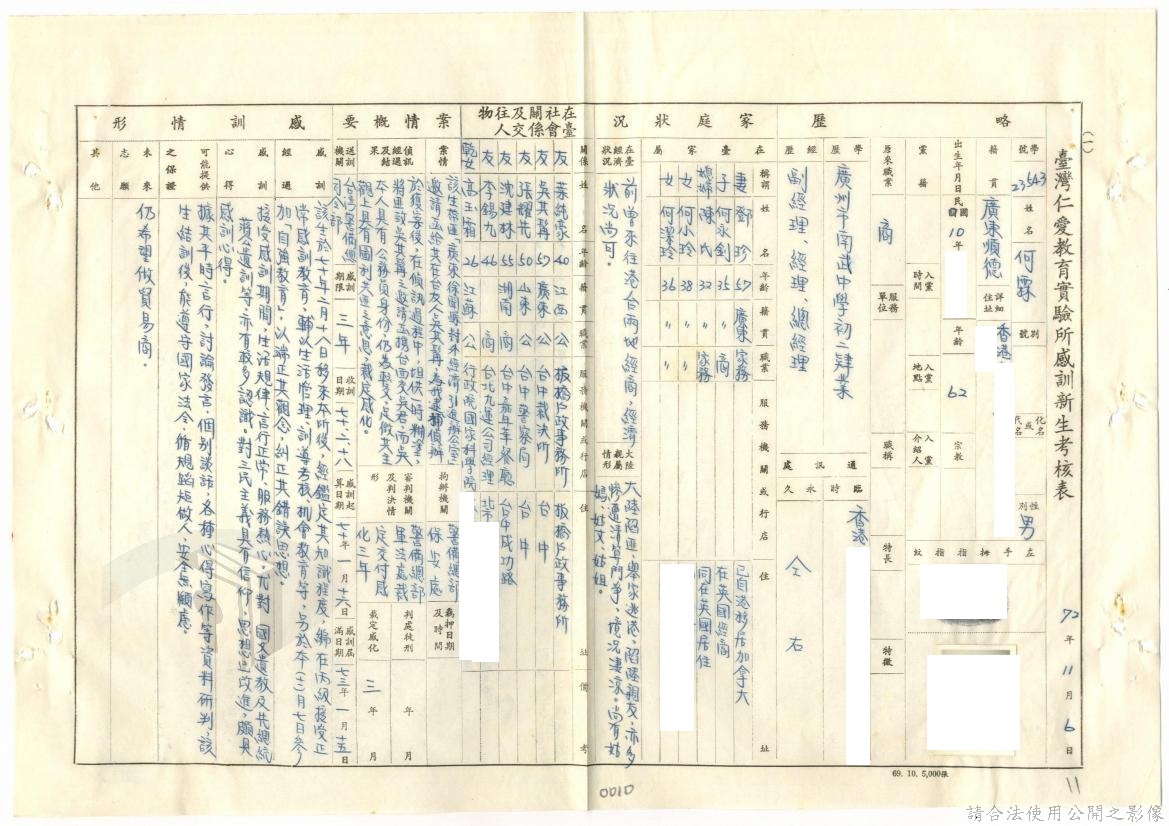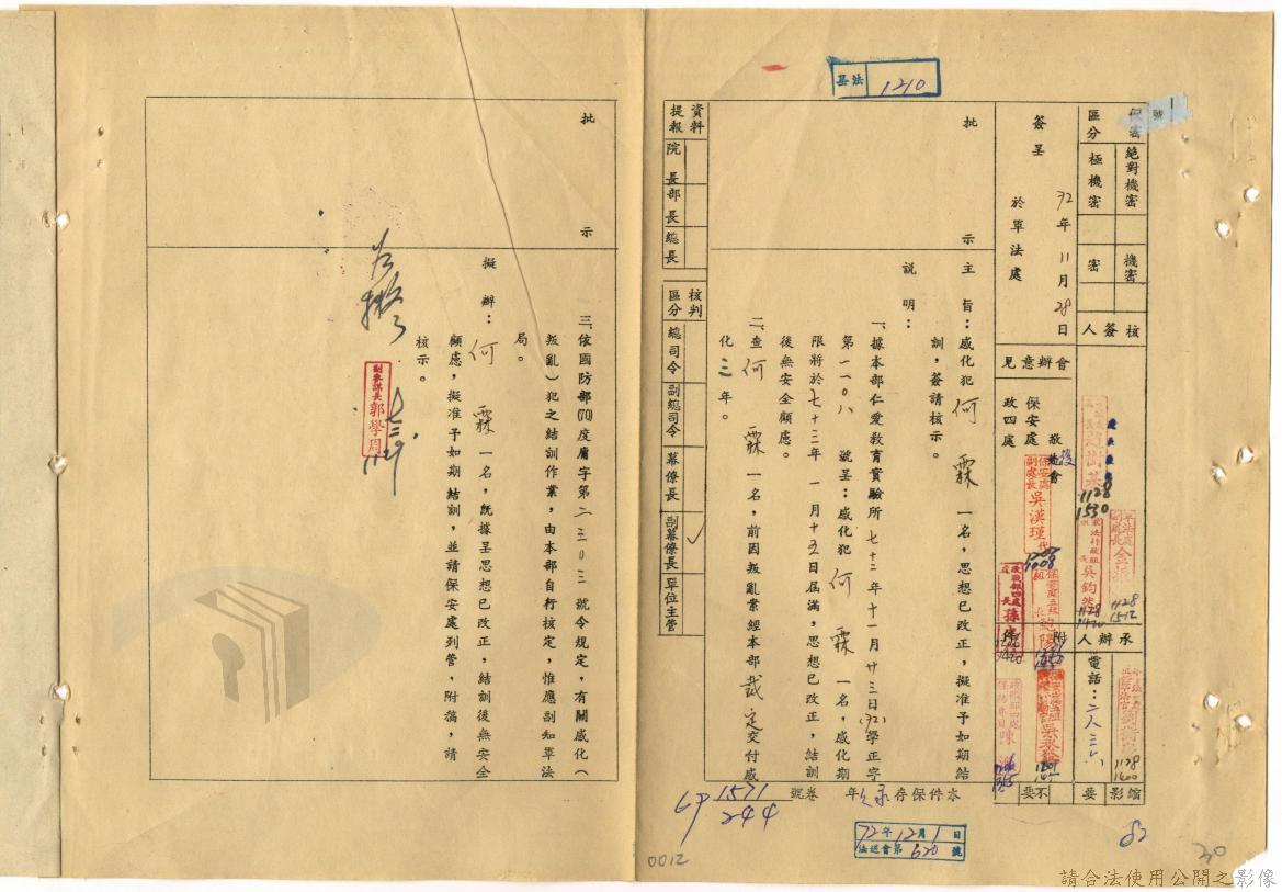 本案為69至72年間,臺灣警備總司令部保安處將華僑涉案相關資料移送臺灣警備總司令部審判,該部裁定予以交付感化,後臺灣警備總司令部仁愛教育實驗所因為該員感化期滿將其考核資料檢送臺灣警備總司令部報請結訓保釋,經警總審查考核後同意結訓。附筆錄、證人結文、書信、偵訊報告表、新生考核表、裁定書等文件資料。