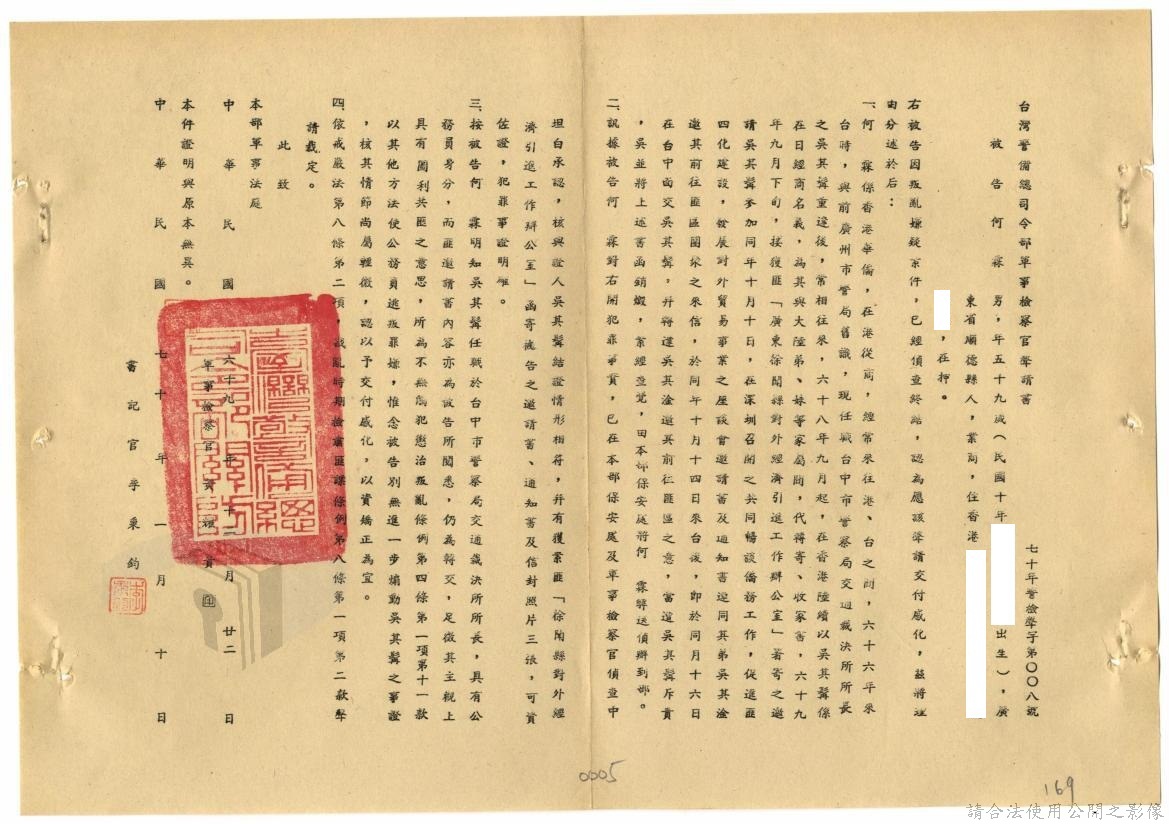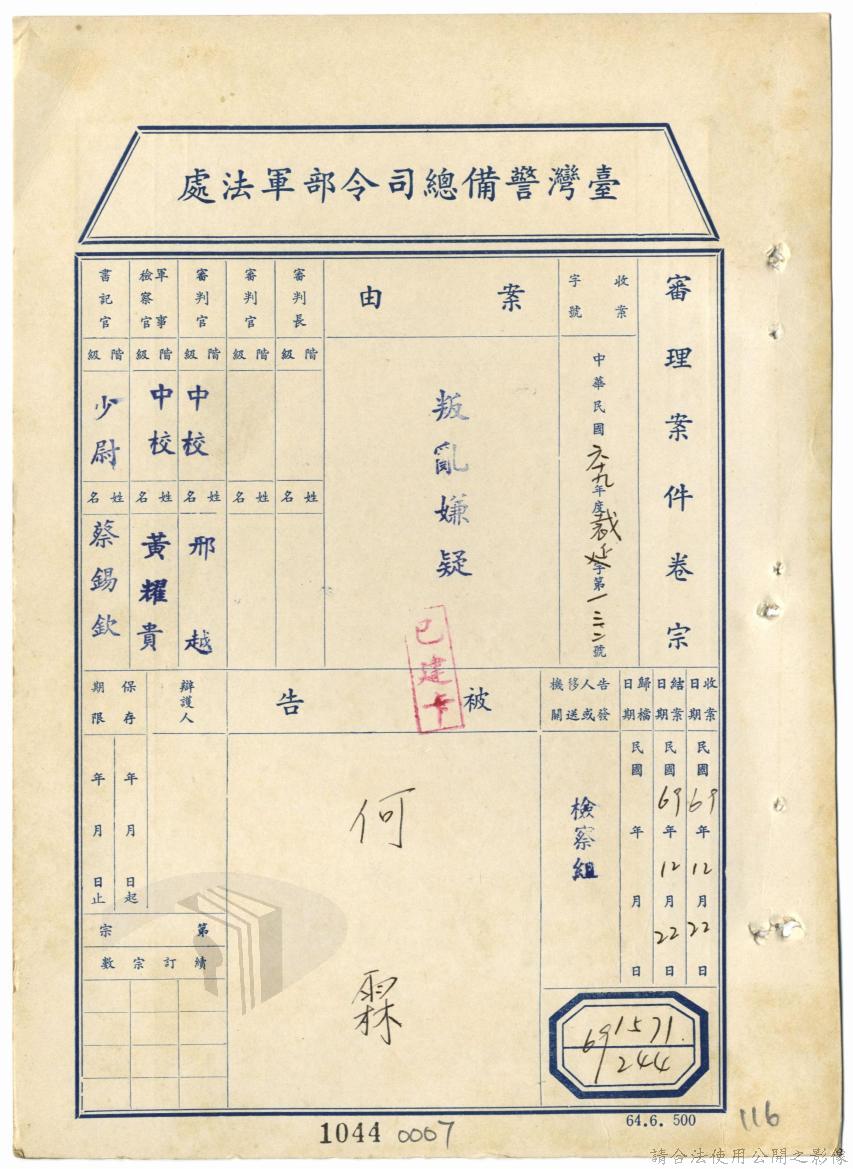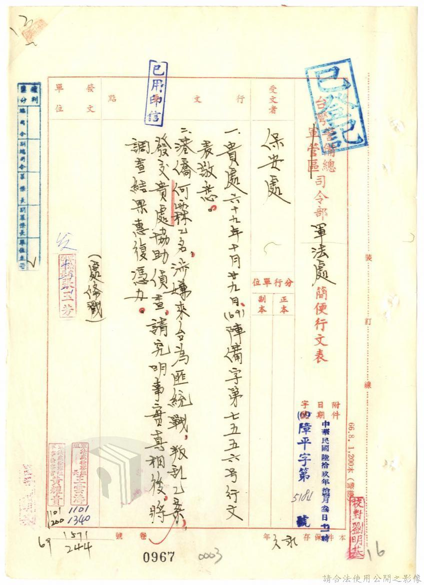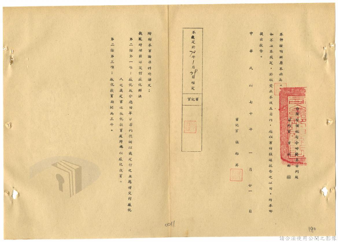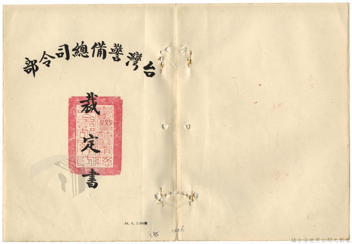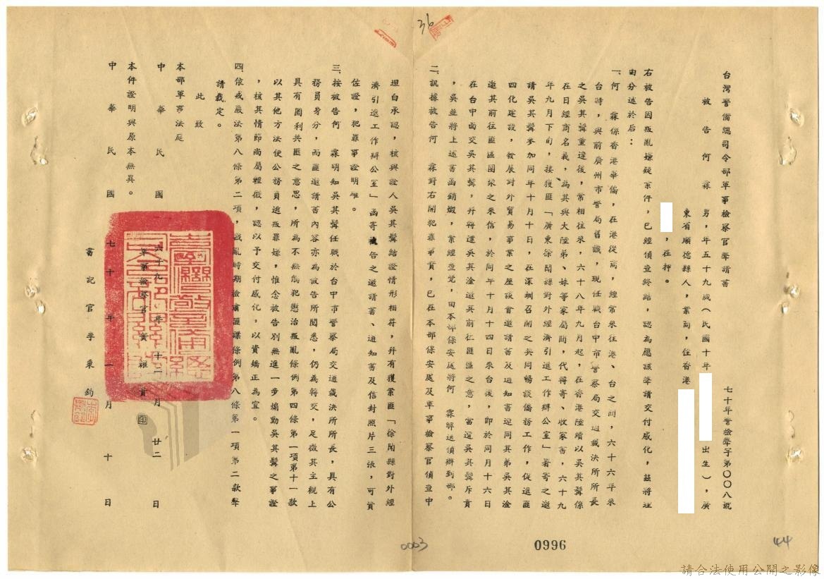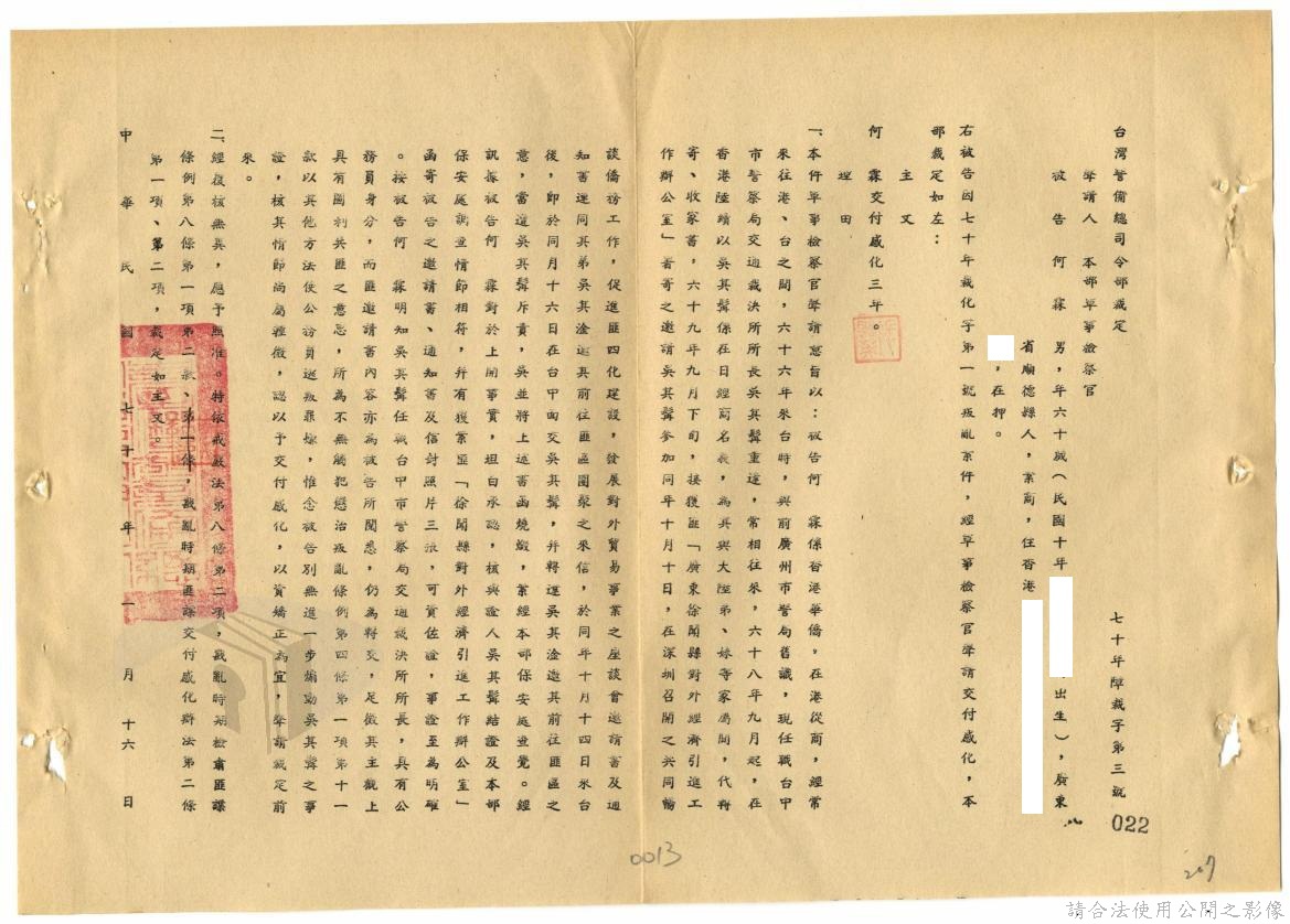 本案為69至72年間,臺灣警備總司令部保安處將華僑涉案相關資料移送臺灣警備總司令部審判,該部裁定予以交付感化,後臺灣警備總司令部仁愛教育實驗所因為該員感化期滿將其考核資料檢送臺灣警備總司令部報請結訓保釋,經警總審查考核後同意結訓。附筆錄、證人結文、書信、偵訊報告表、新生考核表、裁定書等文件資料。