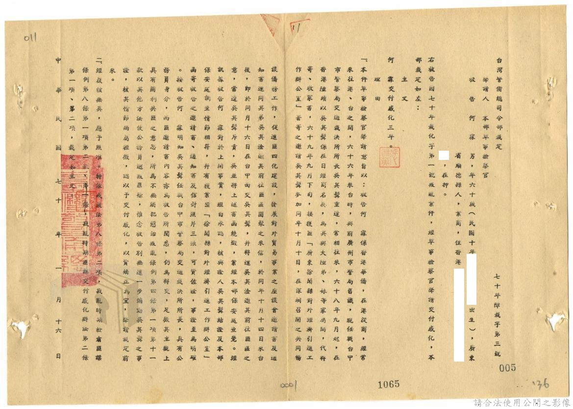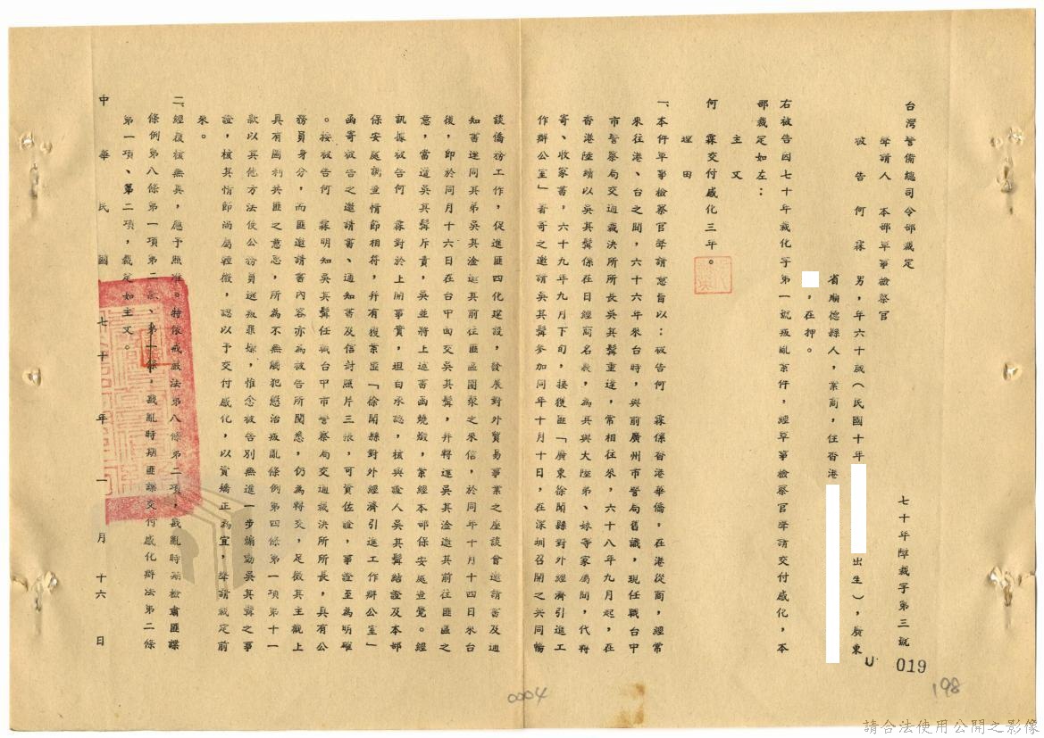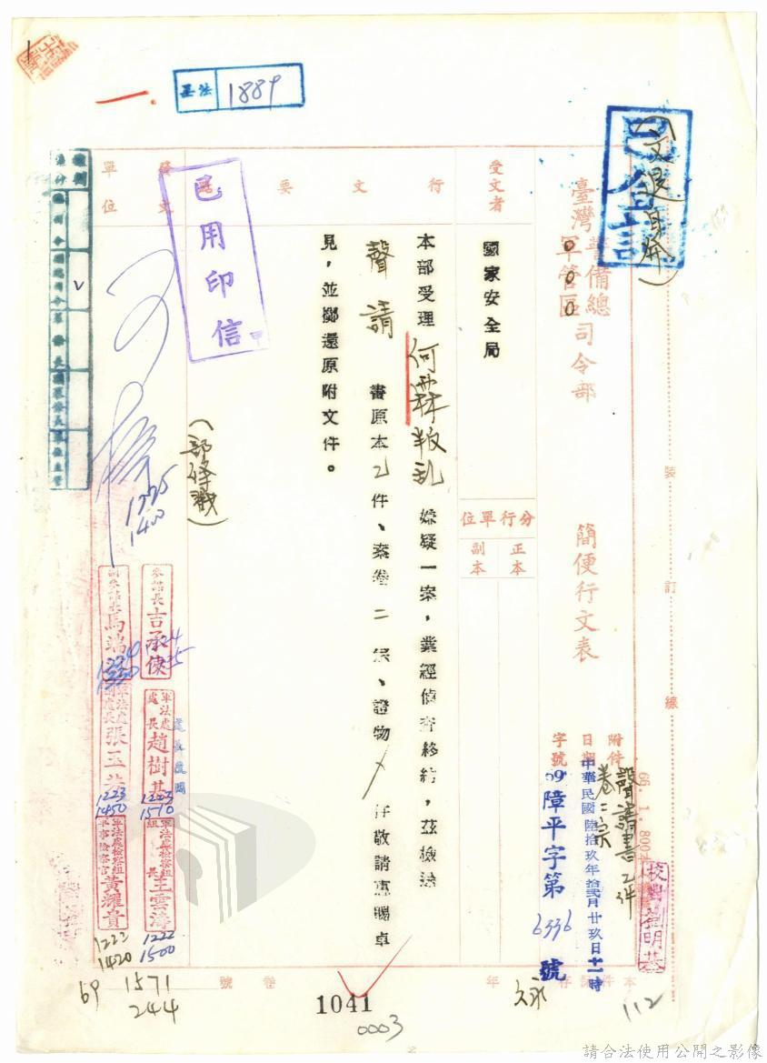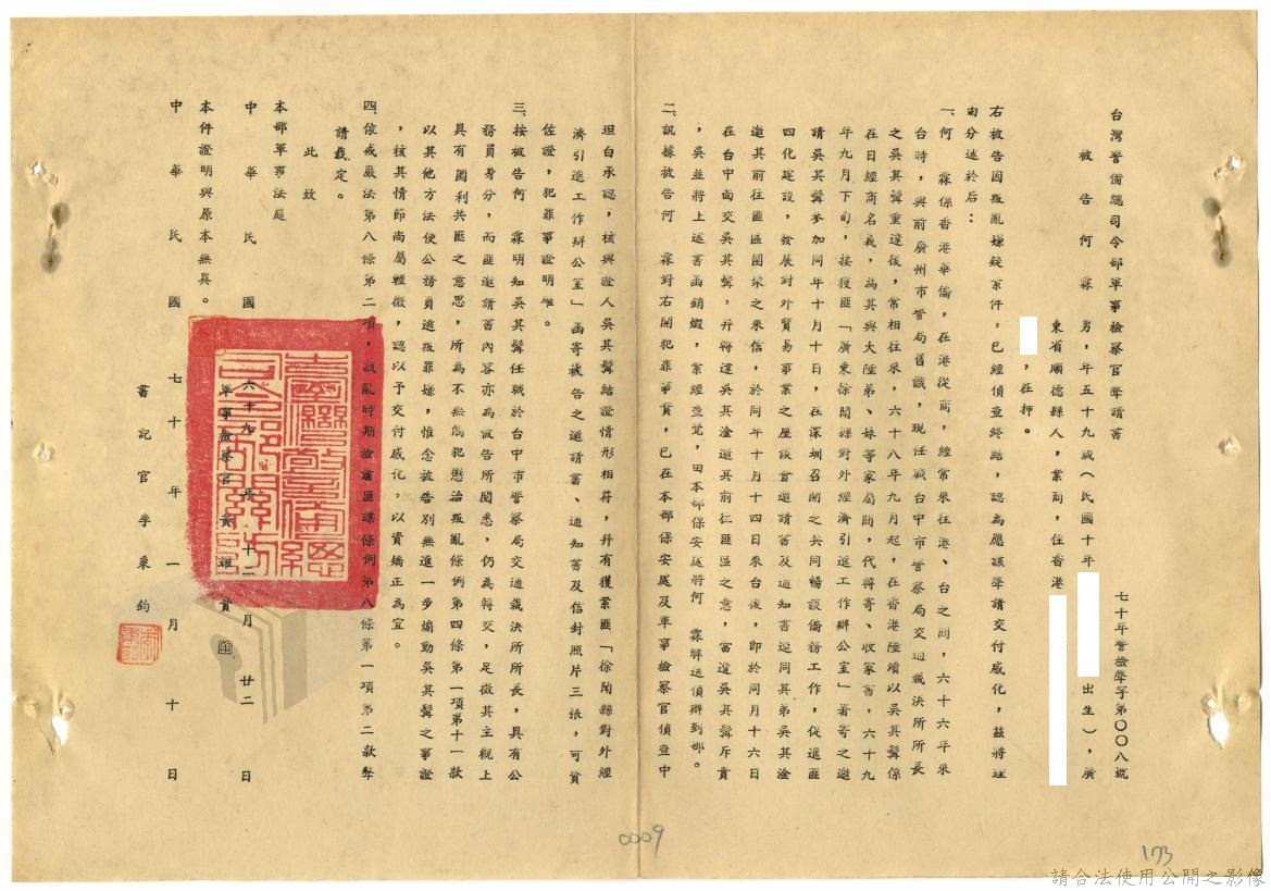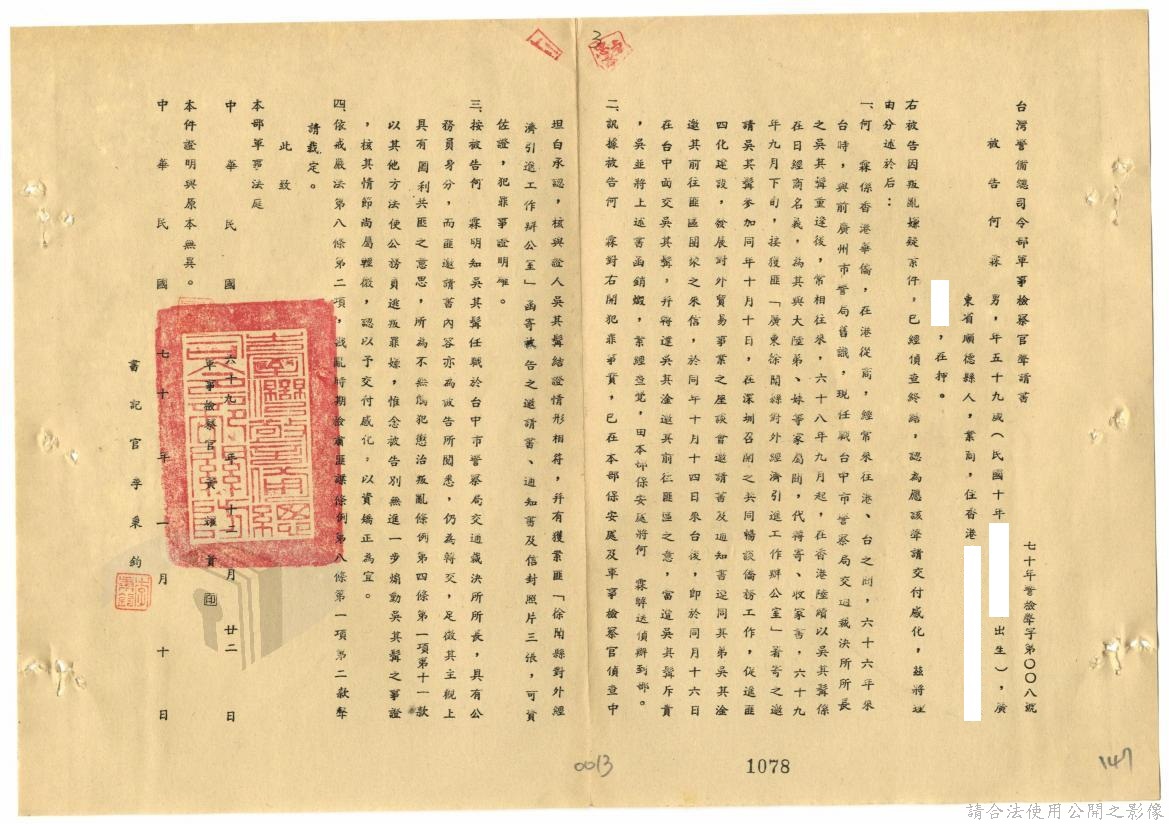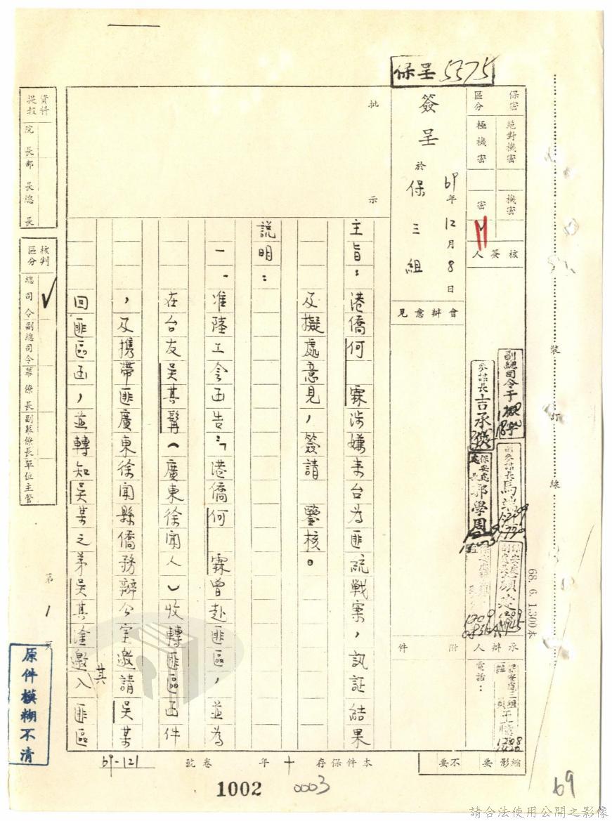 本案為69至72年間,臺灣警備總司令部保安處將華僑涉案相關資料移送臺灣警備總司令部審判,該部裁定予以交付感化,後臺灣警備總司令部仁愛教育實驗所因為該員感化期滿將其考核資料檢送臺灣警備總司令部報請結訓保釋,經警總審查考核後同意結訓。附筆錄、證人結文、書信、偵訊報告表、新生考核表、裁定書等文件資料。