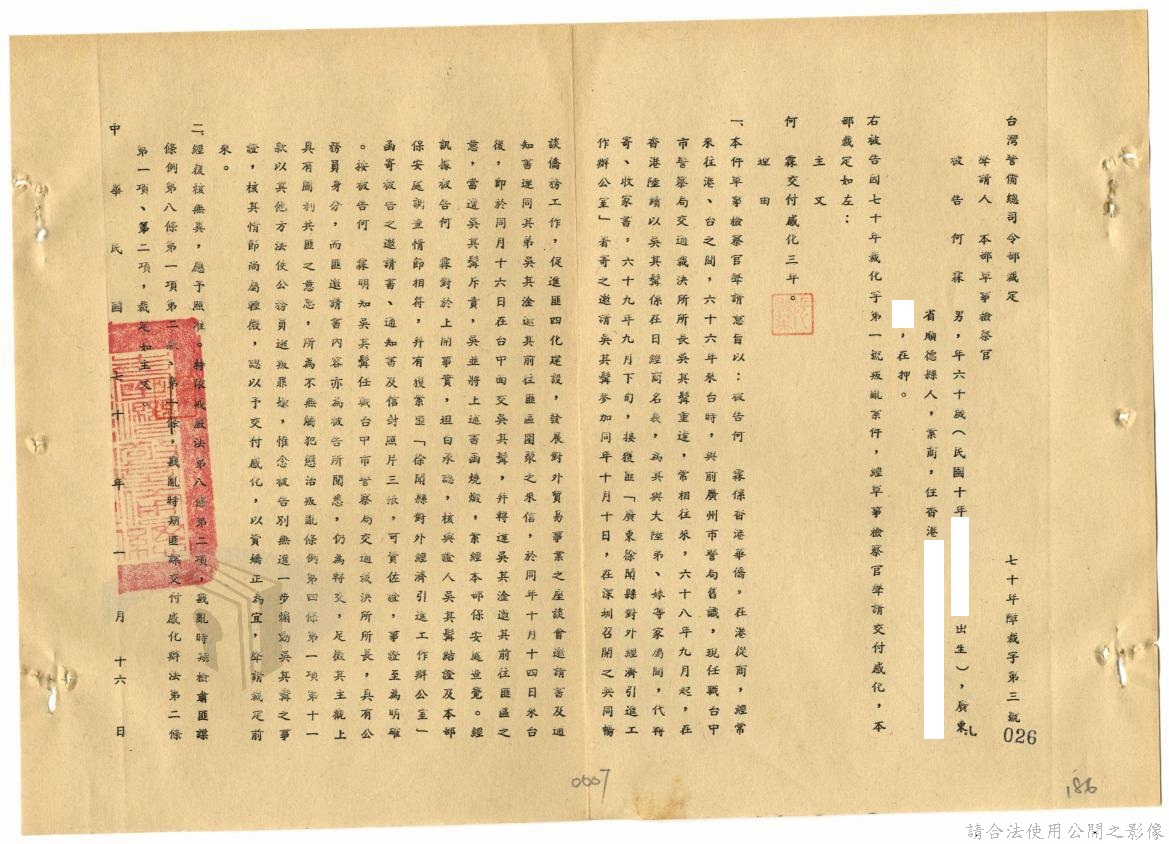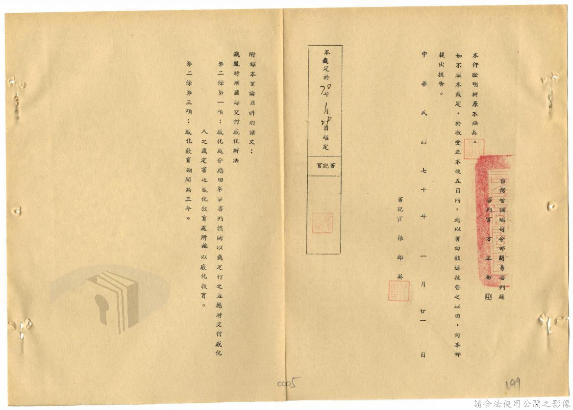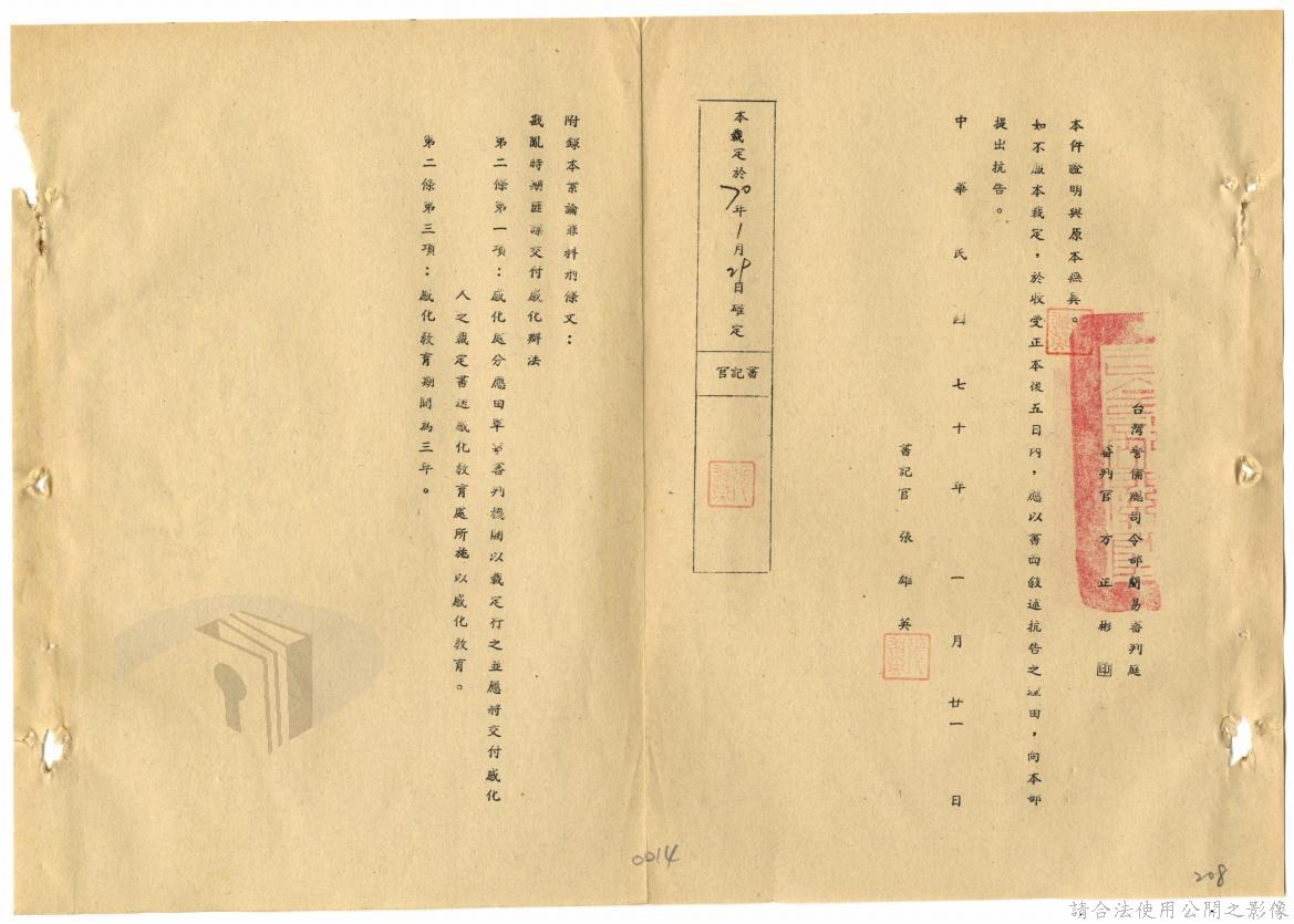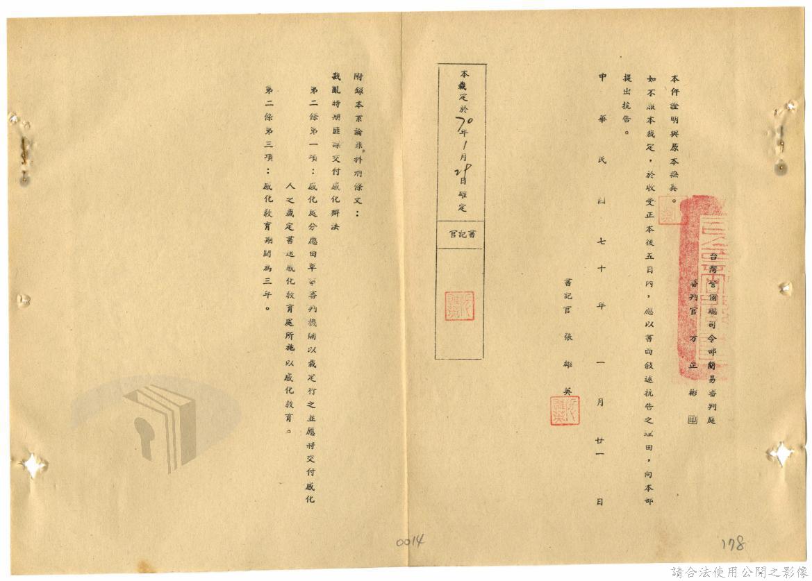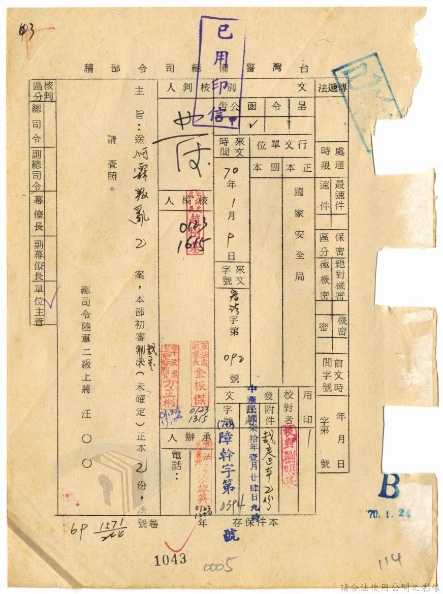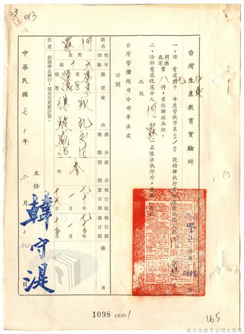 本案為69至72年間,臺灣警備總司令部保安處將華僑涉案相關資料移送臺灣警備總司令部審判,該部裁定予以交付感化,後臺灣警備總司令部仁愛教育實驗所因為該員感化期滿將其考核資料檢送臺灣警備總司令部報請結訓保釋,經警總審查考核後同意結訓。附筆錄、證人結文、書信、偵訊報告表、新生考核表、裁定書等文件資料。