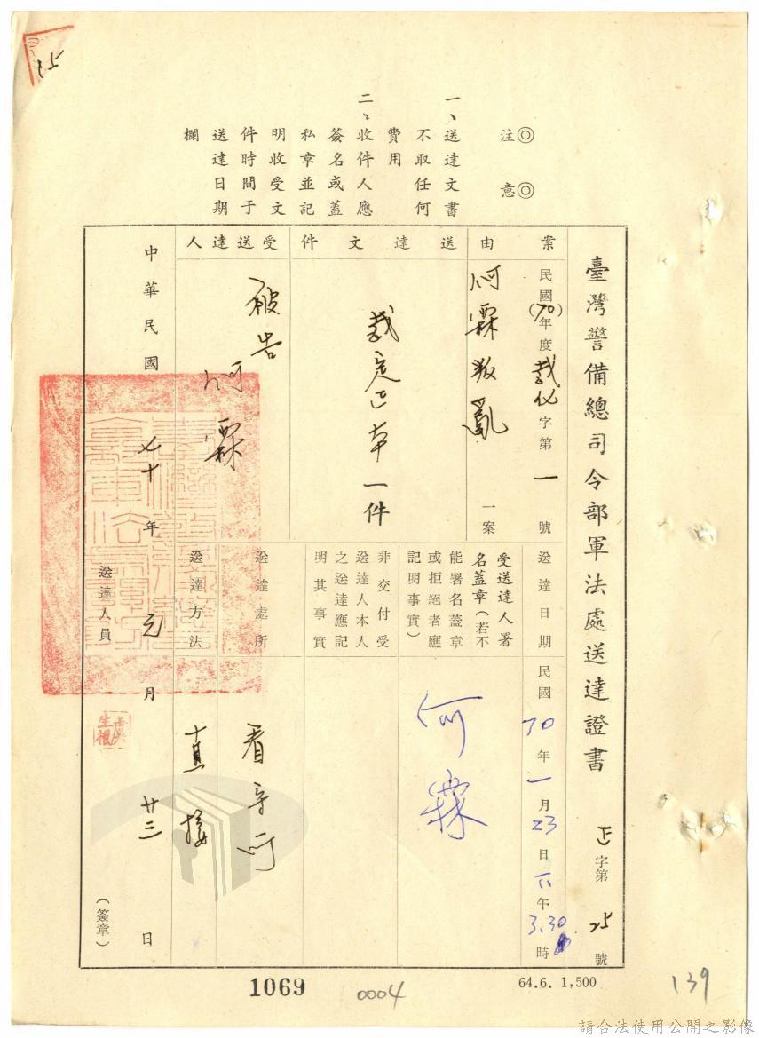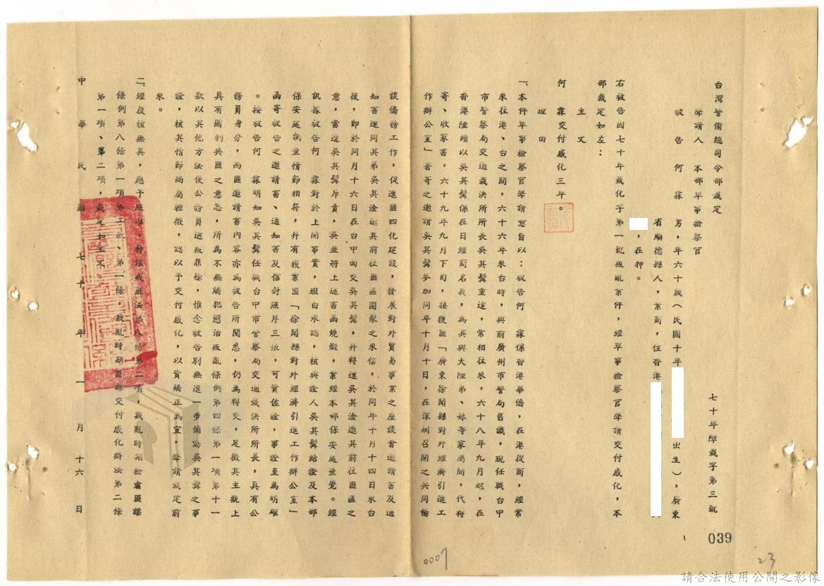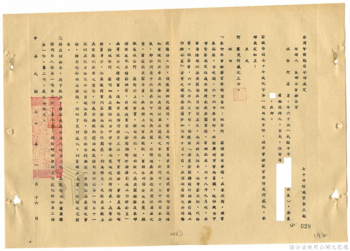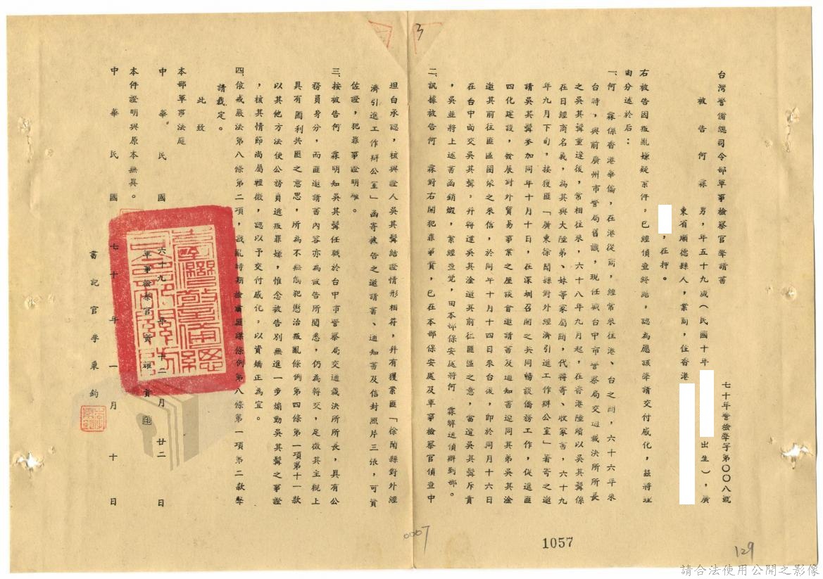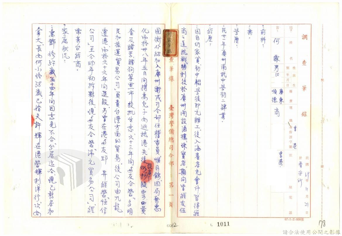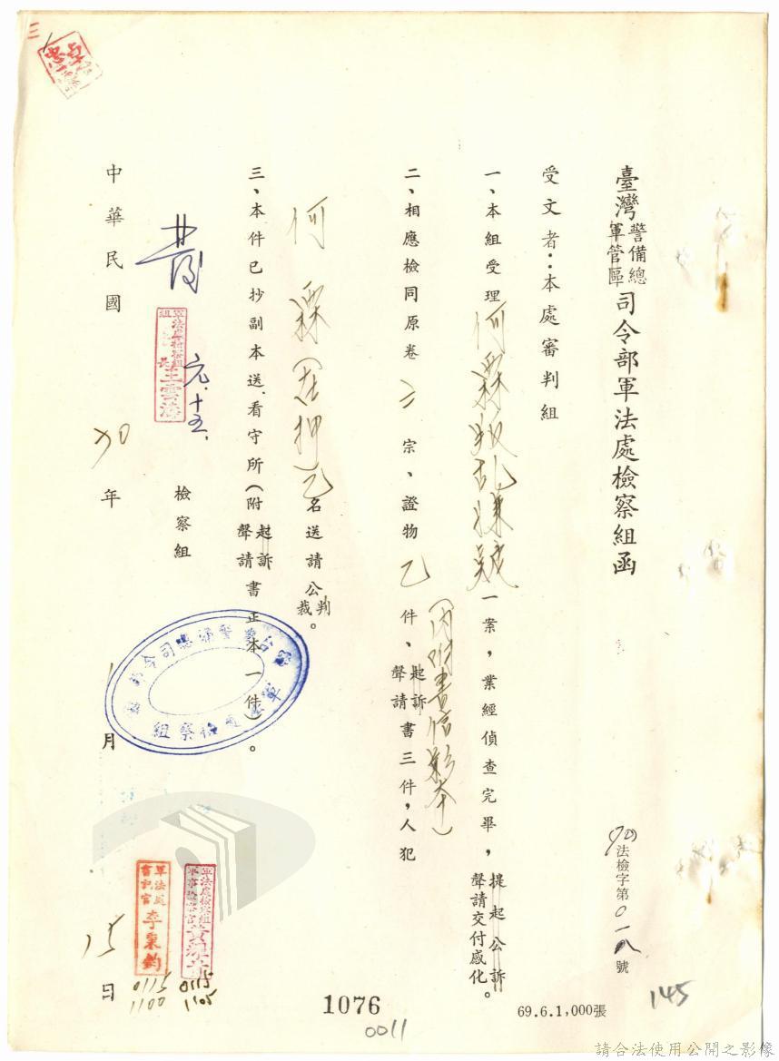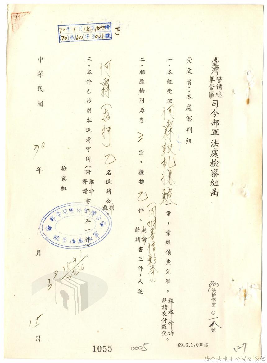 本案為69至72年間,臺灣警備總司令部保安處將華僑涉案相關資料移送臺灣警備總司令部審判,該部裁定予以交付感化,後臺灣警備總司令部仁愛教育實驗所因為該員感化期滿將其考核資料檢送臺灣警備總司令部報請結訓保釋,經警總審查考核後同意結訓。附筆錄、證人結文、書信、偵訊報告表、新生考核表、裁定書等文件資料。