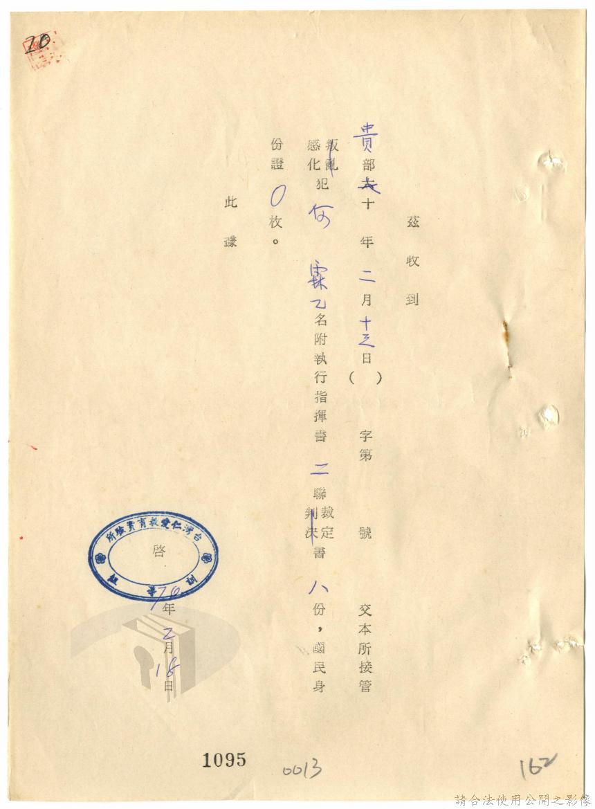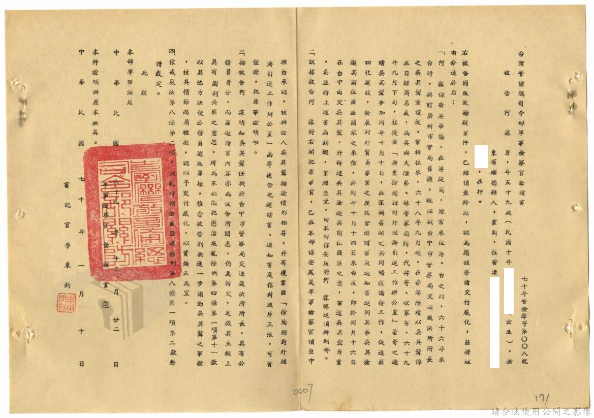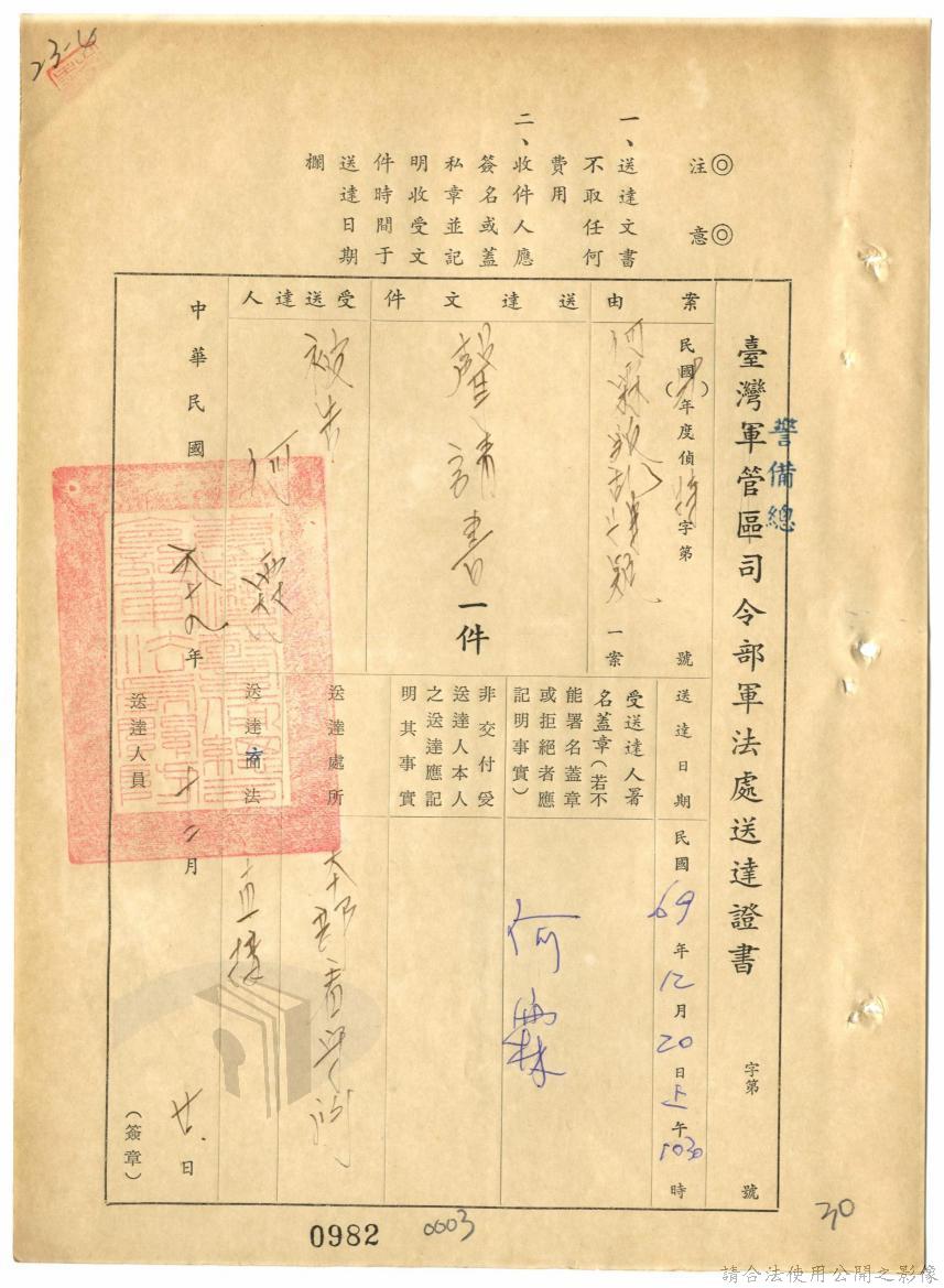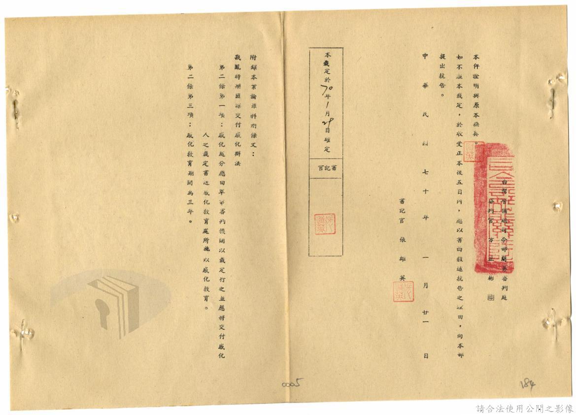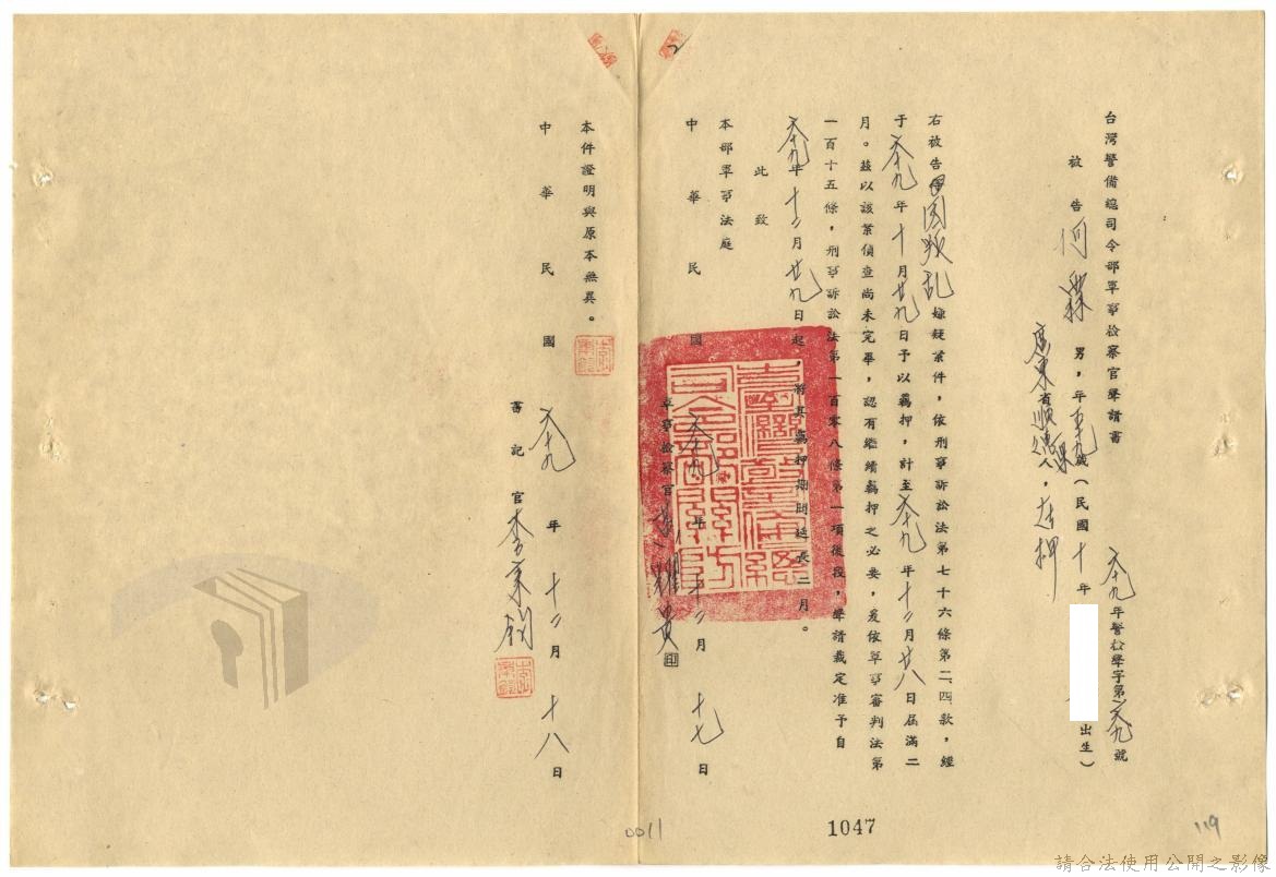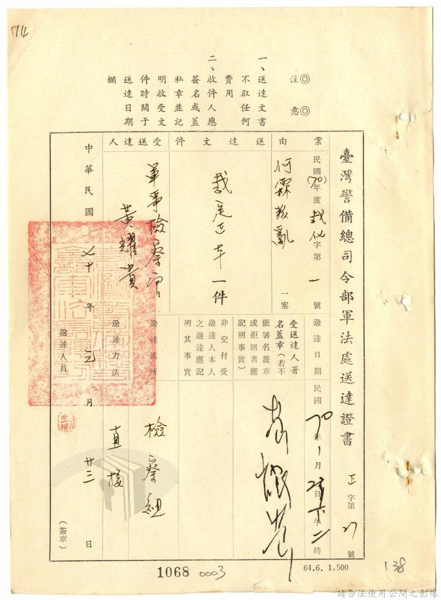本案為69至72年間,臺灣警備總司令部保安處將華僑涉案相關資料移送臺灣警備總司令部審判,該部裁定予以交付感化,後臺灣警備總司令部仁愛教育實驗所因為該員感化期滿將其考核資料檢送臺灣警備總司令部報請結訓保釋,經警總審查考核後同意結訓。附筆錄、證人結文、書信、偵訊報告表、新生考核表、裁定書等文件資料。