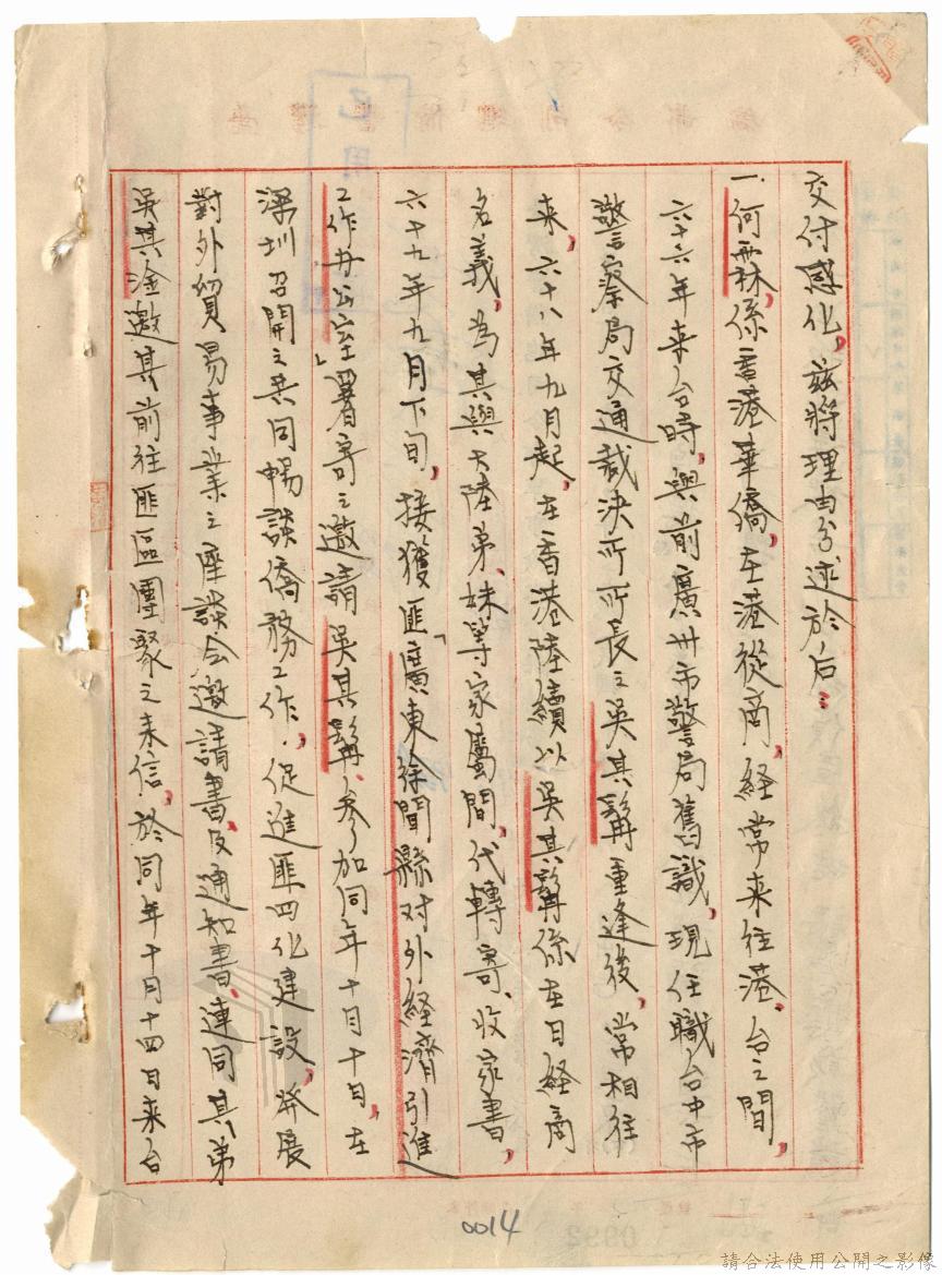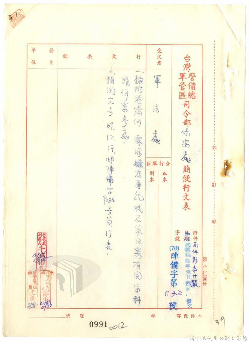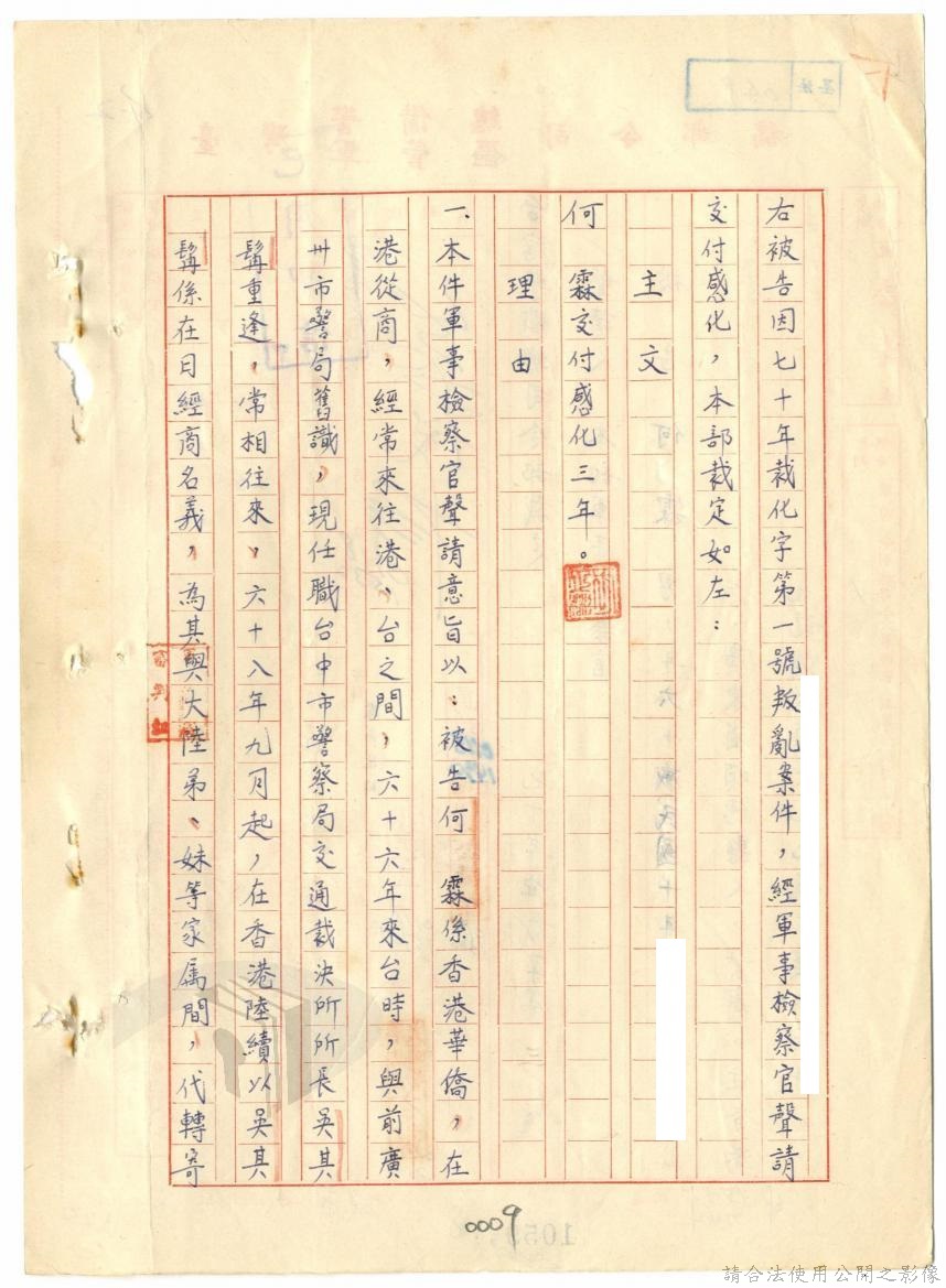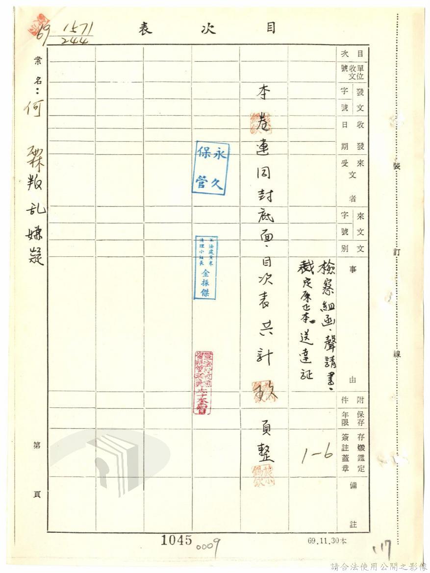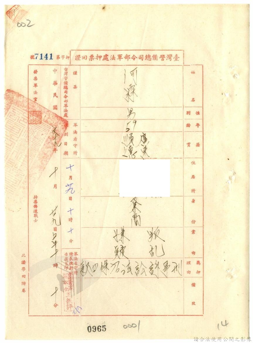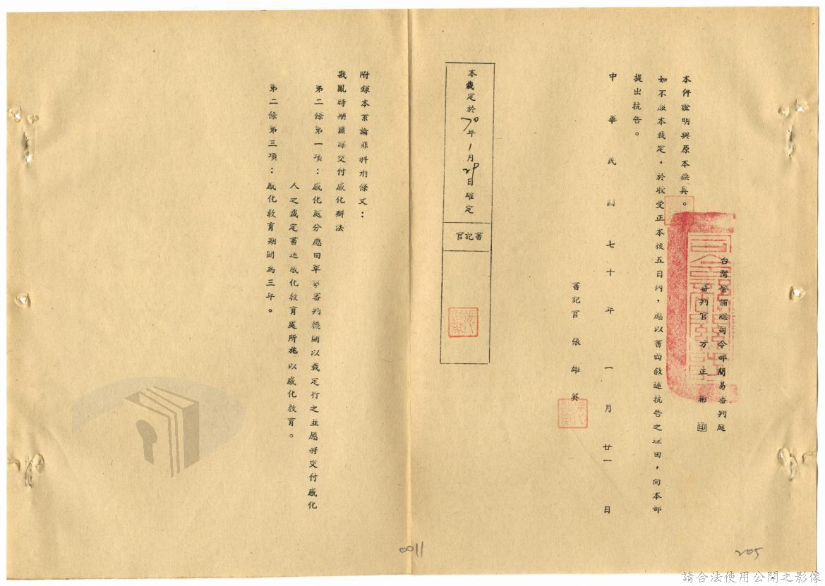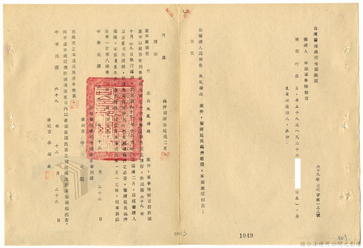 本案為69至72年間,臺灣警備總司令部保安處將華僑涉案相關資料移送臺灣警備總司令部審判,該部裁定予以交付感化,後臺灣警備總司令部仁愛教育實驗所因為該員感化期滿將其考核資料檢送臺灣警備總司令部報請結訓保釋,經警總審查考核後同意結訓。附筆錄、證人結文、書信、偵訊報告表、新生考核表、裁定書等文件資料。