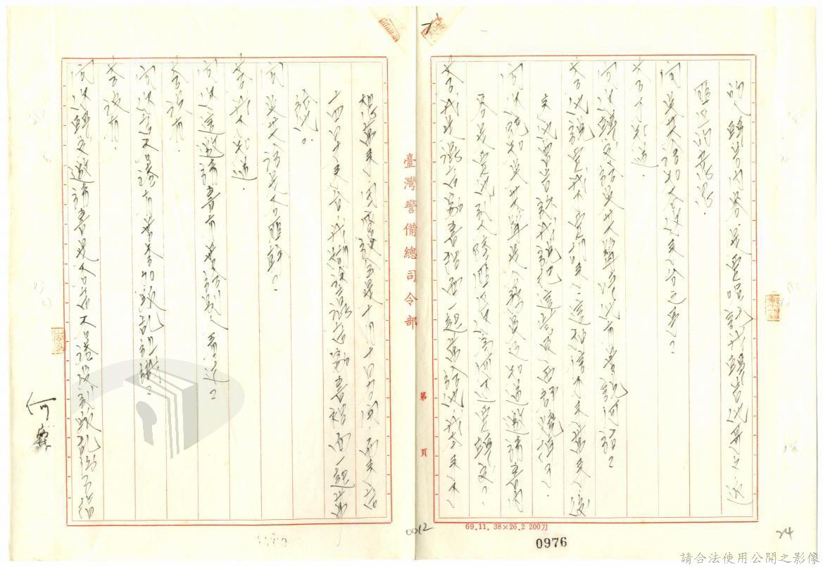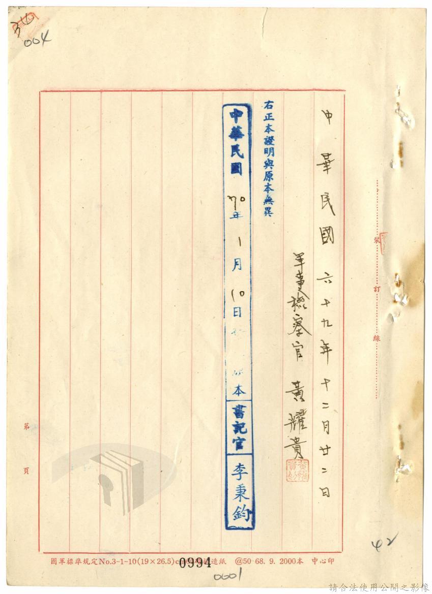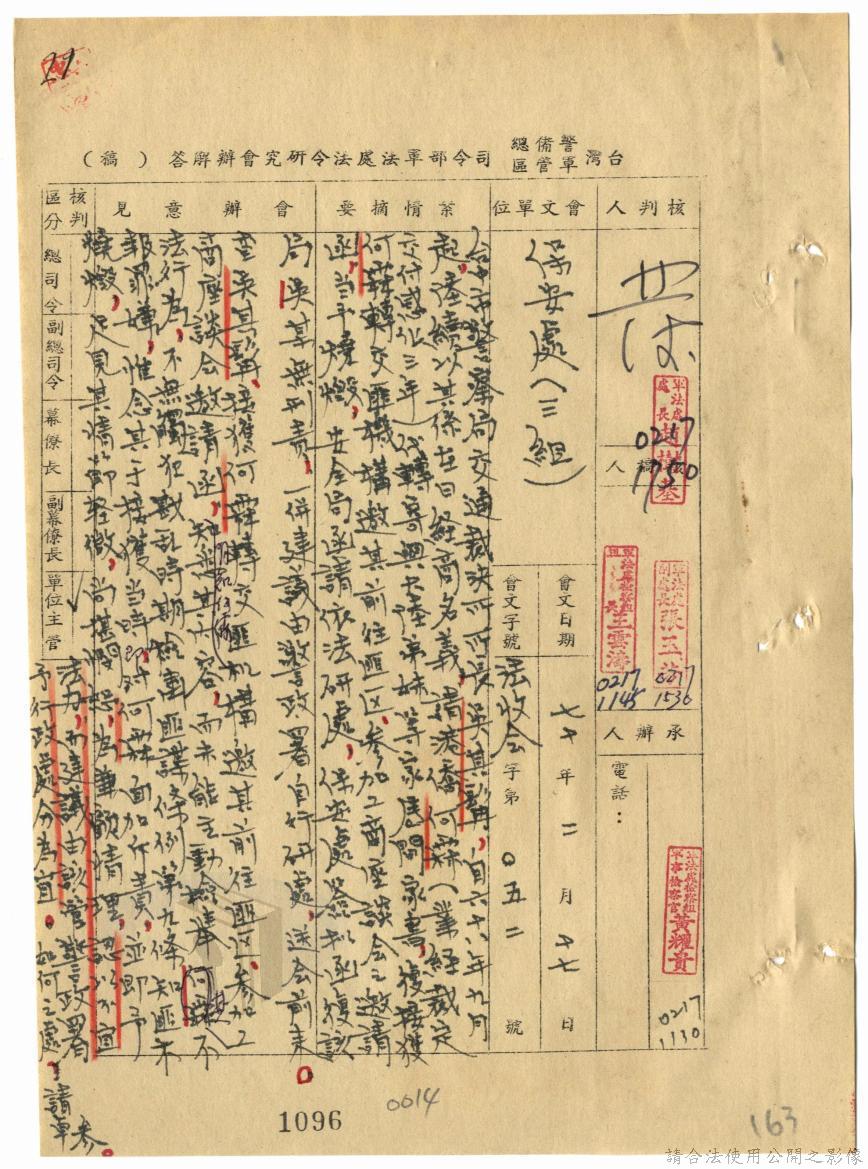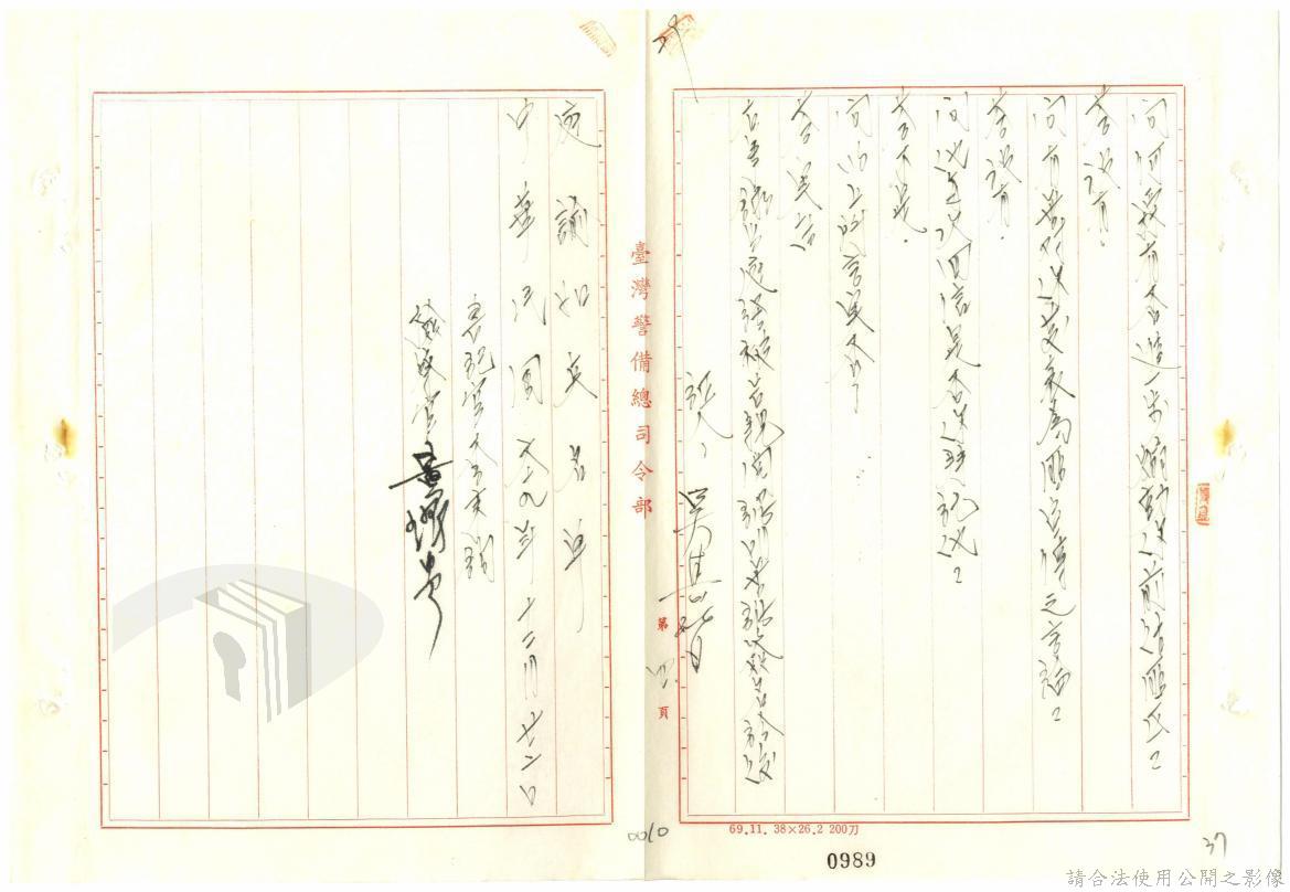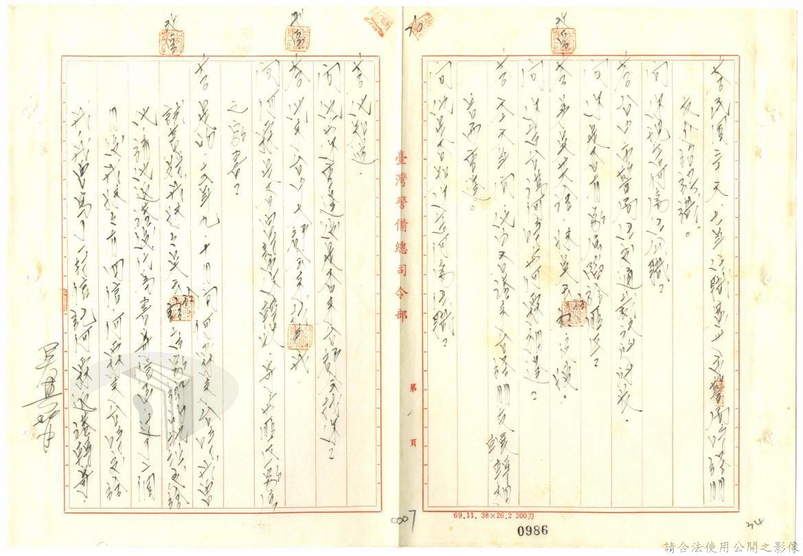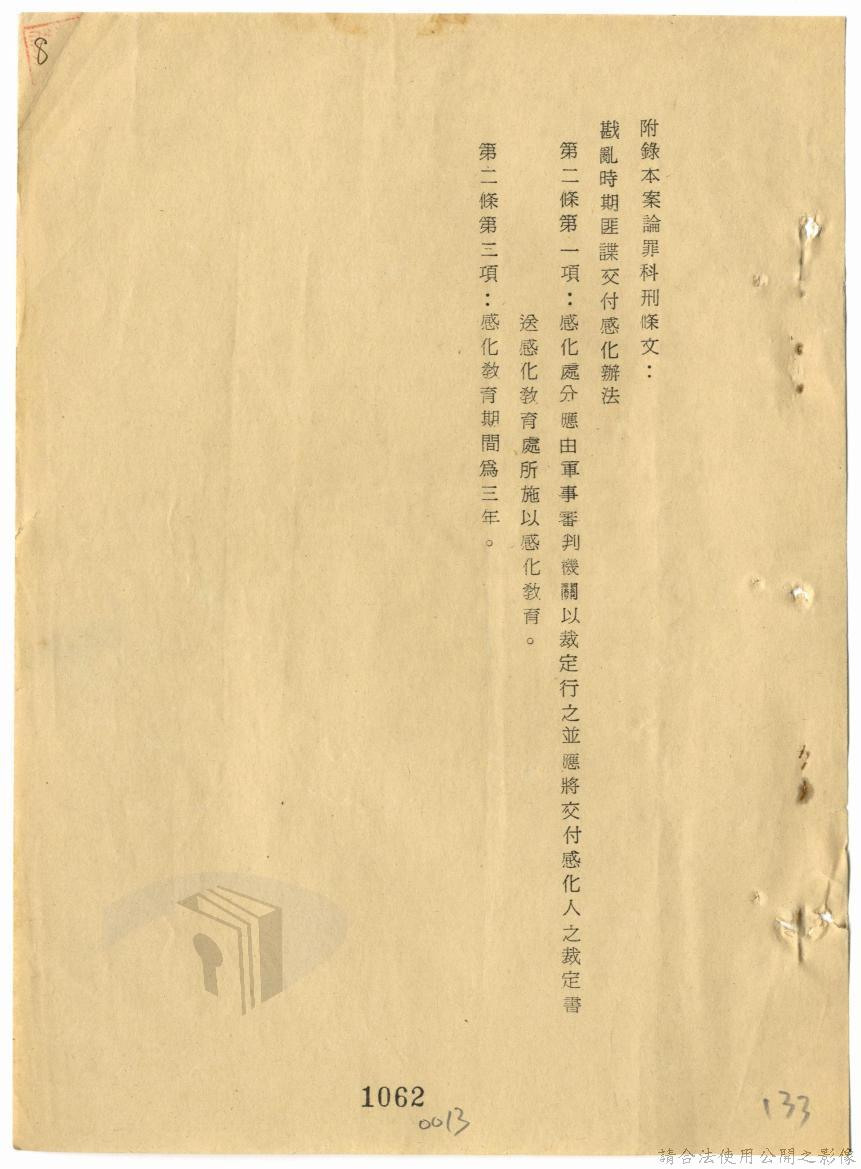 本案為69至72年間,臺灣警備總司令部保安處將華僑涉案相關資料移送臺灣警備總司令部審判,該部裁定予以交付感化,後臺灣警備總司令部仁愛教育實驗所因為該員感化期滿將其考核資料檢送臺灣警備總司令部報請結訓保釋,經警總審查考核後同意結訓。附筆錄、證人結文、書信、偵訊報告表、新生考核表、裁定書等文件資料。