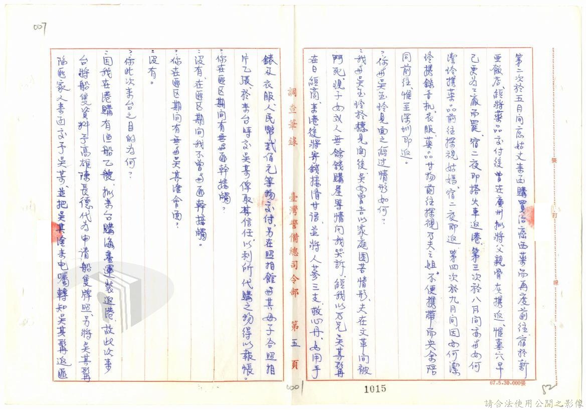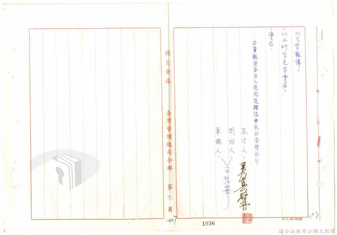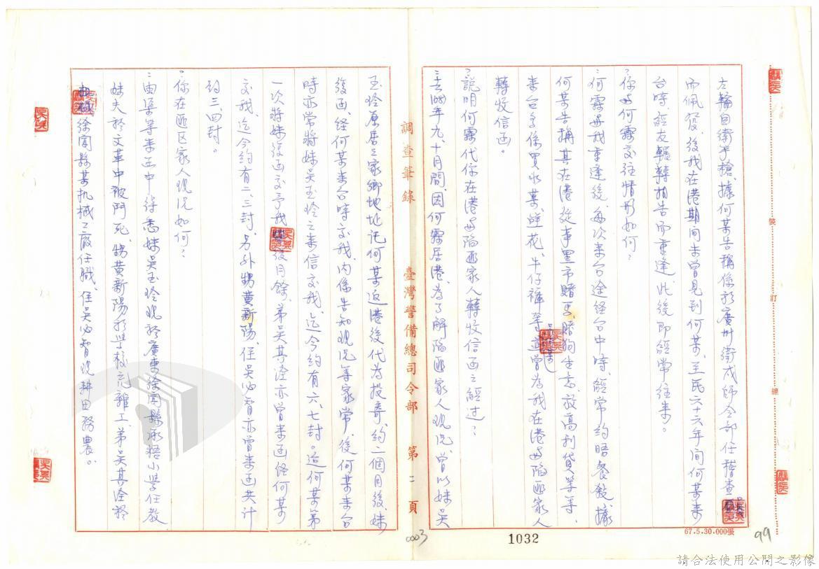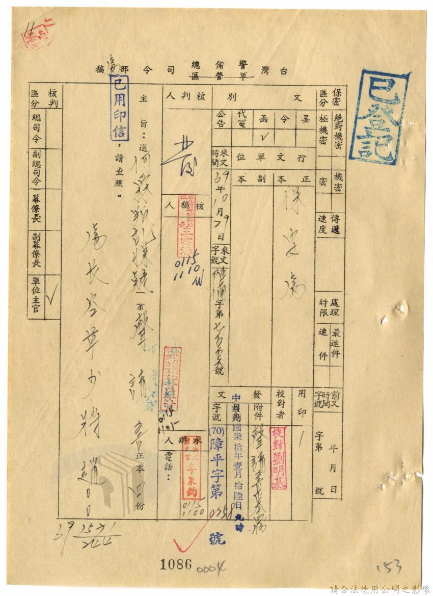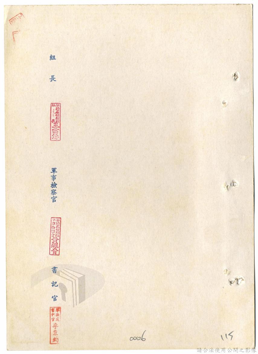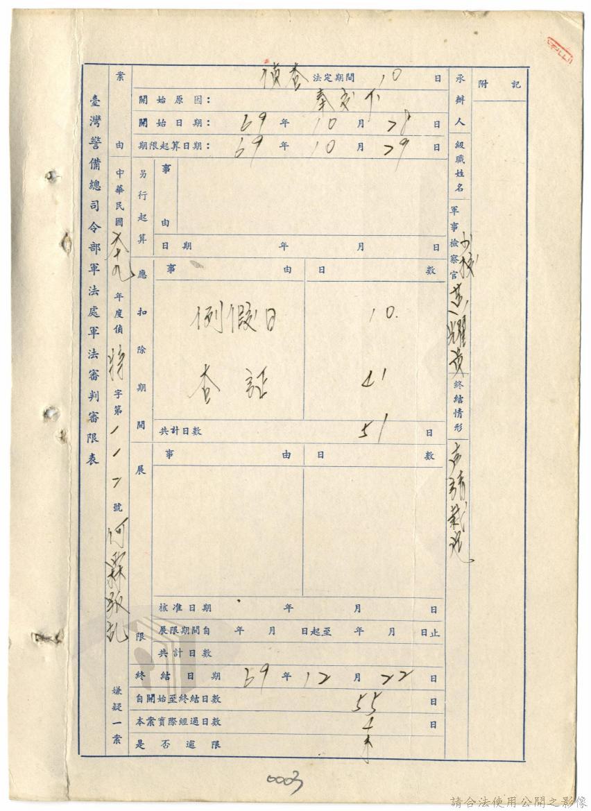 本案為69至72年間,臺灣警備總司令部保安處將華僑涉案相關資料移送臺灣警備總司令部審判,該部裁定予以交付感化,後臺灣警備總司令部仁愛教育實驗所因為該員感化期滿將其考核資料檢送臺灣警備總司令部報請結訓保釋,經警總審查考核後同意結訓。附筆錄、證人結文、書信、偵訊報告表、新生考核表、裁定書等文件資料。