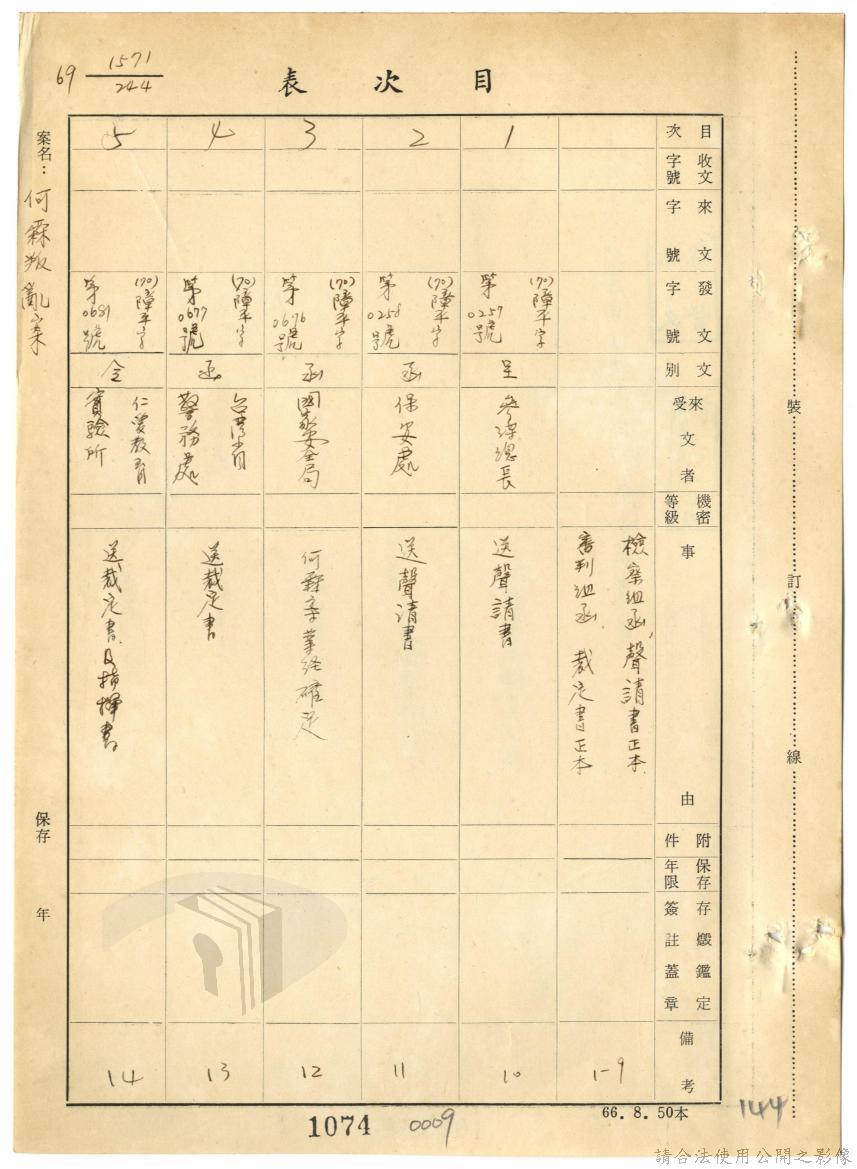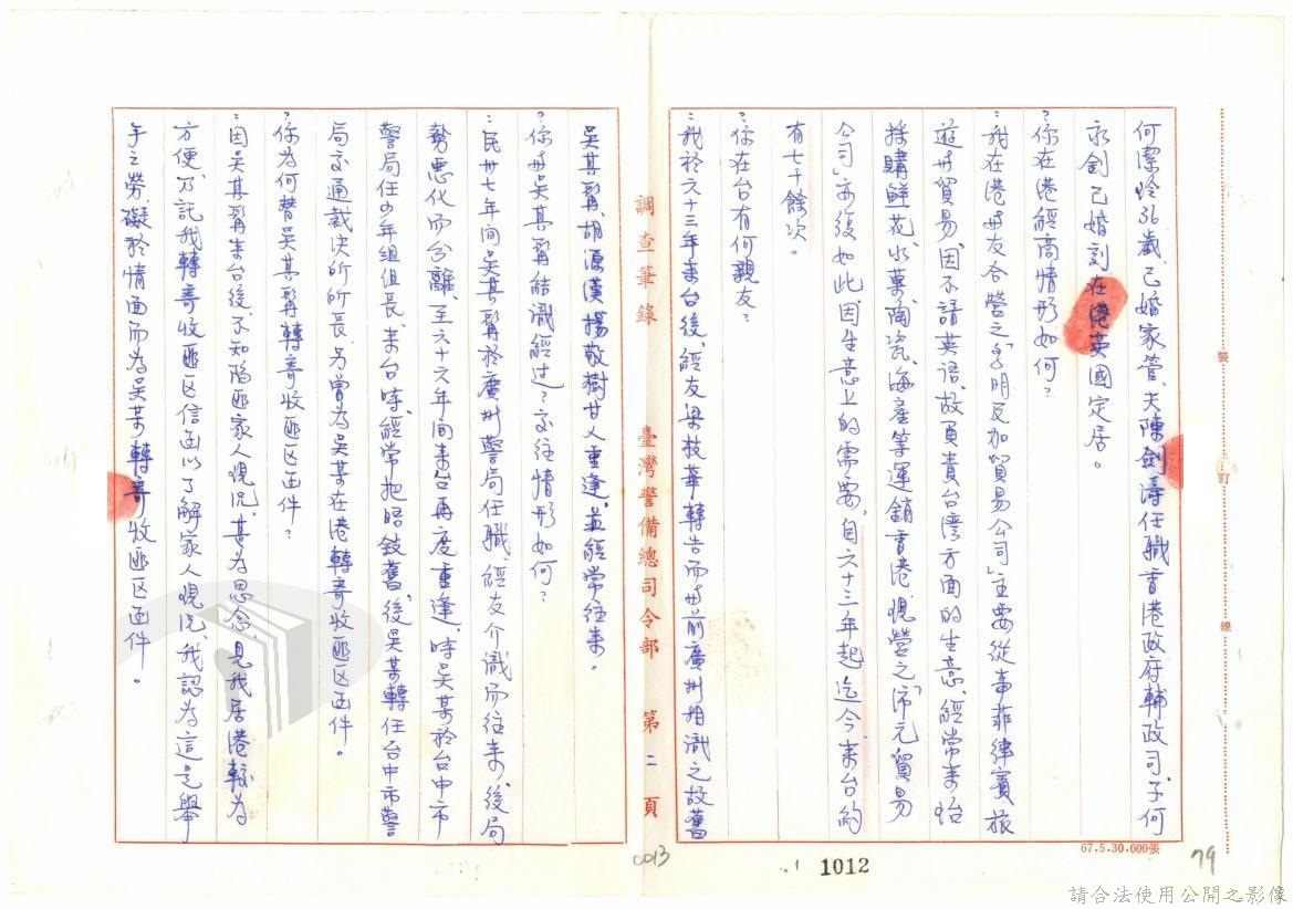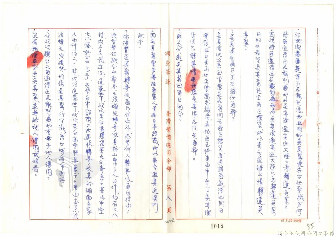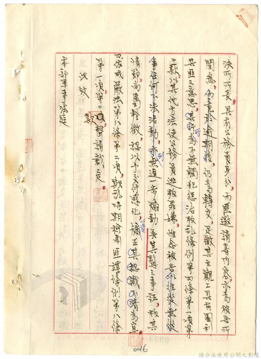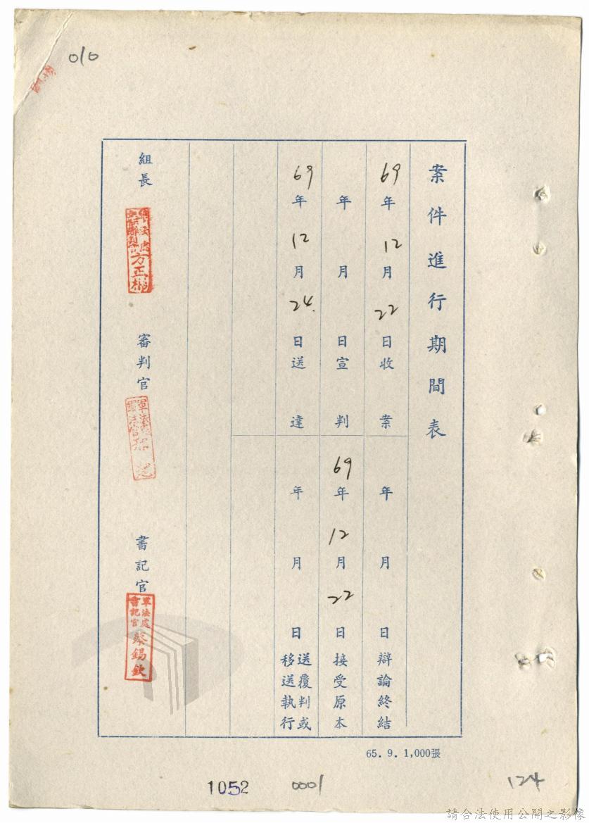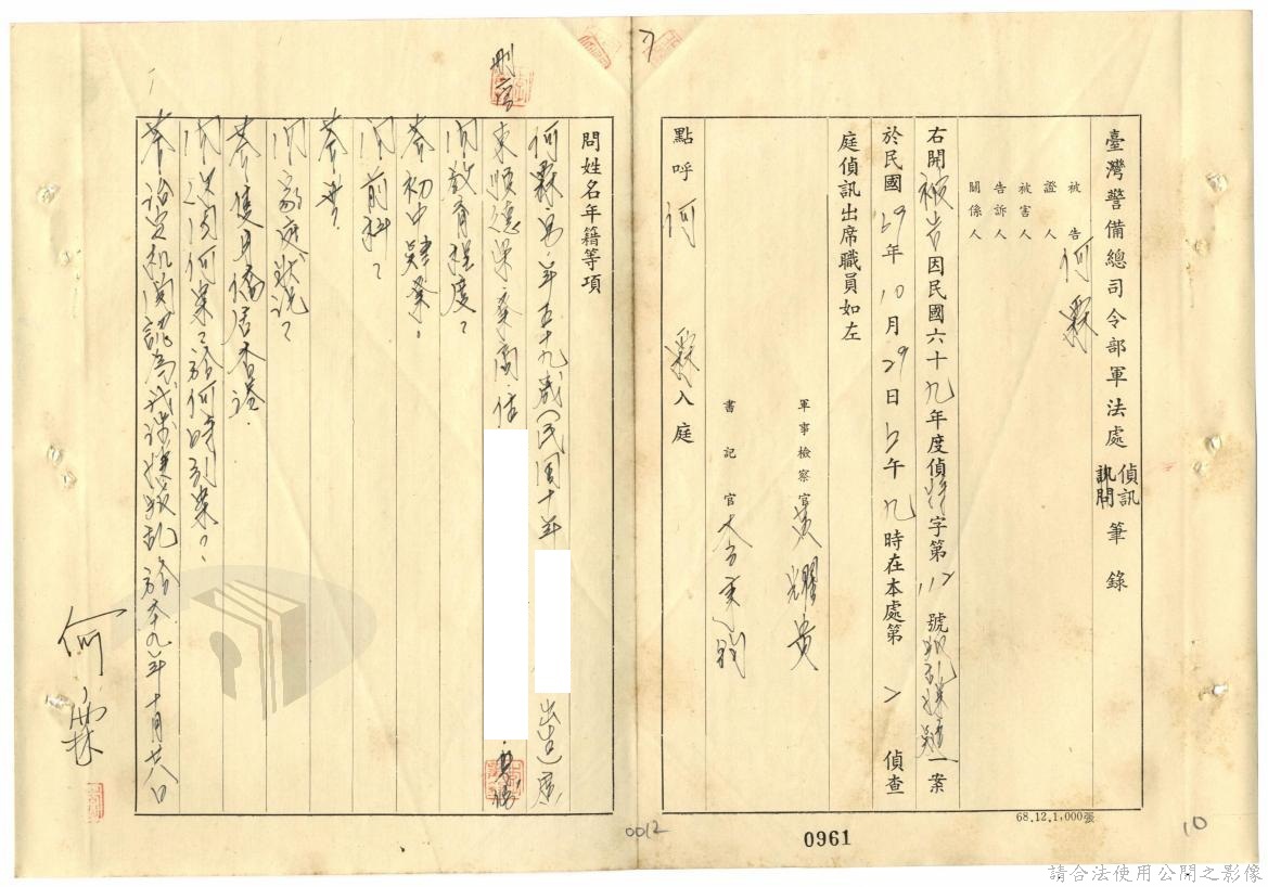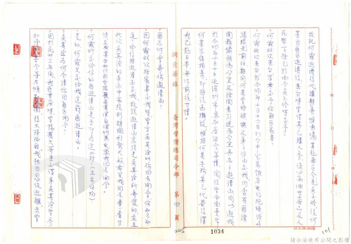 本案為69至72年間,臺灣警備總司令部保安處將華僑涉案相關資料移送臺灣警備總司令部審判,該部裁定予以交付感化,後臺灣警備總司令部仁愛教育實驗所因為該員感化期滿將其考核資料檢送臺灣警備總司令部報請結訓保釋,經警總審查考核後同意結訓。附筆錄、證人結文、書信、偵訊報告表、新生考核表、裁定書等文件資料。