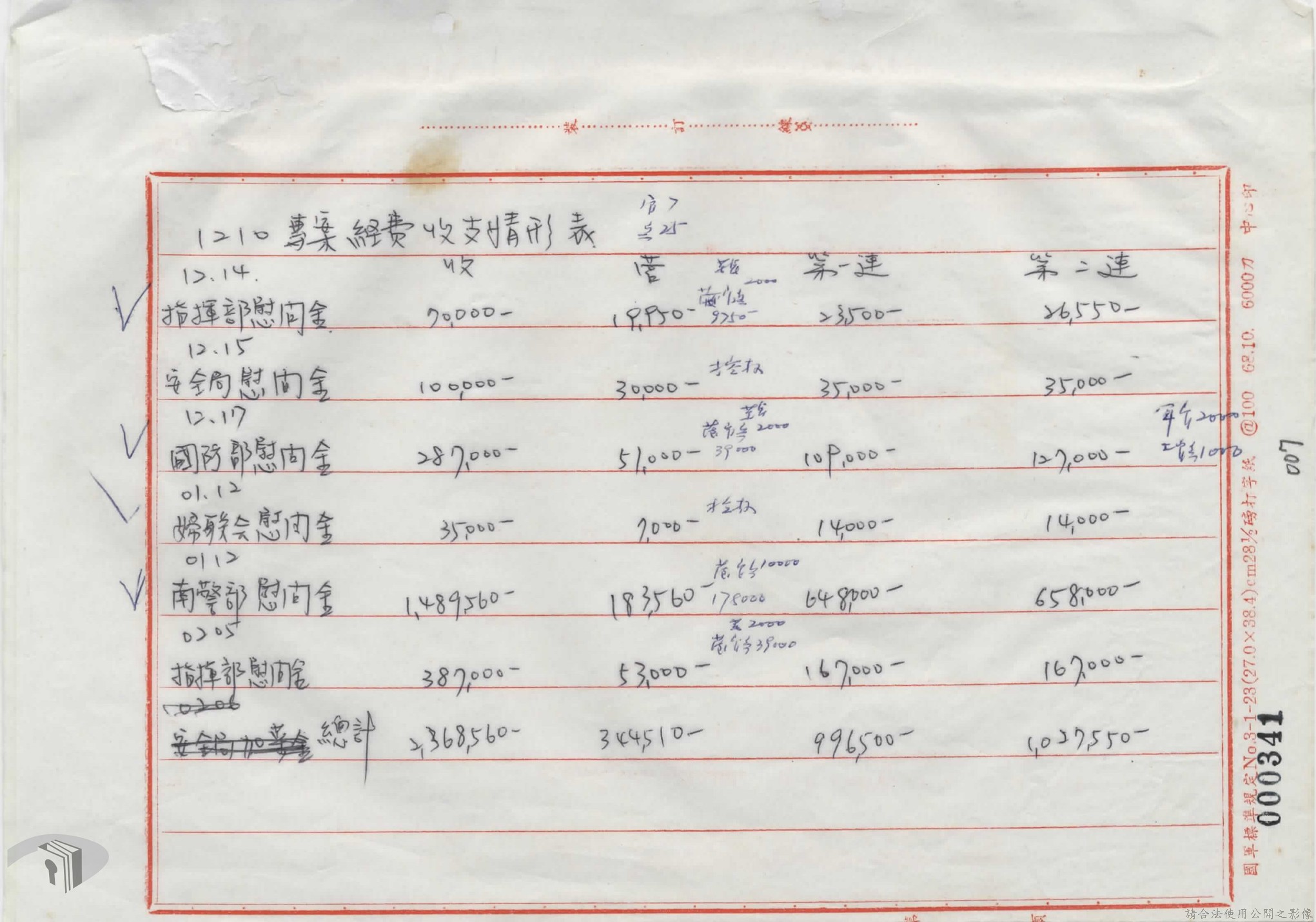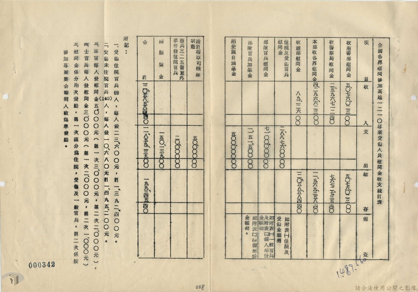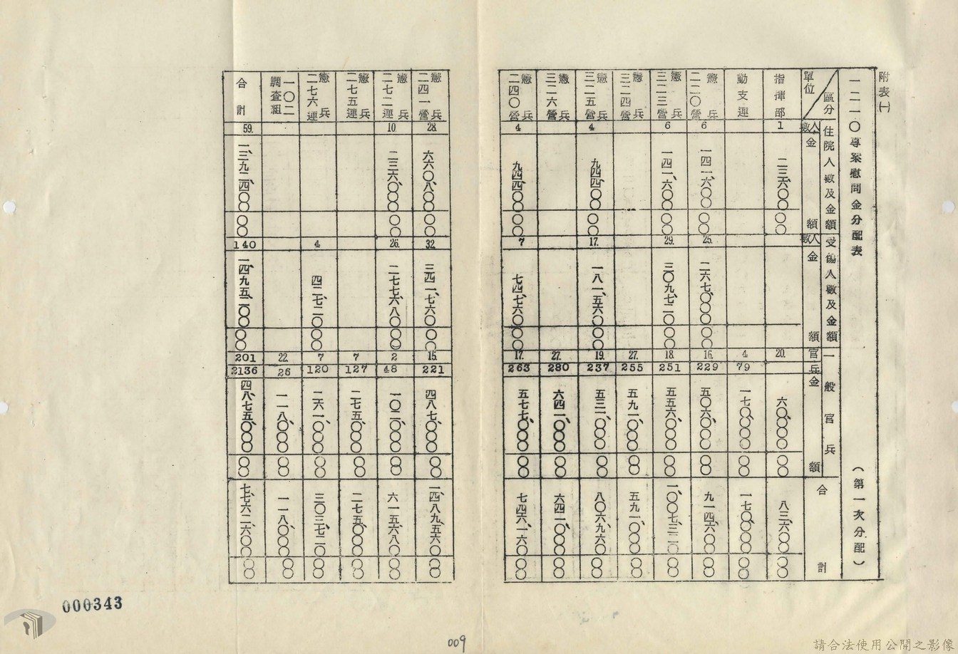 本案為69年間,憲兵司令部因為憲兵二四一營分配一二一零專案慰問金不公的關係,函請二四一營將所領取的款項列表公布,以取得官兵的信任。附一二一零專案收支情形表、全國各界慰問參加高雄一二一零專案受傷人員慰問金收支統計表、會議紀錄等文件資料。