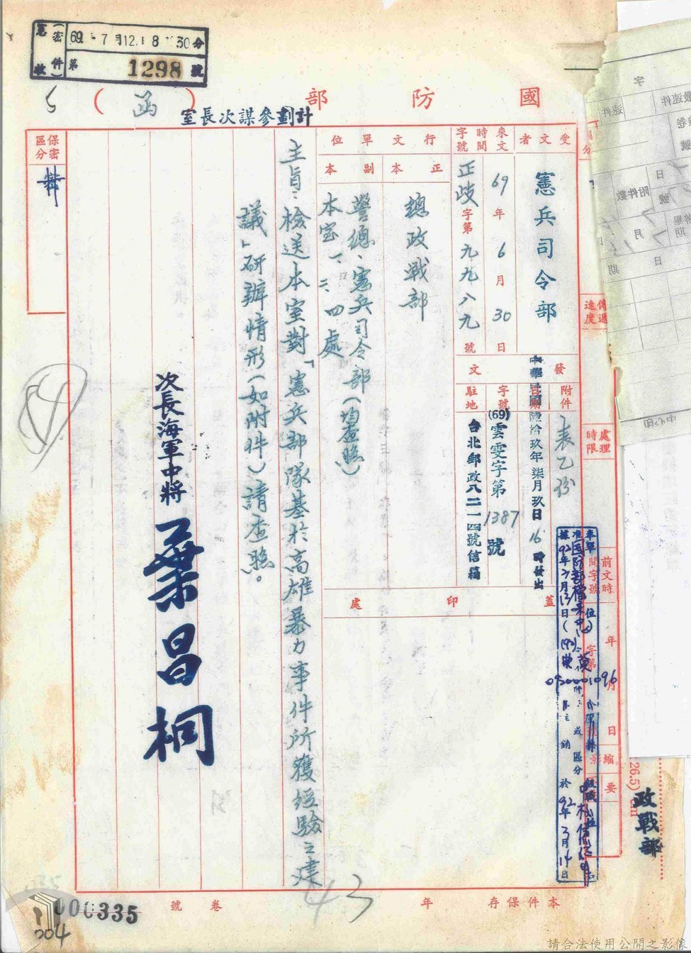 本案為69年間,國防部、國防部參謀次長室檢送「憲兵部隊基於高雄暴力事件所獲經驗之建議分辦表」、「高雄暴力事件憲兵部隊之運用及防處檢討報告」等資料給憲兵司令部,憲兵司令部後將建議分辦表、檢討報告轉發相關單位。