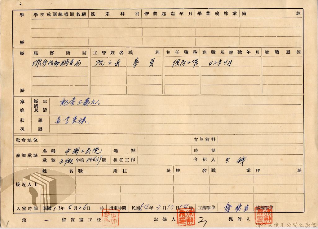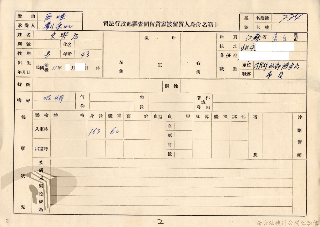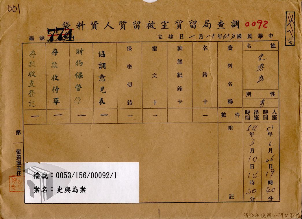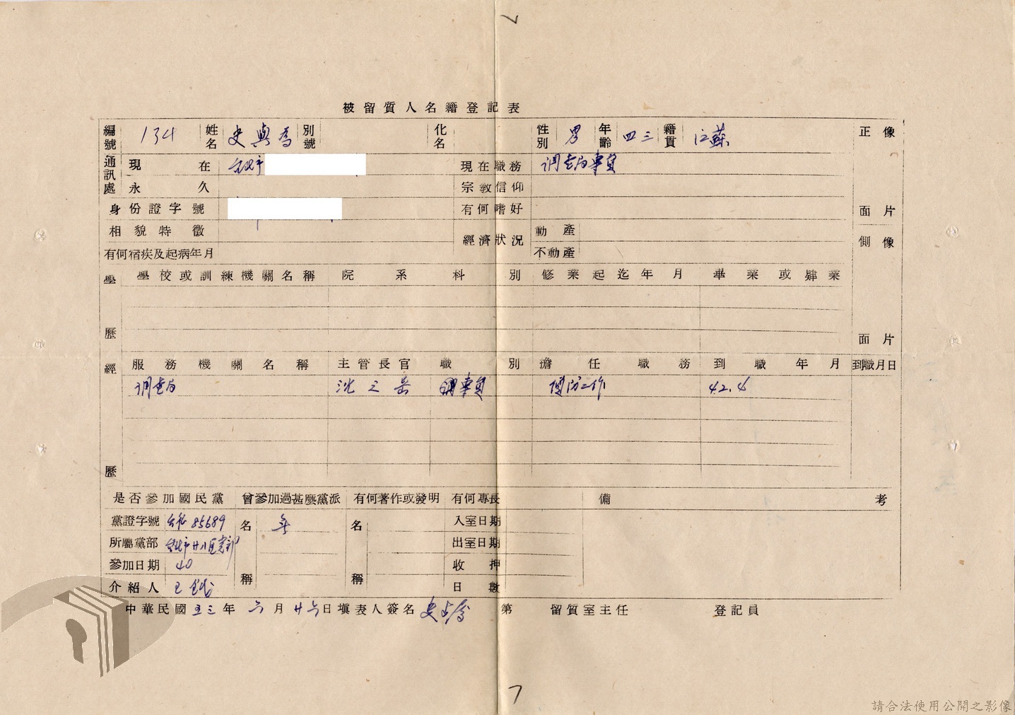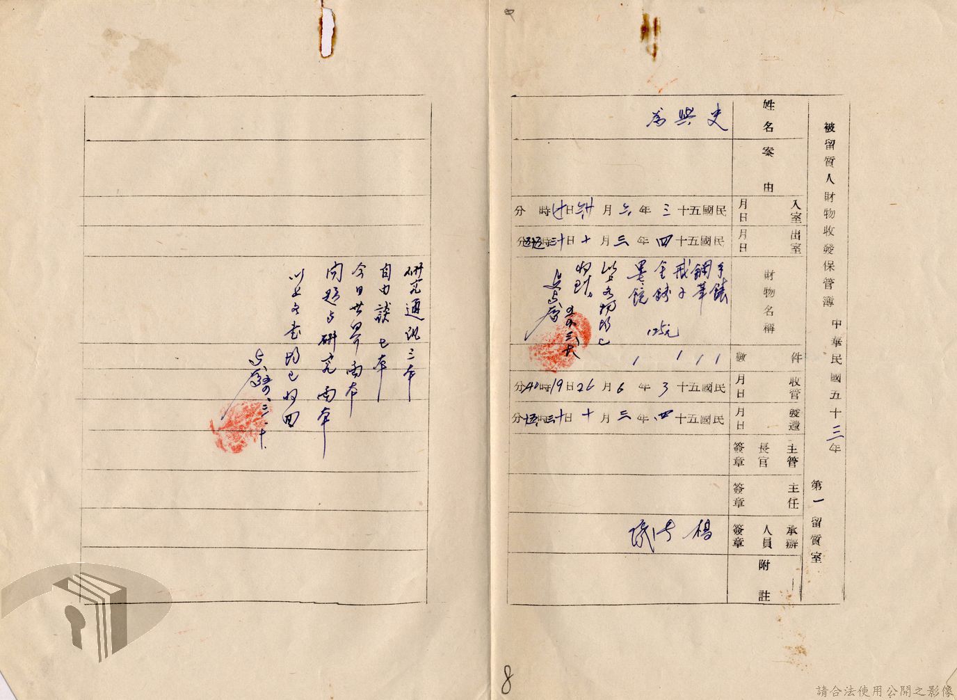 本案為53至54年間,司法行政部調查局留質室被留質人資料袋,內有身份名籍卡、指紋卡片、通知單、收支登記簿、收付單、意見表、財物收發保管簿及名籍登記表,登記表載有被留質人之編號、姓名、性別、年齡、籍貫、通訊處、身份證字號、職務、黨派歸屬及經歷等欄位資料;財物收發保管簿載有被留質人之財物名稱等欄位資料。