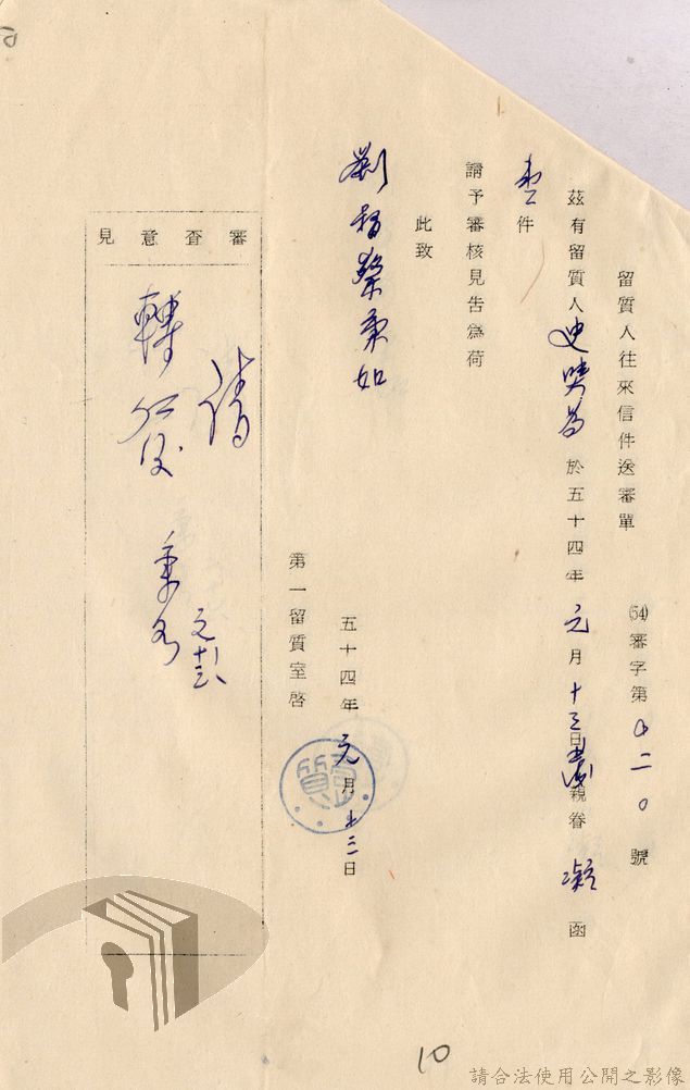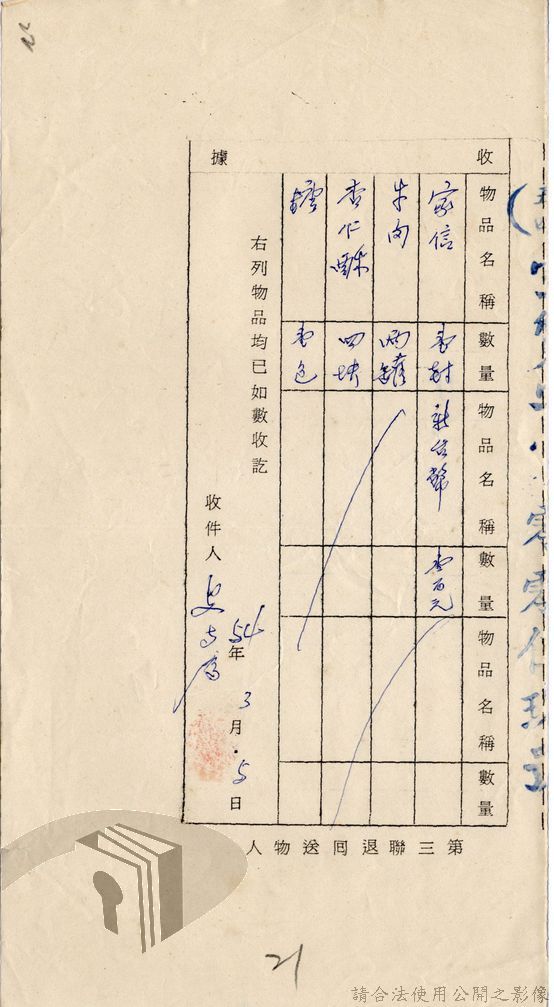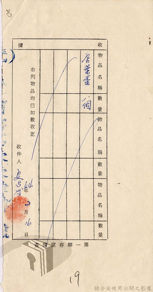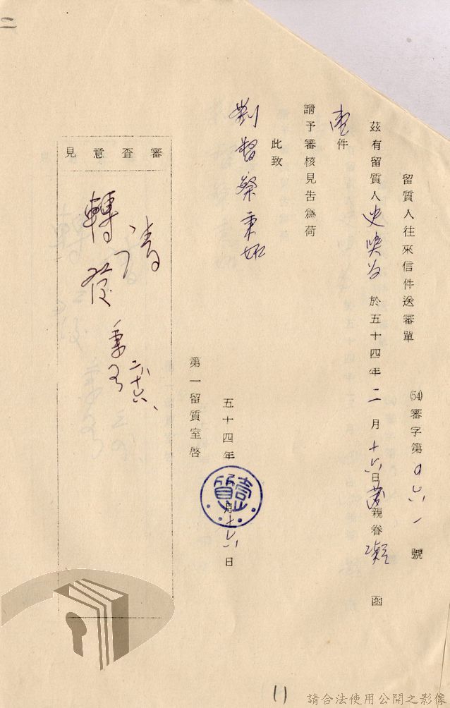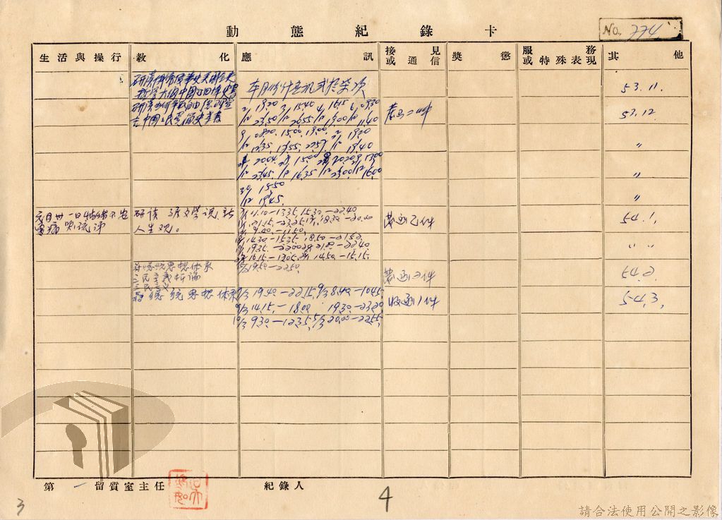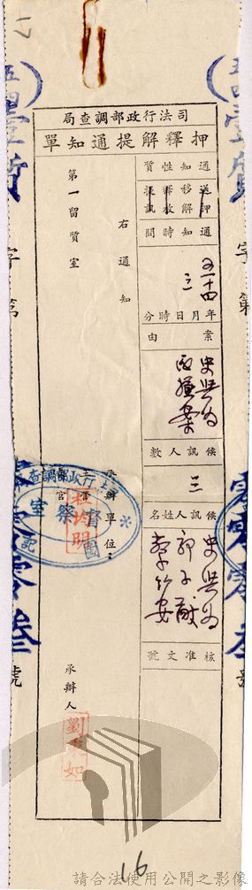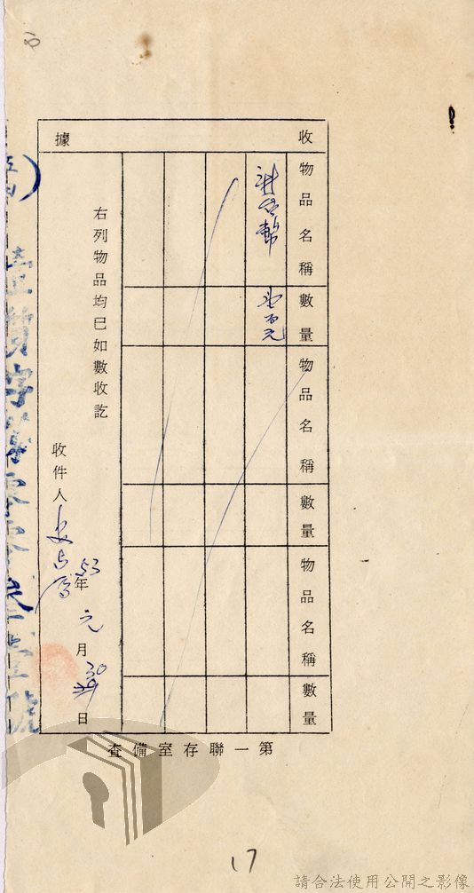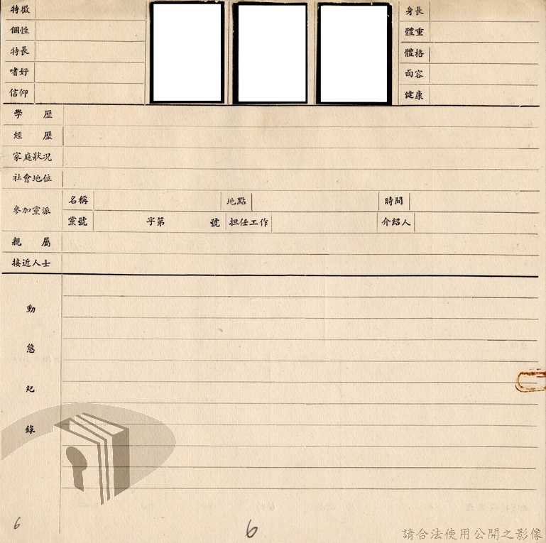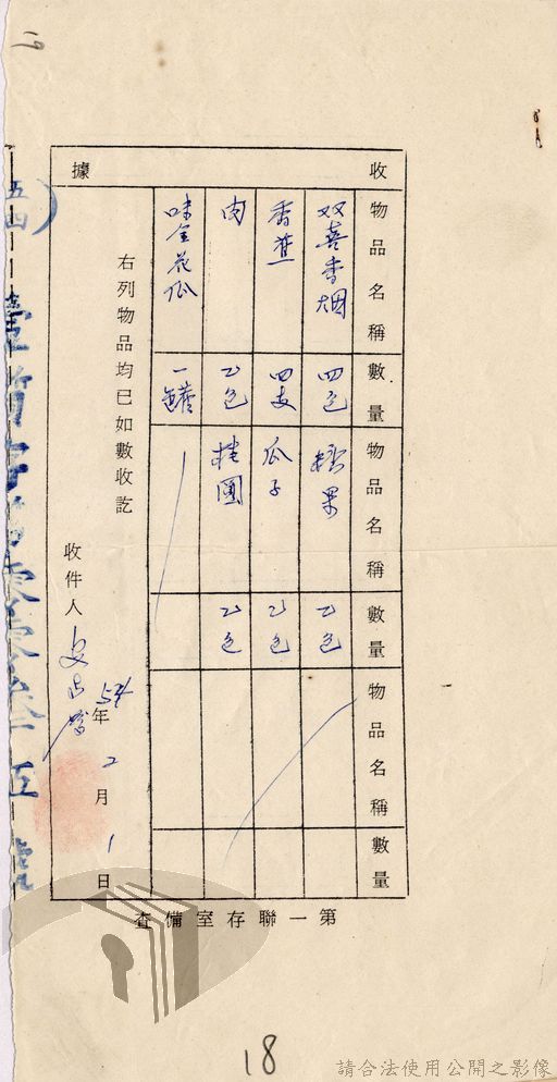 本案為53至54年間,司法行政部調查局留質室被留質人資料袋,內有身份名籍卡、指紋卡片、通知單、收支登記簿、收付單、意見表、財物收發保管簿及名籍登記表,登記表載有被留質人之編號、姓名、性別、年齡、籍貫、通訊處、身份證字號、職務、黨派歸屬及經歷等欄位資料;財物收發保管簿載有被留質人之財物名稱等欄位資料。