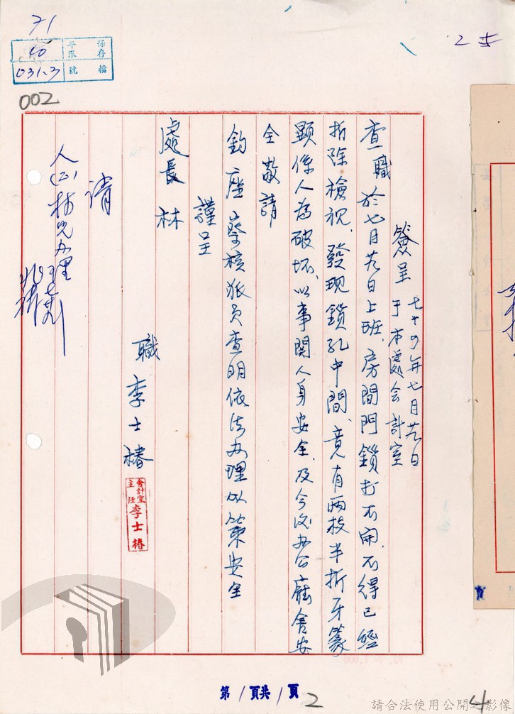 本案為74年間,臺灣省水利局政風督導小組函知第一工程處關於該小組政風檢肅信箱更動資訊;第一工程處會計室主任為其宿舍房門遭人破壞而簽請該處派人查辦,該處人事助理員會同人事管理員、會計室陳報其調查研判意見簽請上級核示。