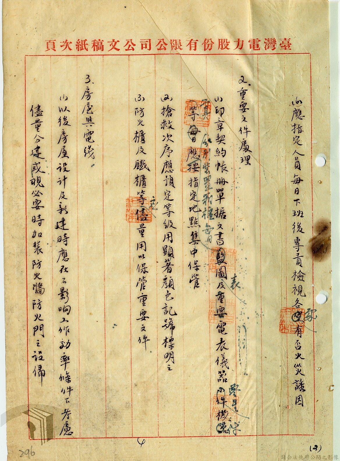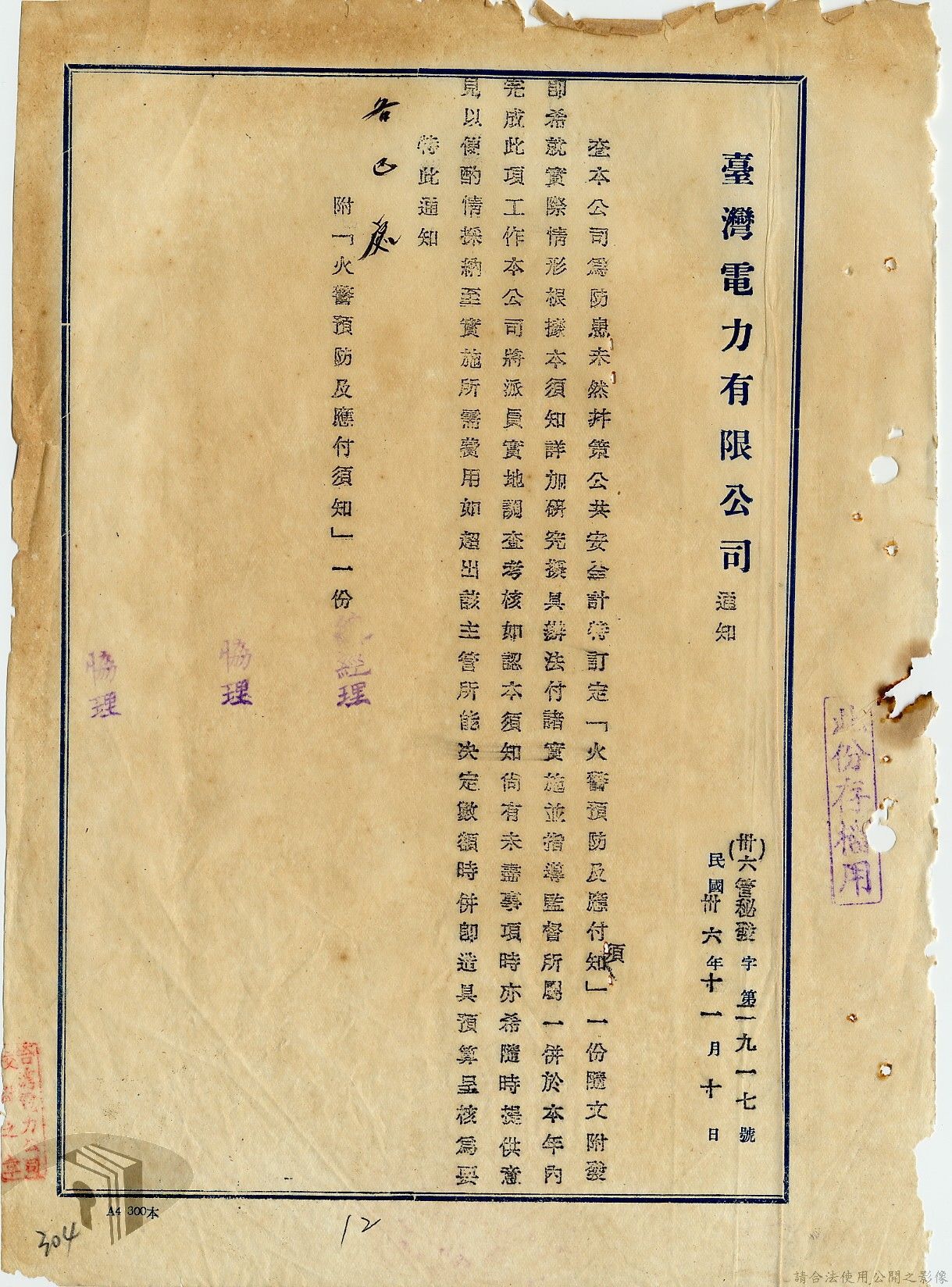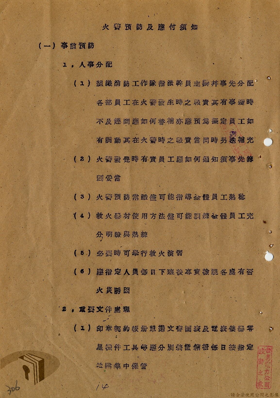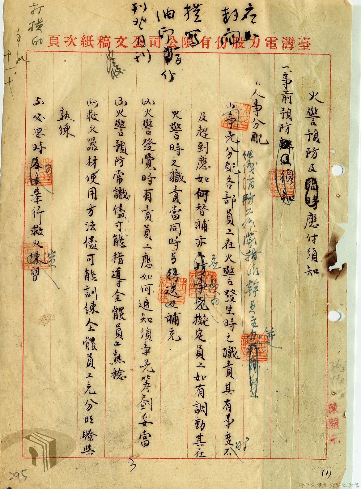 本案為36年間,臺灣電力股份有限公司頒發「火警預防及應付須知」給相關單位,火警預防及應付須知內容包括:事前預防、人事分配、重要文件處理、房屋與電線、危險品及易燃物之處理、水源佈置、報警設備、值勤人員應注意事項等。