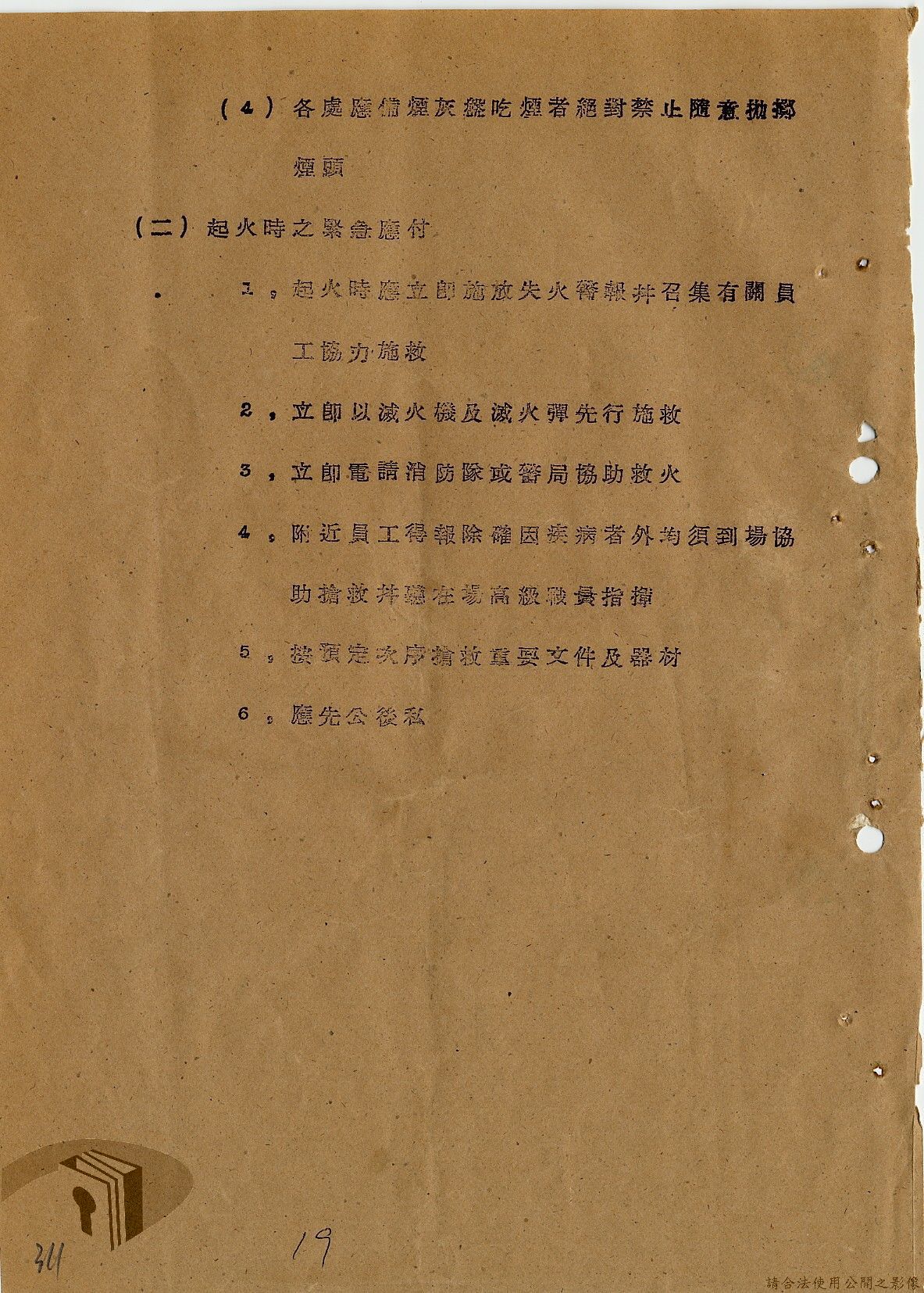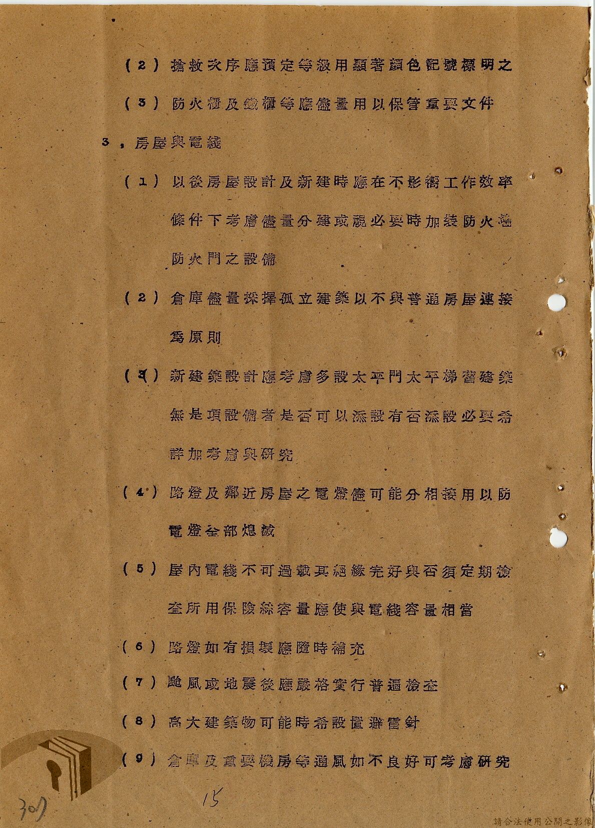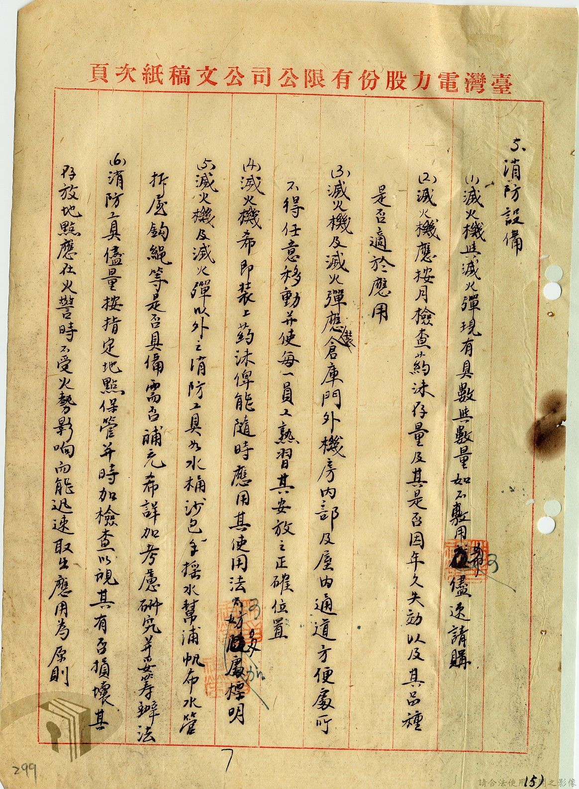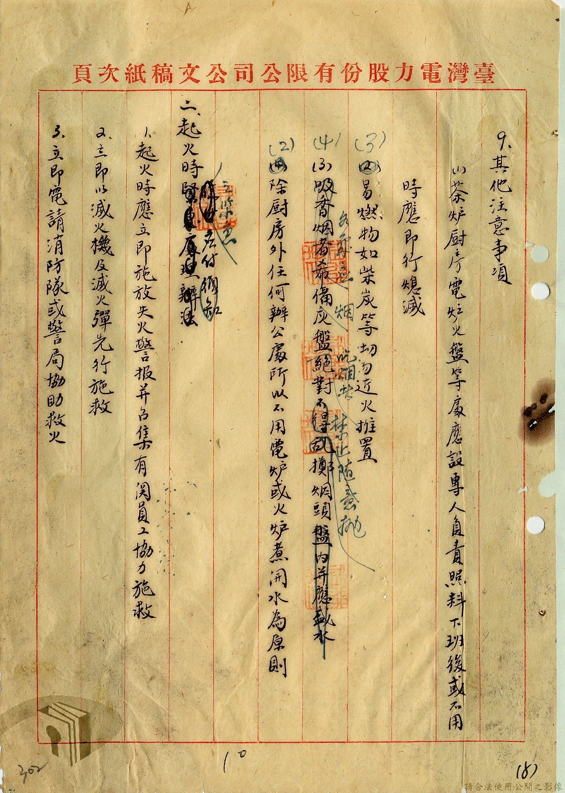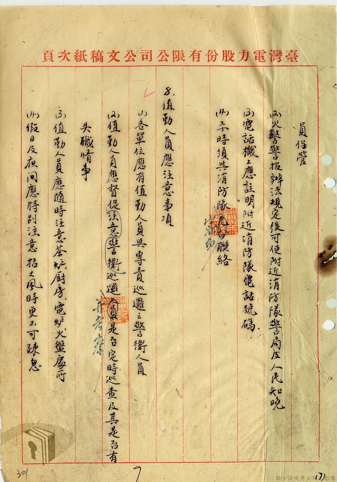 本案為36年間,臺灣電力股份有限公司頒發「火警預防及應付須知」給相關單位,火警預防及應付須知內容包括:事前預防、人事分配、重要文件處理、房屋與電線、危險品及易燃物之處理、水源佈置、報警設備、值勤人員應注意事項等。