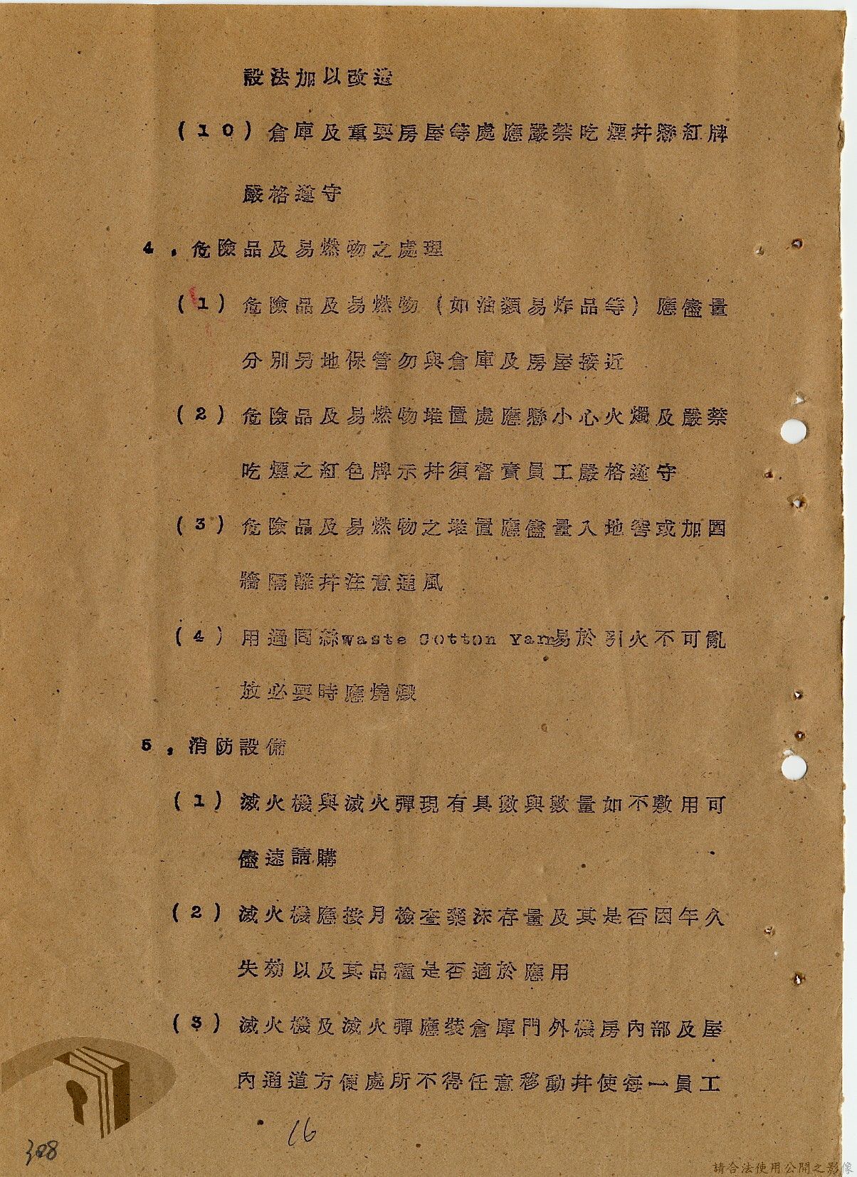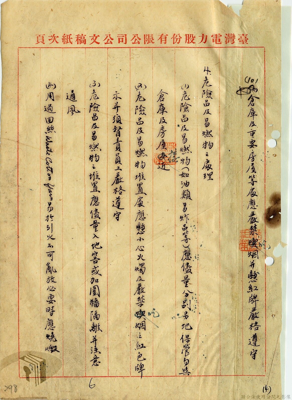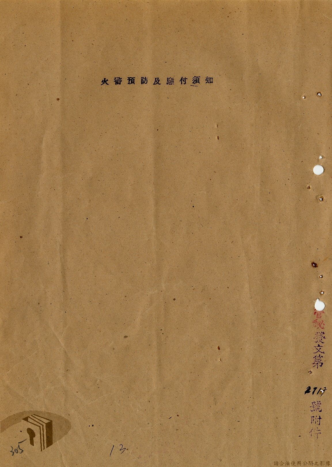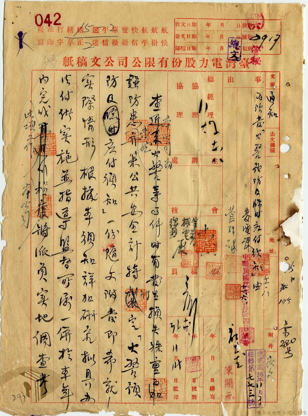本案為36年間,臺灣電力股份有限公司頒發「火警預防及應付須知」給相關單位,火警預防及應付須知內容包括:事前預防、人事分配、重要文件處理、房屋與電線、危險品及易燃物之處理、水源佈置、報警設備、值勤人員應注意事項等。