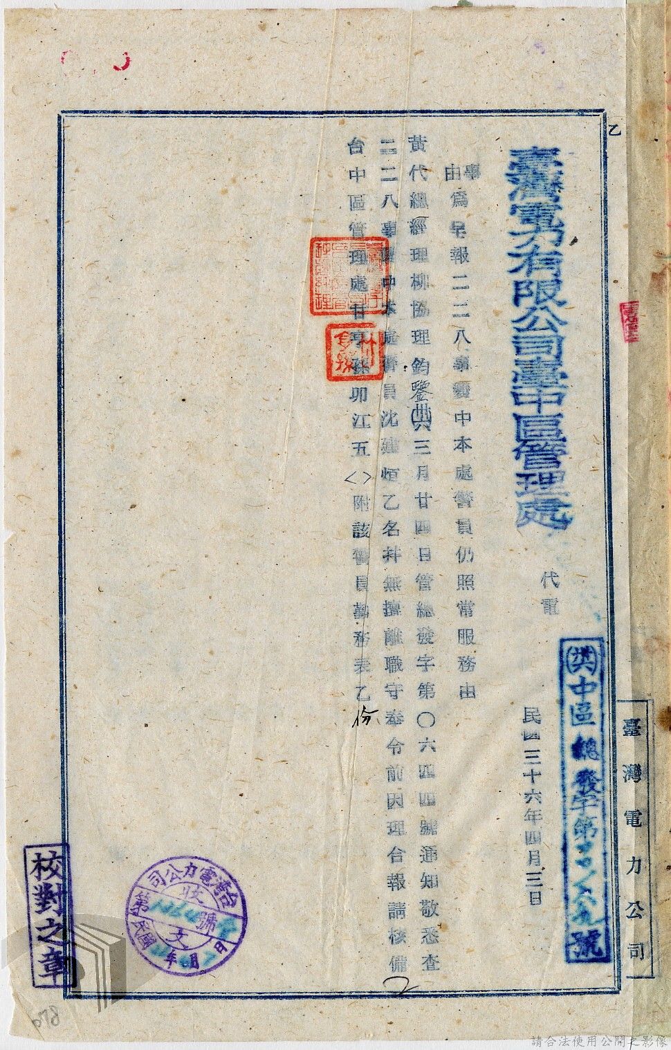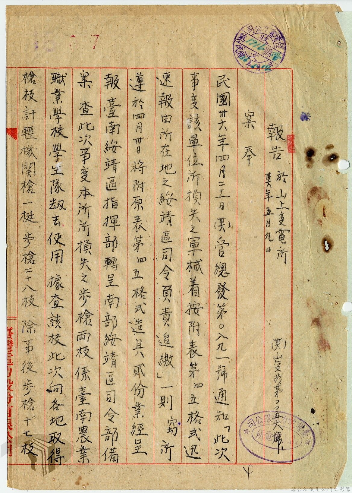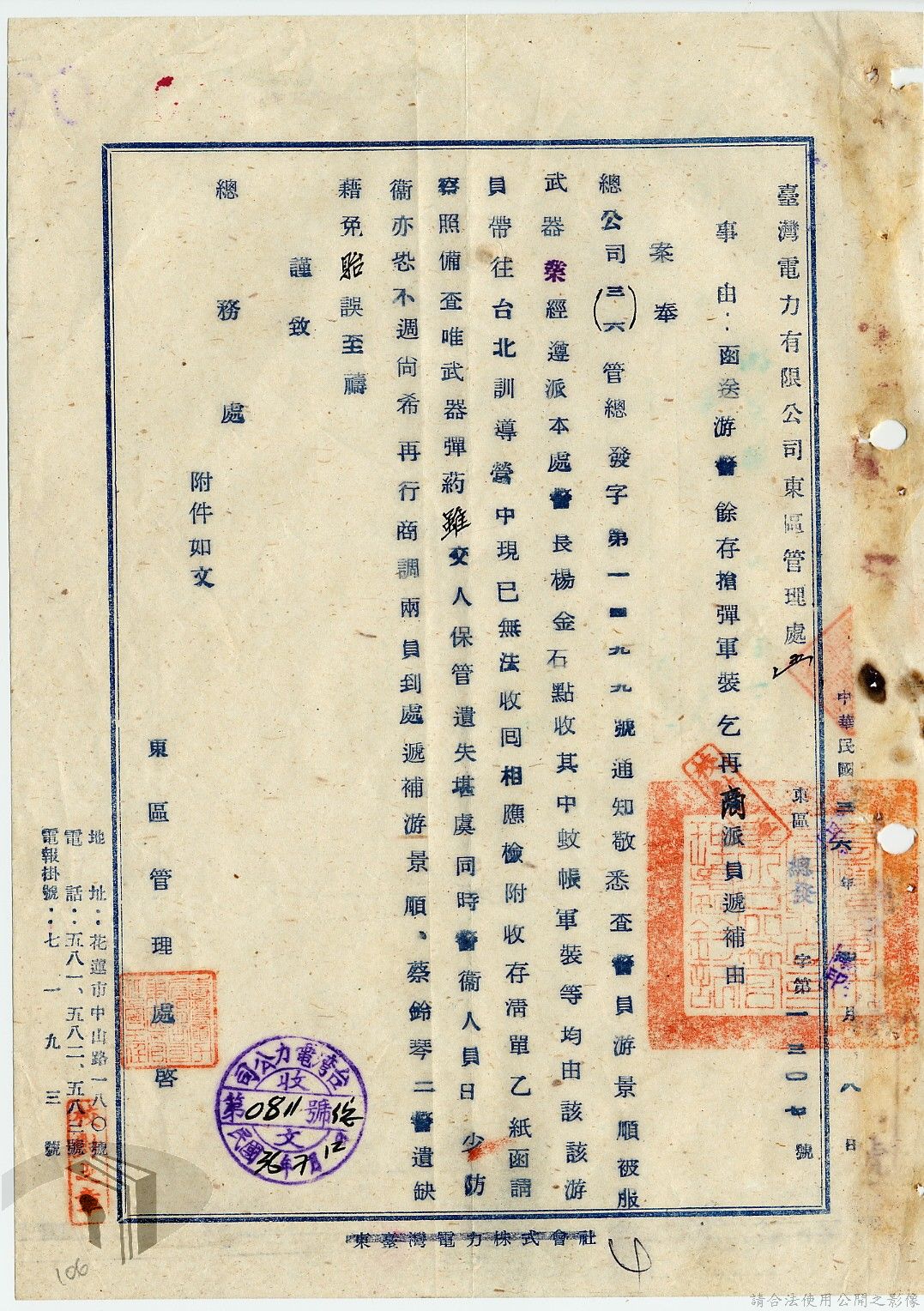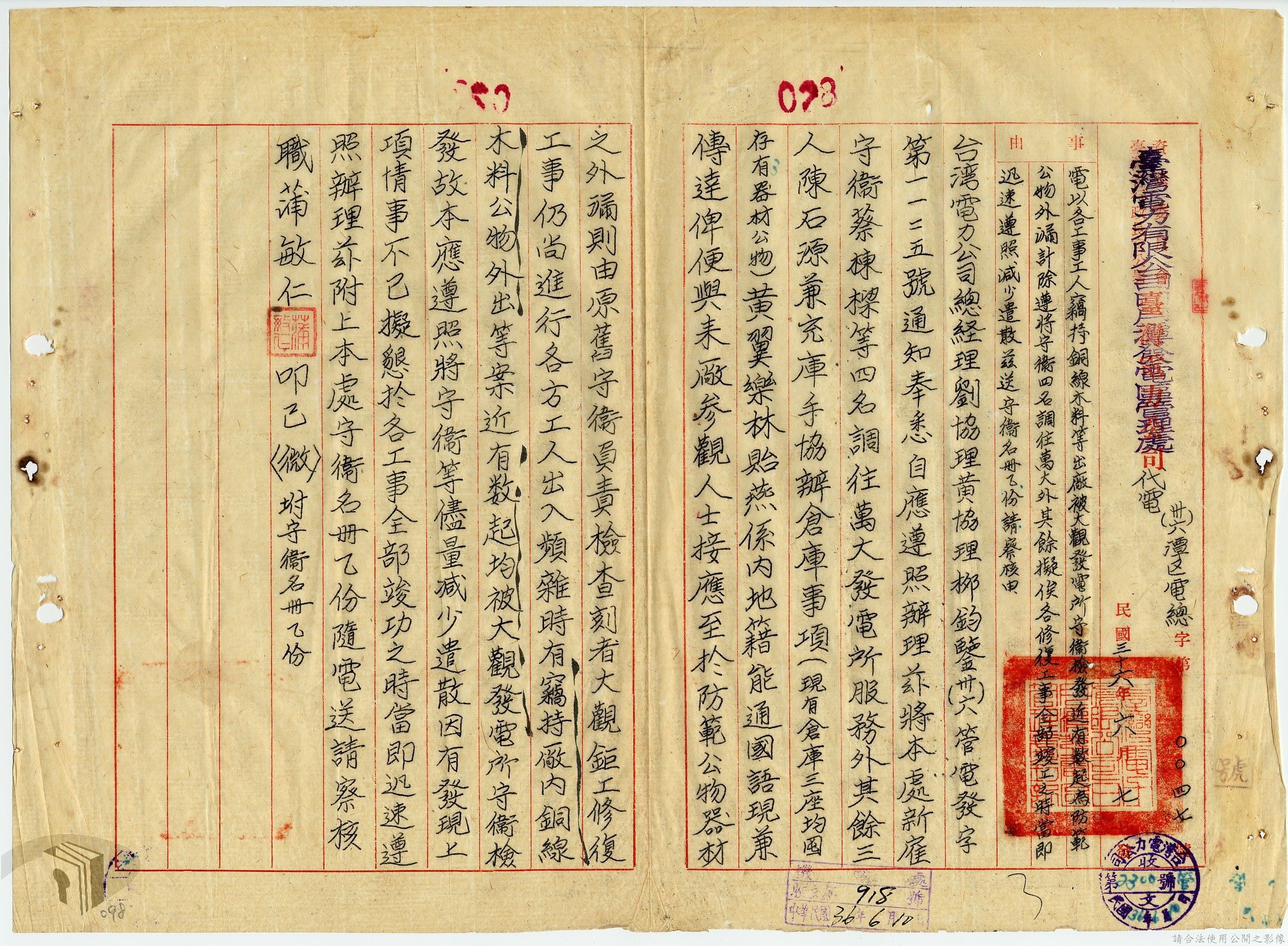 本案為36年間,臺灣電力股份有限公司臺中區管理處跟臺灣電力股份有限公司報告警員服勤情況;臺灣電力股份有限公司函知各管理處損失槍彈應報告當地綏靖區司令部及公司;臺灣電力股份有限公司辦理所屬大觀發電所監守自盜案及警員請領裝備案。