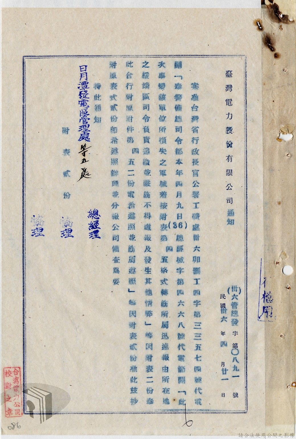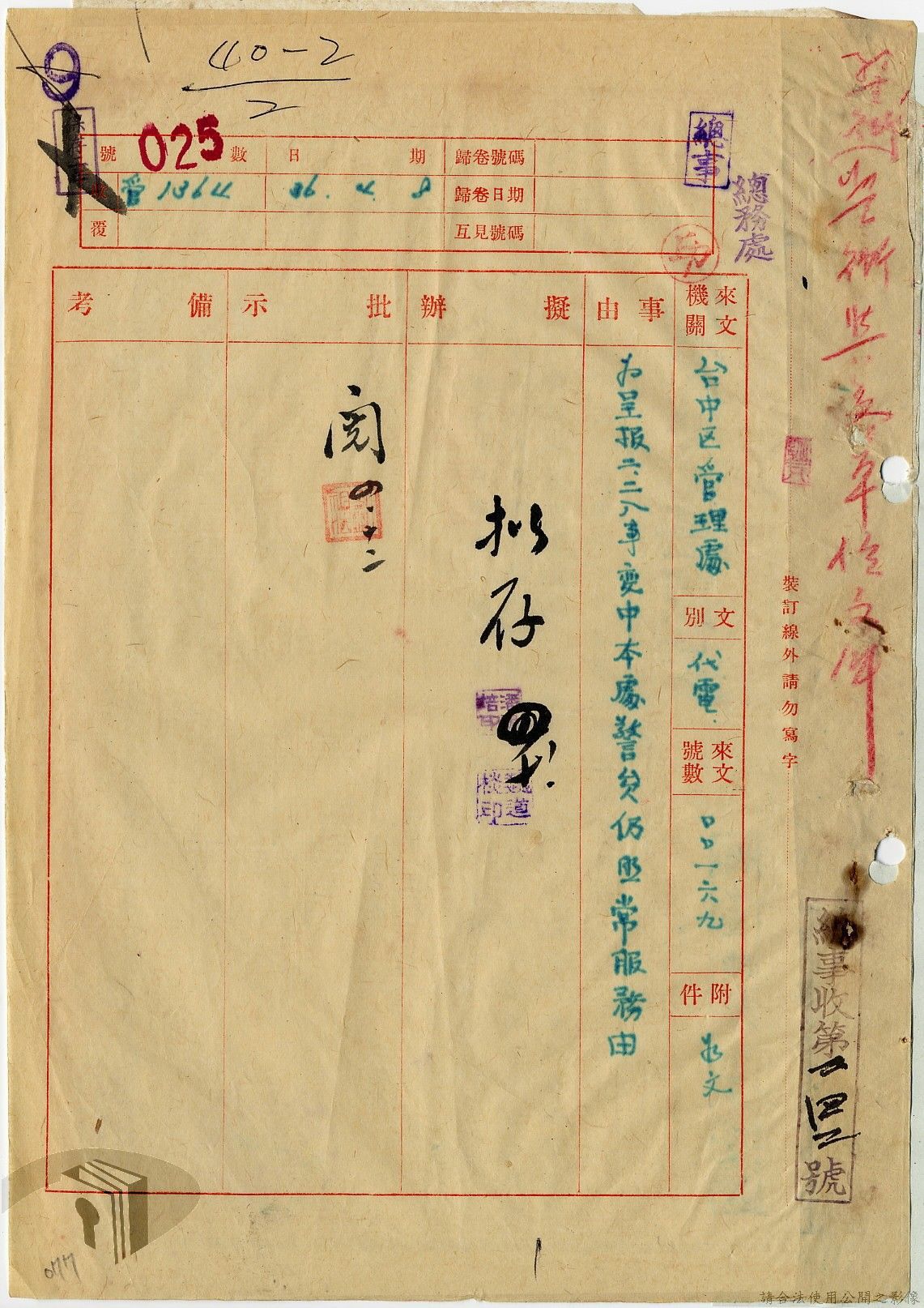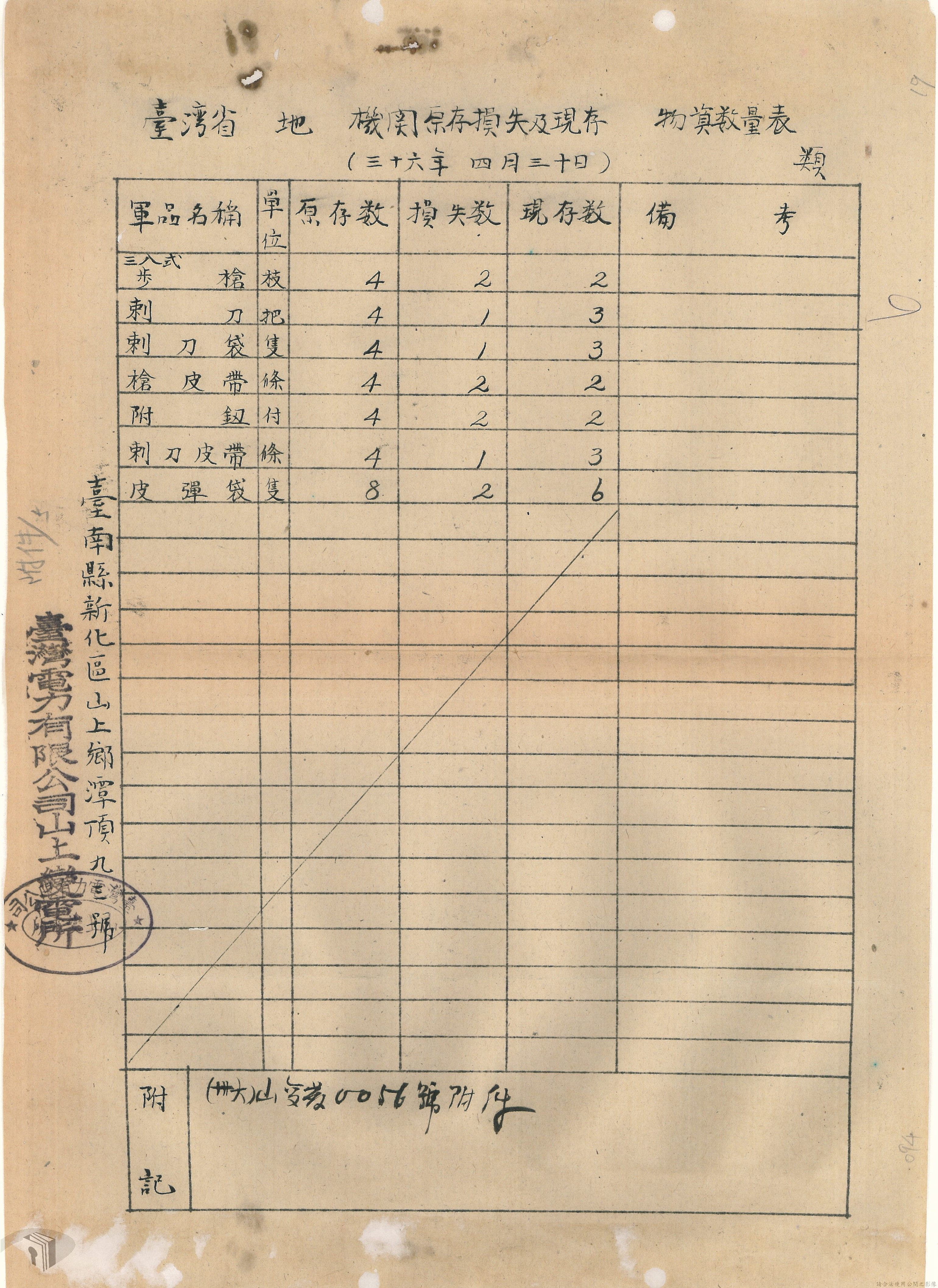 本案為36年間,臺灣電力股份有限公司臺中區管理處跟臺灣電力股份有限公司報告警員服勤情況;臺灣電力股份有限公司函知各管理處損失槍彈應報告當地綏靖區司令部及公司;臺灣電力股份有限公司辦理所屬大觀發電所監守自盜案及警員請領裝備案。