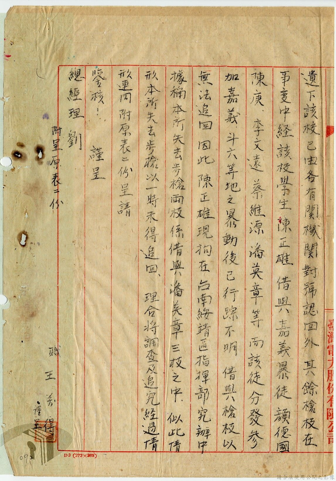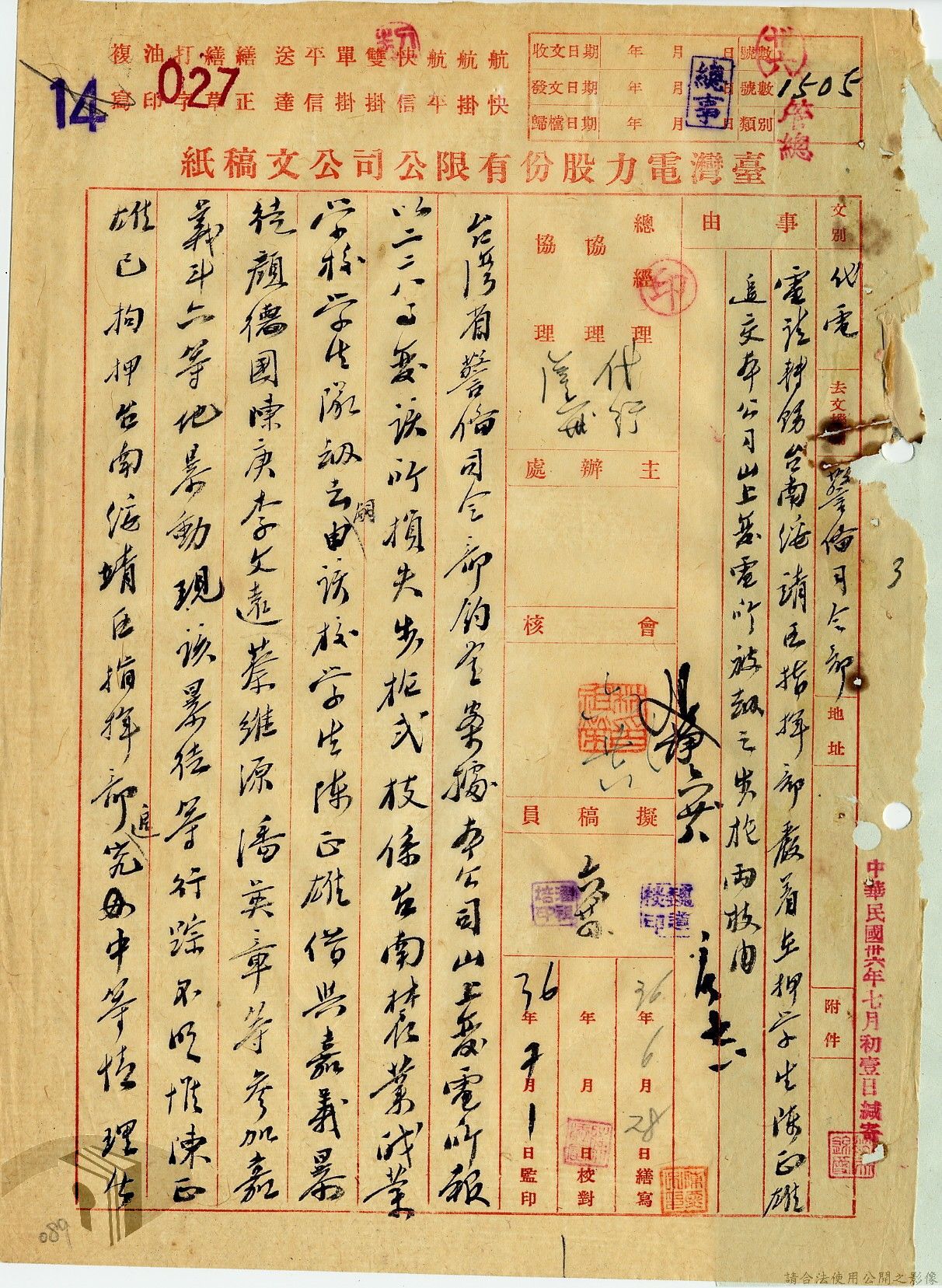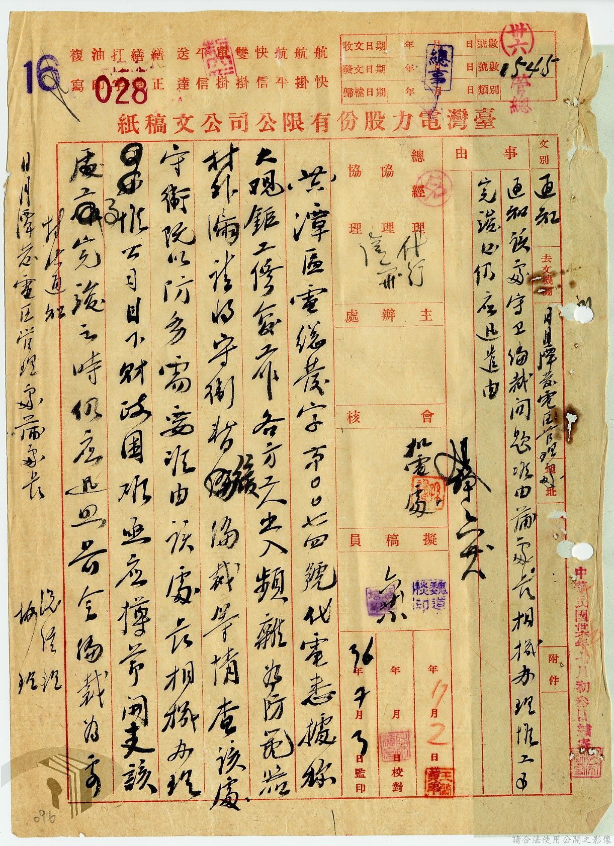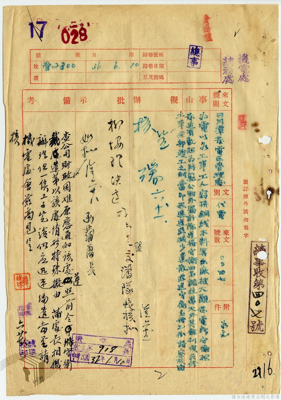 本案為36年間,臺灣電力股份有限公司臺中區管理處跟臺灣電力股份有限公司報告警員服勤情況;臺灣電力股份有限公司函知各管理處損失槍彈應報告當地綏靖區司令部及公司;臺灣電力股份有限公司辦理所屬大觀發電所監守自盜案及警員請領裝備案。