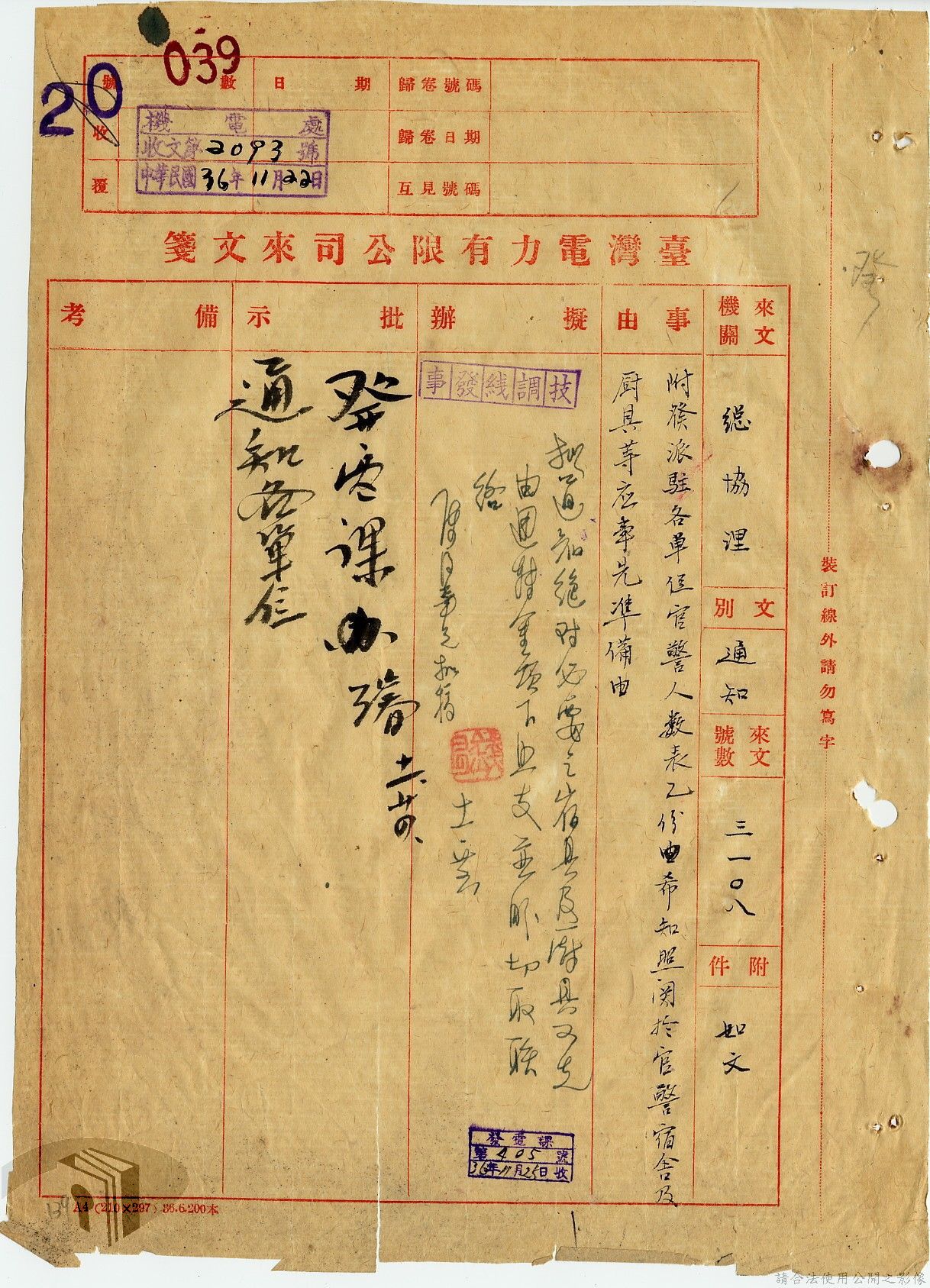 本案為36年間,臺灣省警備總司令部回復臺灣電力股份有限公司有關追查學生搶劫武器案之相關事宜;臺灣電力股份有限公司函知相關單位警員兵役問題要依規定處理;臺灣電力股份有限公司核發警員服務證及差旅費;臺灣電力股份有限公司公布工礦警察供應辦法。