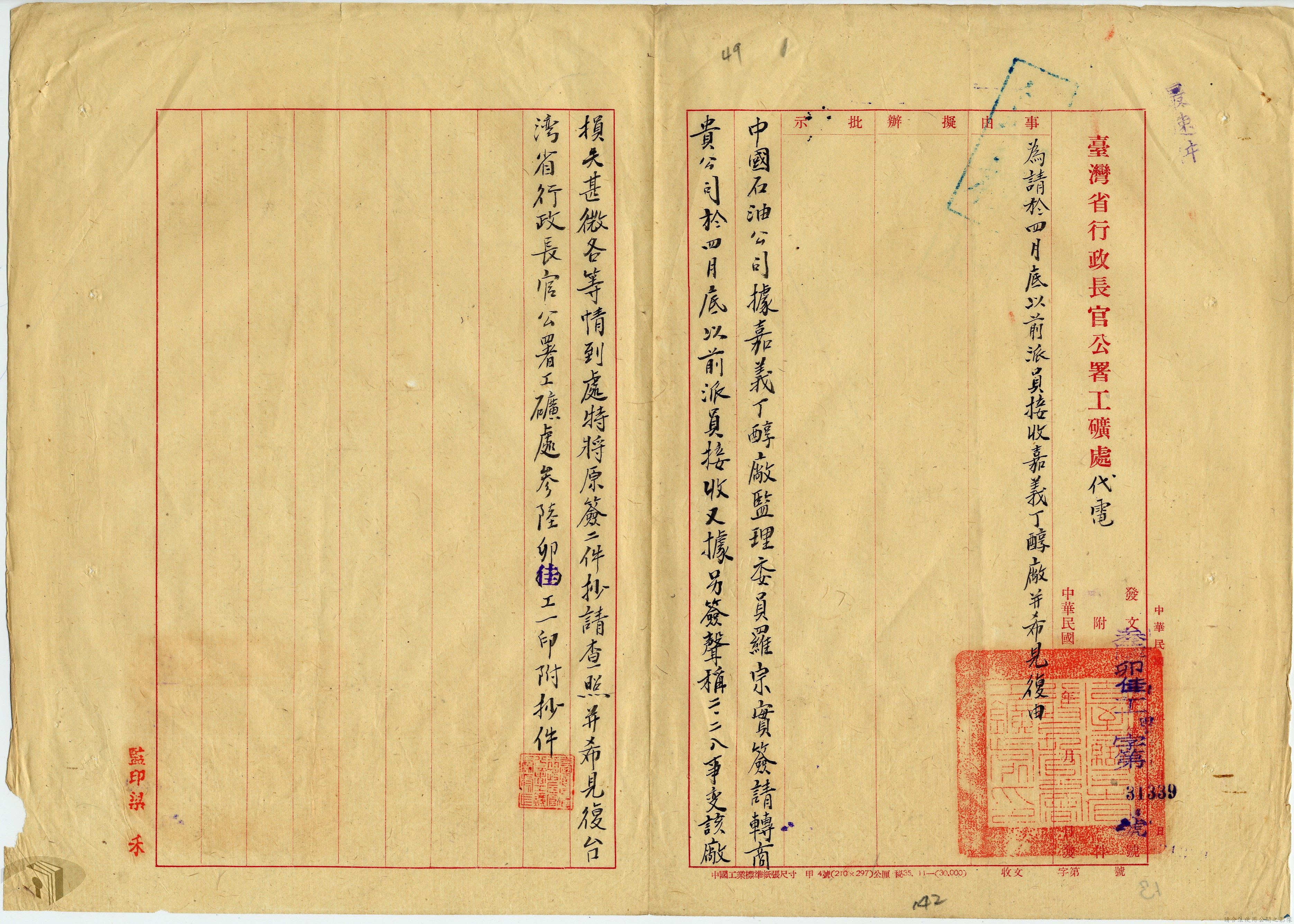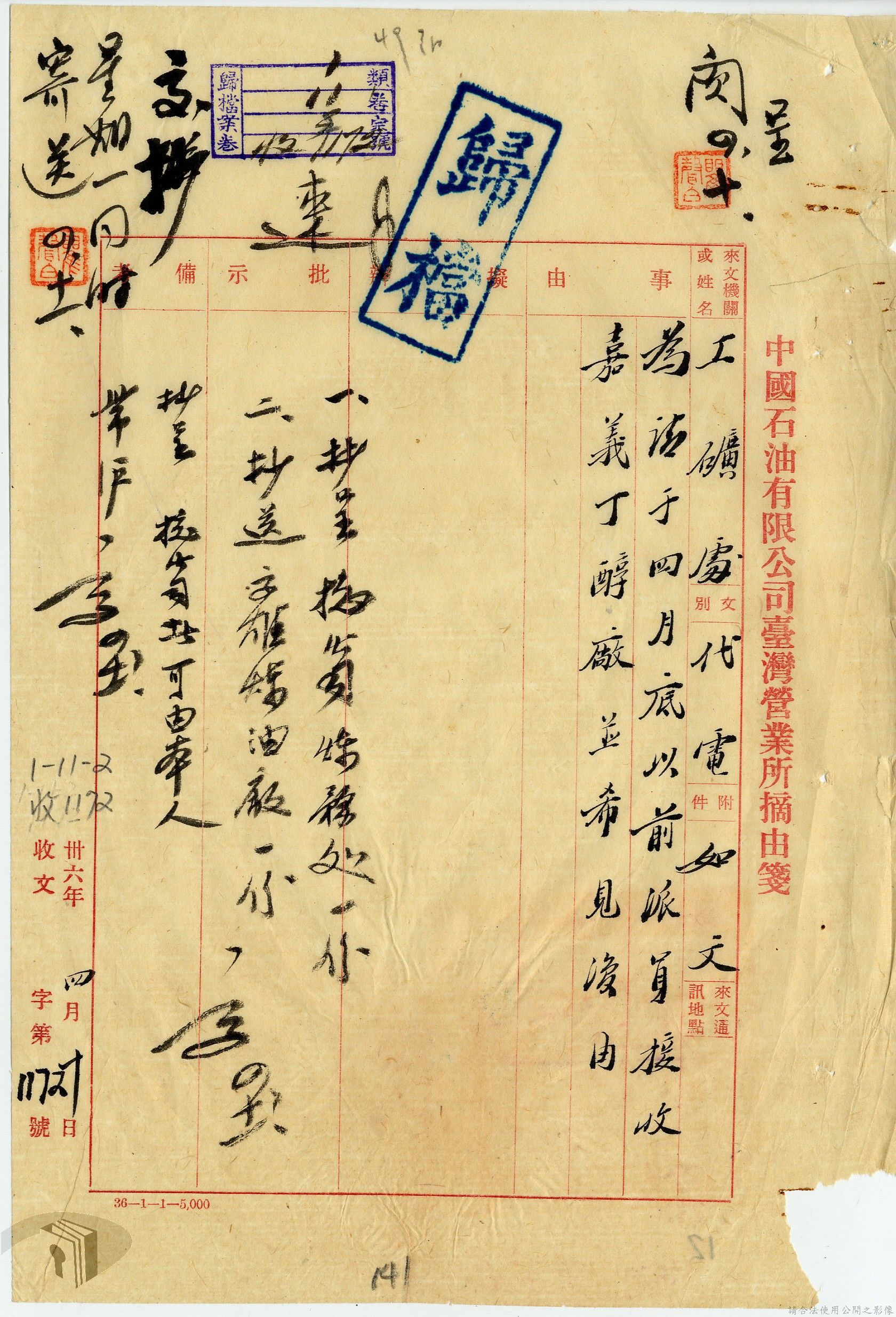 本案為36年間,嘉義丁醇廠監理委員因為工作繁忙無法兼顧丁醇廠工作,陳請臺灣省行政長官公署工礦處轉請中國石油有限公司派人接收該廠,工礦處後將監理委員之簽呈送至中油,並請該公司辦理接收事宜,中油後擬將資料送往相關單位。