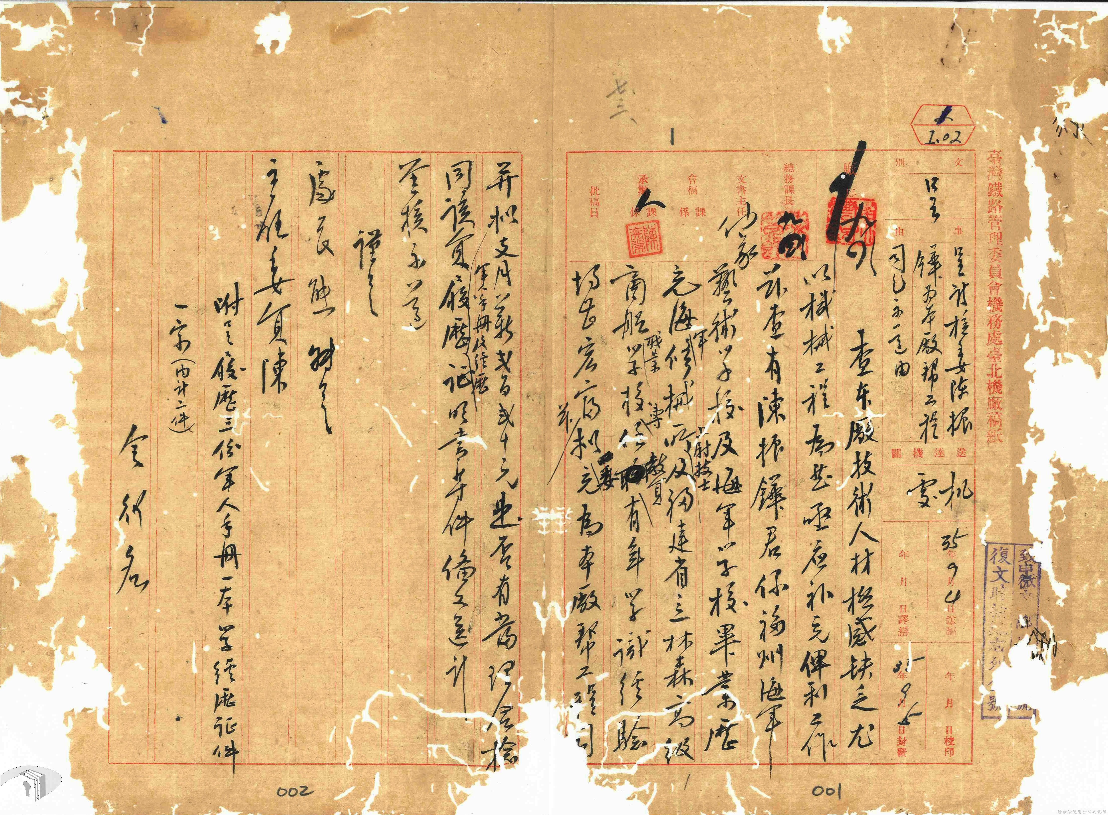 本案為35年間,臺灣省行政長官公署交通處鐵路管理委員會總務處檢送長官公署委任令及證件給臺北機廠,並請其轉發給當事人;鐵路管理委員會通知臺北機廠將開始遣送日琉籍人員,所遺留的空缺應該派人接替等。附履歷表、臺灣鐵路管理委員會任免人員通知書。