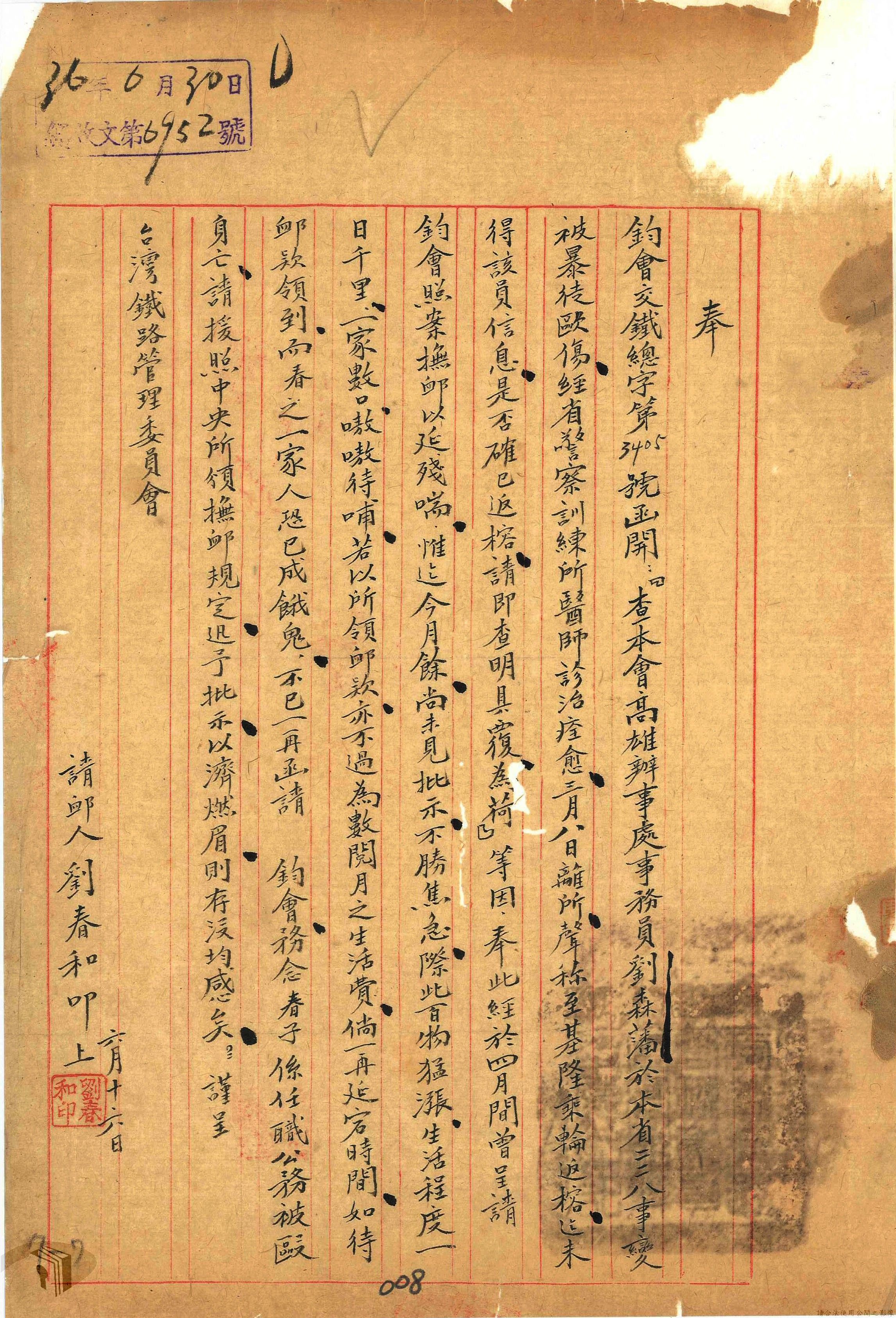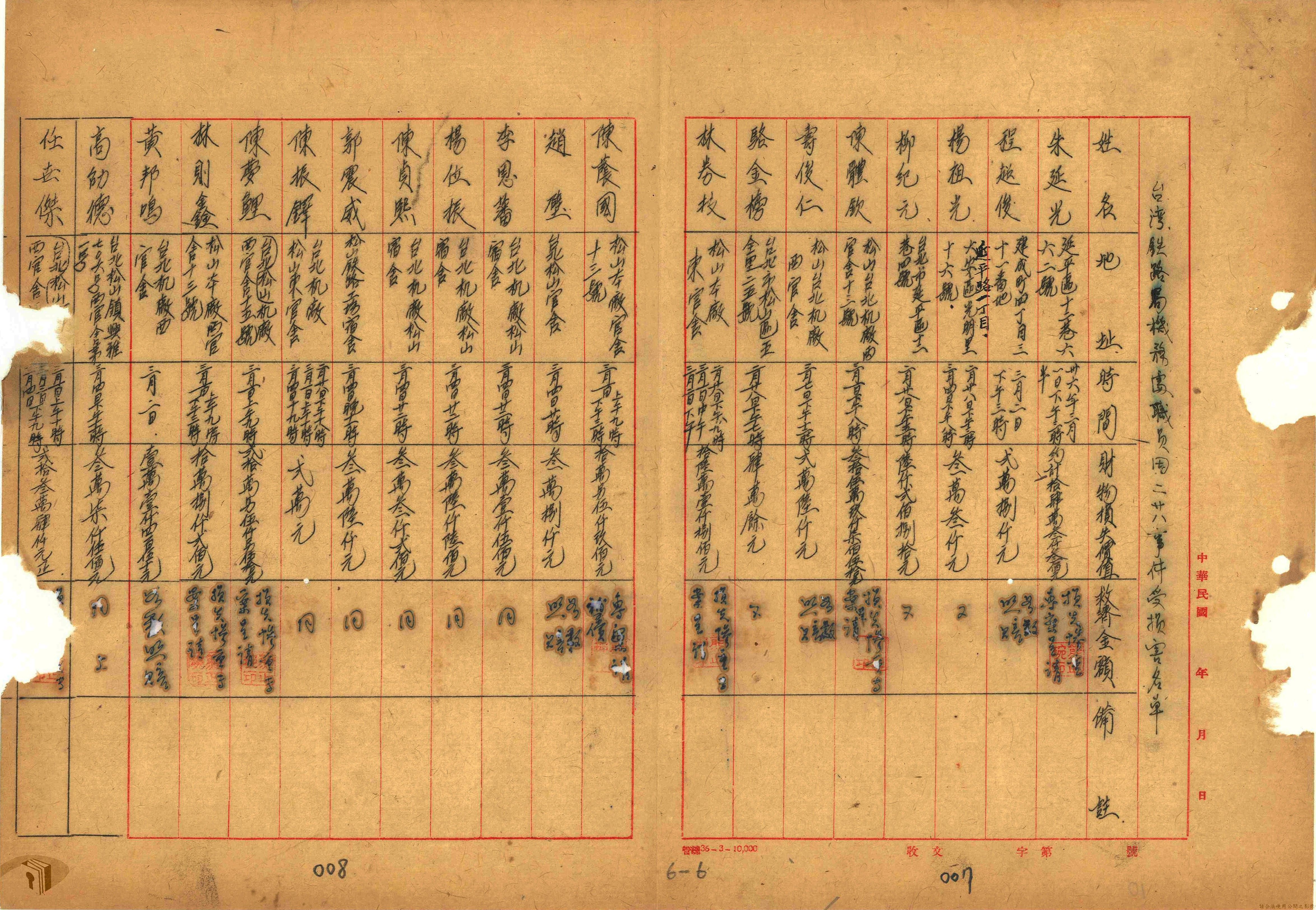 本案為36年間,臺灣省行政長官公署交通處鐵路管理委員會臺北辦事處陳請鐵路管理委員會同意陳報相關單位發給臺北辦事處處長二二八事件救濟金,鐵路管理委員會後發電報請臺灣省二二八事件救卹委員會協助辦理;臺灣省鐵路警察署以電報發送二二八事變損失清冊給鐵路管理委員會等。