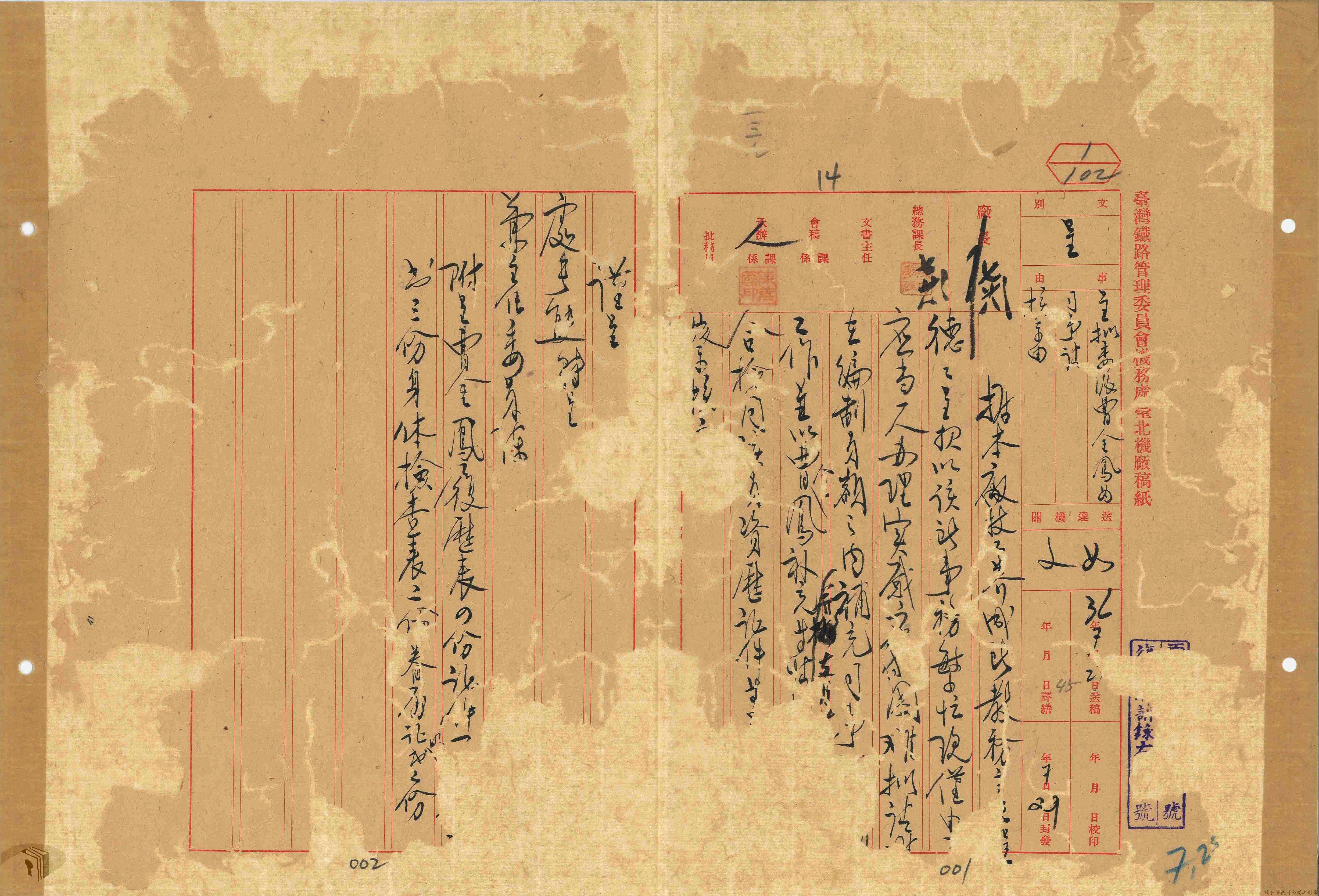 本案為36年間,臺灣鐵路管理委員會機務處臺北機廠陳請臺灣省鐵路管理委員會同意依該廠意見辦理人員職位異動相關事宜,鐵路管理委員會後將審核結果通知臺北機廠,其中部分人員被任命為臺北機廠事務員等職。附履歷表、證件明細表等文件資料。