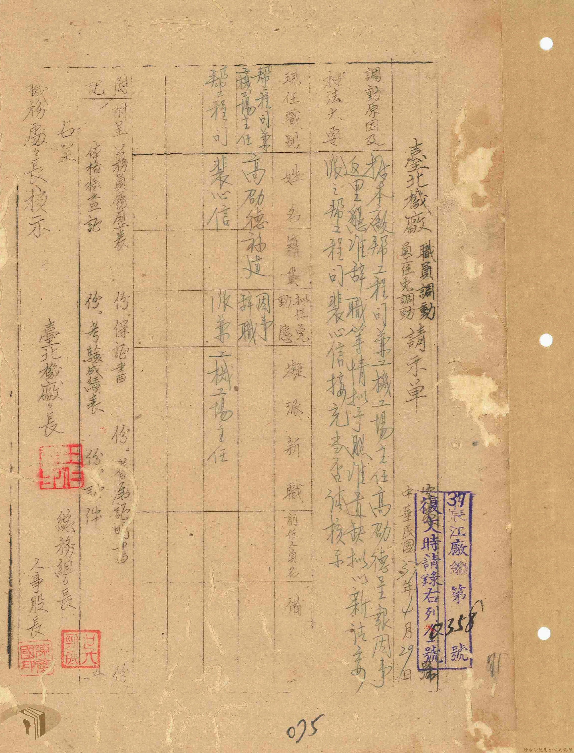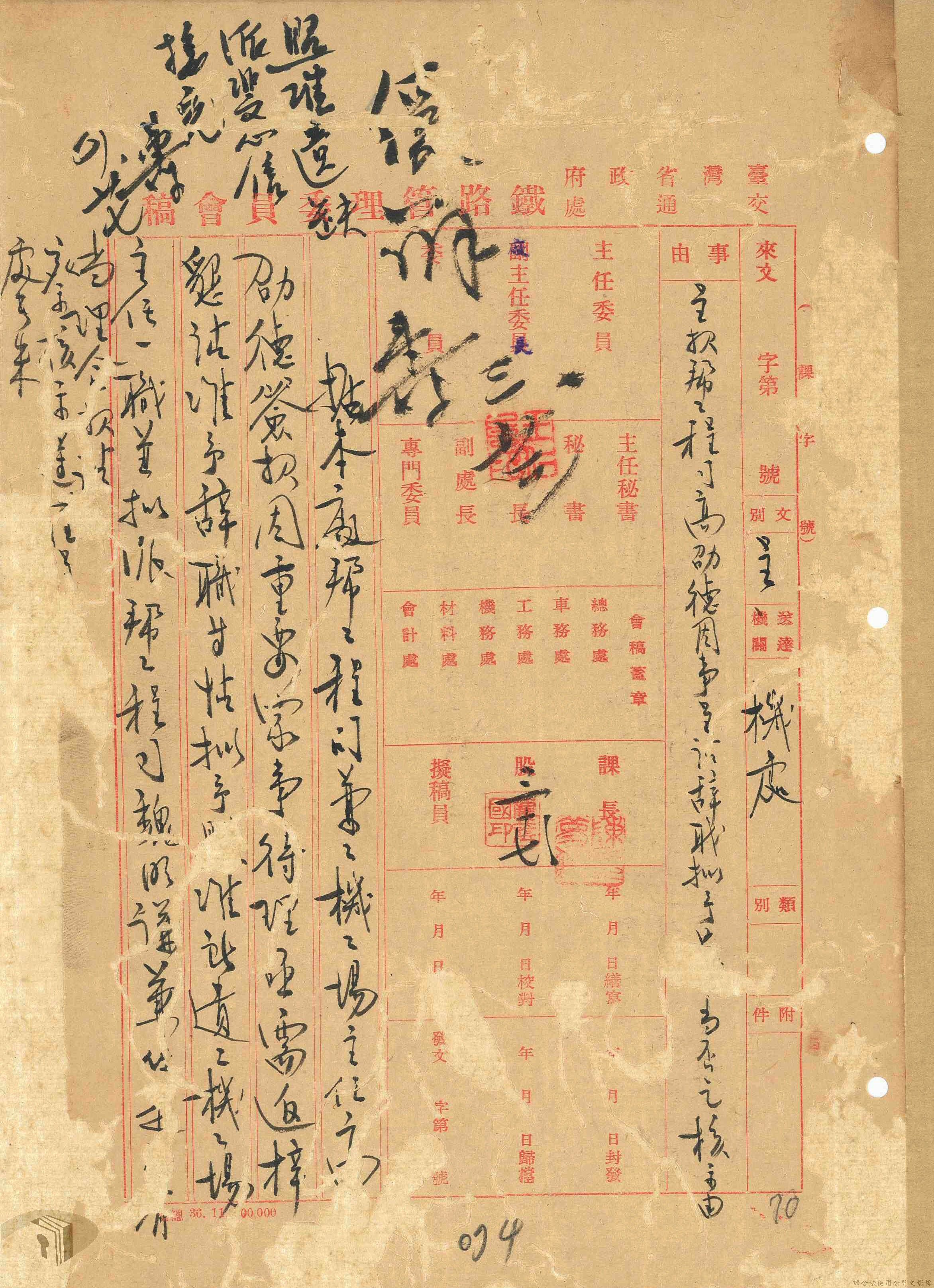 本案為37年間,臺北機廠陳請臺灣省政府交通處鐵路管理局機務處同意依臺北機廠意見辦理人員任免調動等相關事宜,機務處後將審核結果通知臺北機廠,其中部分人員被任命為臺北機廠組立暨鍋爐工場主任、臺北機廠工務員等。附任免調動人員通知書等資料。