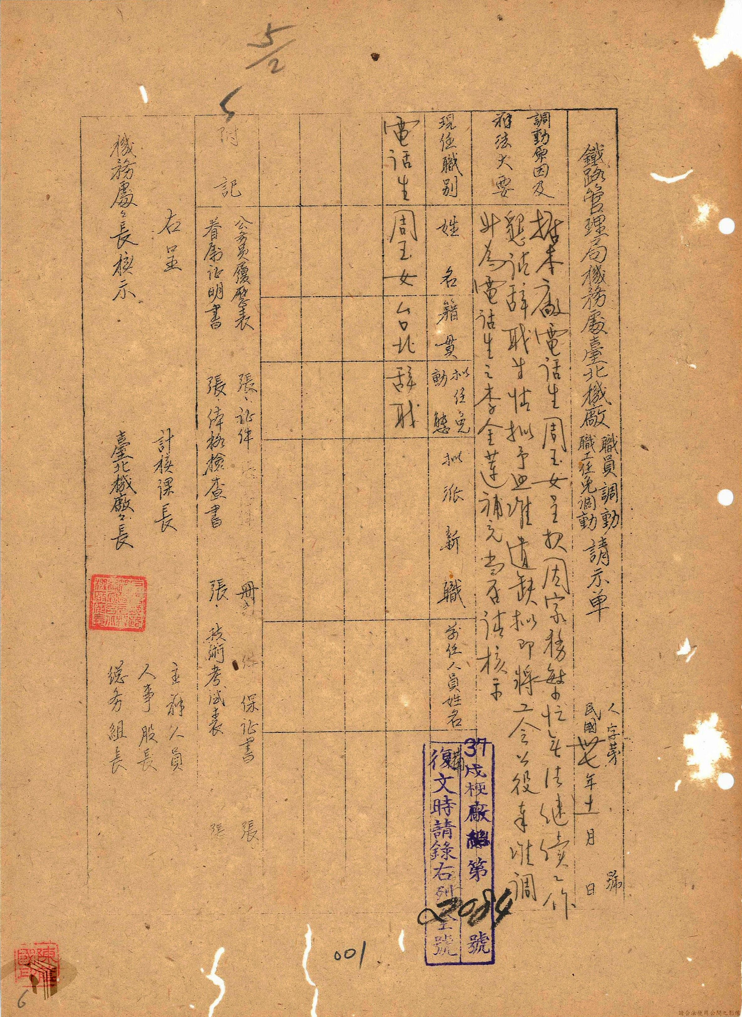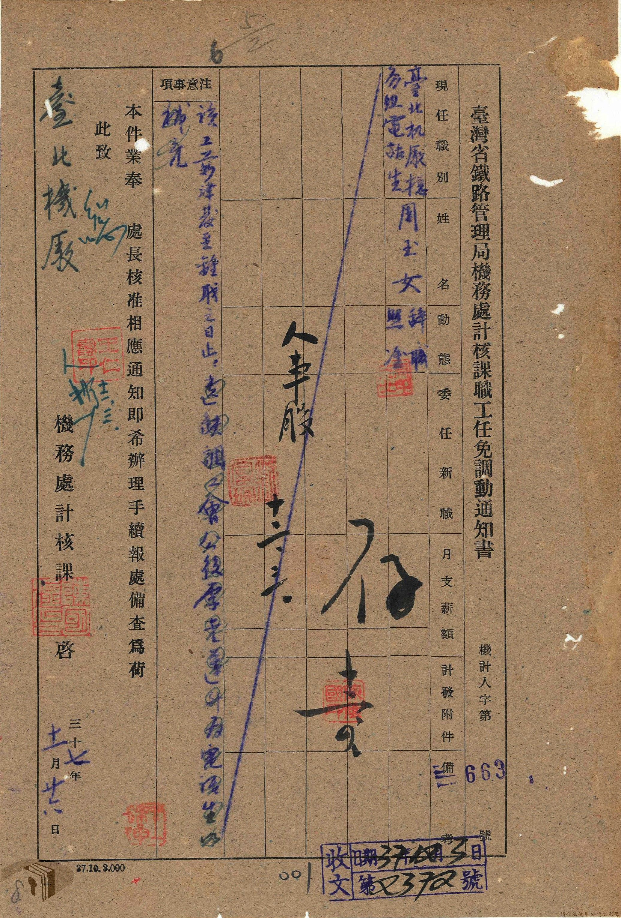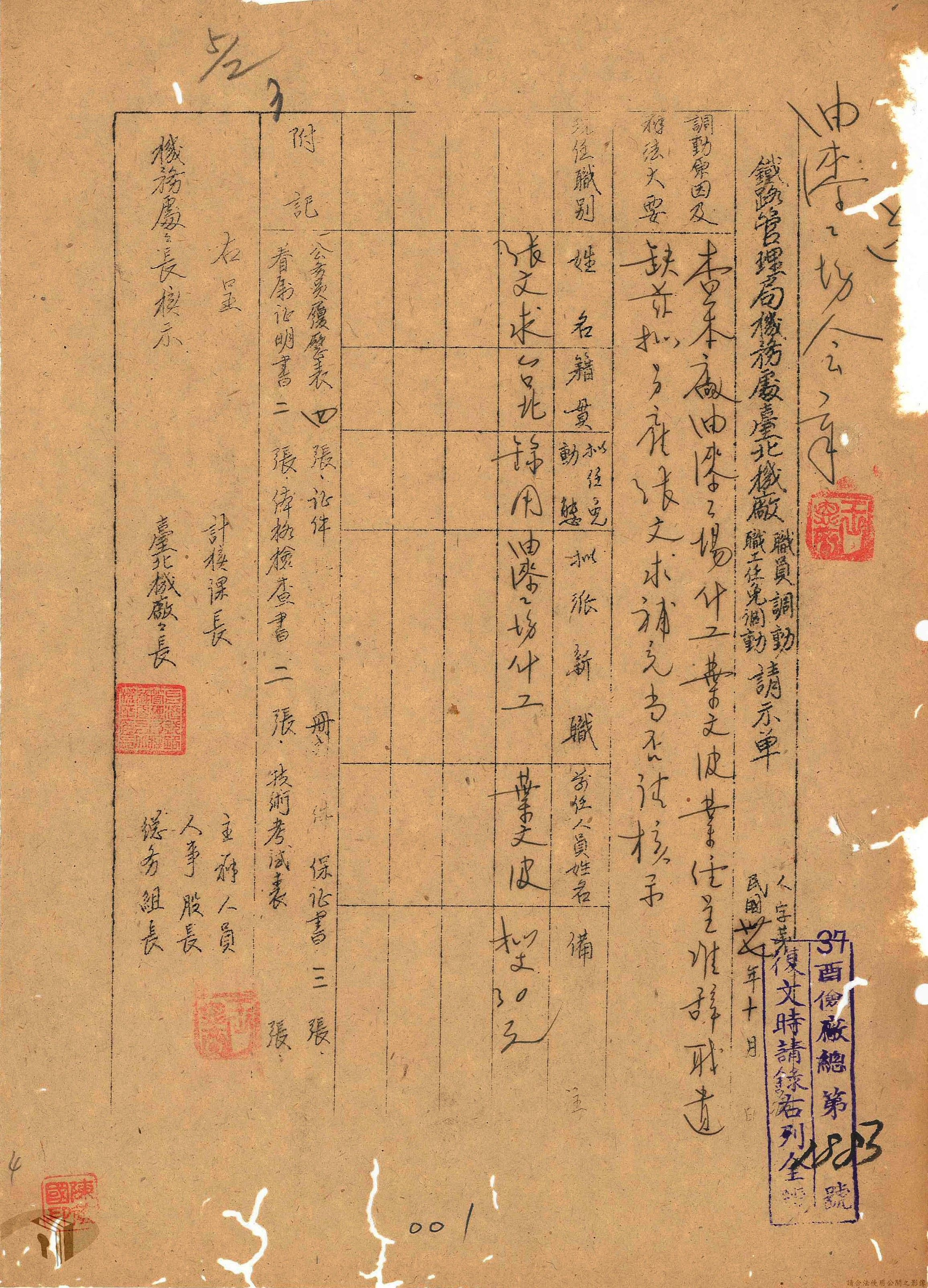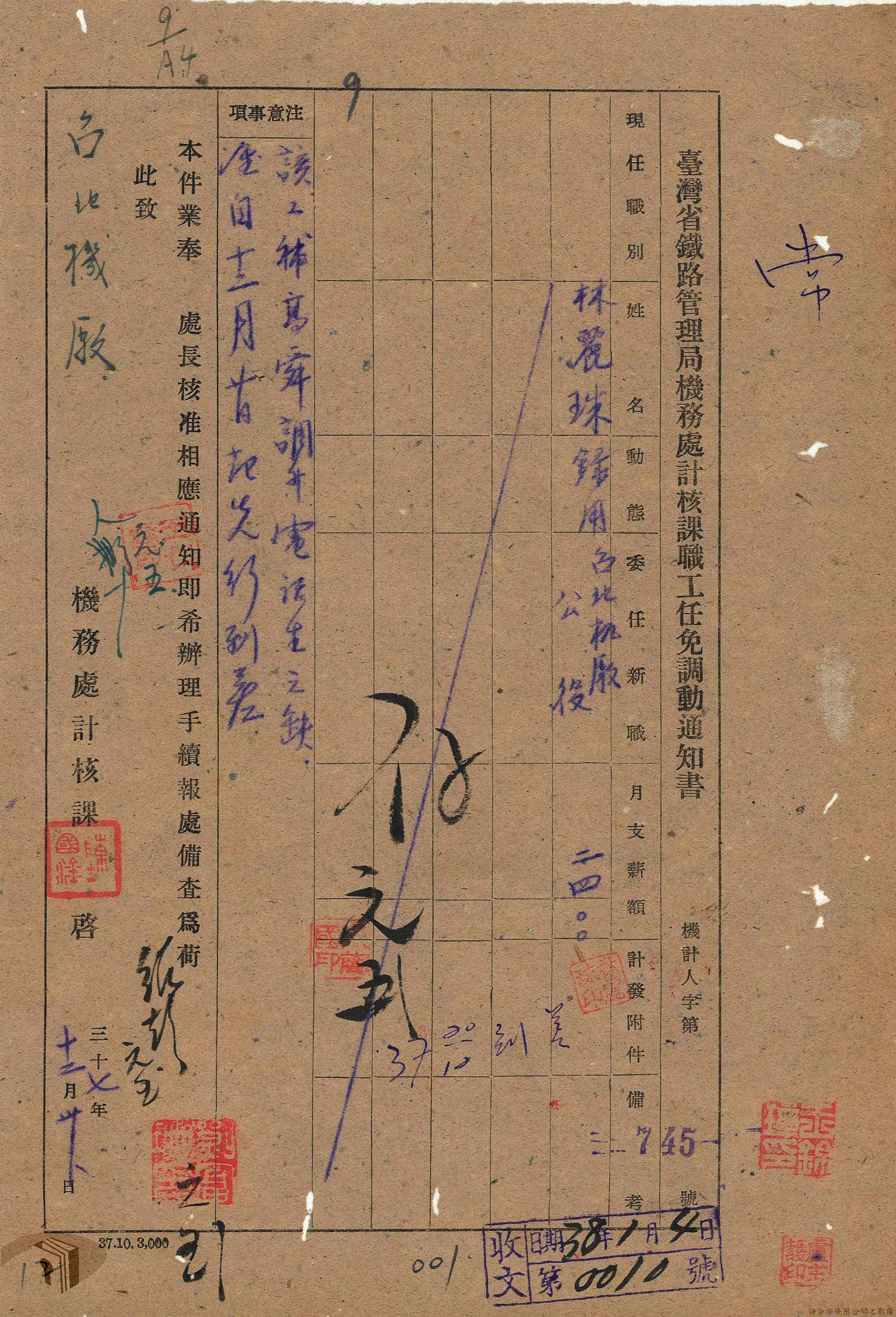 本案為37至38年間,臺灣省鐵路管理局機務處臺北機廠陳請機務處同意依該廠意見辦理人員職位異動相關事宜,鐵路管理局後將審核結果通知臺北機廠,其中部分人員被派任為臺北機廠油漆工場什工、臺北機廠工役,其餘人員則獲該局核准請辭。