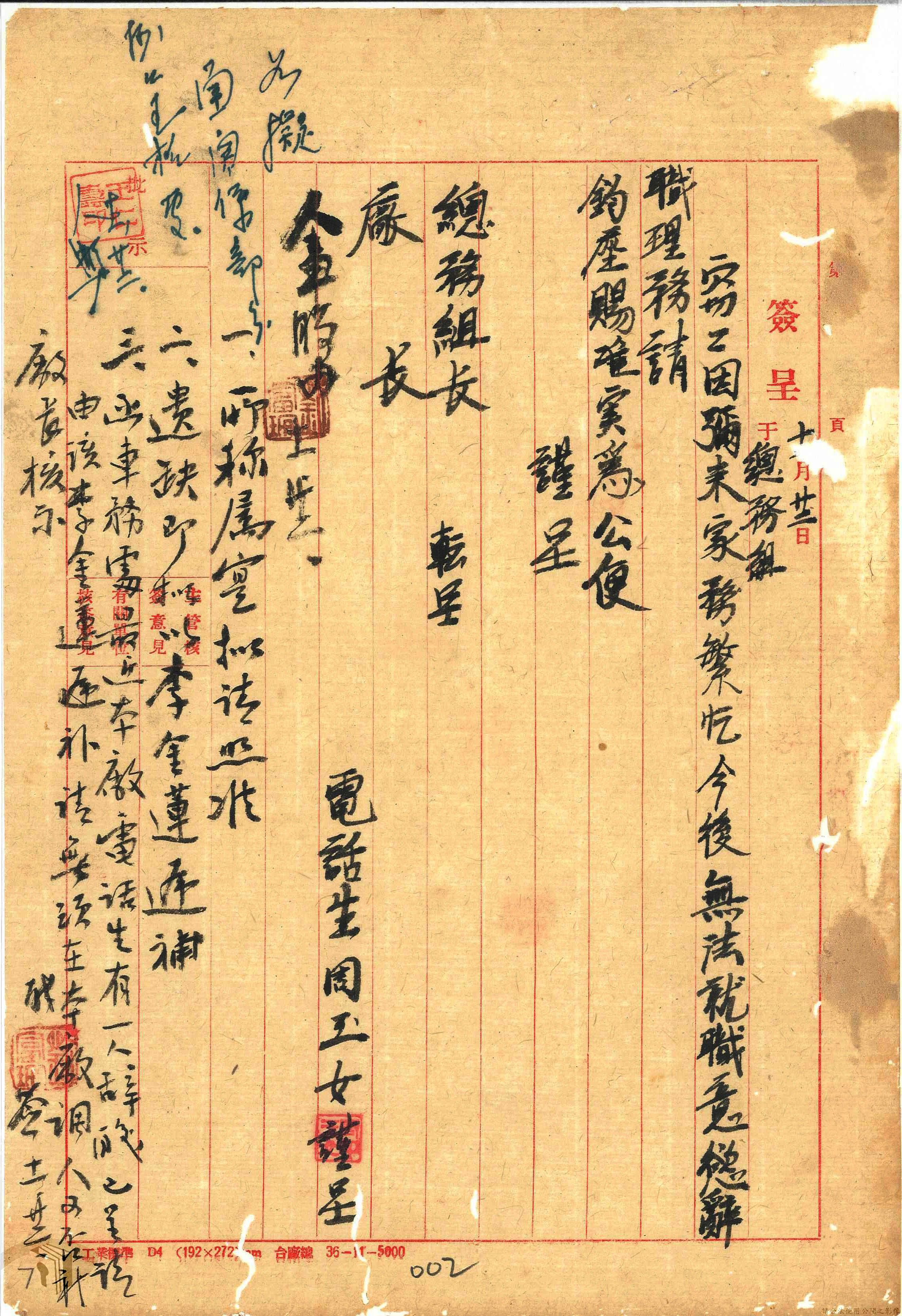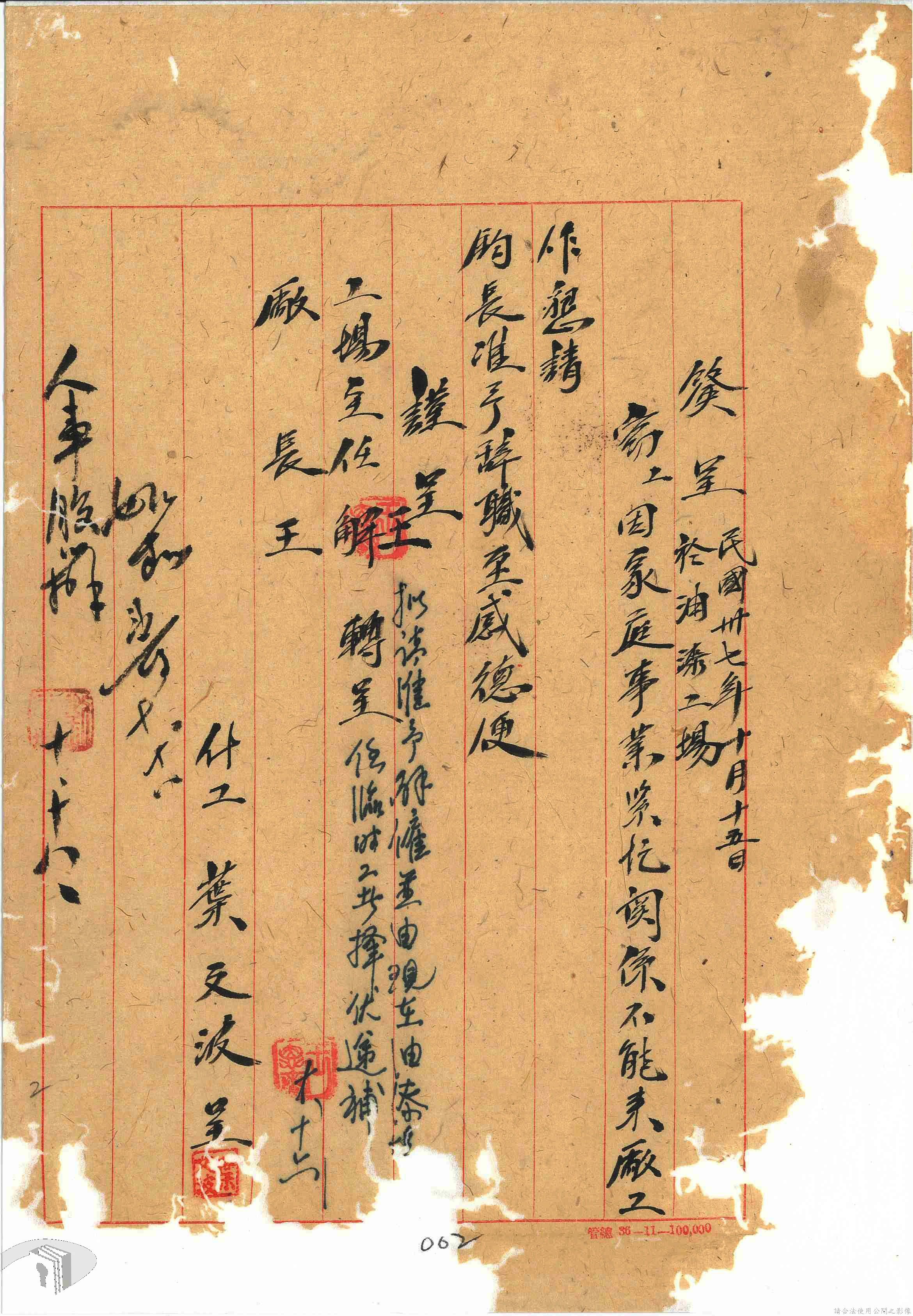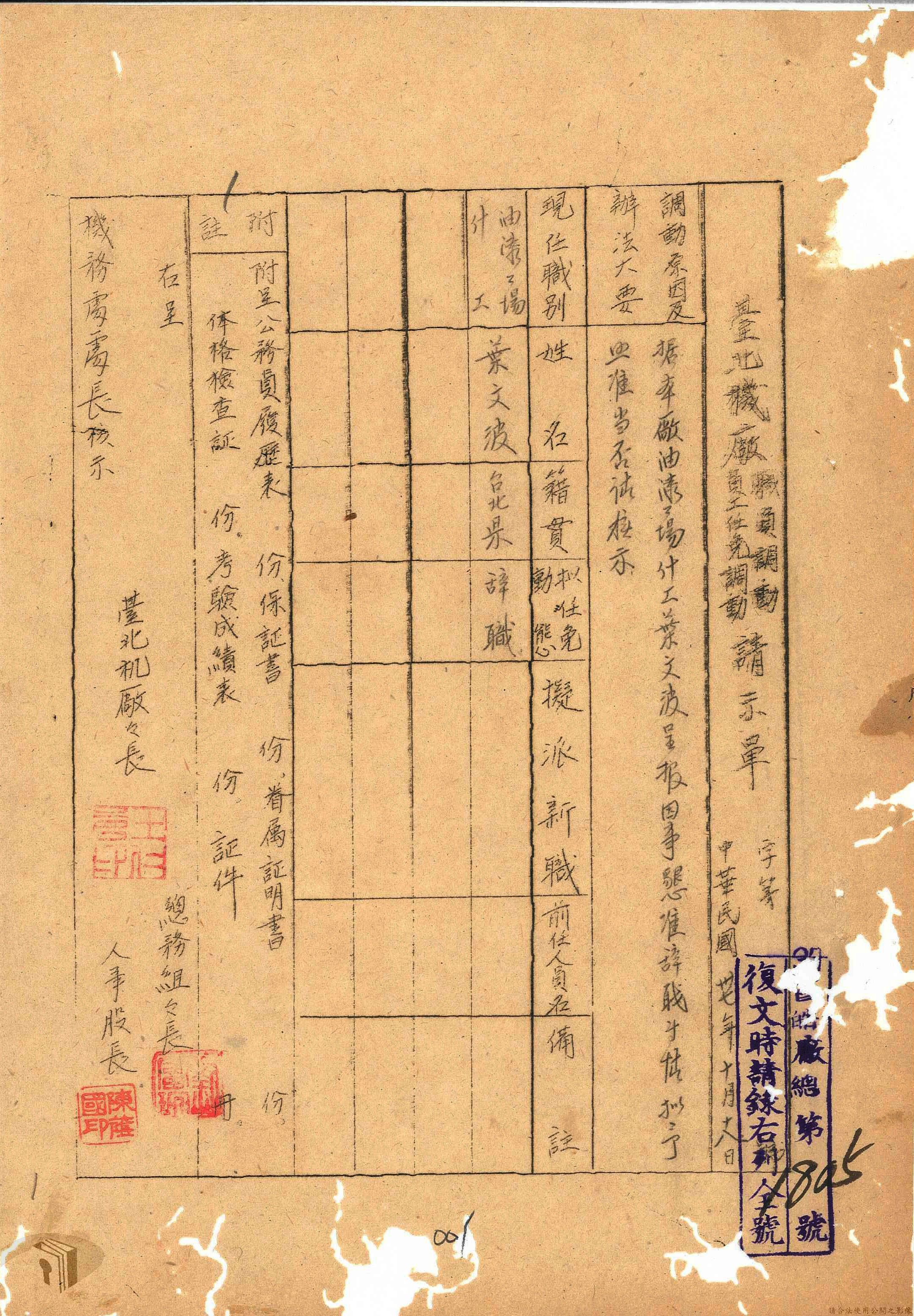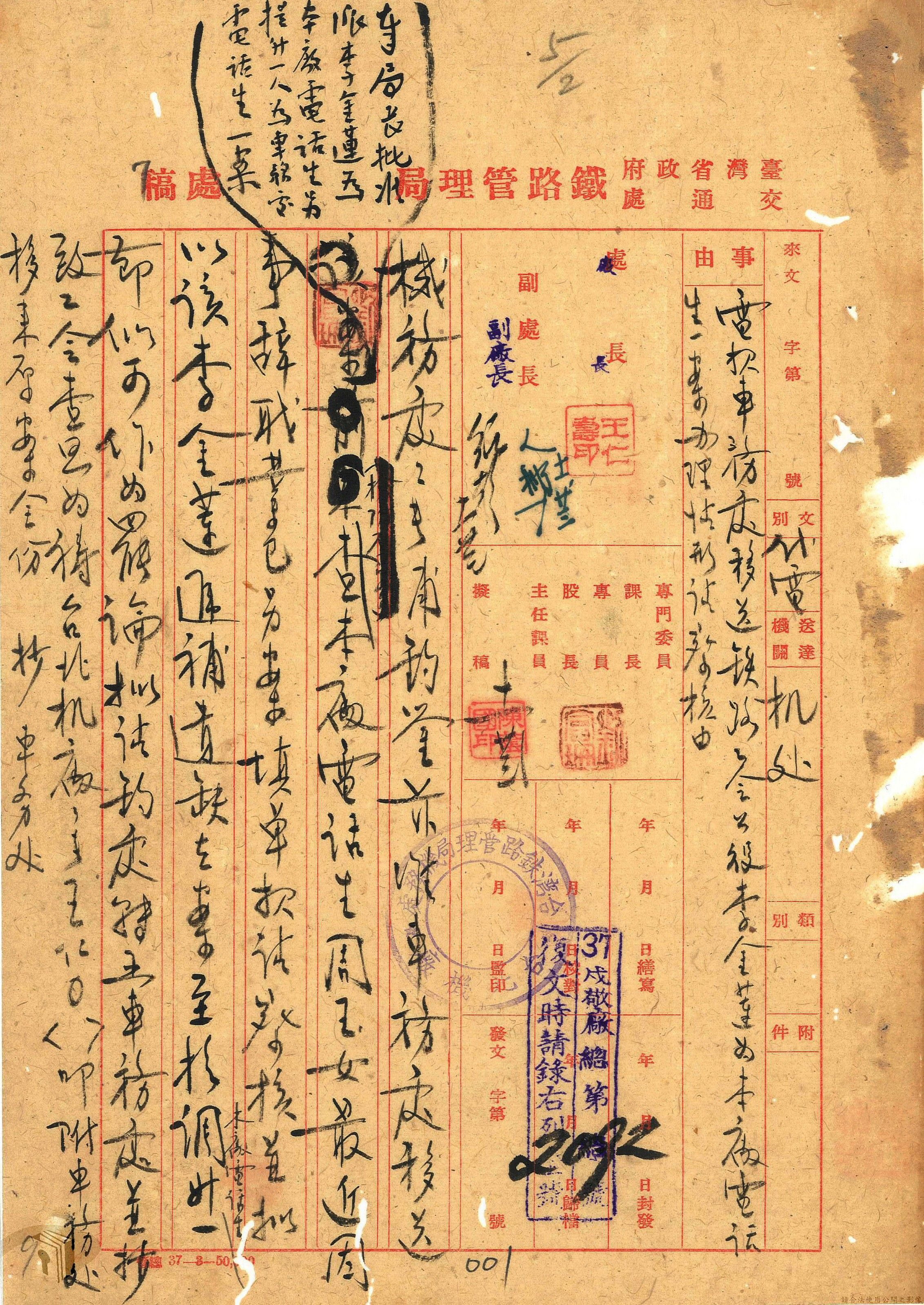 本案為37至38年間,臺灣省鐵路管理局機務處臺北機廠陳請機務處同意依該廠意見辦理人員職位異動相關事宜,鐵路管理局後將審核結果通知臺北機廠,其中部分人員被派任為臺北機廠油漆工場什工、臺北機廠工役,其餘人員則獲該局核准請辭。
