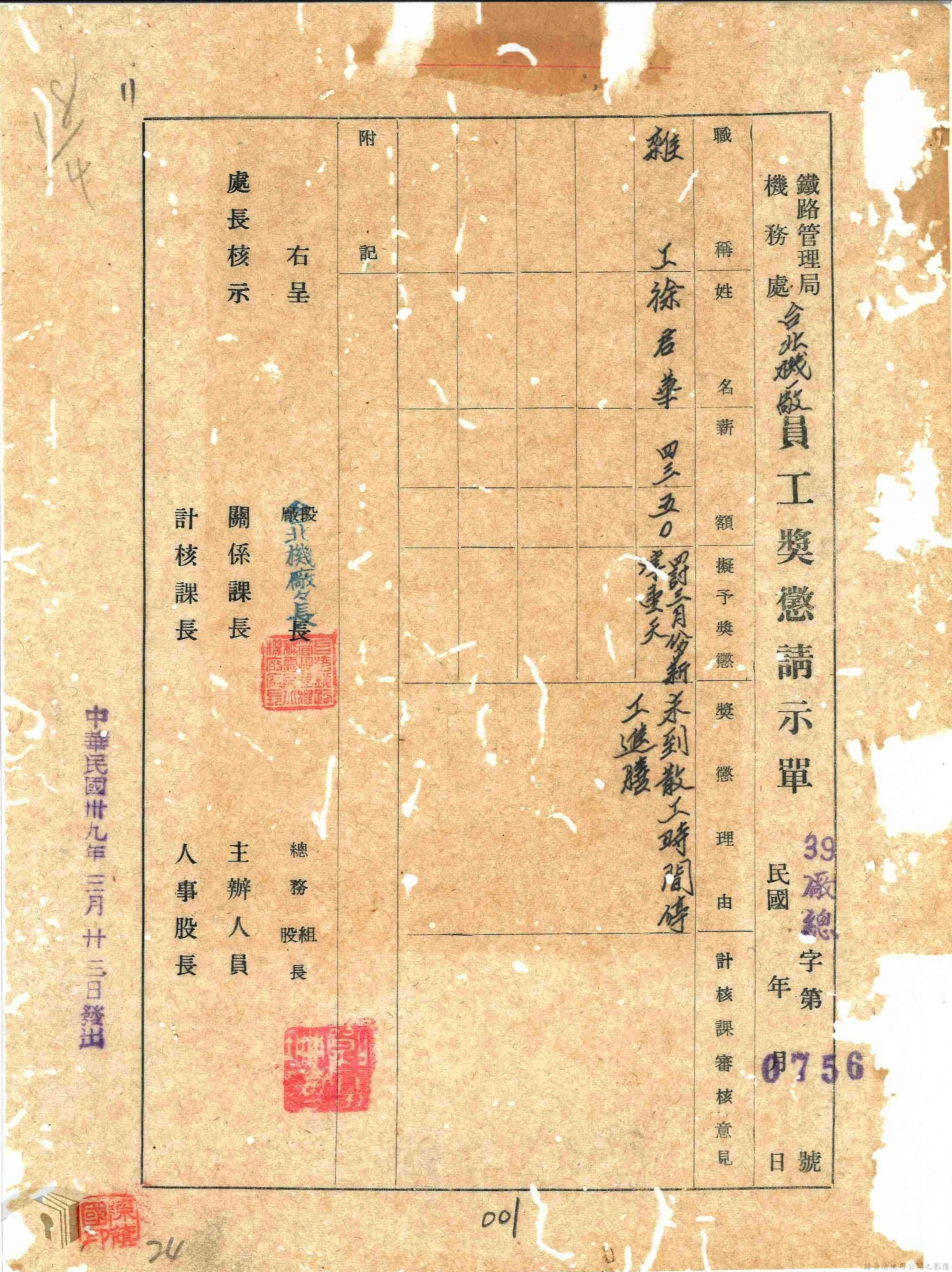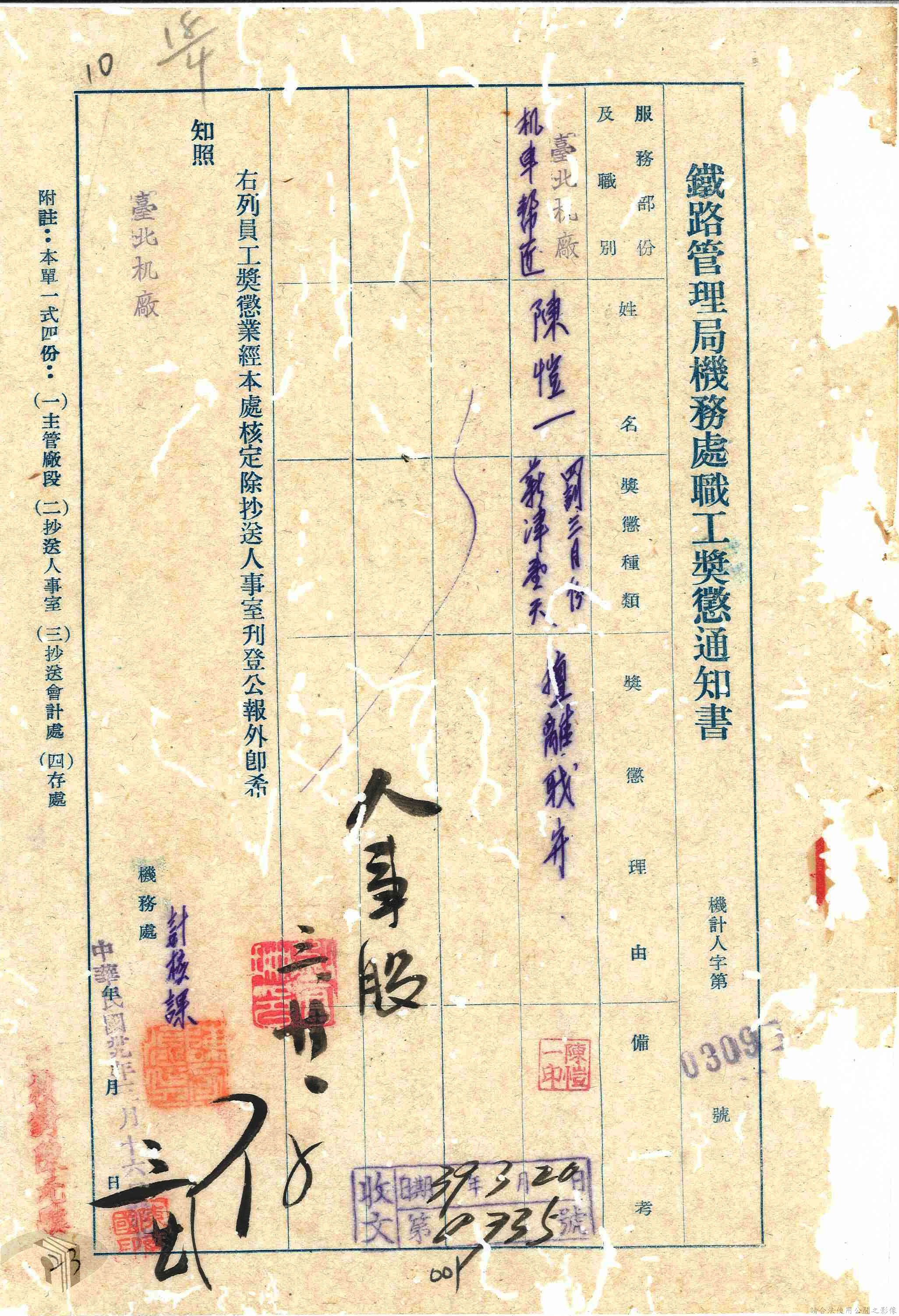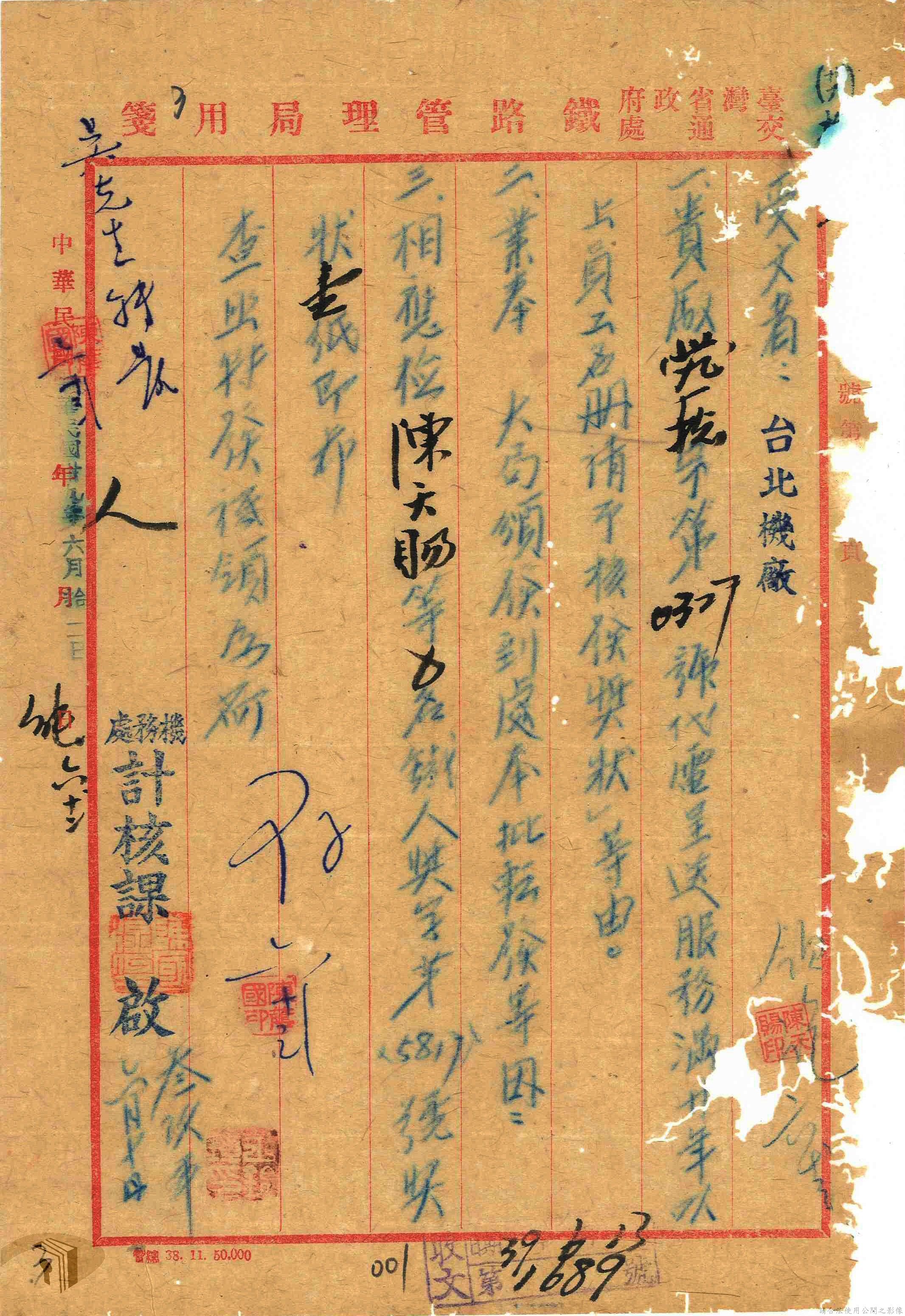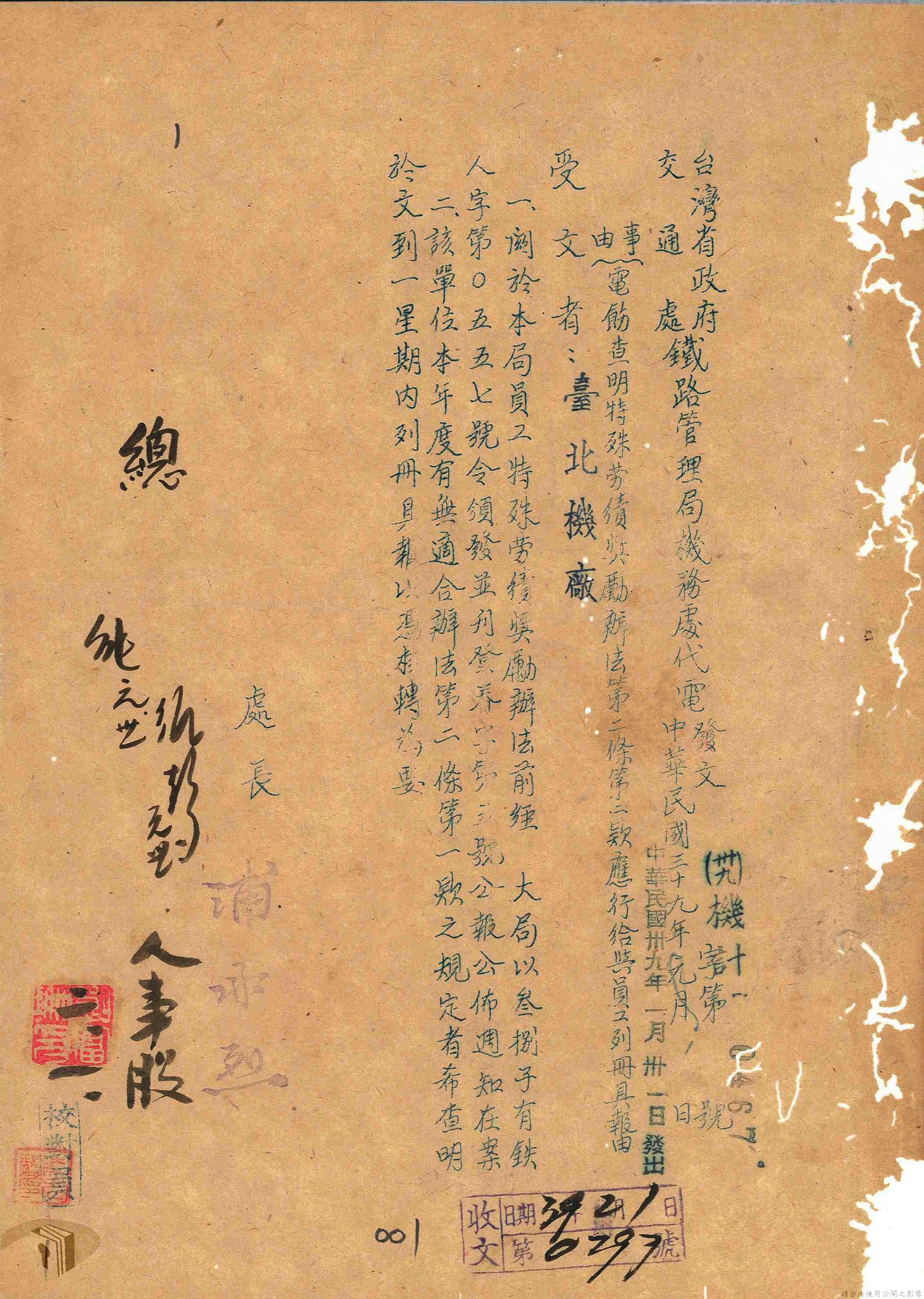 本案為39年間,臺灣省政府交通處鐵路管理局發電報請所屬各單位暨各場段站調查服務滿十年以上且成績優異的員工,並將申請清冊送至該局辦理;鐵路管理局機務處臺北機廠陳請機務處同意依該廠意見對員工進行行政處分,機務處後將審核結果通知臺北機廠。