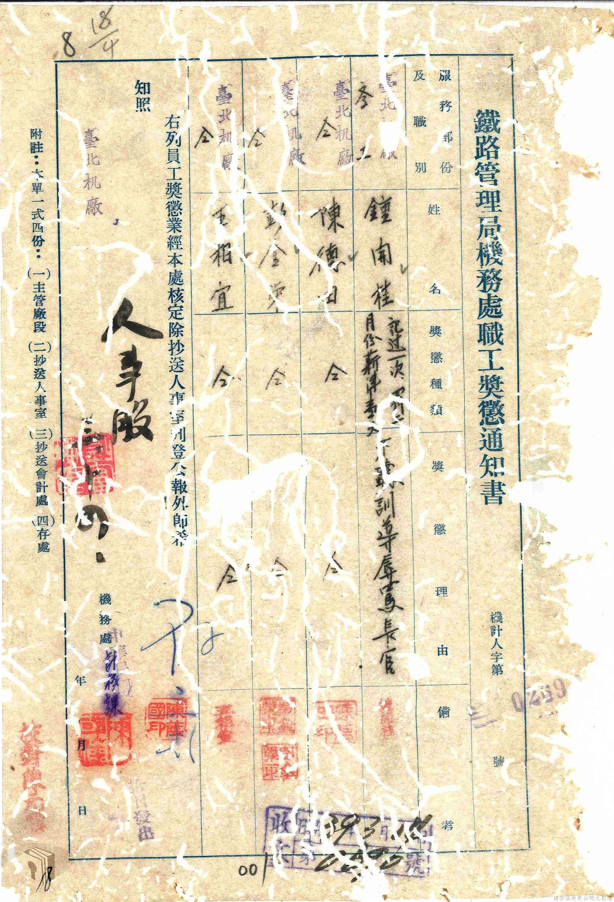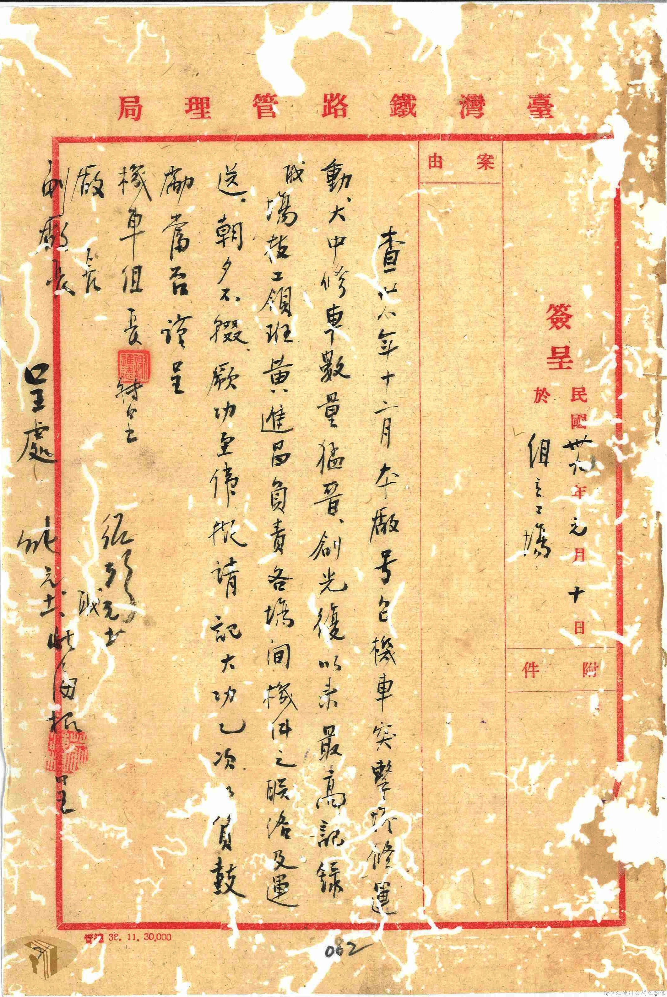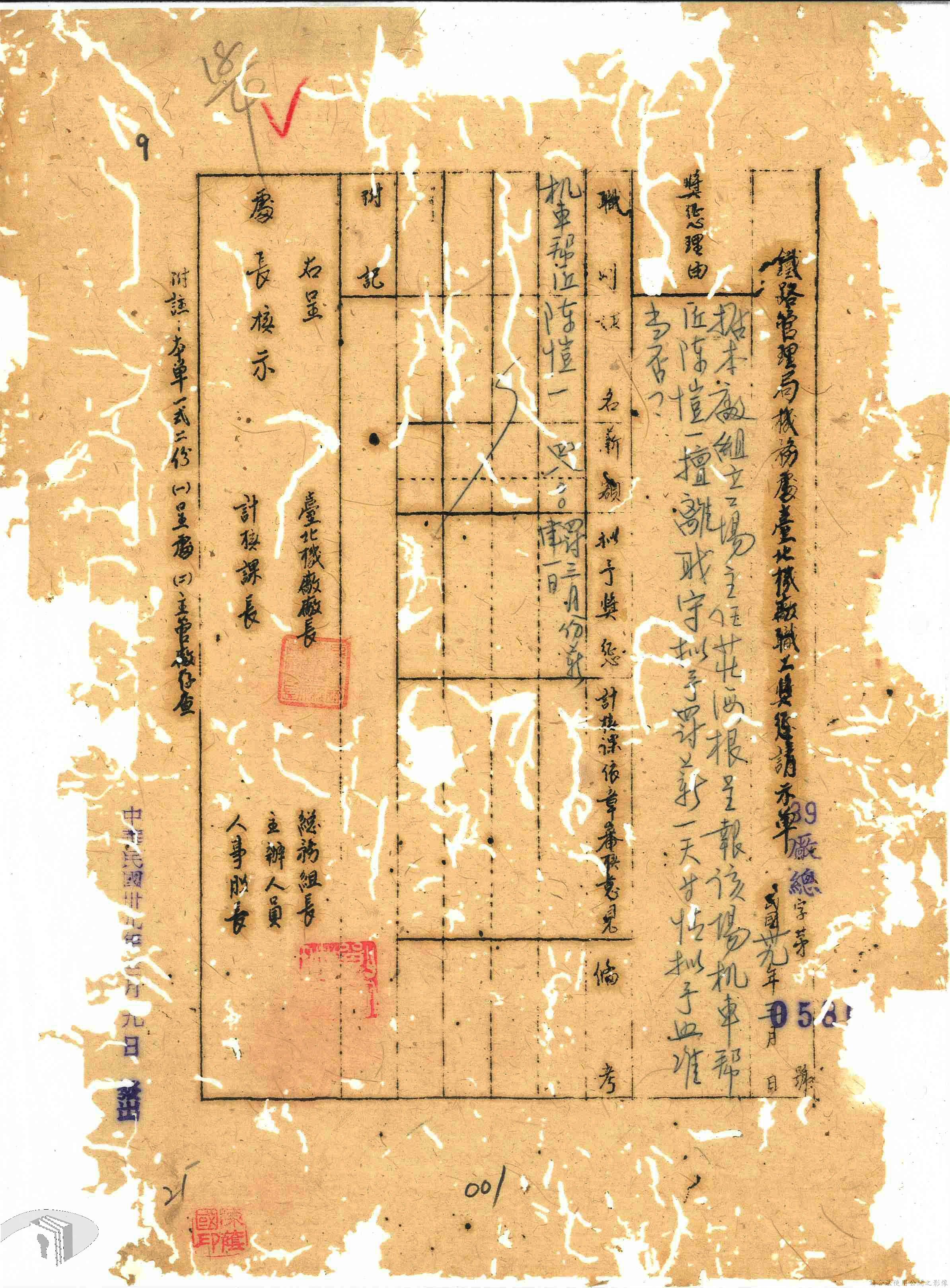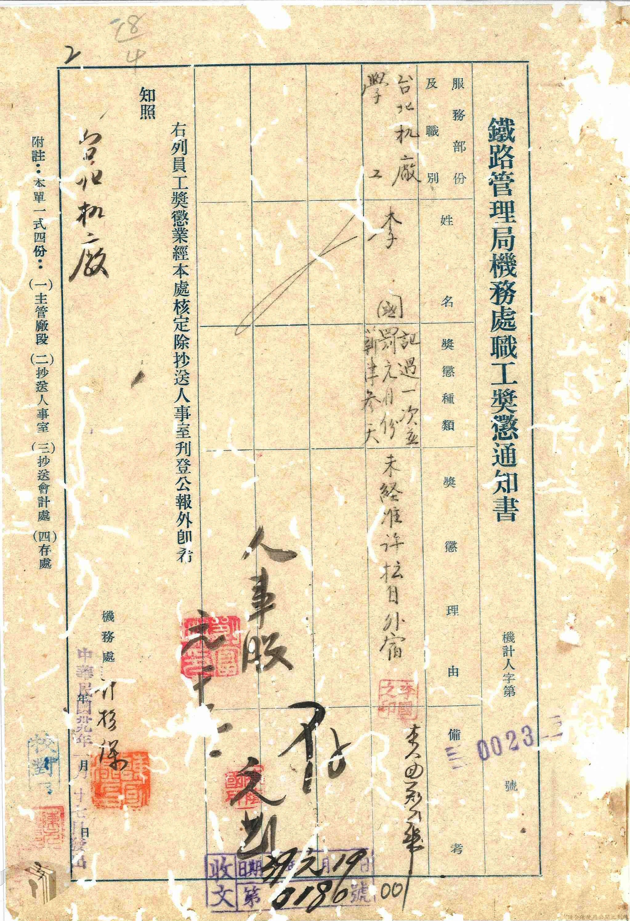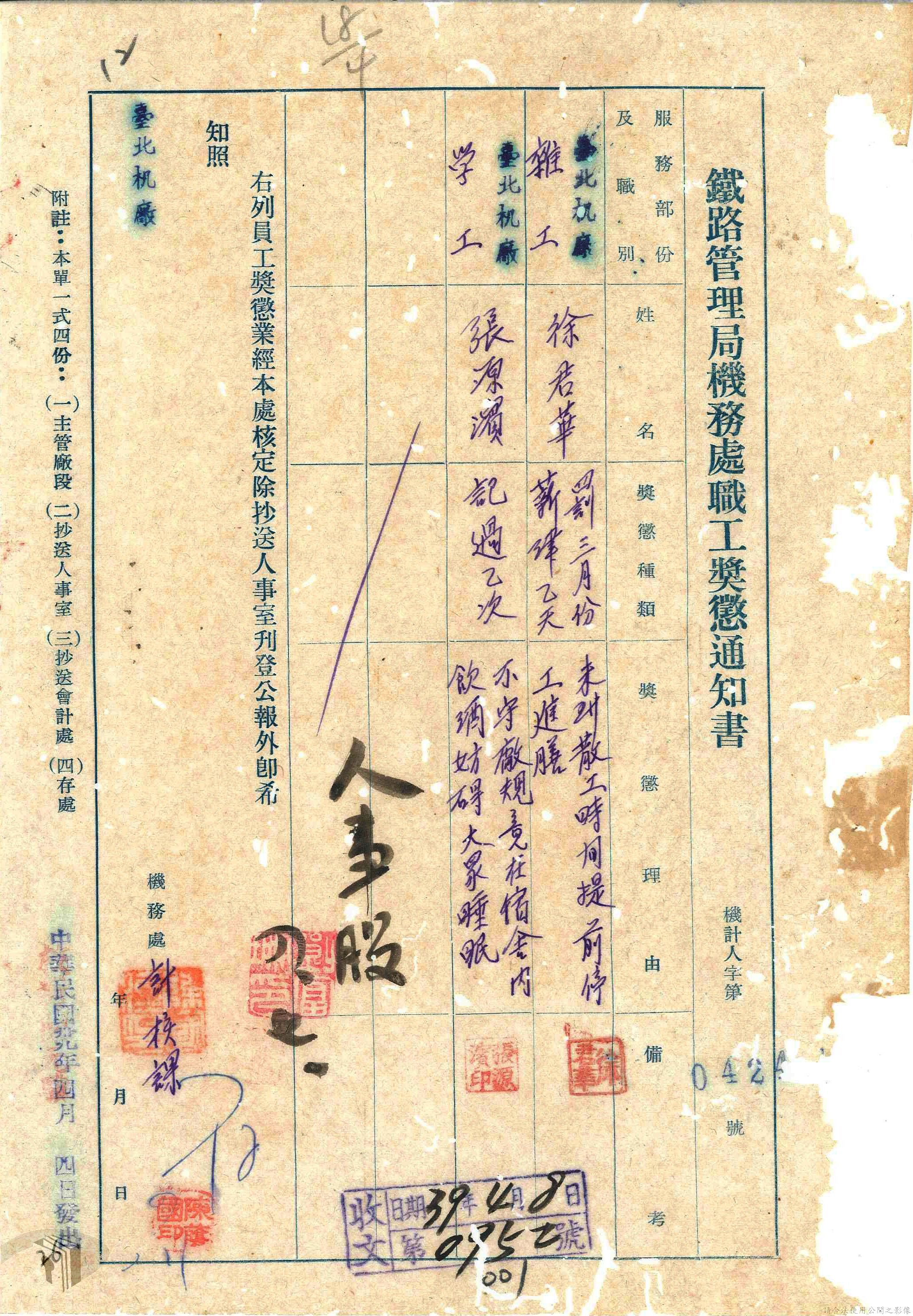 本案為39年間,臺灣省政府交通處鐵路管理局發電報請所屬各單位暨各場段站調查服務滿十年以上且成績優異的員工,並將申請清冊送至該局辦理;鐵路管理局機務處臺北機廠陳請機務處同意依該廠意見對員工進行行政處分,機務處後將審核結果通知臺北機廠。