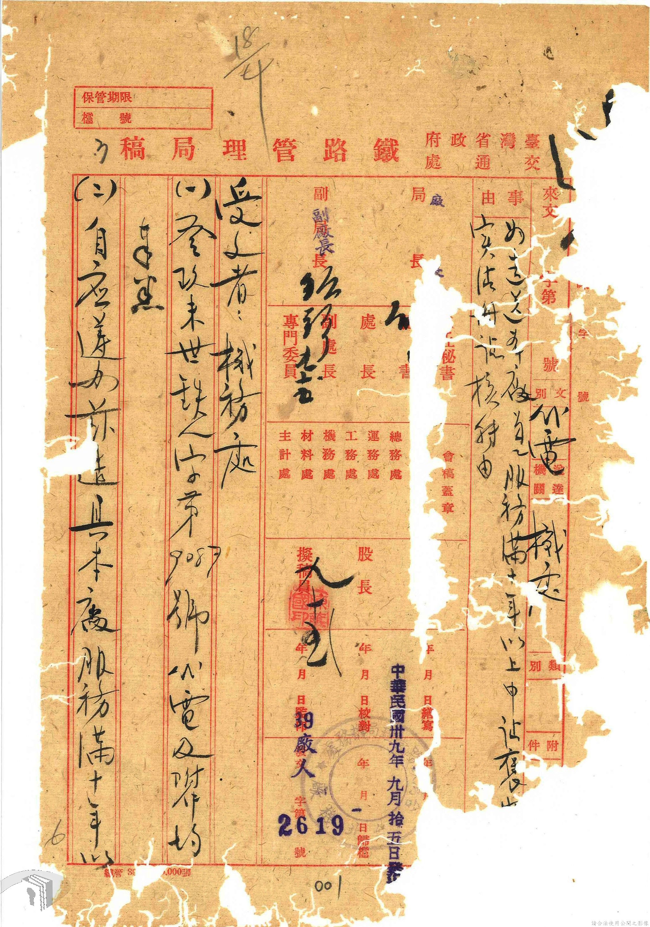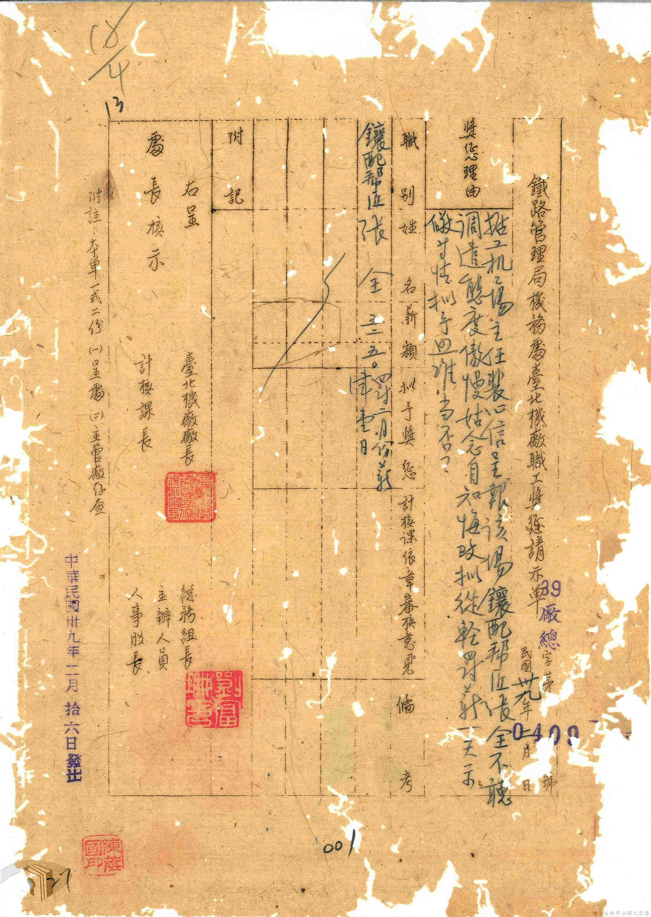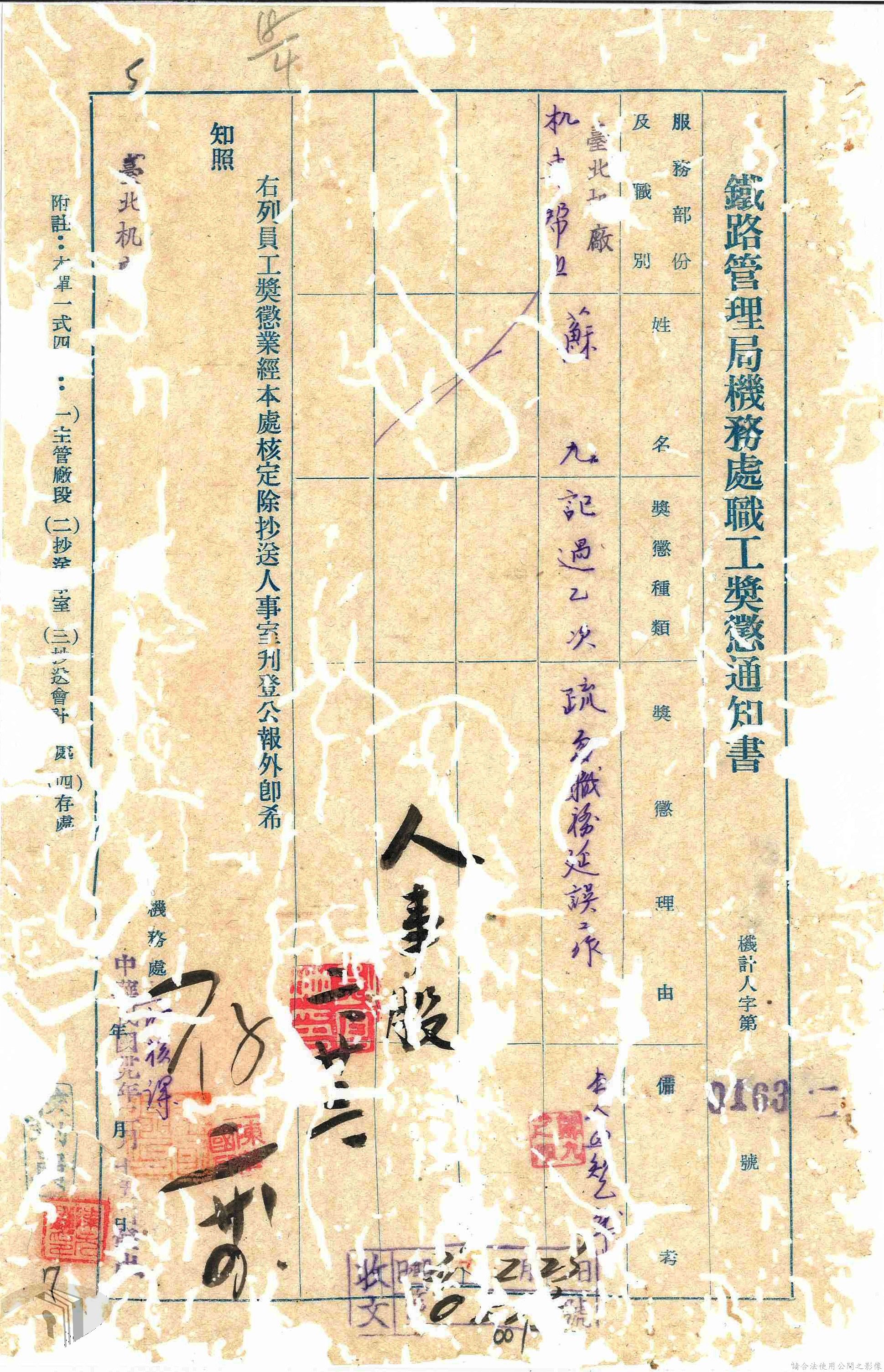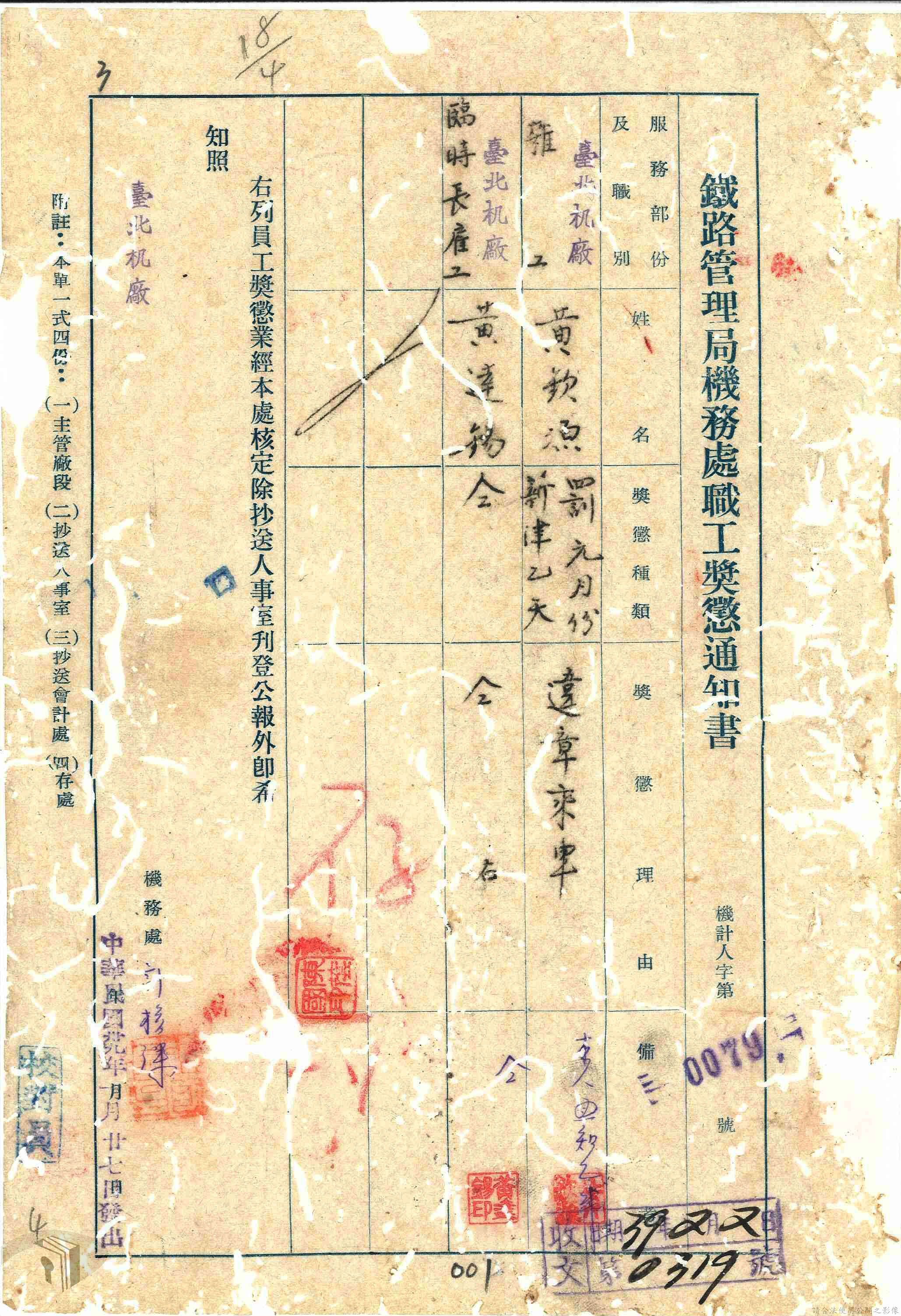 本案為39年間,臺灣省政府交通處鐵路管理局發電報請所屬各單位暨各場段站調查服務滿十年以上且成績優異的員工,並將申請清冊送至該局辦理;鐵路管理局機務處臺北機廠陳請機務處同意依該廠意見對員工進行行政處分,機務處後將審核結果通知臺北機廠。