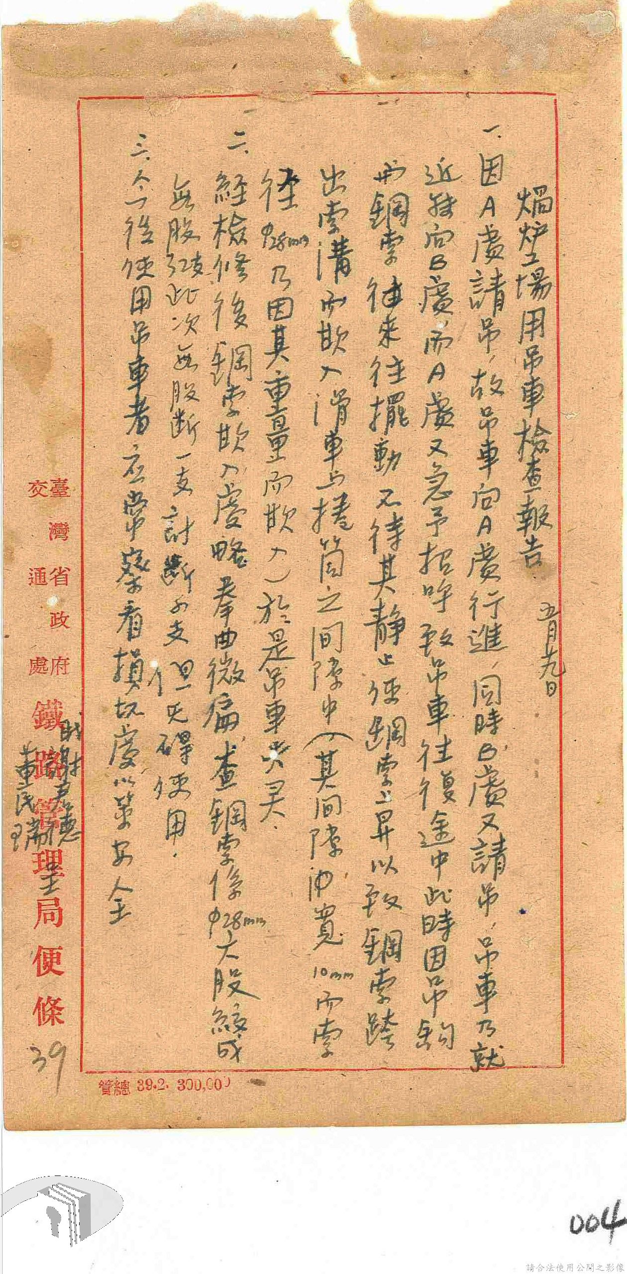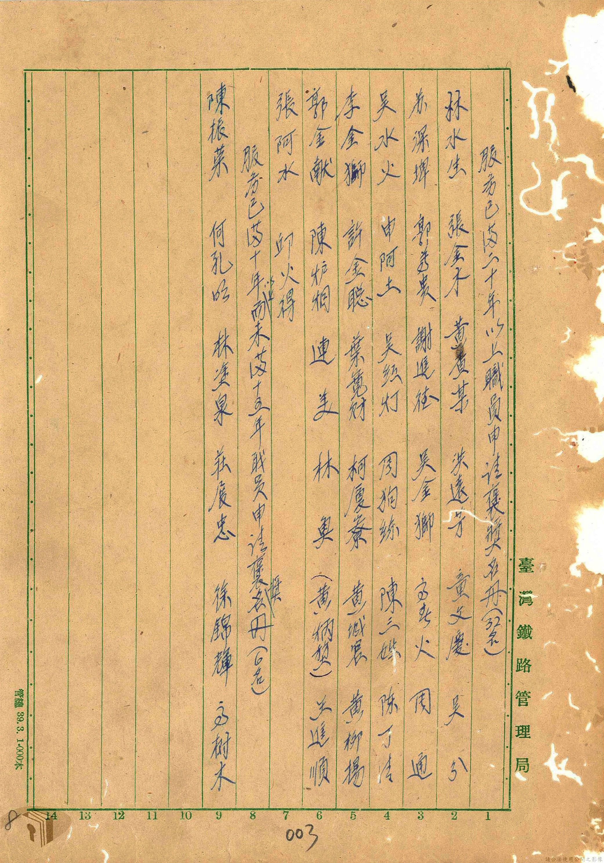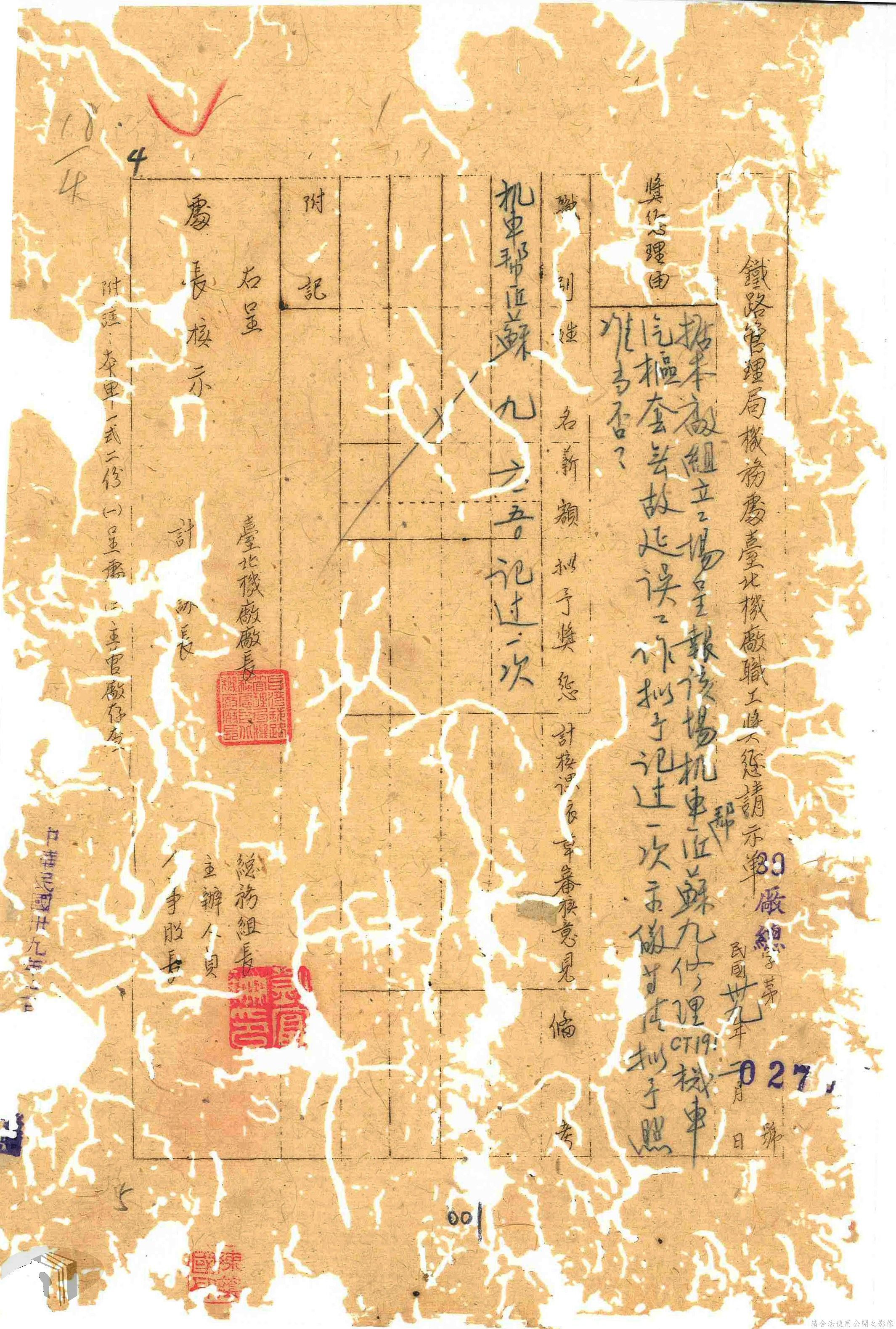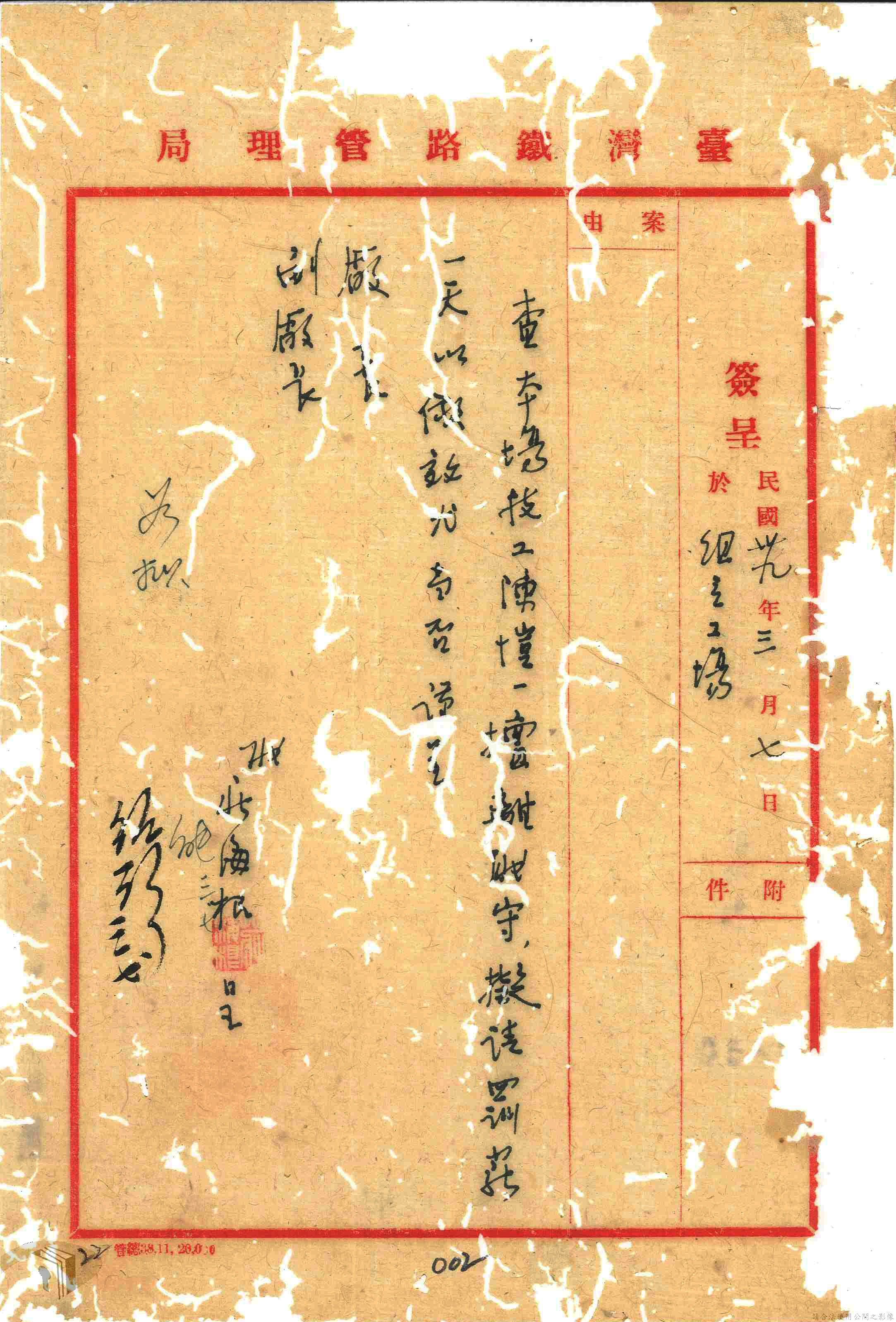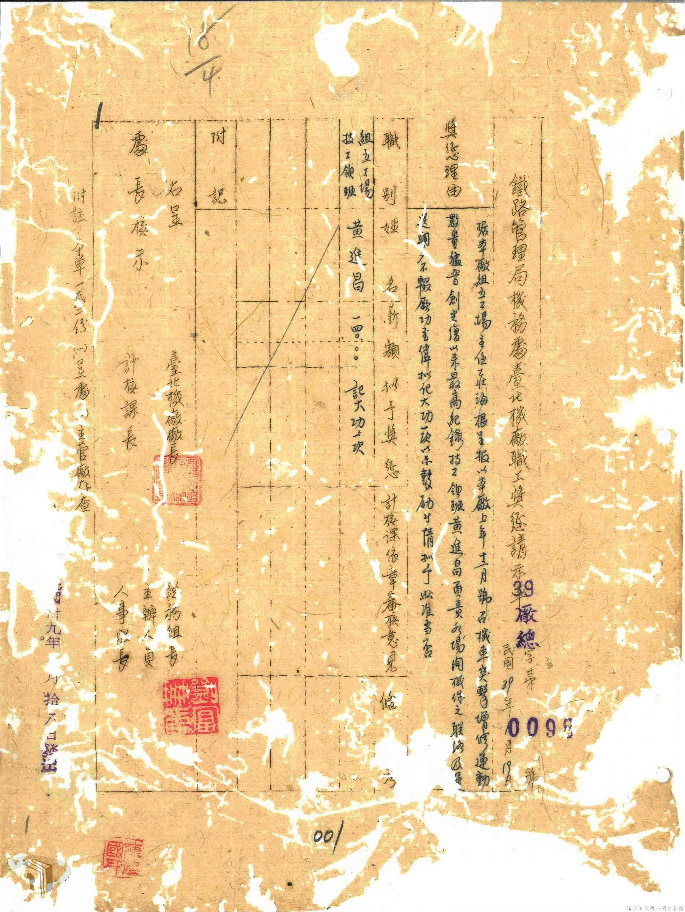 本案為39年間,臺灣省政府交通處鐵路管理局發電報請所屬各單位暨各場段站調查服務滿十年以上且成績優異的員工,並將申請清冊送至該局辦理;鐵路管理局機務處臺北機廠陳請機務處同意依該廠意見對員工進行行政處分,機務處後將審核結果通知臺北機廠。