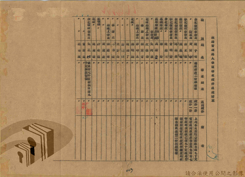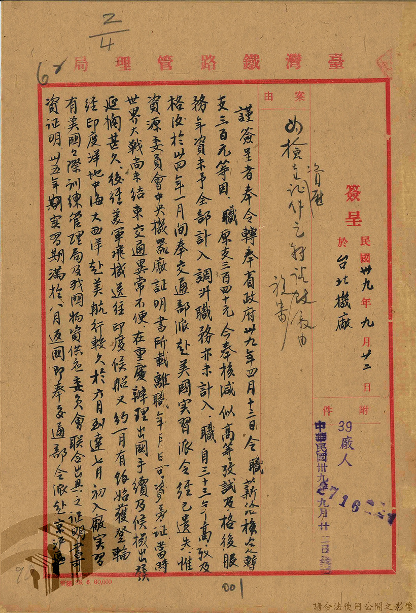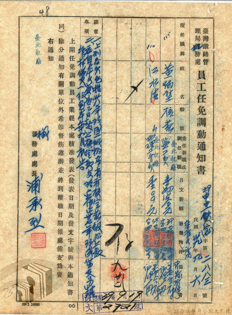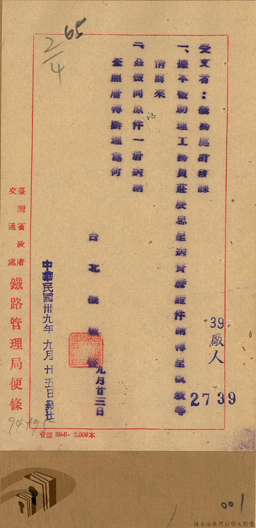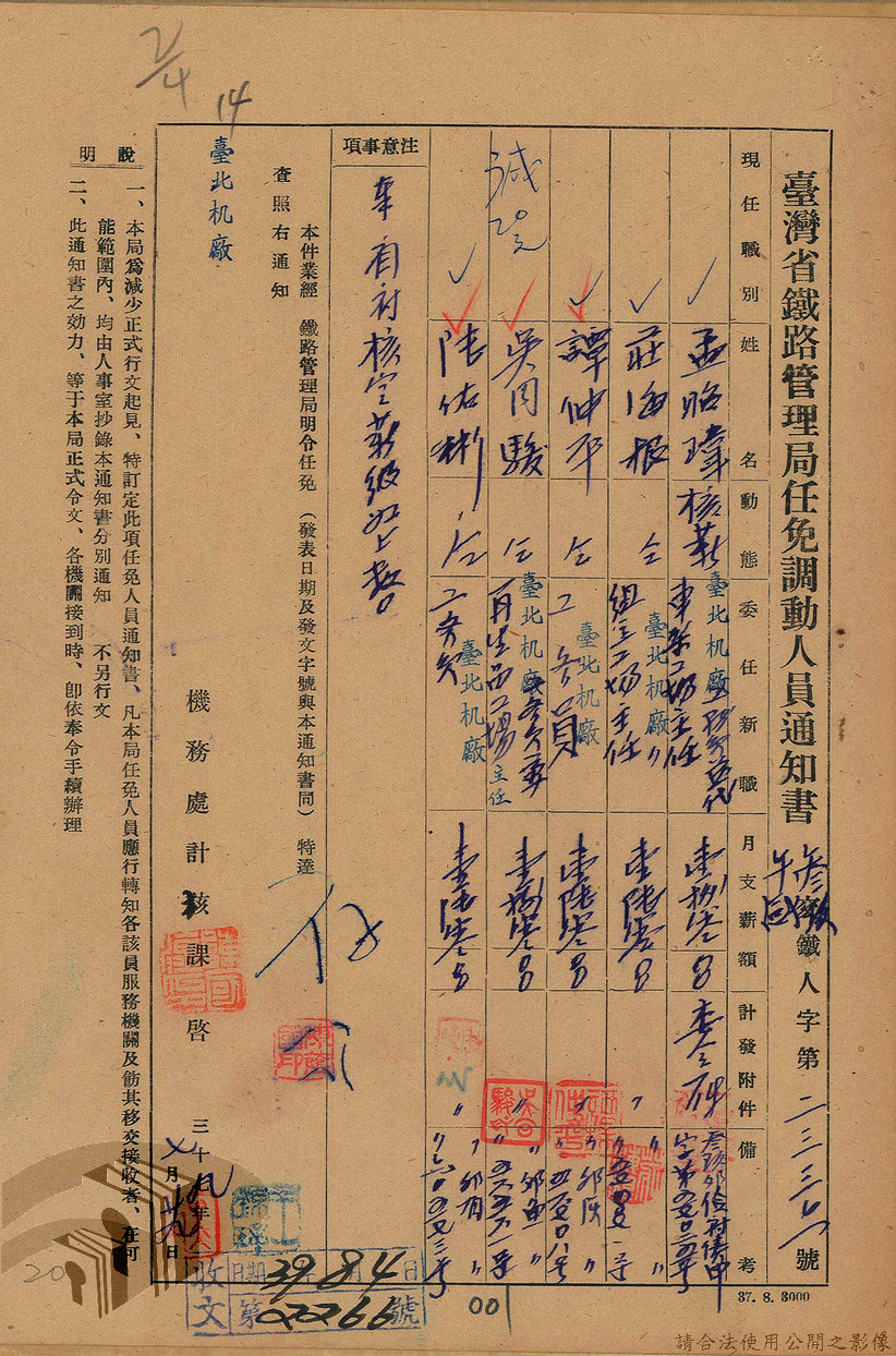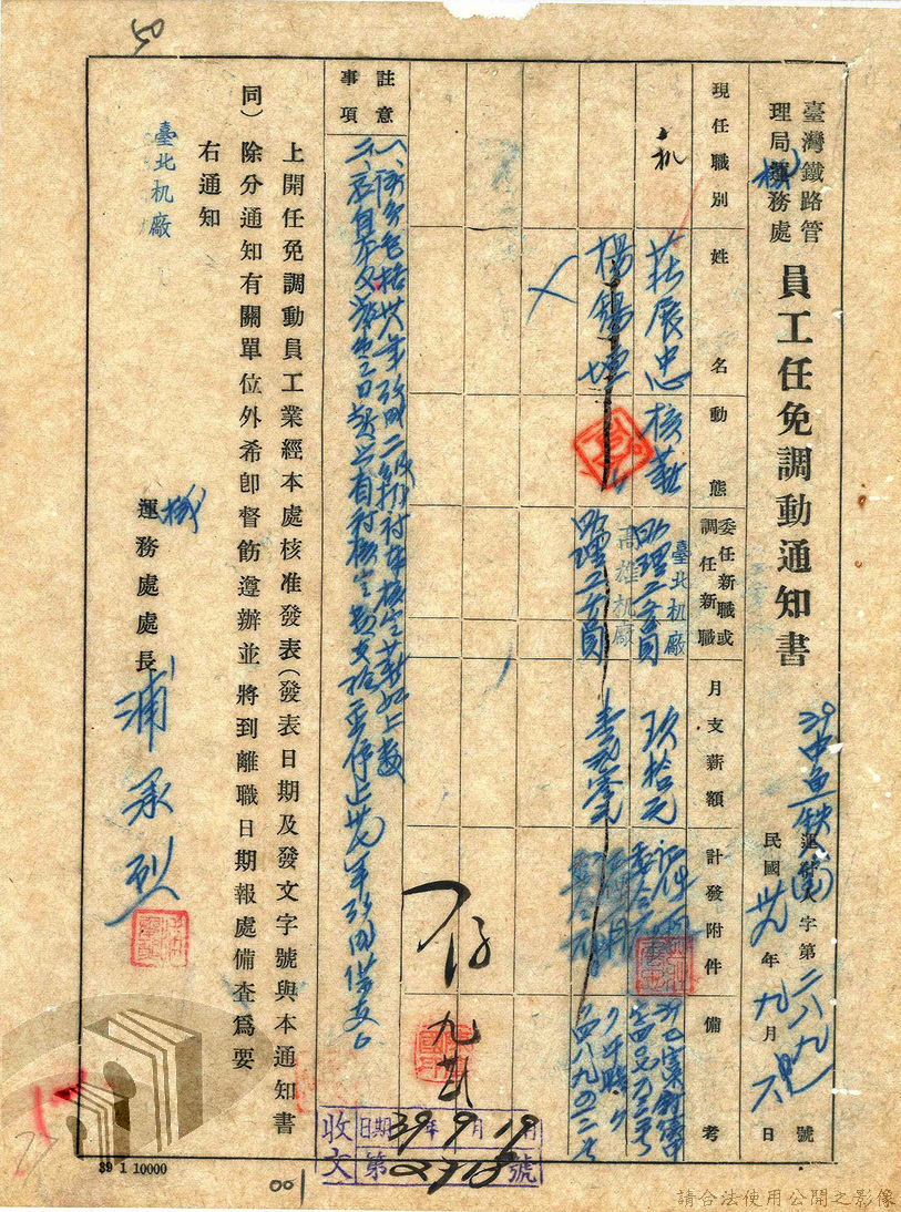 本案為39至40年間,臺北機廠陳請臺灣省鐵路管理局機務處同意依該廠意見辦理人員職位異動相關事宜,機務處後將審核結果通知臺北機廠,其中部分人員被派任為臺北機廠幫工程司、臺北機廠監工員等職。附審查證件退還清單等文件資料。