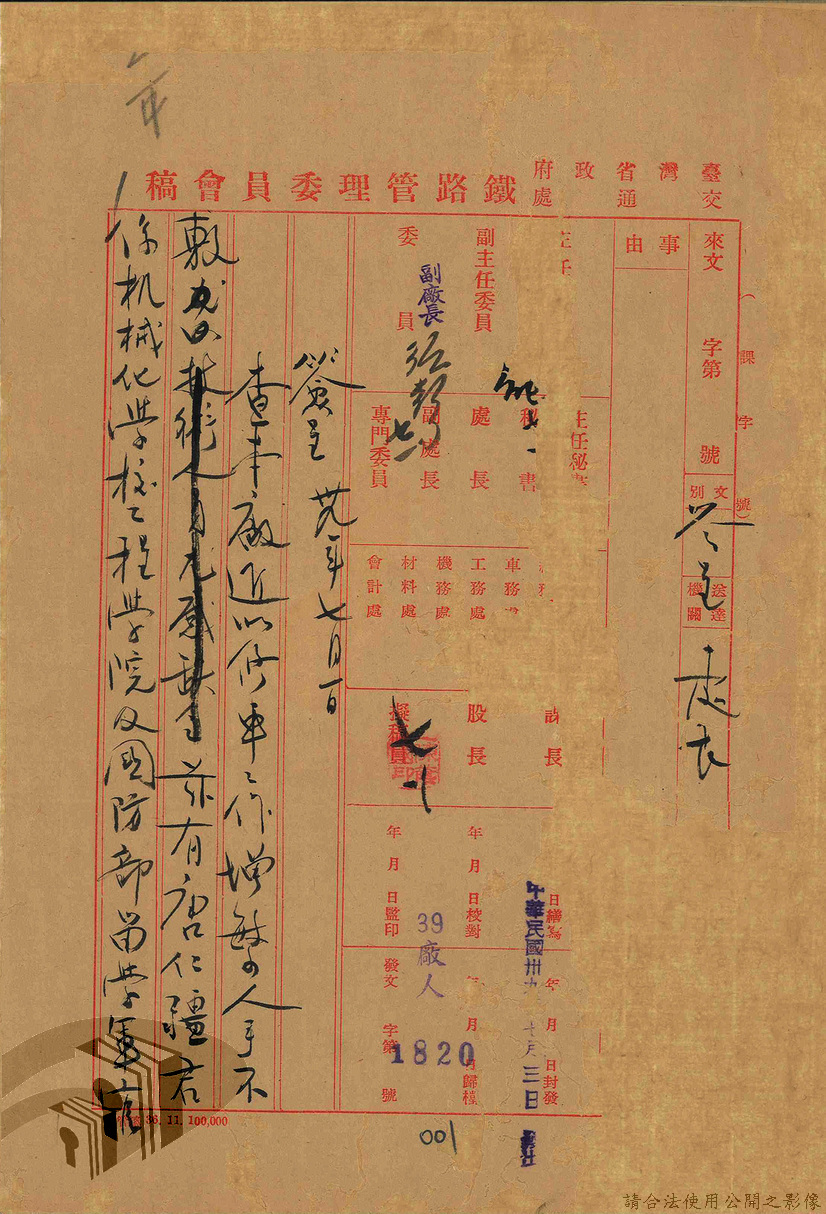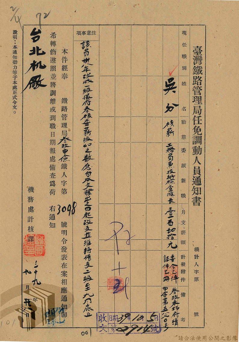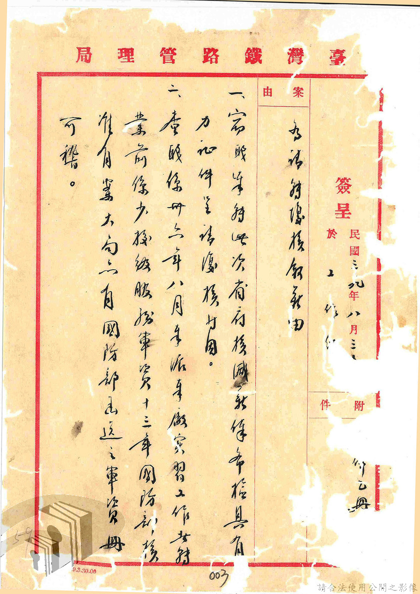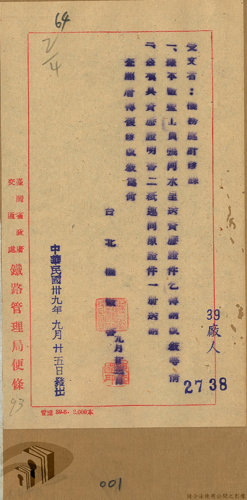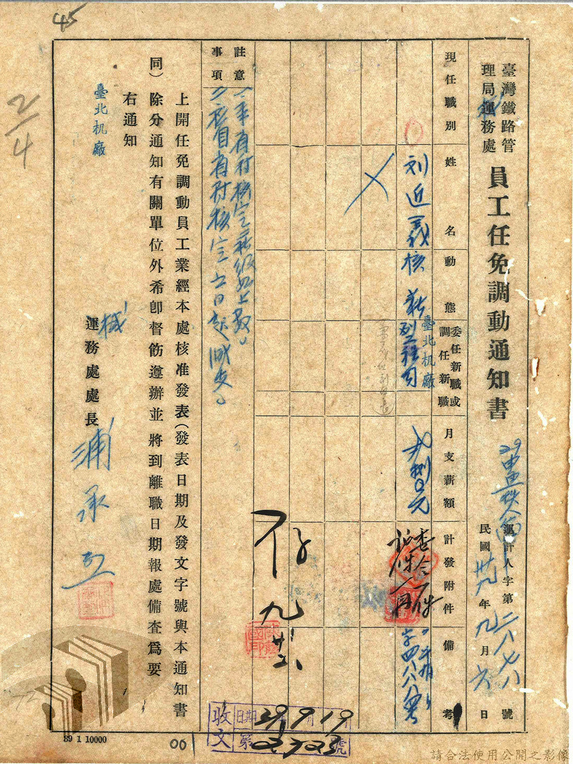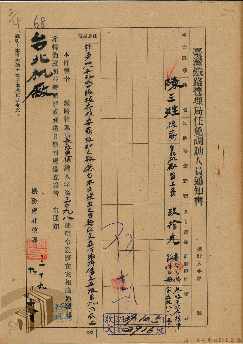 本案為39至40年間,臺北機廠陳請臺灣省鐵路管理局機務處同意依該廠意見辦理人員職位異動相關事宜,機務處後將審核結果通知臺北機廠,其中部分人員被派任為臺北機廠幫工程司、臺北機廠監工員等職。附審查證件退還清單等文件資料。