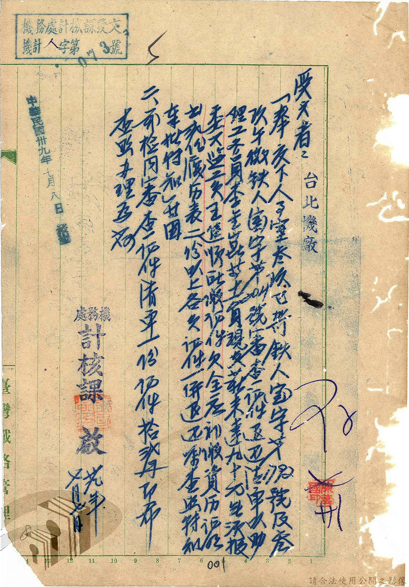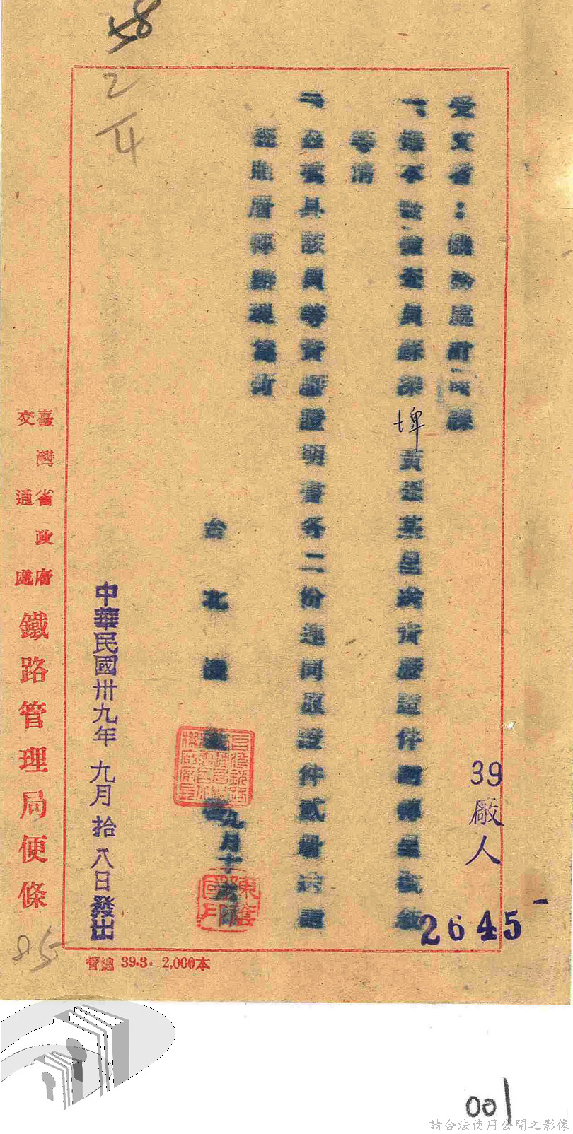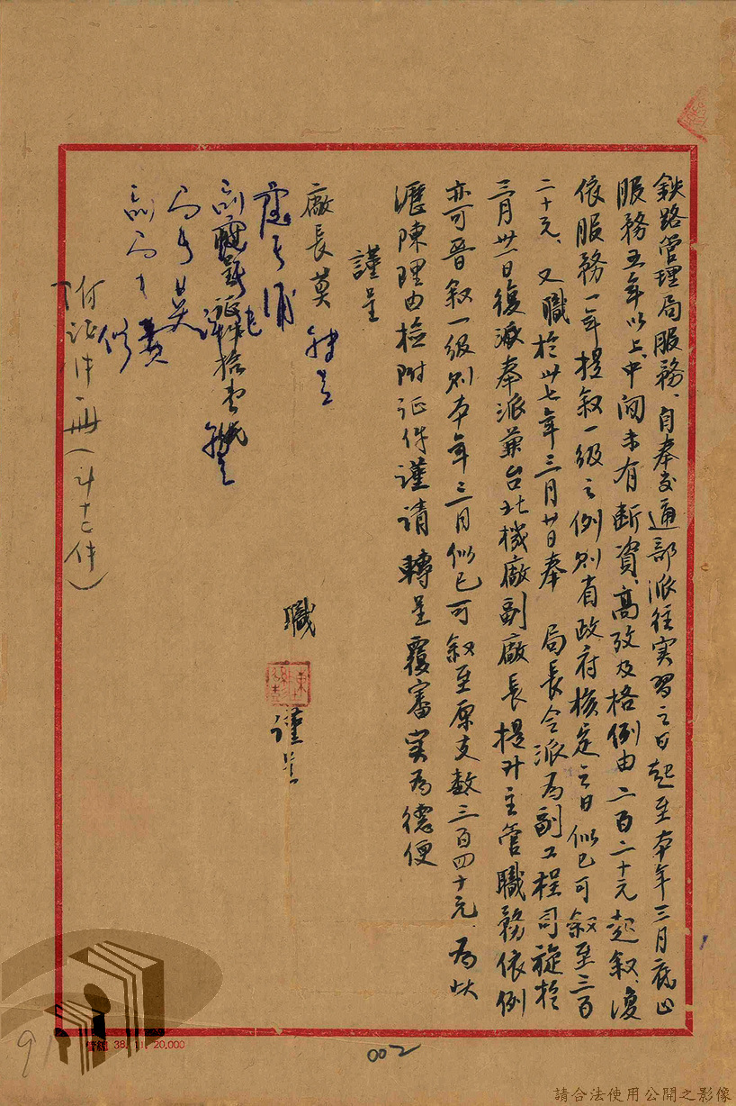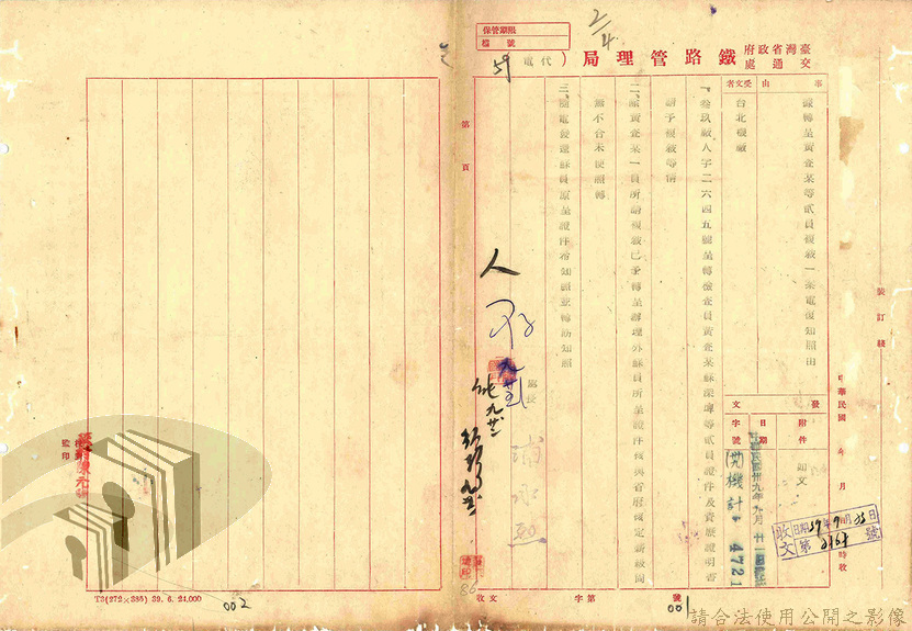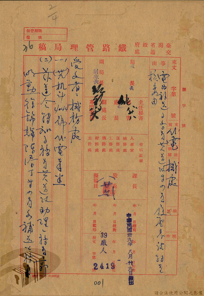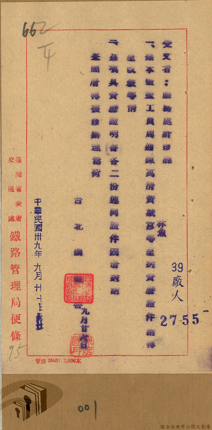 本案為39至40年間,臺北機廠陳請臺灣省鐵路管理局機務處同意依該廠意見辦理人員職位異動相關事宜,機務處後將審核結果通知臺北機廠,其中部分人員被派任為臺北機廠幫工程司、臺北機廠監工員等職。附審查證件退還清單等文件資料。