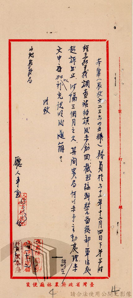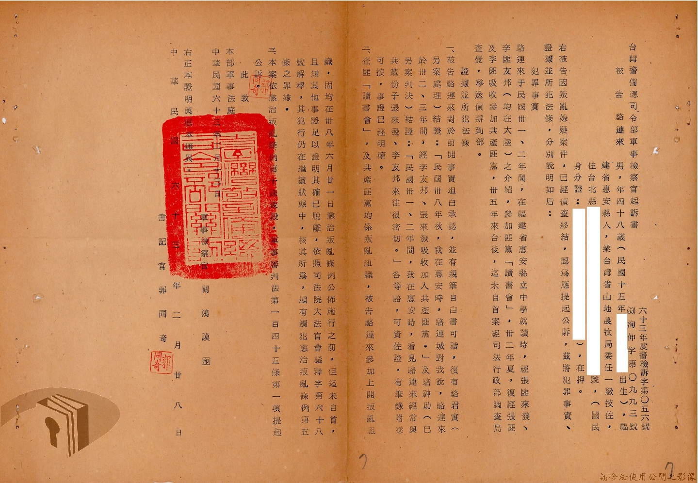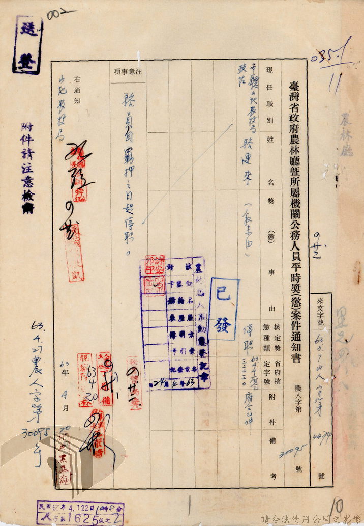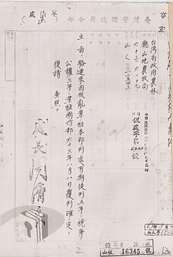 本案為63年間,臺灣省政府農林廳山地農牧局為該局人員因案經臺灣警備總司令部軍事檢察官提起公訴,陳請臺灣省政府農林廳准予將該員停職,農林廳通知山地農牧局將其停職,該局後又因當事人獲臺灣警備總司令部、國防部判決,陳請農林廳准予解除其職務,以及將判刑通知名冊轉送相關單位核備,該廳將判刑通知名冊檢送臺灣省政府,並通知山地農牧局解除該員職務。附臺灣警備總司令部軍事檢察官起訴書、臺灣警備總司令部判刑通知名冊等文件資料。