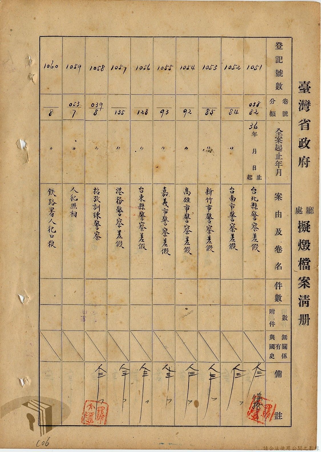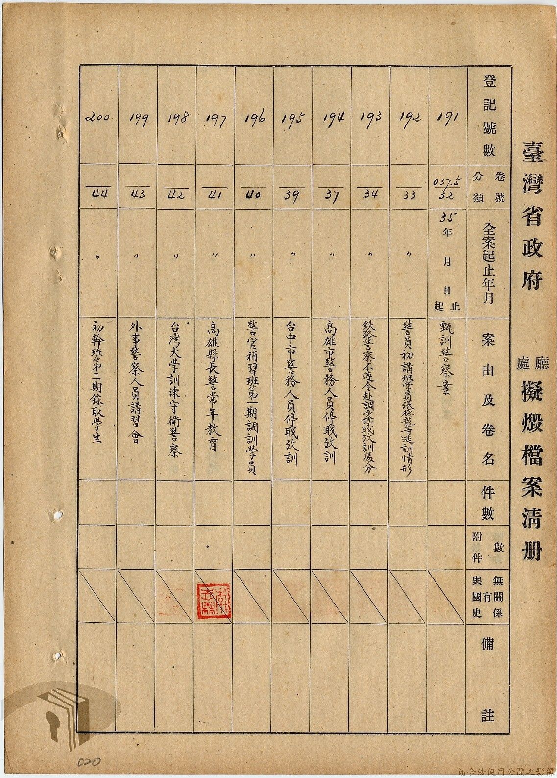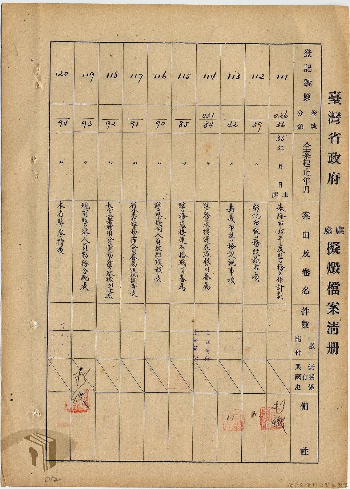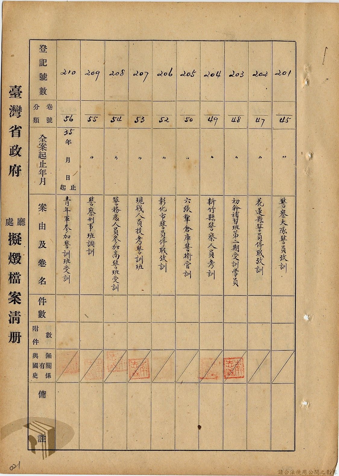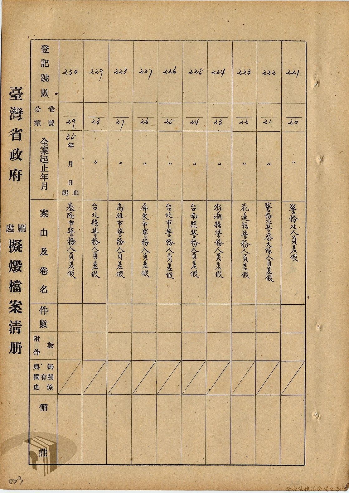 本案為35至36年間,臺灣省政府警務處銷毀檔案清冊,銷毀內容包括:規定辦公時間、推行夏令時間、各警察機關長警人數分配表、警察員工通行證、不錄用人員、警察職員錄、警務人員對調服務、現職人員投考警訓班、衛生講習班事項等。