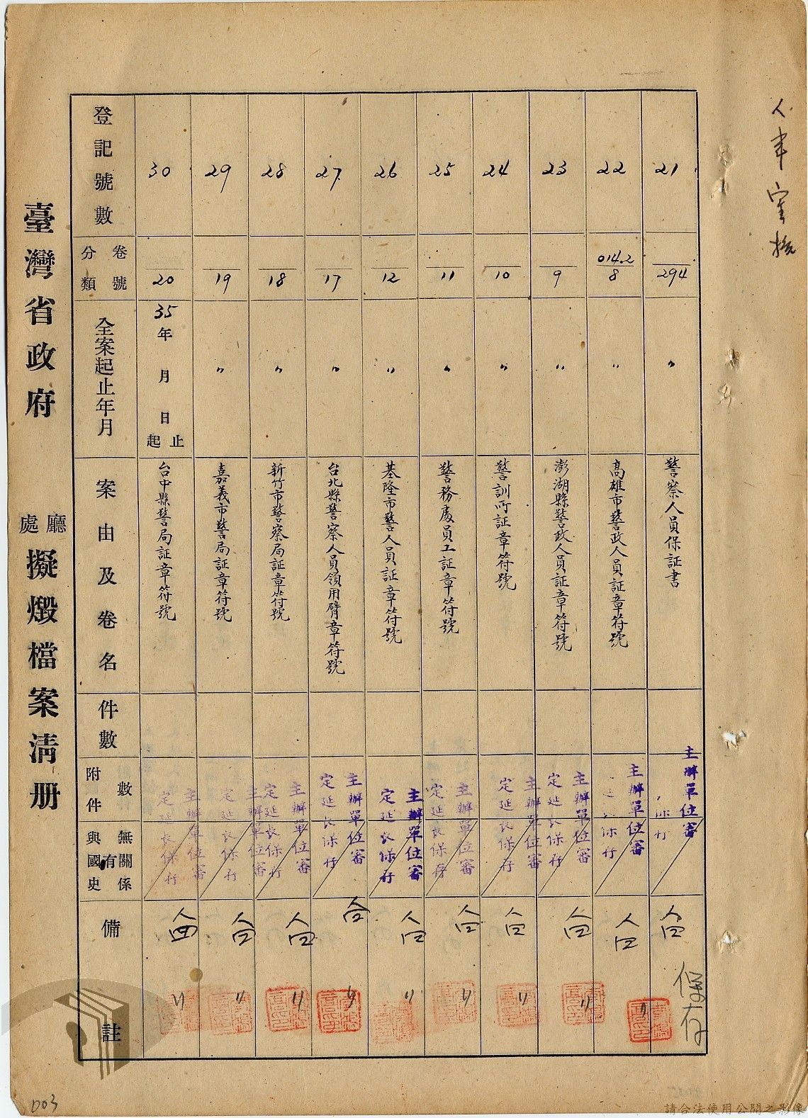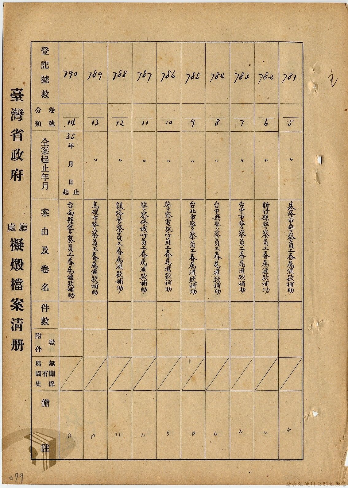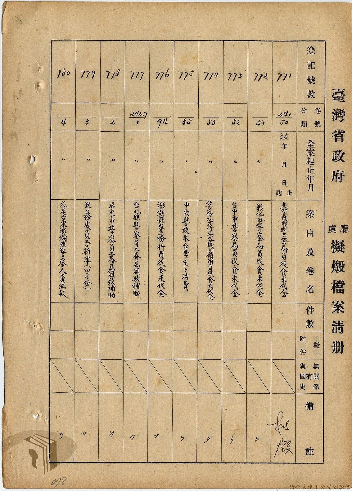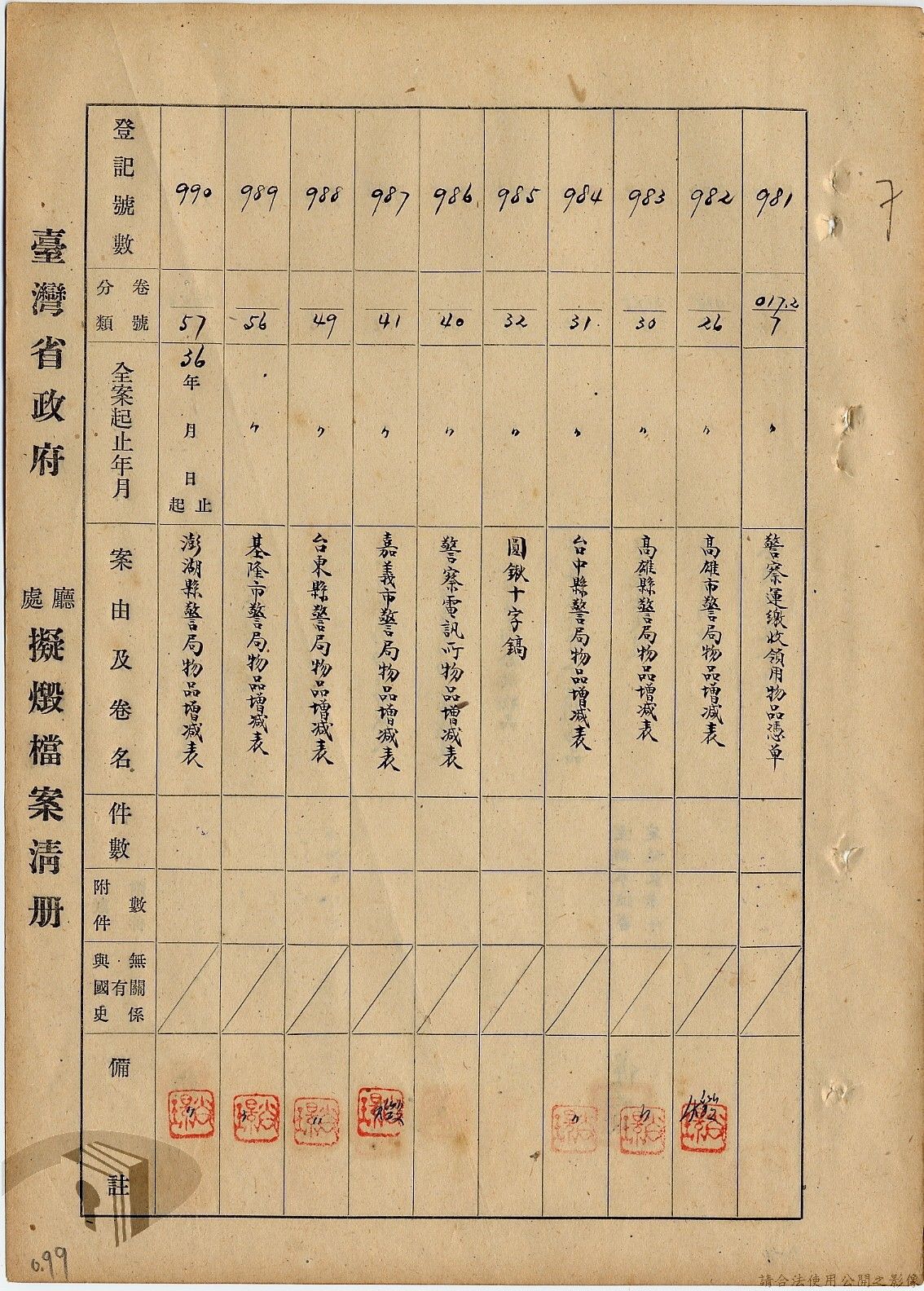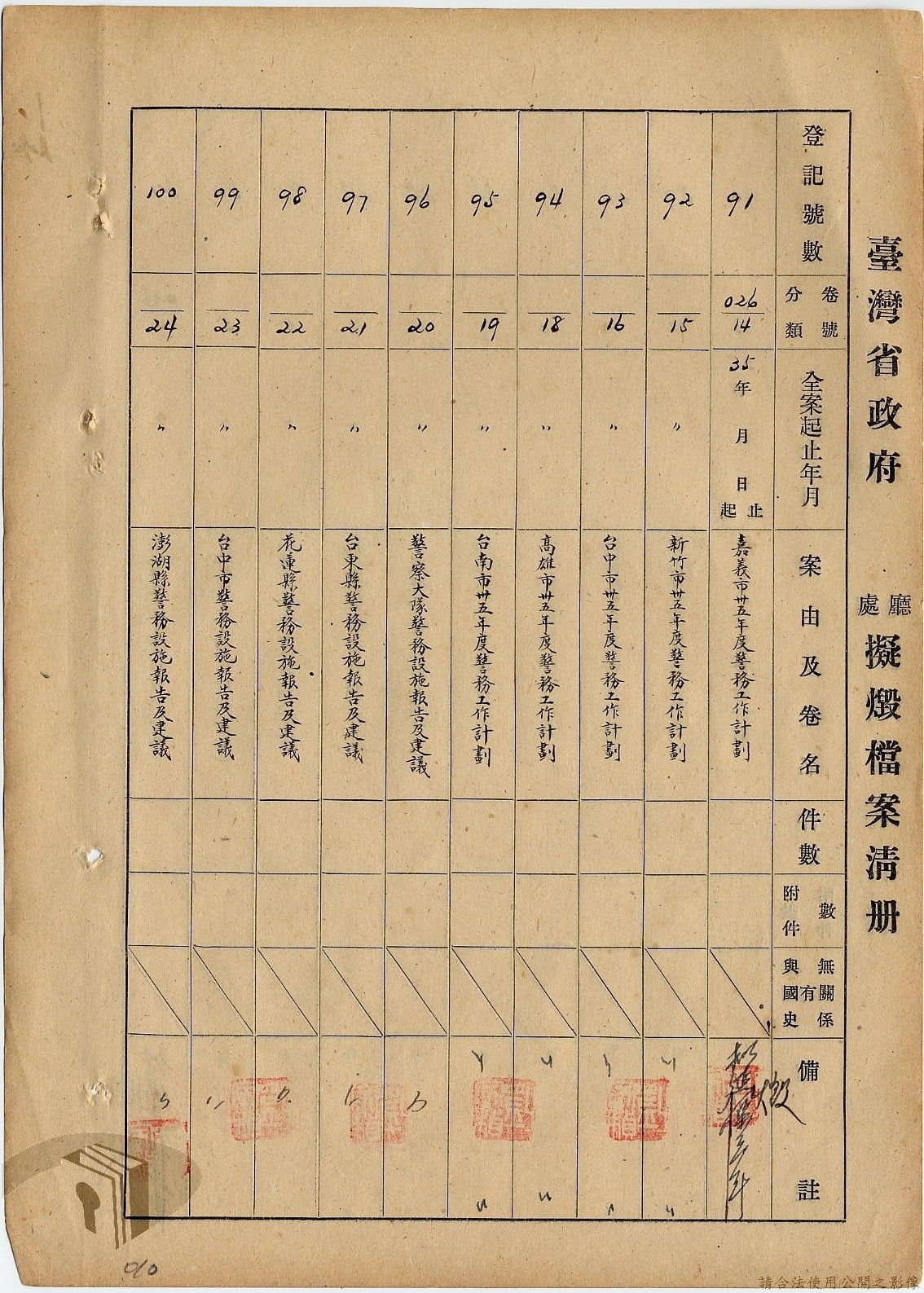 本案為35至36年間,臺灣省政府警務處銷毀檔案清冊,銷毀內容包括:規定辦公時間、推行夏令時間、各警察機關長警人數分配表、警察員工通行證、不錄用人員、警察職員錄、警務人員對調服務、現職人員投考警訓班、衛生講習班事項等。