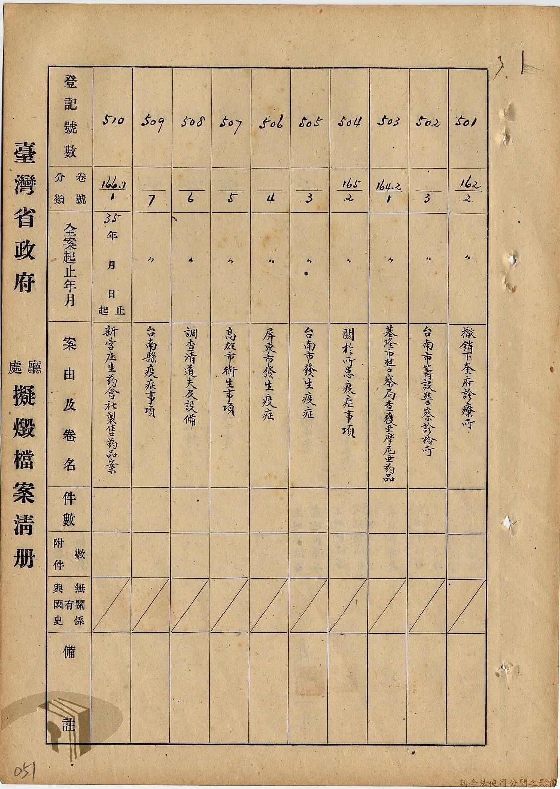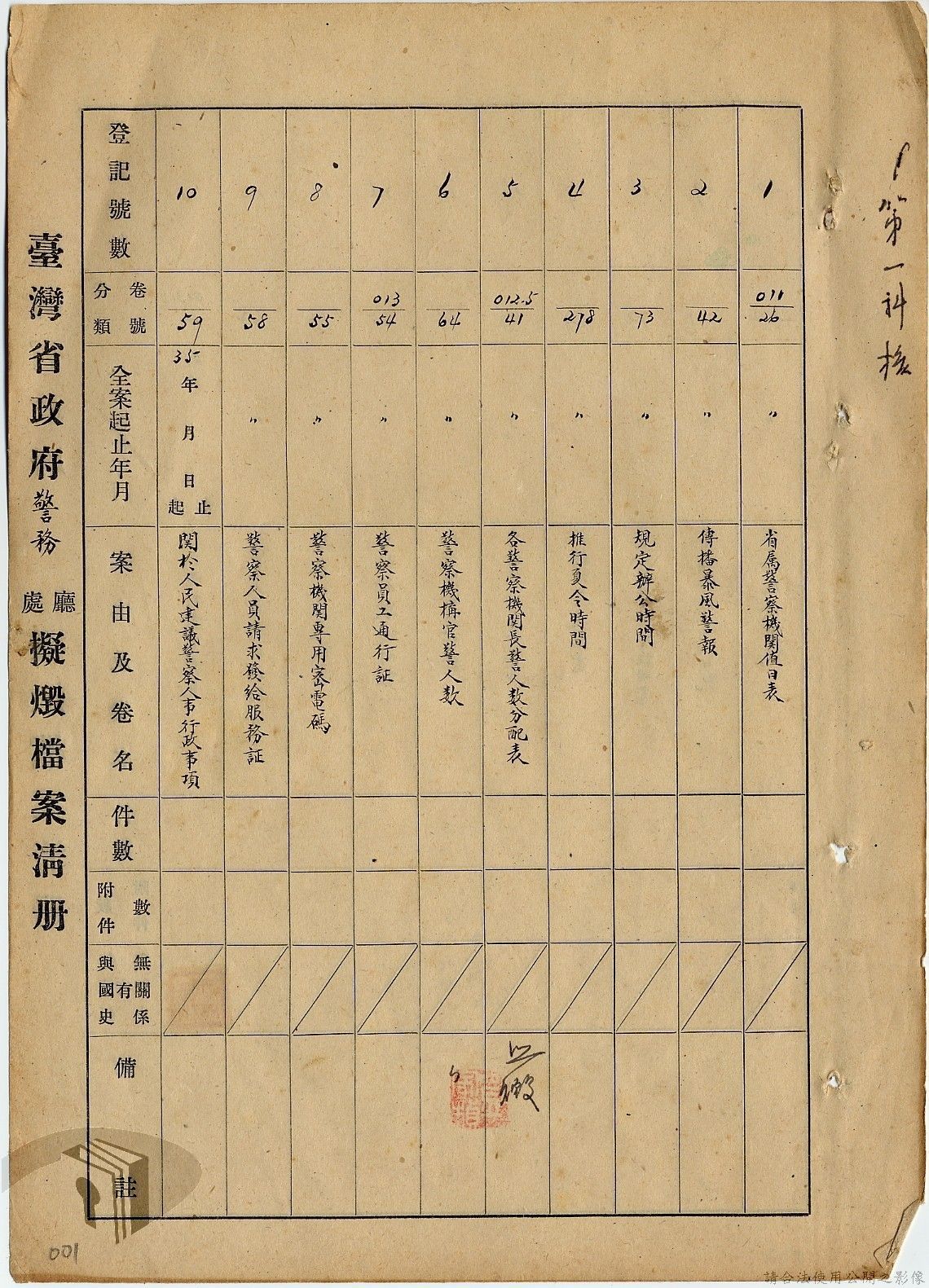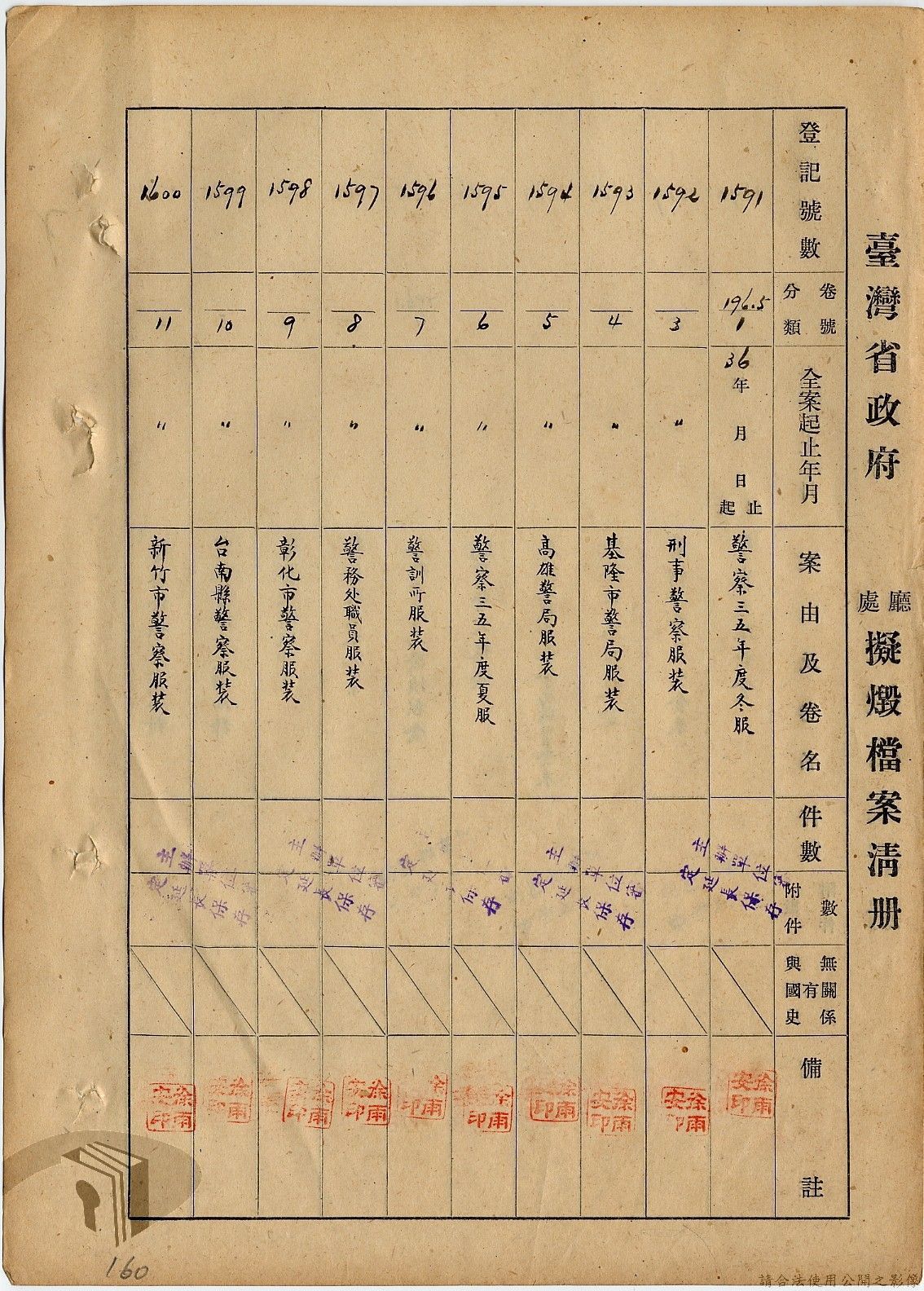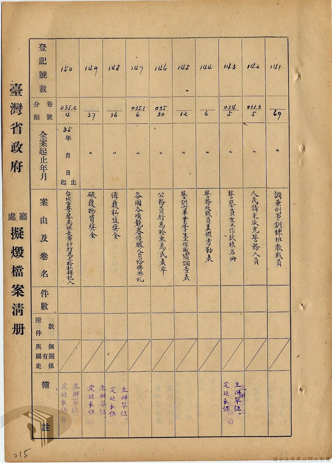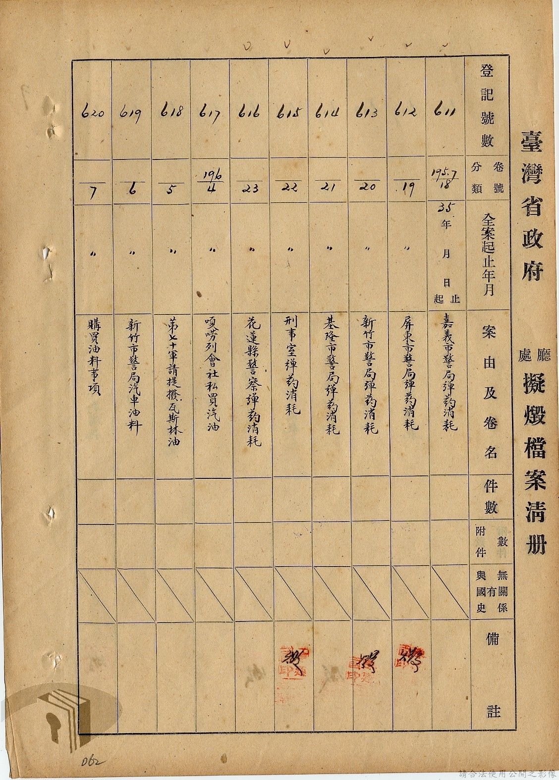 本案為35至36年間,臺灣省政府警務處銷毀檔案清冊,銷毀內容包括:規定辦公時間、推行夏令時間、各警察機關長警人數分配表、警察員工通行證、不錄用人員、警察職員錄、警務人員對調服務、現職人員投考警訓班、衛生講習班事項等。