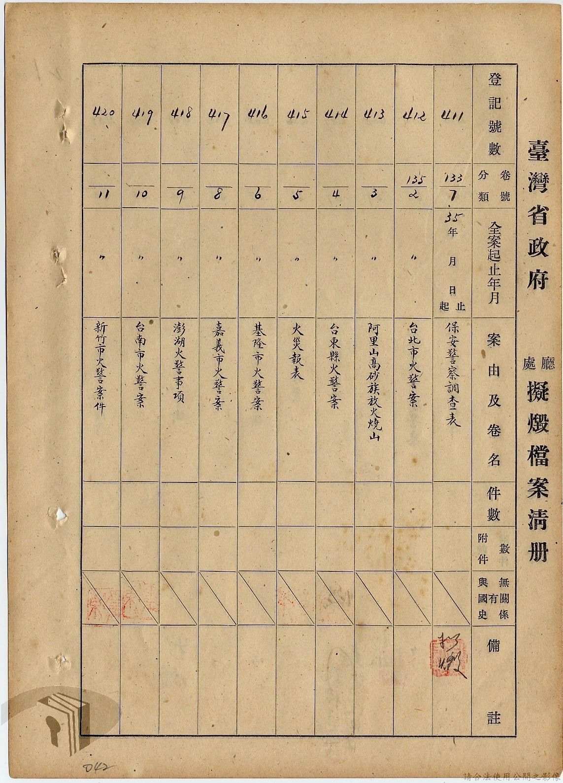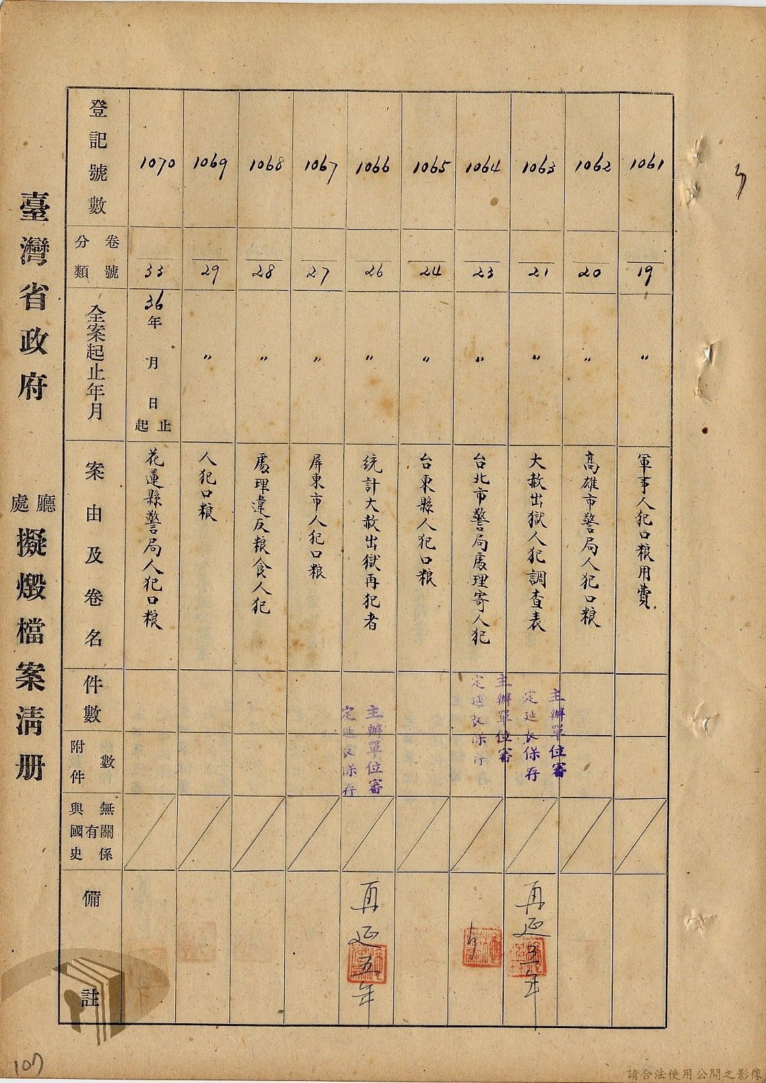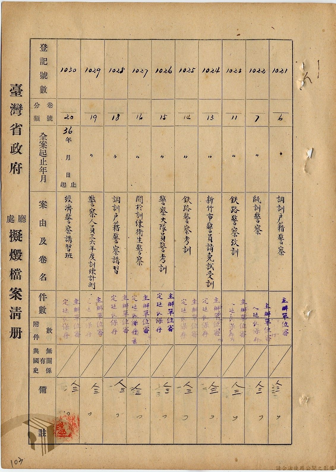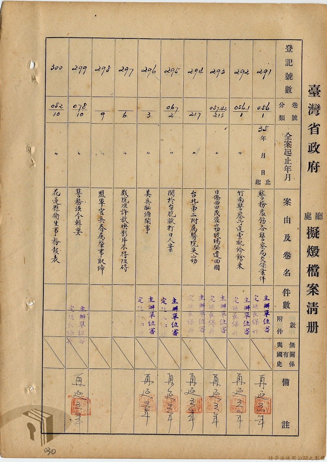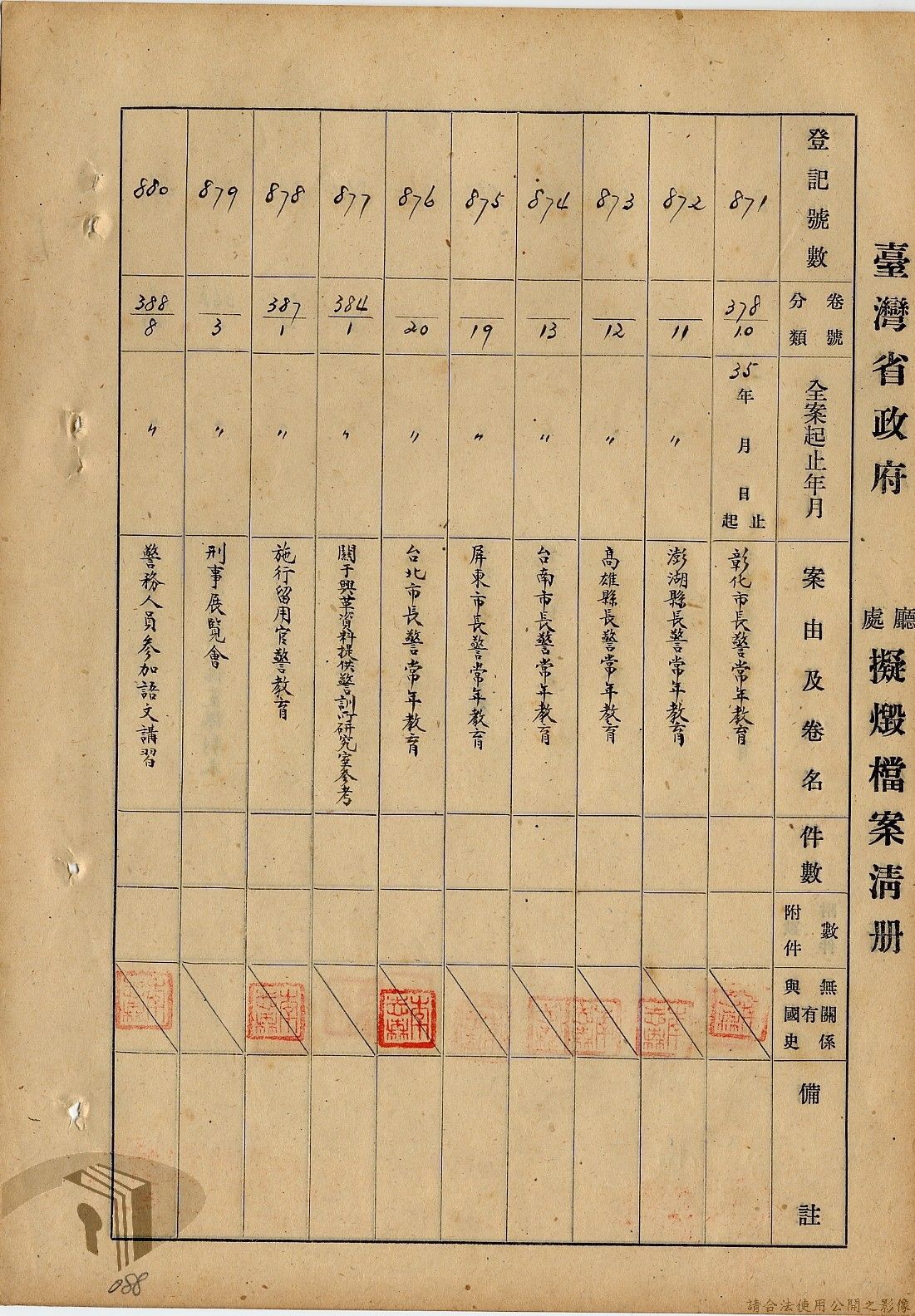 本案為35至36年間,臺灣省政府警務處銷毀檔案清冊,銷毀內容包括:規定辦公時間、推行夏令時間、各警察機關長警人數分配表、警察員工通行證、不錄用人員、警察職員錄、警務人員對調服務、現職人員投考警訓班、衛生講習班事項等。