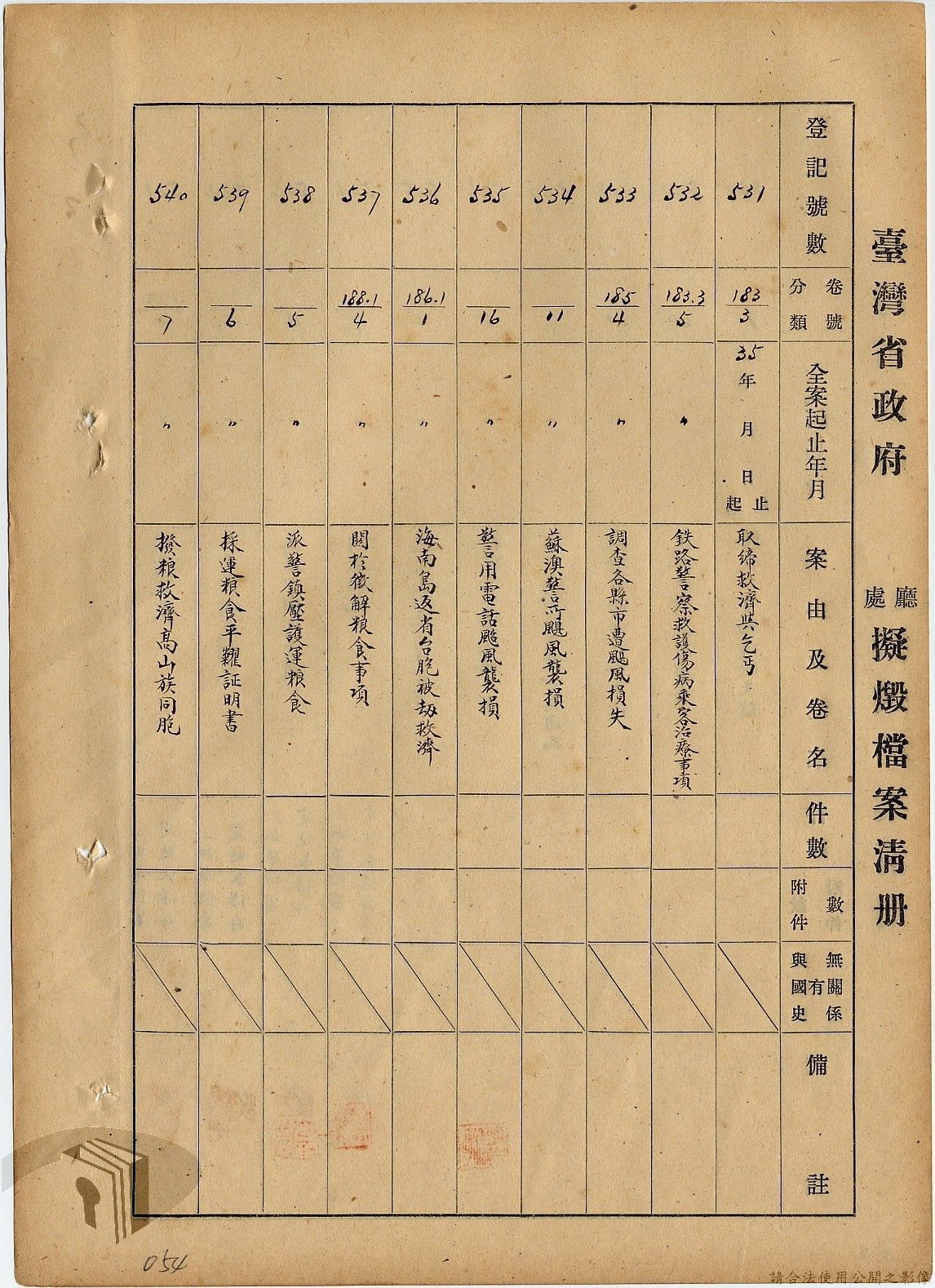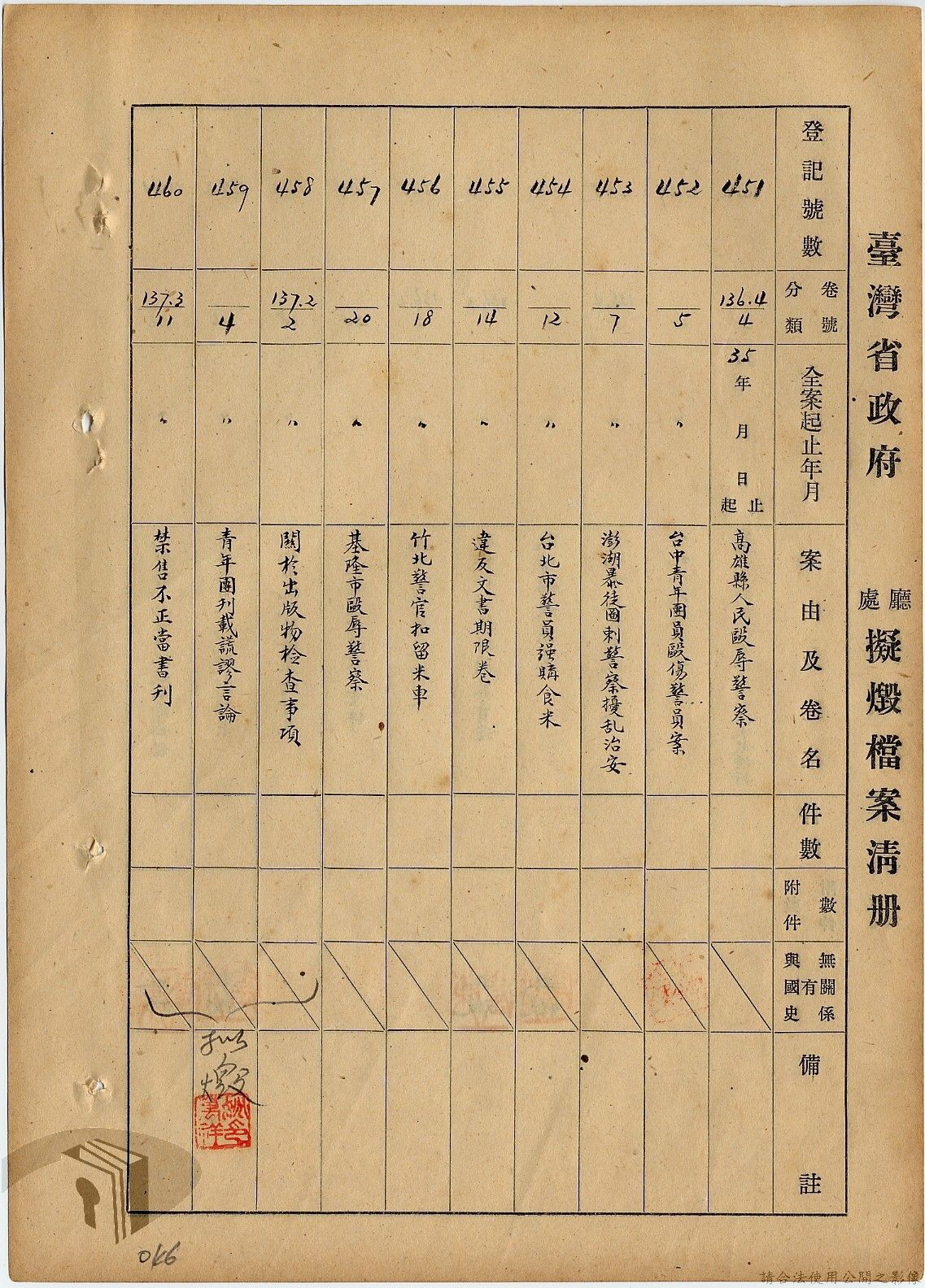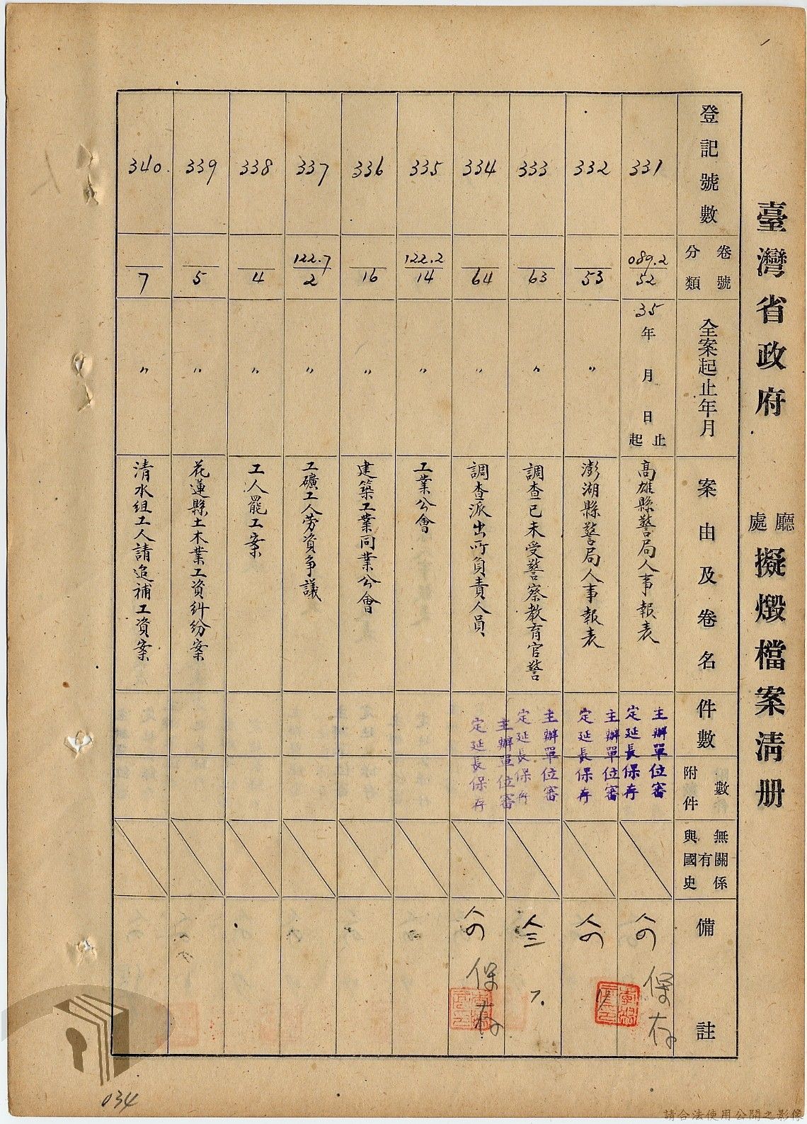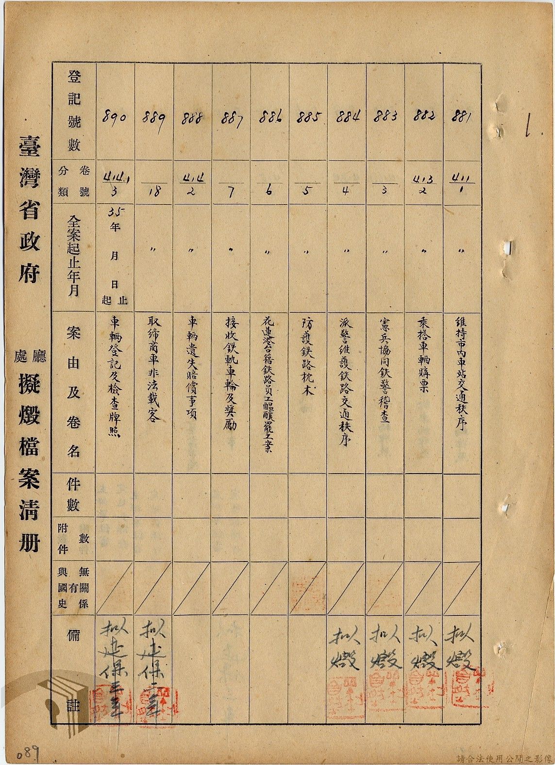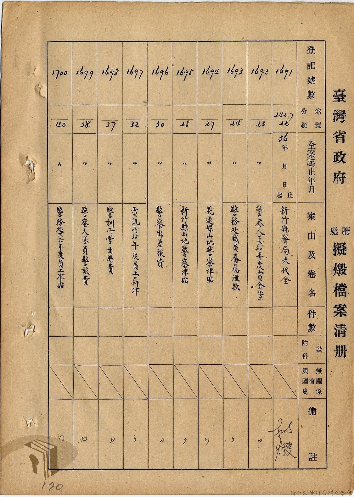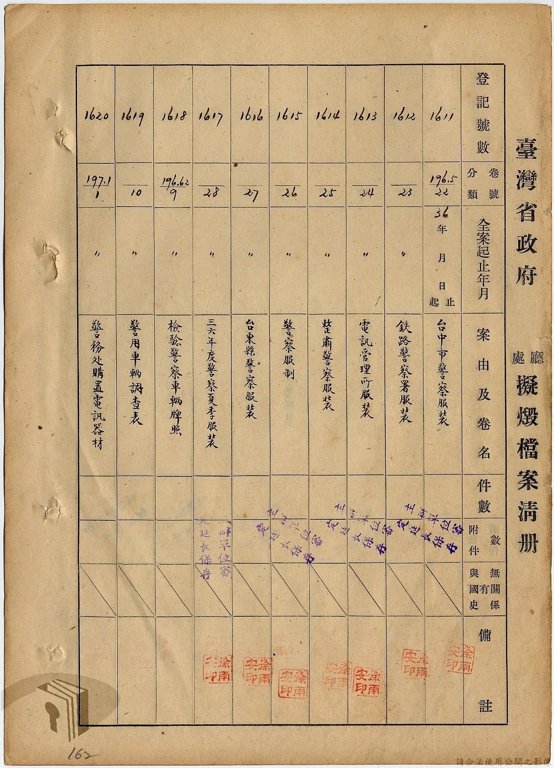 本案為35至36年間,臺灣省政府警務處銷毀檔案清冊,銷毀內容包括:規定辦公時間、推行夏令時間、各警察機關長警人數分配表、警察員工通行證、不錄用人員、警察職員錄、警務人員對調服務、現職人員投考警訓班、衛生講習班事項等。