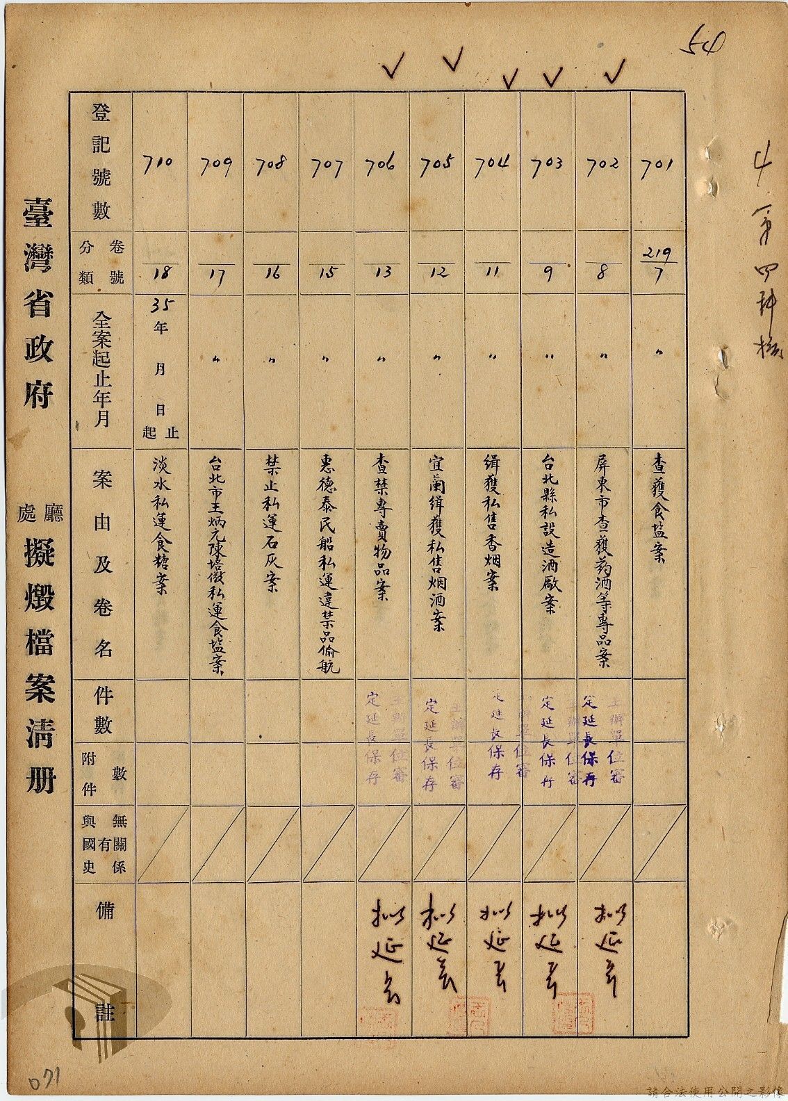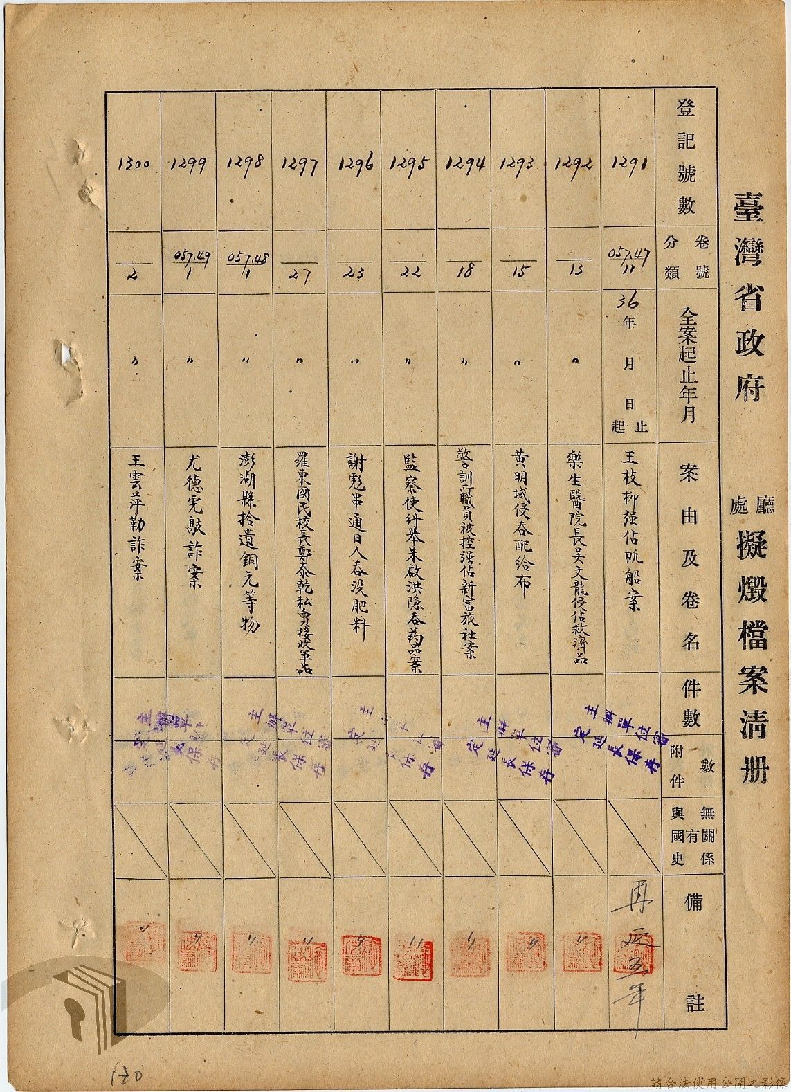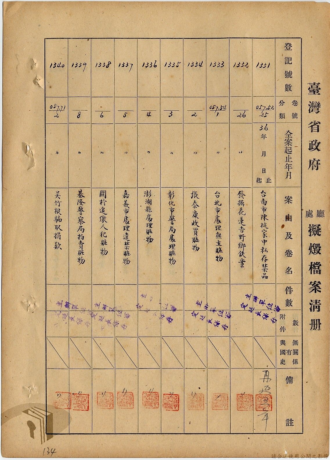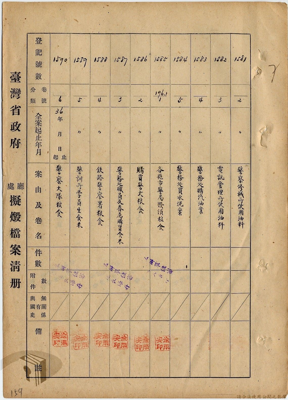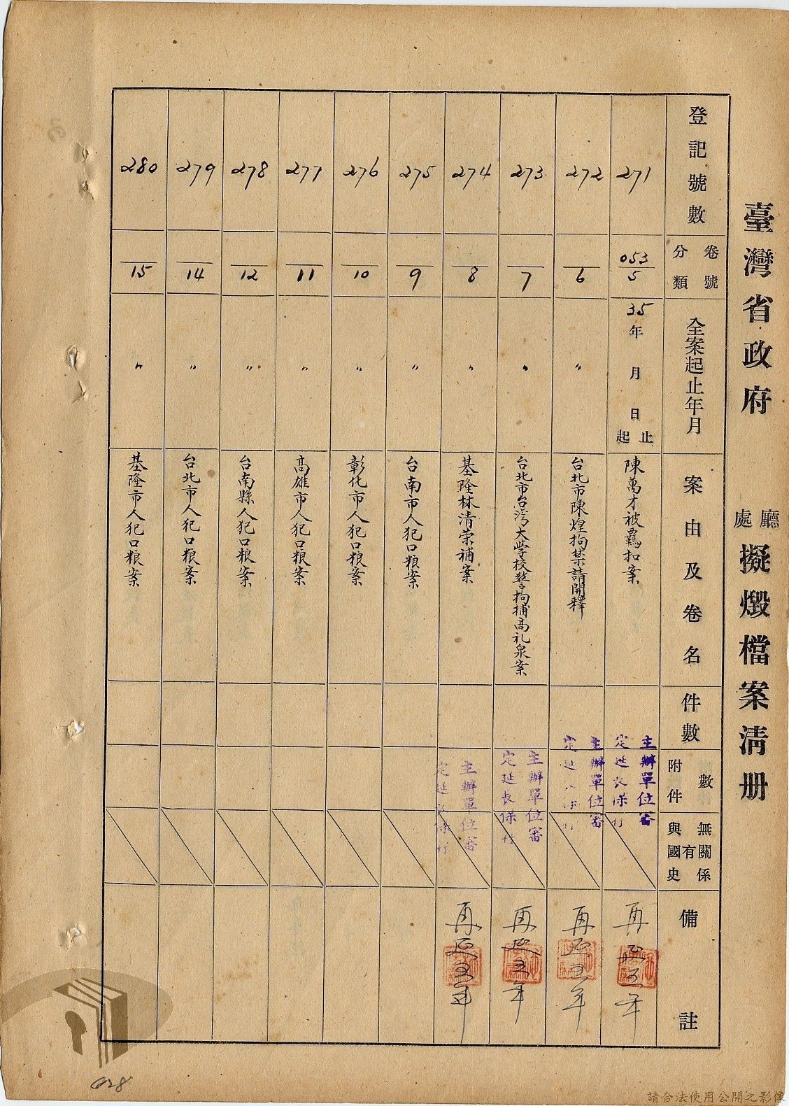 本案為35至36年間,臺灣省政府警務處銷毀檔案清冊,銷毀內容包括:規定辦公時間、推行夏令時間、各警察機關長警人數分配表、警察員工通行證、不錄用人員、警察職員錄、警務人員對調服務、現職人員投考警訓班、衛生講習班事項等。
