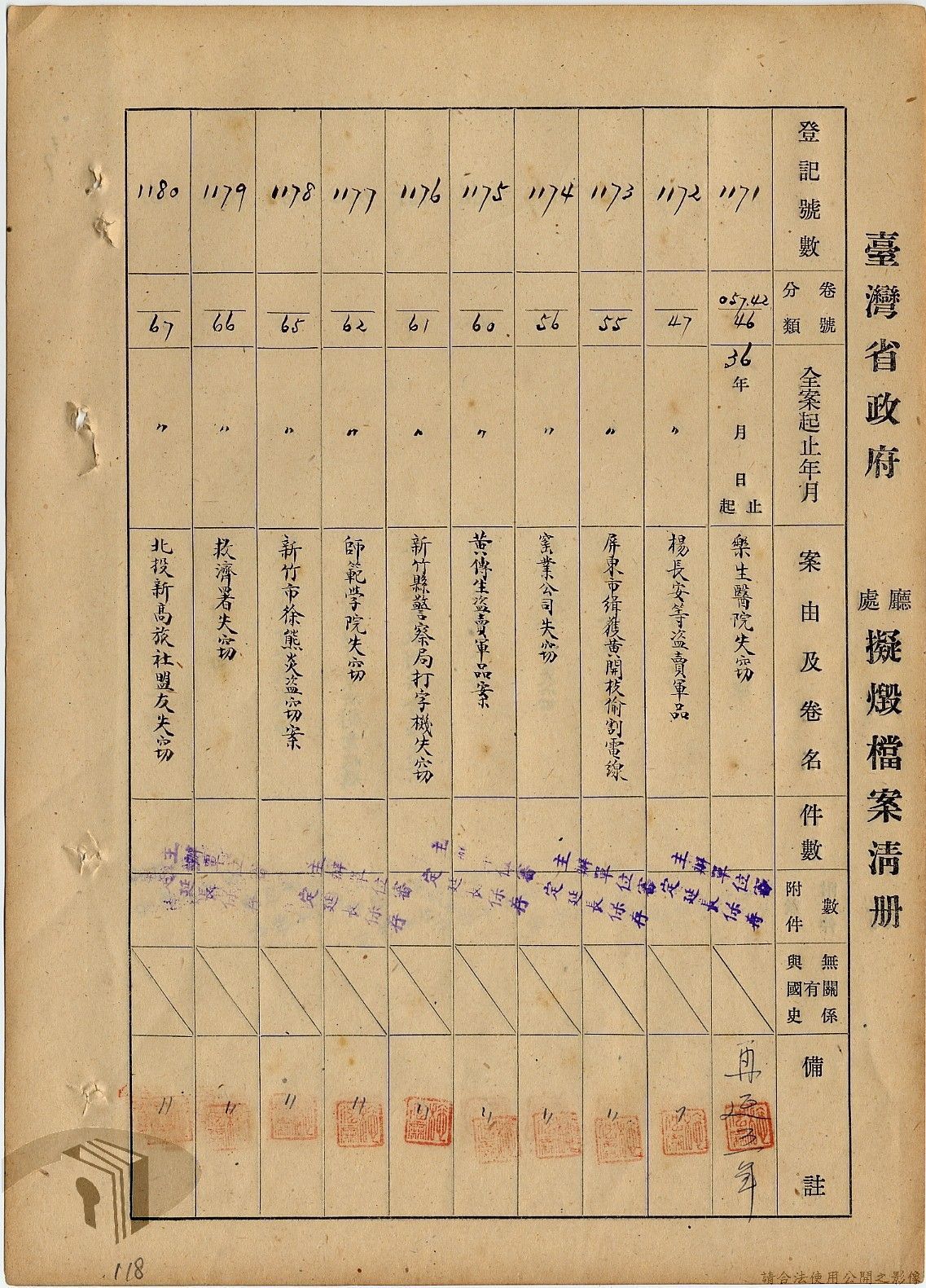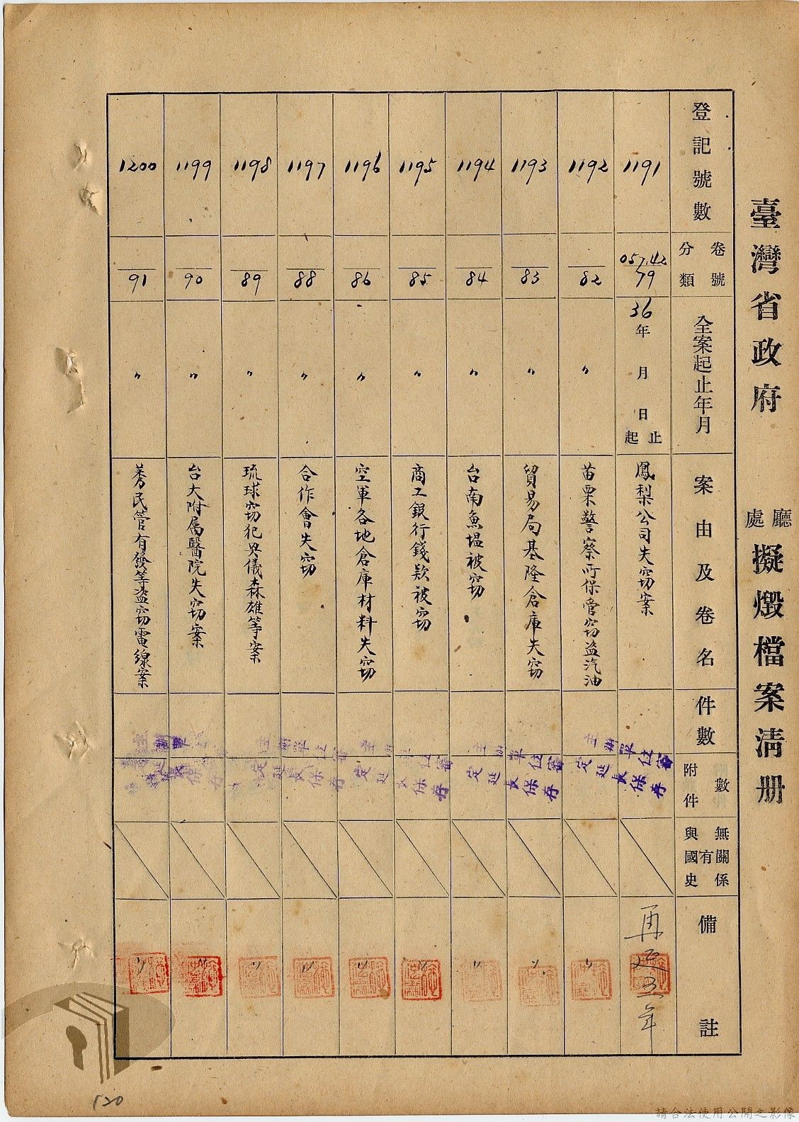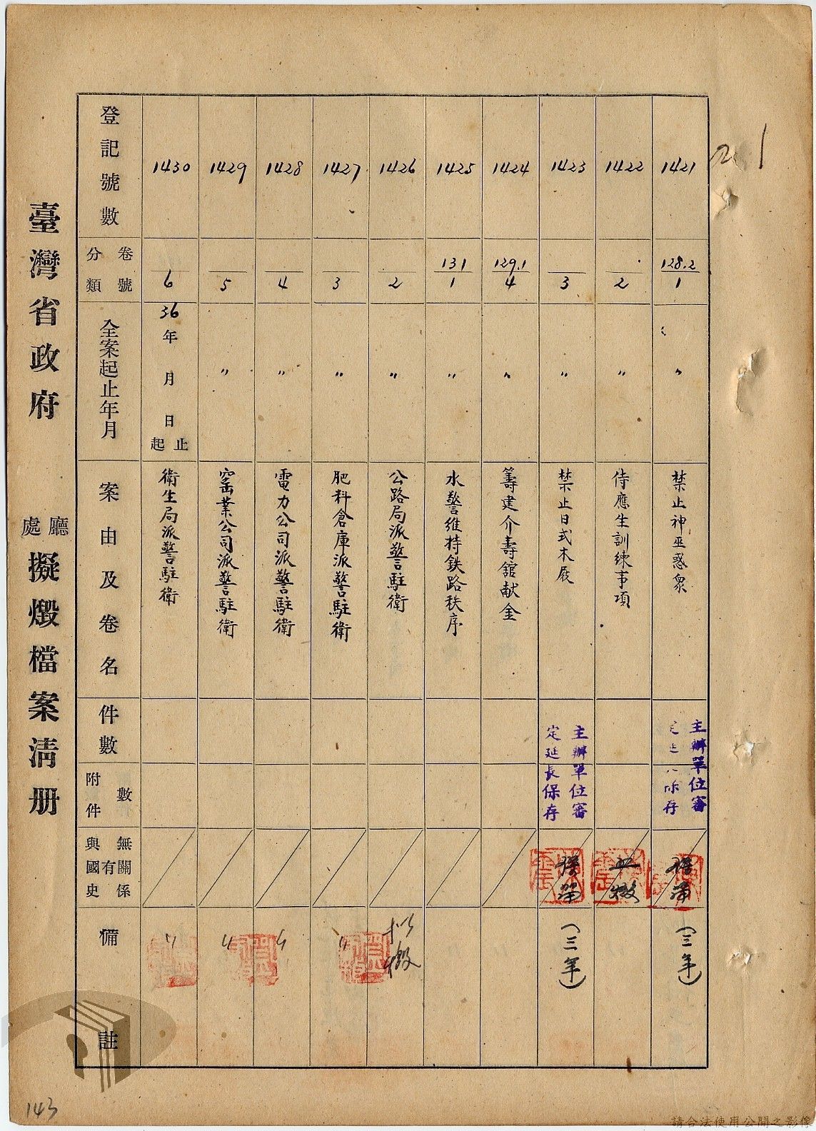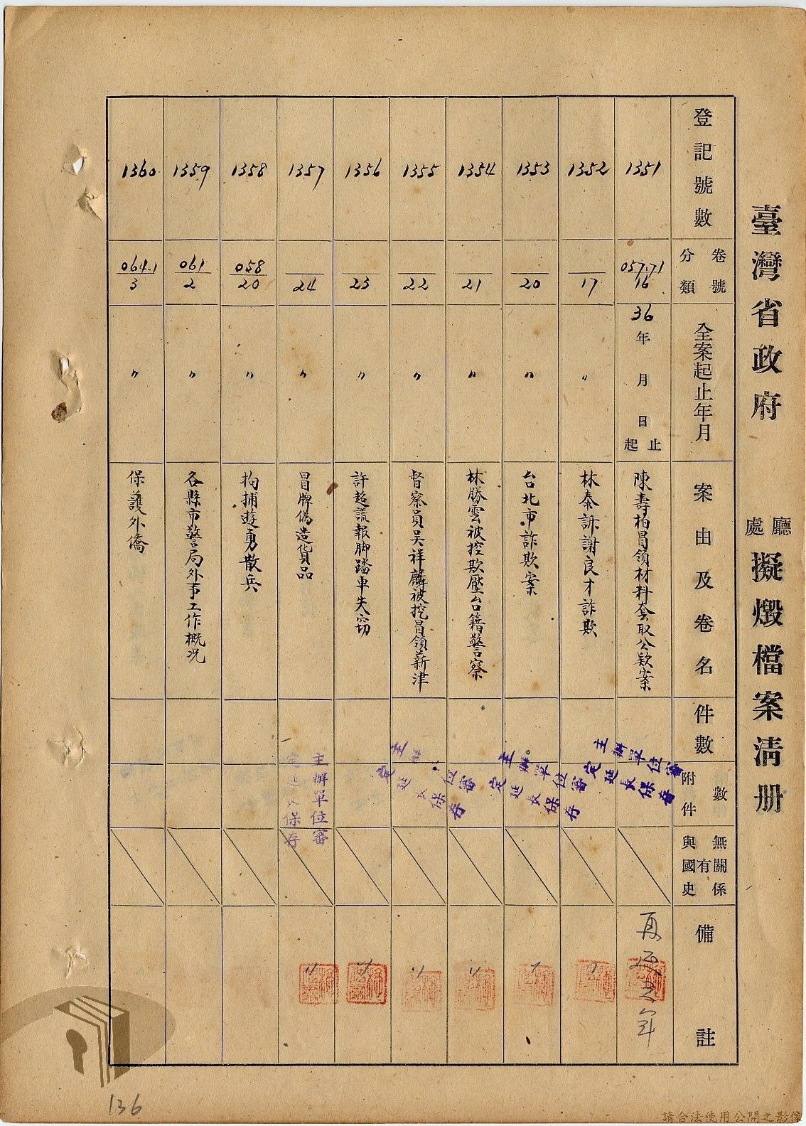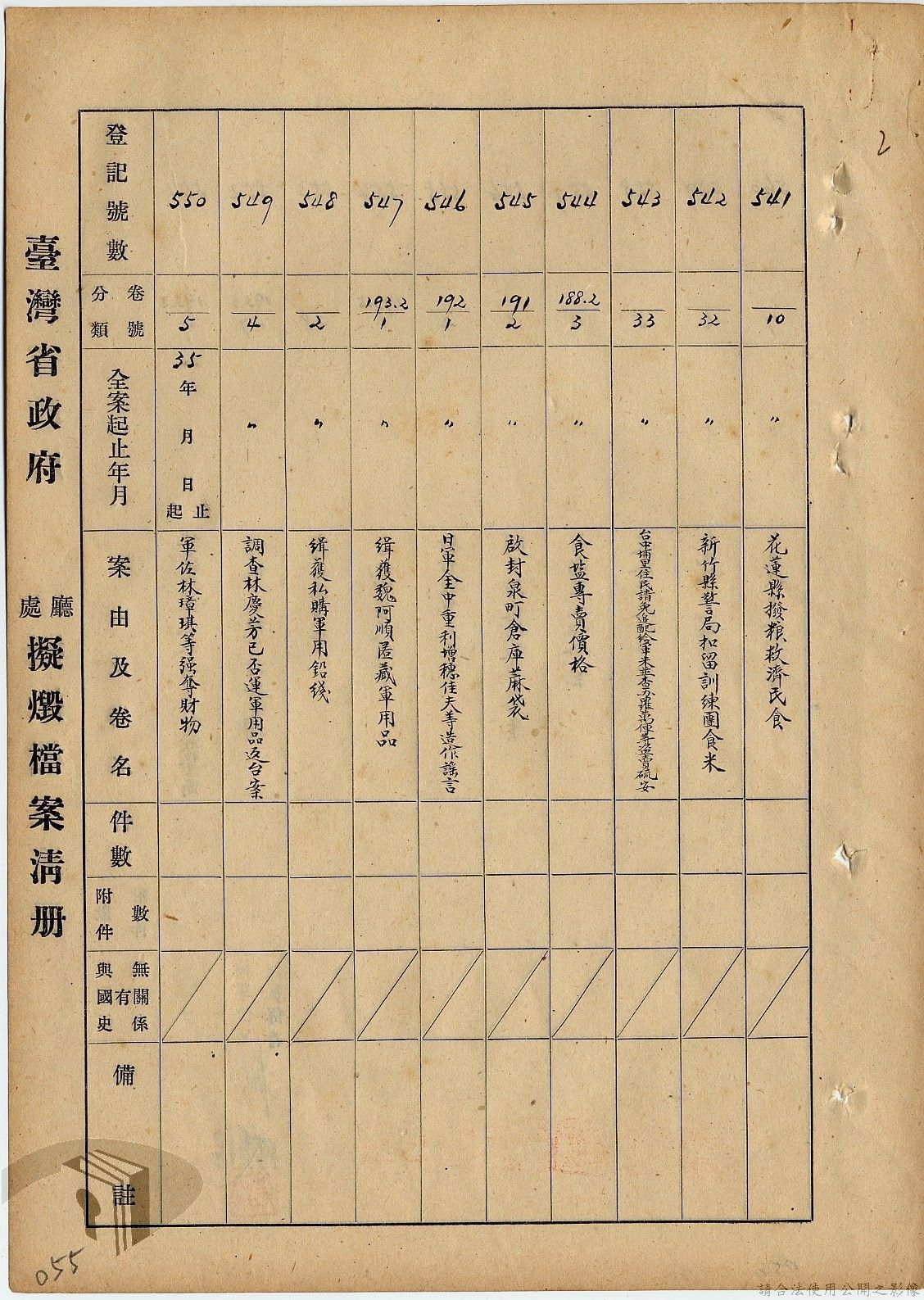 本案為35至36年間,臺灣省政府警務處銷毀檔案清冊,銷毀內容包括:規定辦公時間、推行夏令時間、各警察機關長警人數分配表、警察員工通行證、不錄用人員、警察職員錄、警務人員對調服務、現職人員投考警訓班、衛生講習班事項等。
