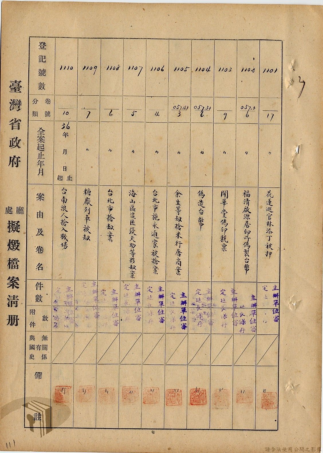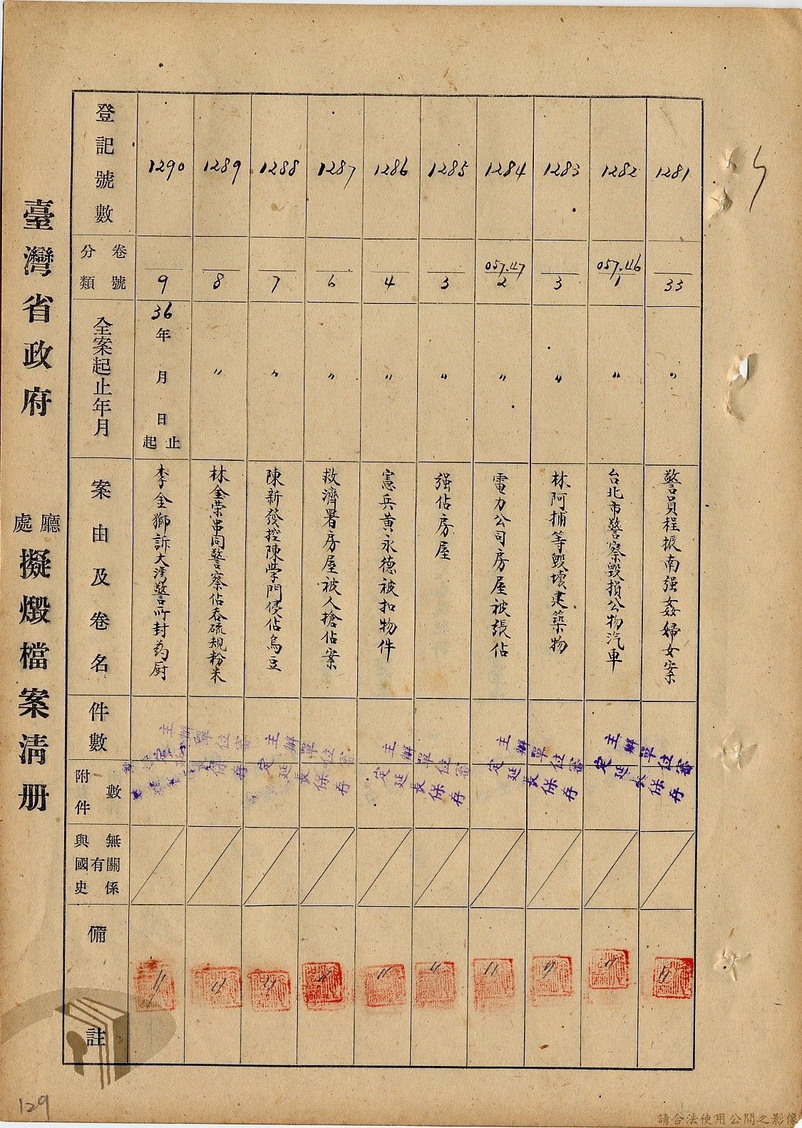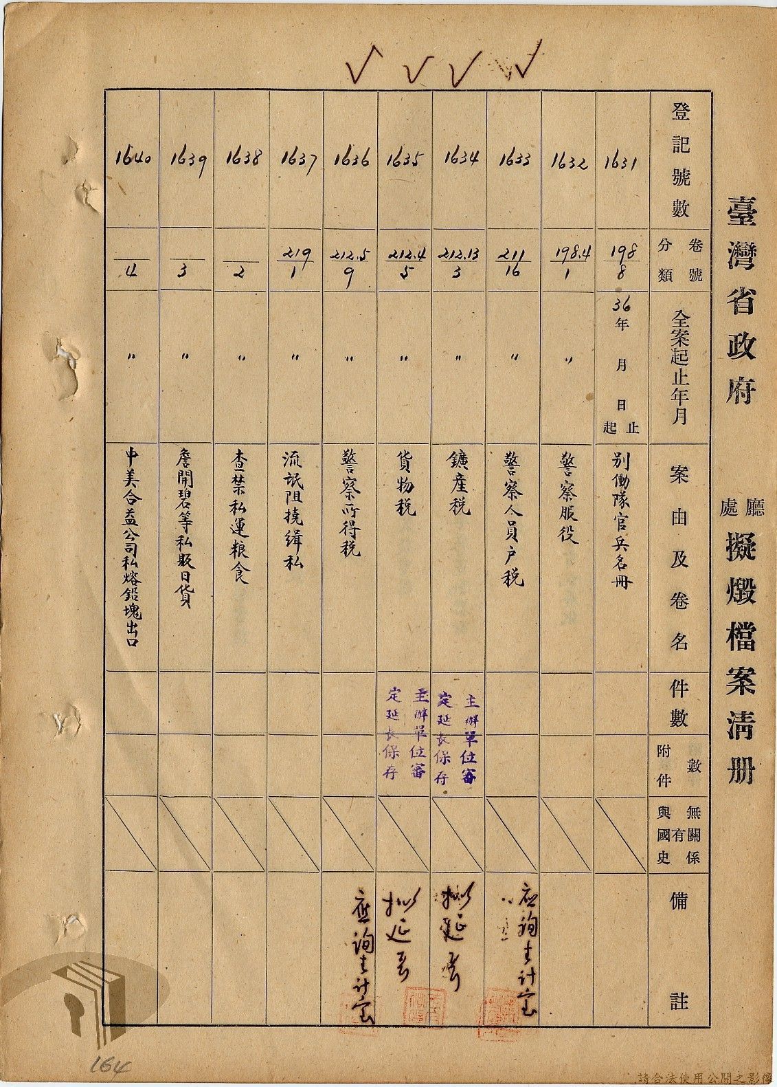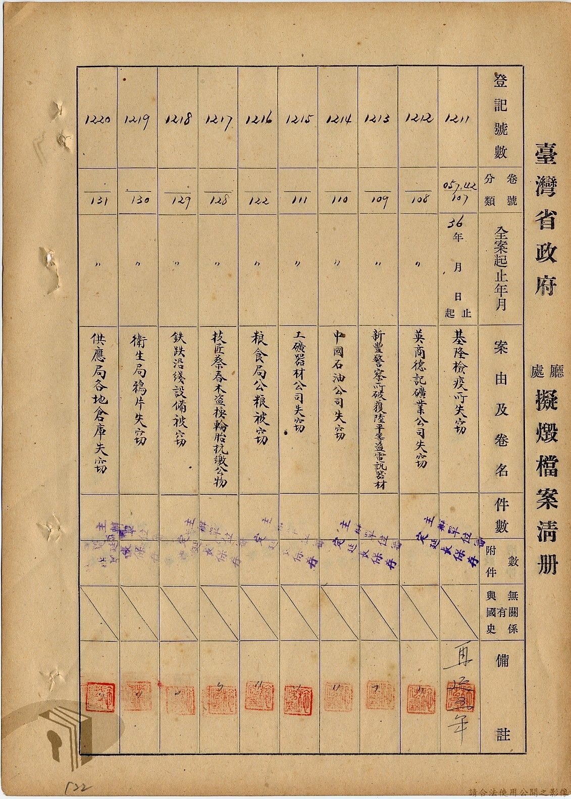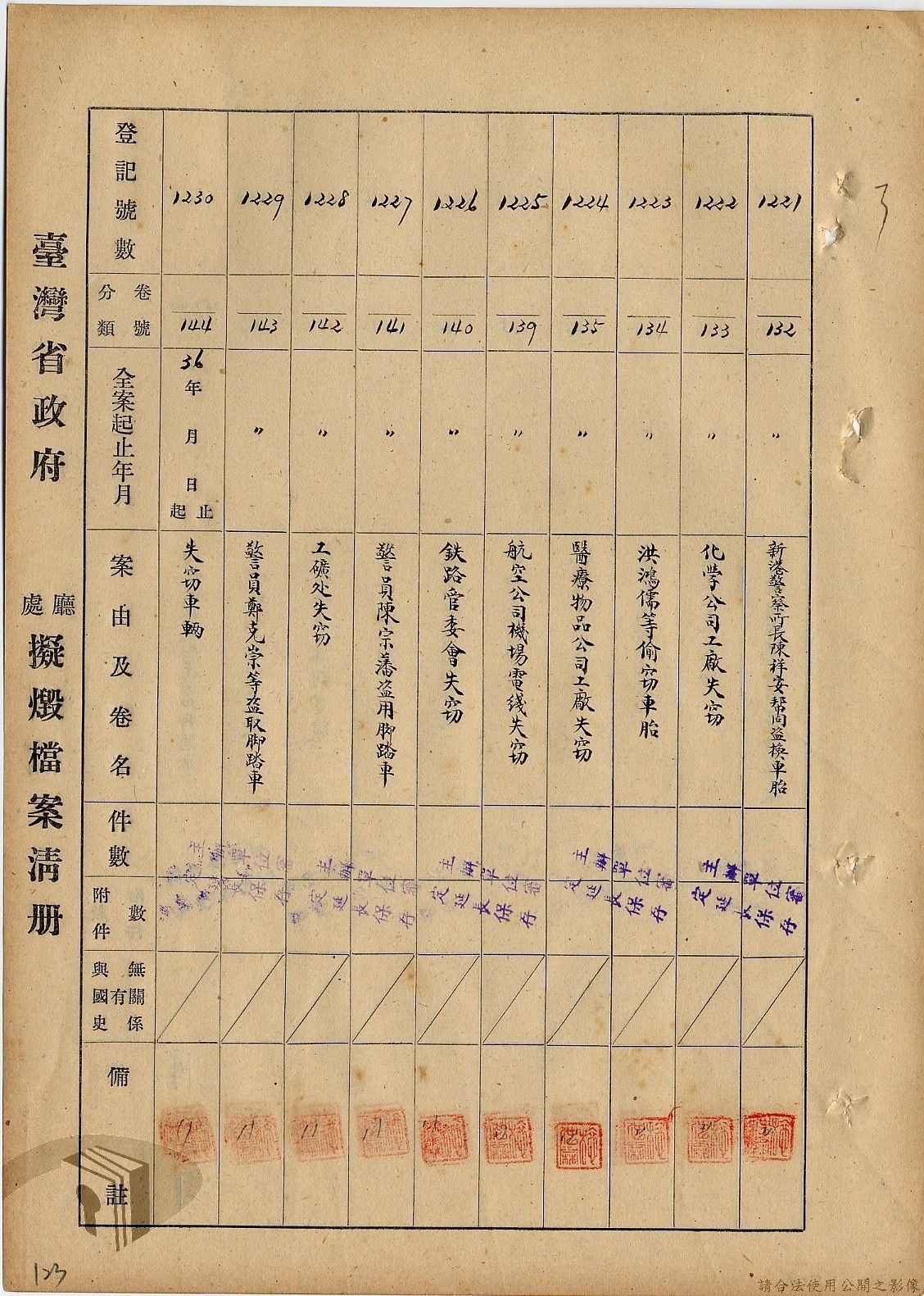 本案為35至36年間,臺灣省政府警務處銷毀檔案清冊,銷毀內容包括:規定辦公時間、推行夏令時間、各警察機關長警人數分配表、警察員工通行證、不錄用人員、警察職員錄、警務人員對調服務、現職人員投考警訓班、衛生講習班事項等。